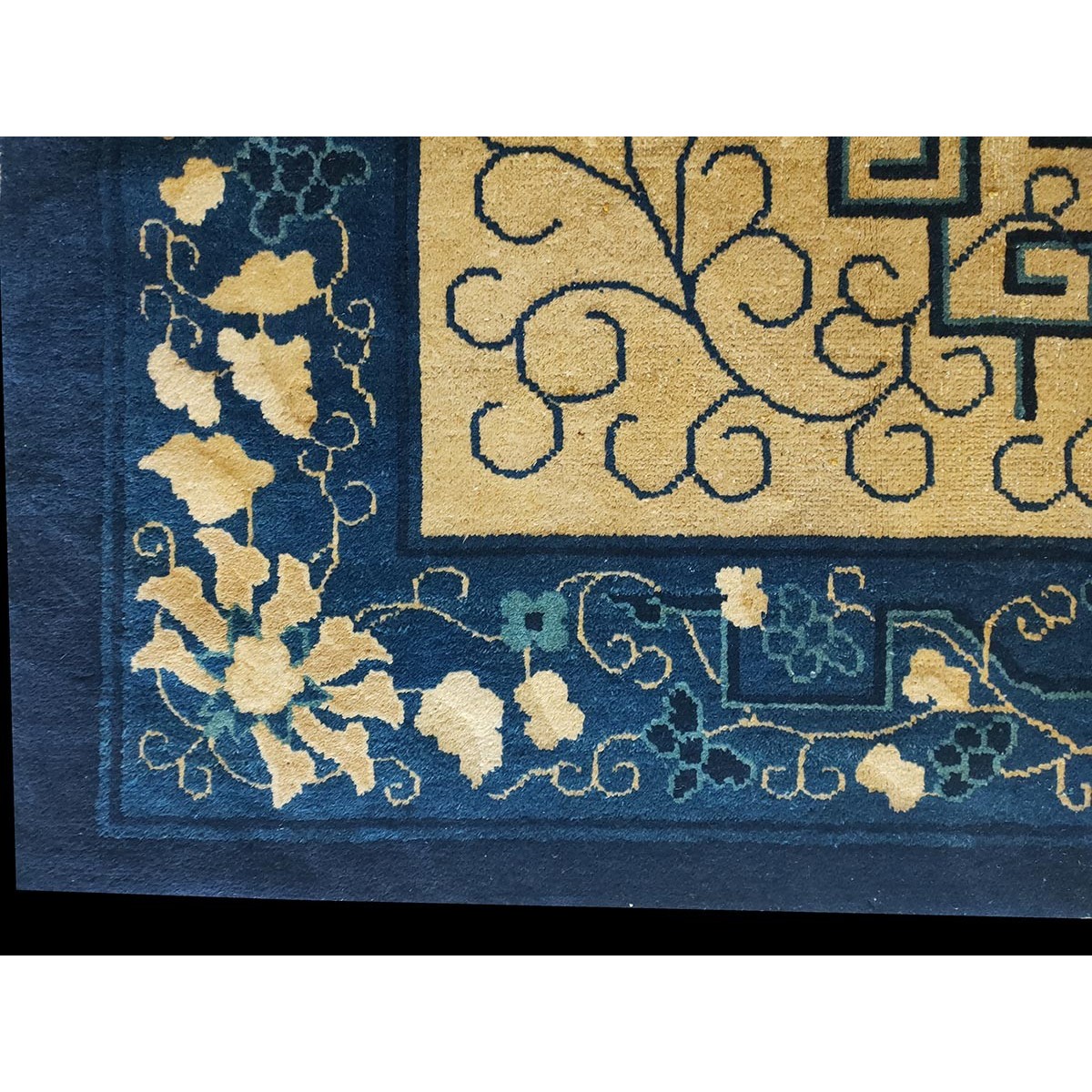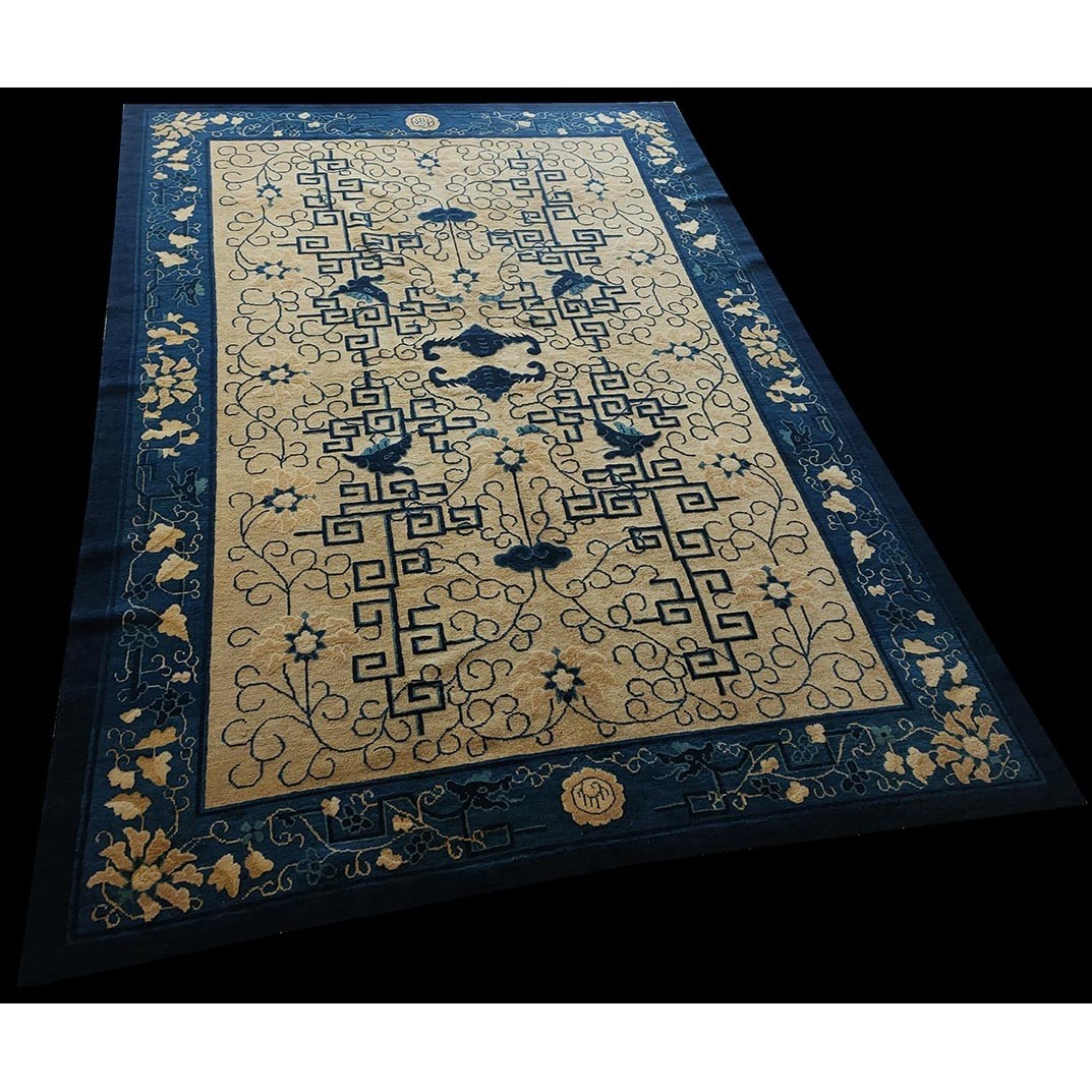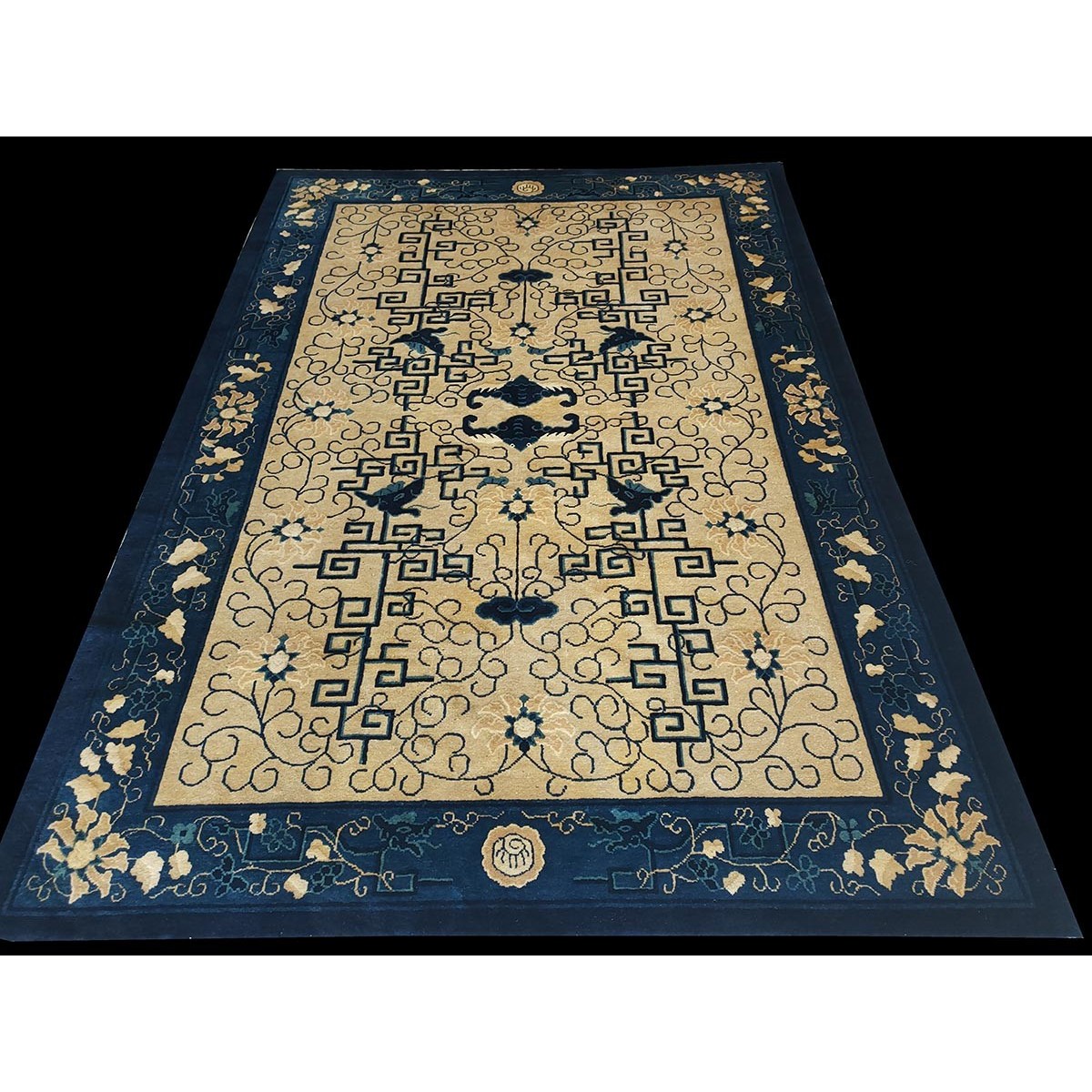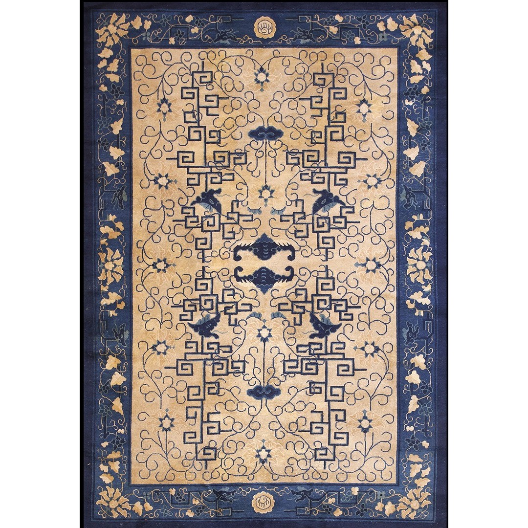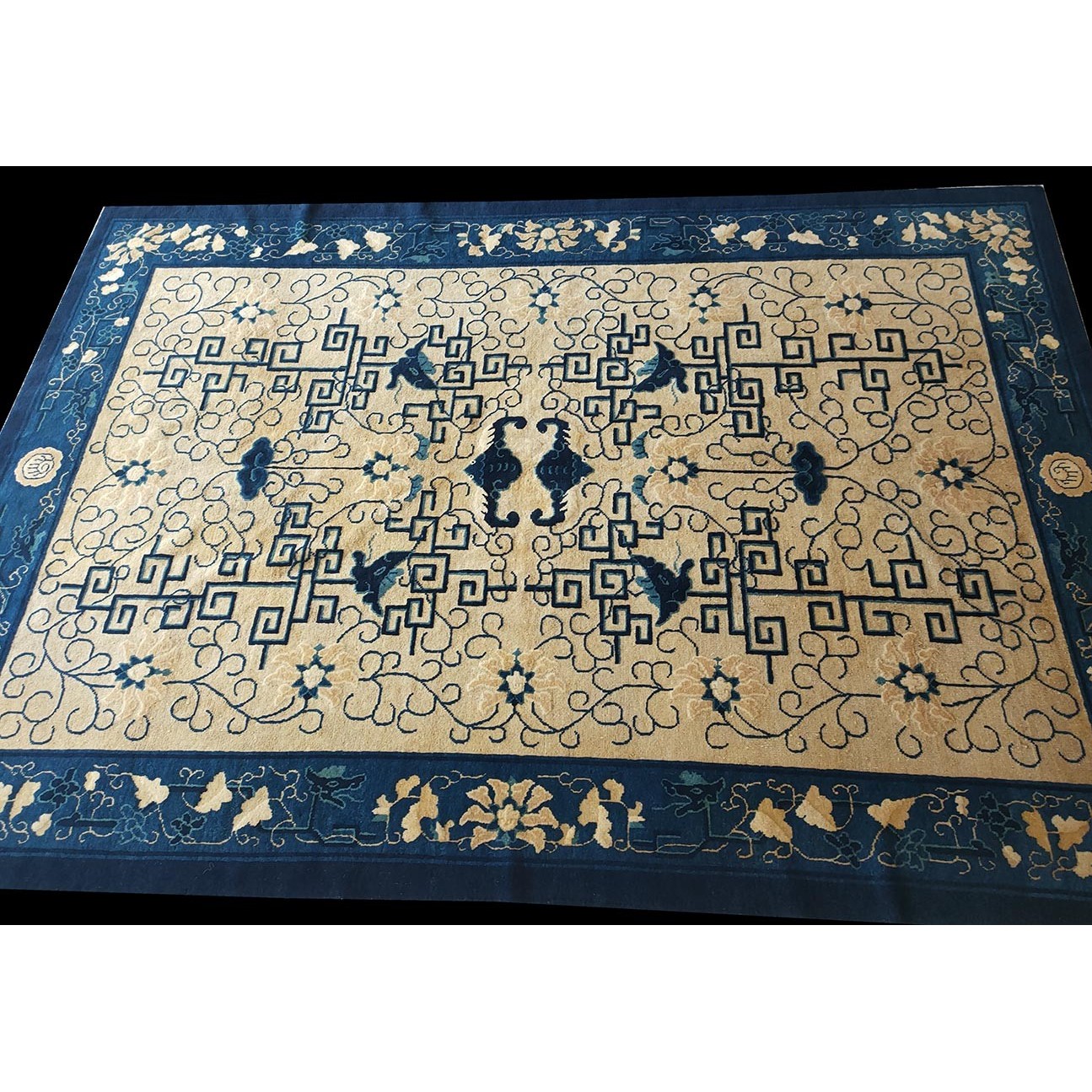 DescriptionChineseCarpets made in China proper. See entries Ningshia, Peking, Art Deco. Chinese - PekingThe commercial Peking carpet is a later 19th century development, begun by importing weaves from Ningshia (see entry) to create and export industry aimed at Western markets. The foundation is cotton and the pile is a good quality carpet wool which takes dyes particularly well. The neat medium weave is in Persian (asymmetric) knots. Designs are strictly Chinese and the whole motif repertoire of Chinese art is employed. Blue and white is the most popular color combination and red is particularly rare. Sizes tend to 9 x 12 and larger, and few small pieces appear. For a short time in the early 1920s Persian designs were woven to capitalize on the death of new Iranian goods. The industry decimated by the Communist Revolution relocated to the Pearl River area. There is a good supply of antique carpets at reasonable prices. | |