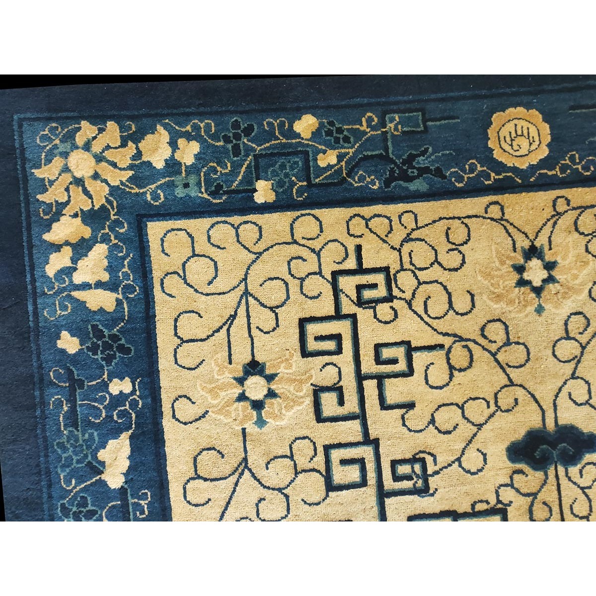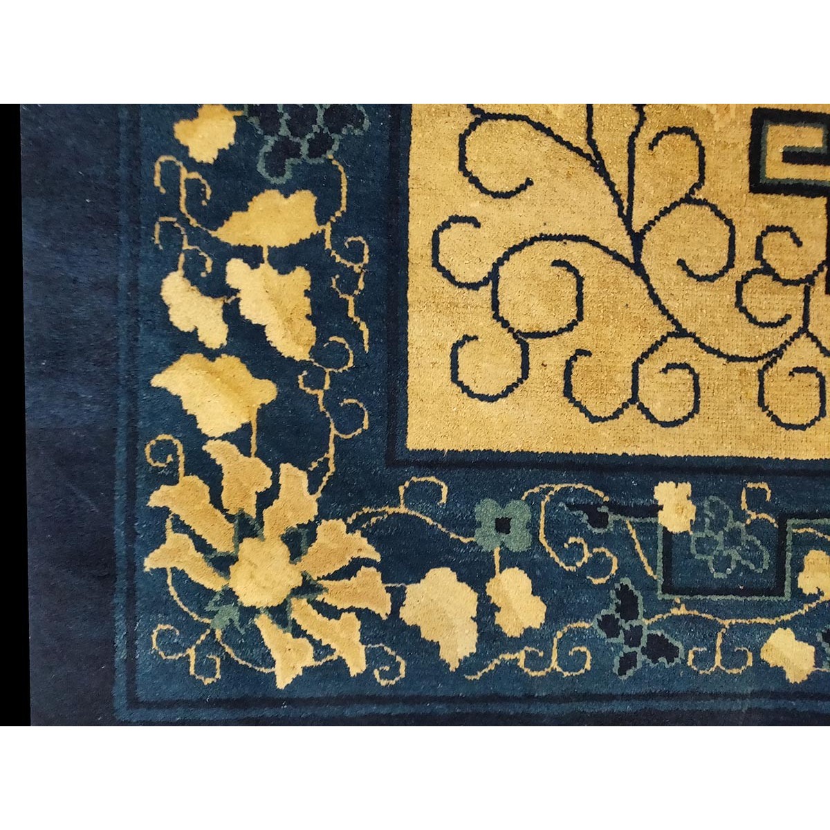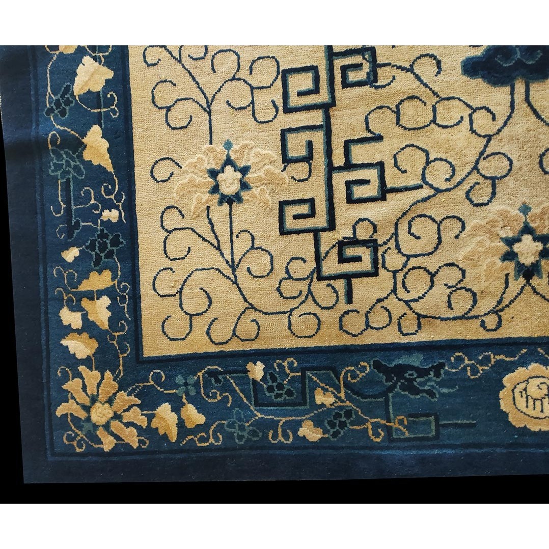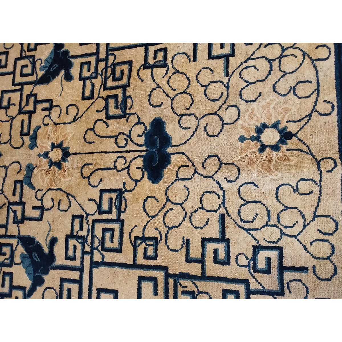 DescriptionChineseCarpets made in China proper. See entries Ningshia, Peking, Art Deco. Chinese - PekingThe commercial Peking carpet is a later 19th century development, begun by importing weaves from Ningshia (see entry) to create and export industry aimed at Western markets. The foundation is cotton and the pile is a good quality carpet wool which takes dyes particularly well. The neat medium weave is in Persian (asymmetric) knots. Designs are strictly Chinese and the whole motif repertoire of Chinese art is employed. Blue and white is the most popular color combination and red is particularly rare. Sizes tend to 9 x 12 and larger, and few small pieces appear. For a short time in the early 1920s Persian designs were woven to capitalize on the death of new Iranian goods. The industry decimated by the Communist Revolution relocated to the Pearl River area. There is a good supply of antique carpets at reasonable prices. | |
