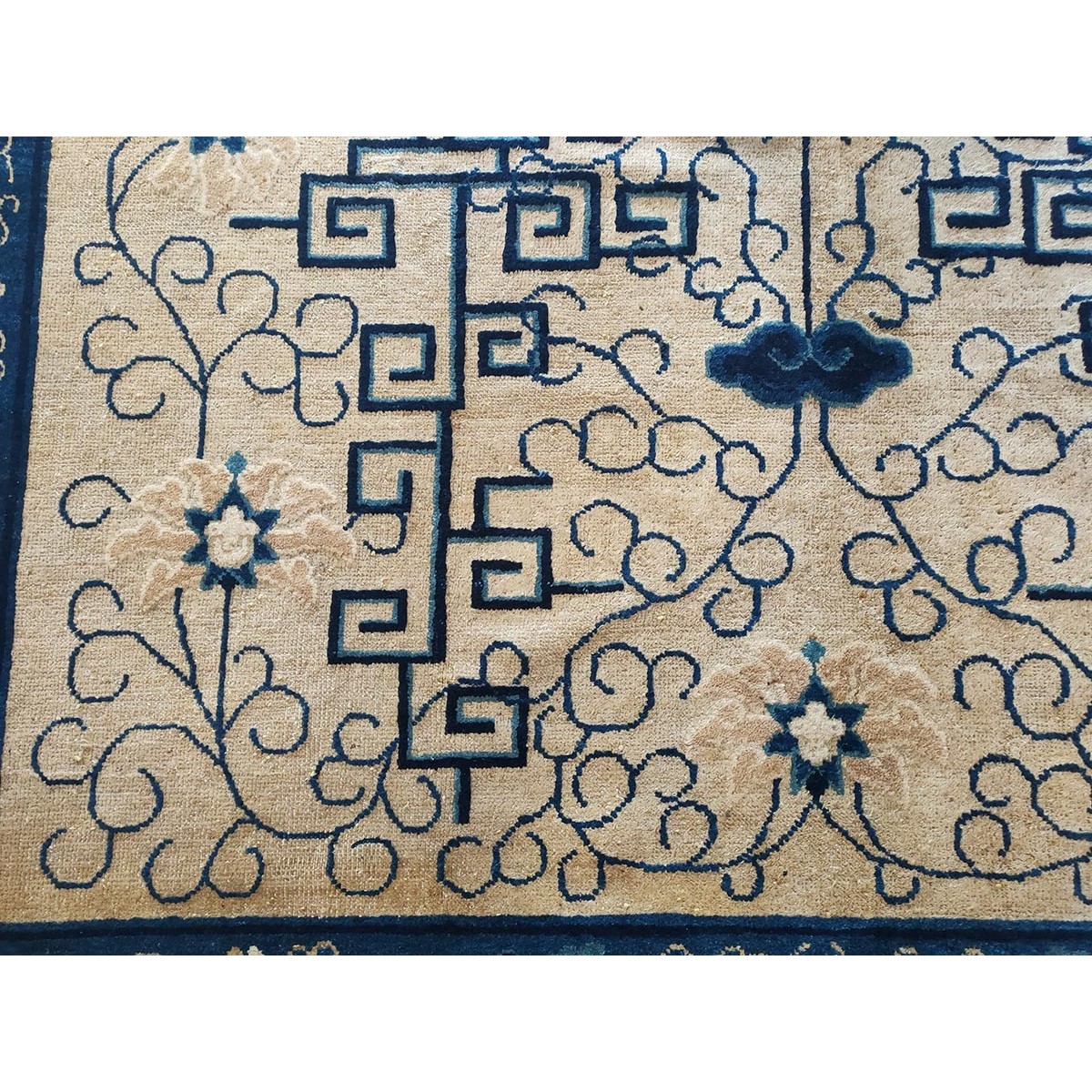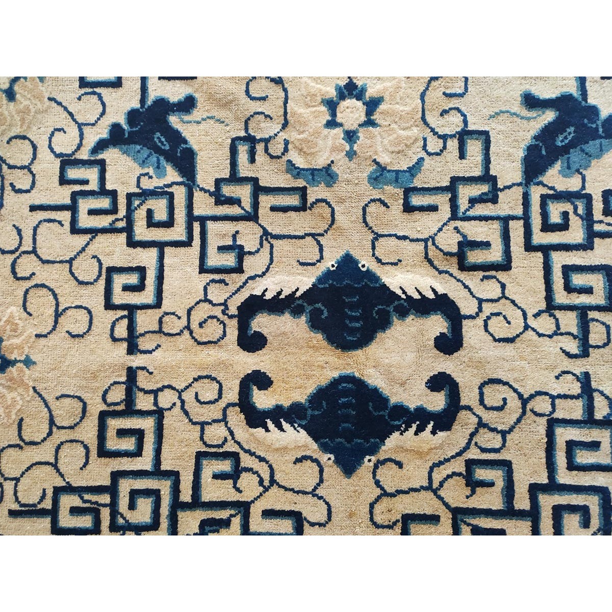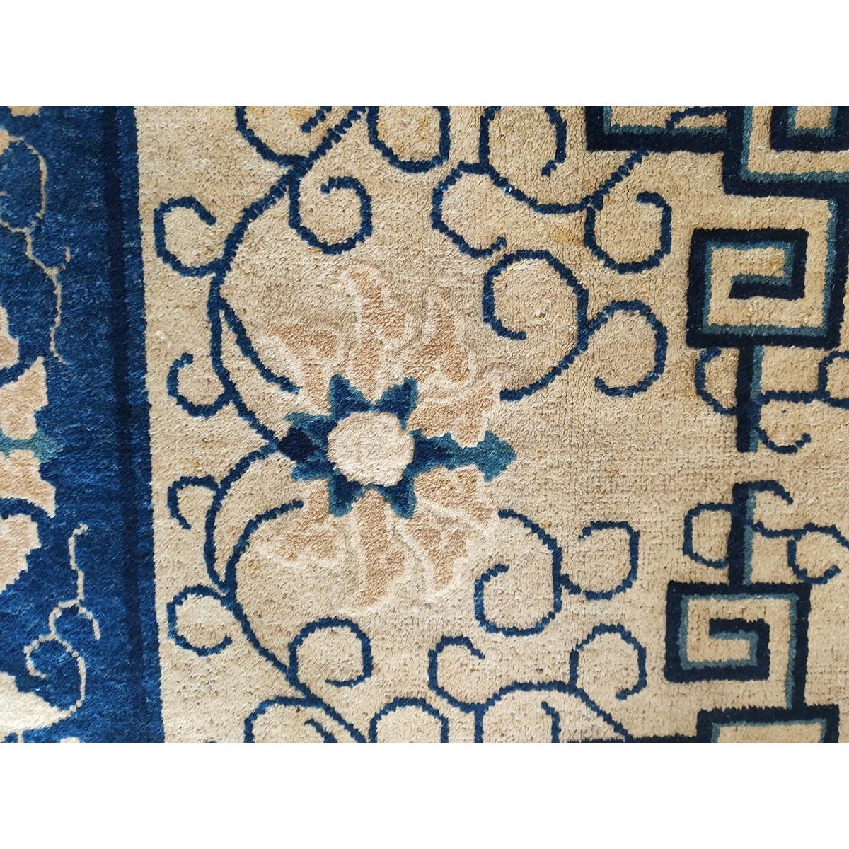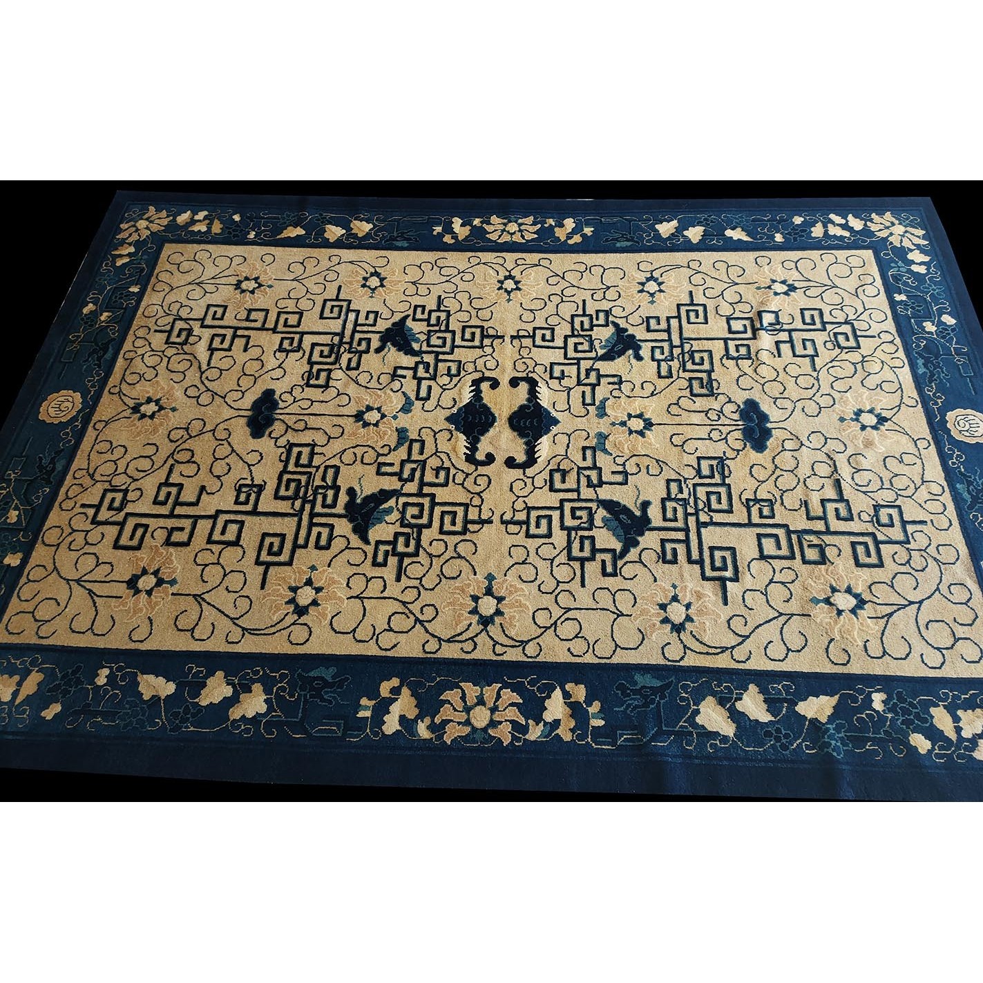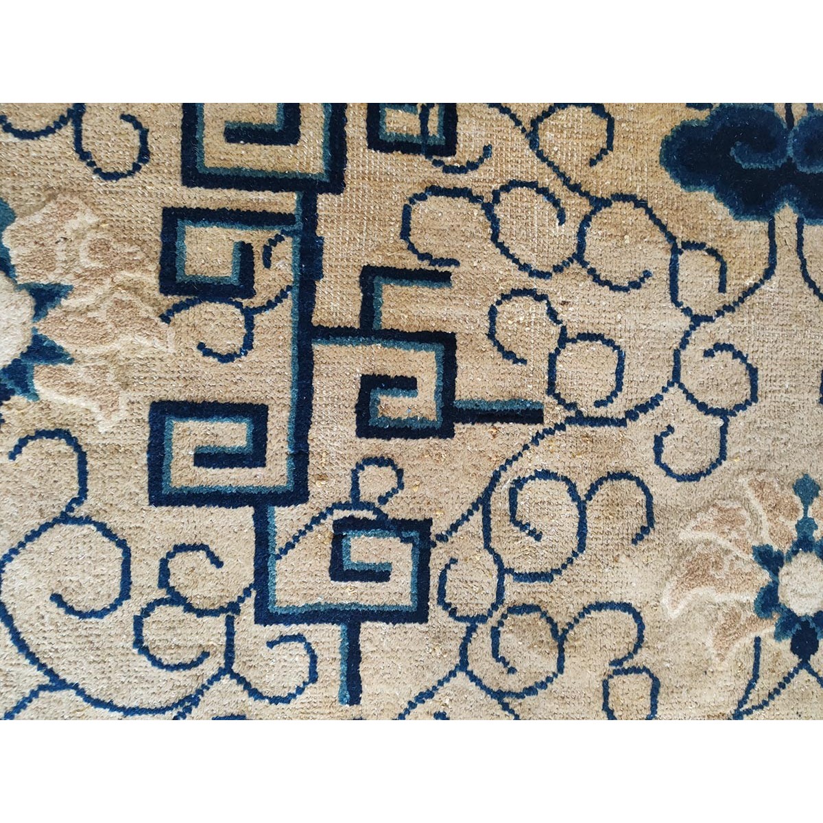 DescriptionChineseCarpets made in China proper. See entries Ningshia, Peking, Art Deco. Chinese - PekingThe commercial Peking carpet is a later 19th century development, begun by importing weaves from Ningshia (see entry) to create and export industry aimed at Western markets. The foundation is cotton and the pile is a good quality carpet wool which takes dyes particularly well. The neat medium weave is in Persian (asymmetric) knots. Designs are strictly Chinese and the whole motif repertoire of Chinese art is employed. Blue and white is the most popular color combination and red is particularly rare. Sizes tend to 9 x 12 and larger, and few small pieces appear. For a short time in the early 1920s Persian designs were woven to capitalize on the death of new Iranian goods. The industry decimated by the Communist Revolution relocated to the Pearl River area. There is a good supply of antique carpets at reasonable prices. | |