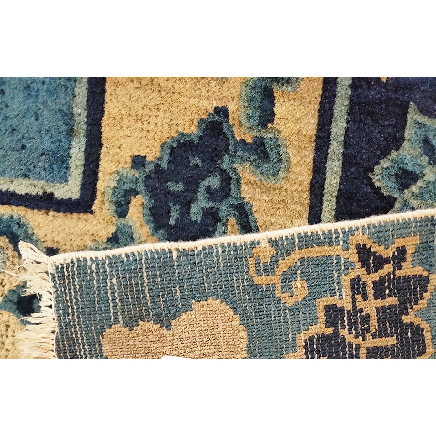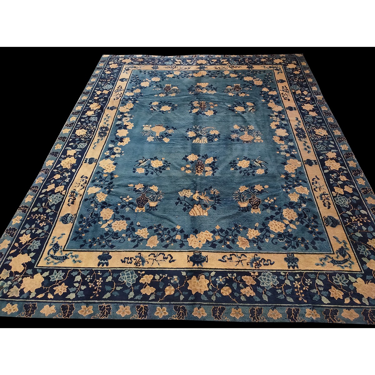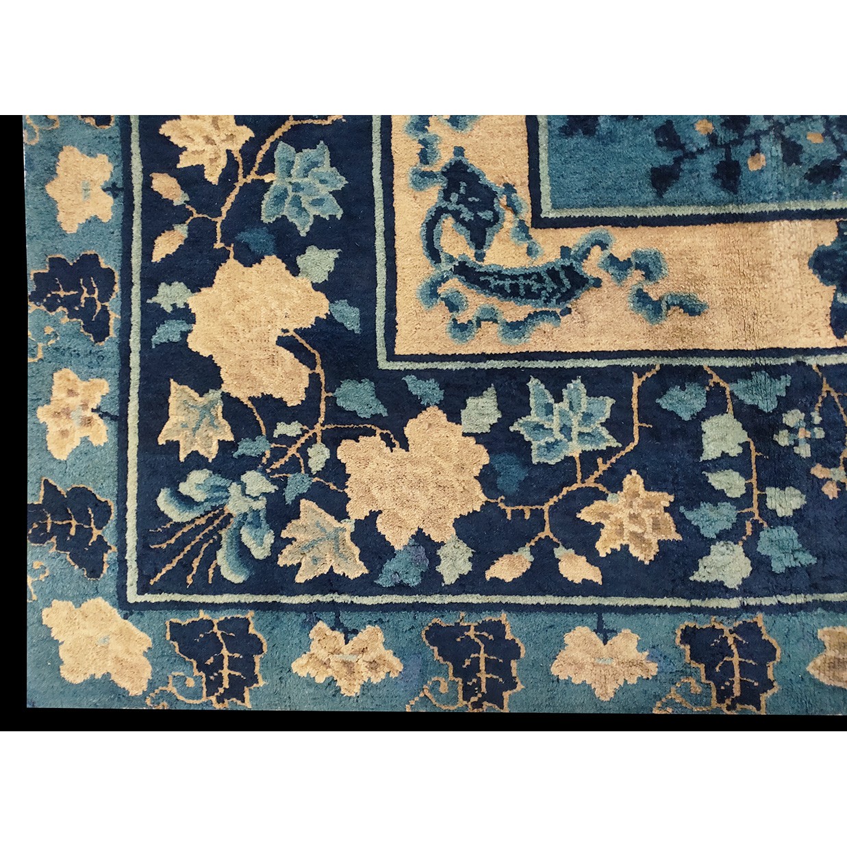 DescriptionChineseCarpets made in China proper. See entries Ningshia, Peking, Art Deco. Chinese - PekingThe commercial Peking carpet is a later 19th century development, begun by importing weaves from Ningshia (see entry) to create and export industry aimed at Western markets. The foundation is cotton and the pile is a good quality carpet wool which takes dyes particularly well. The neat medium weave is in Persian (asymmetric) knots. Designs are strictly Chinese and the whole motif repertoire of Chinese art is employed. Blue and white is the most popular color combination and red is particularly rare. Sizes tend to 9 x 12 and larger, and few small pieces appear. For a short time in the early 1920s Persian designs were woven to capitalize on the death of new Iranian goods. The industry decimated by the Communist Revolution relocated to the Pearl River area. There is a good supply of antique carpets at reasonable prices. | |