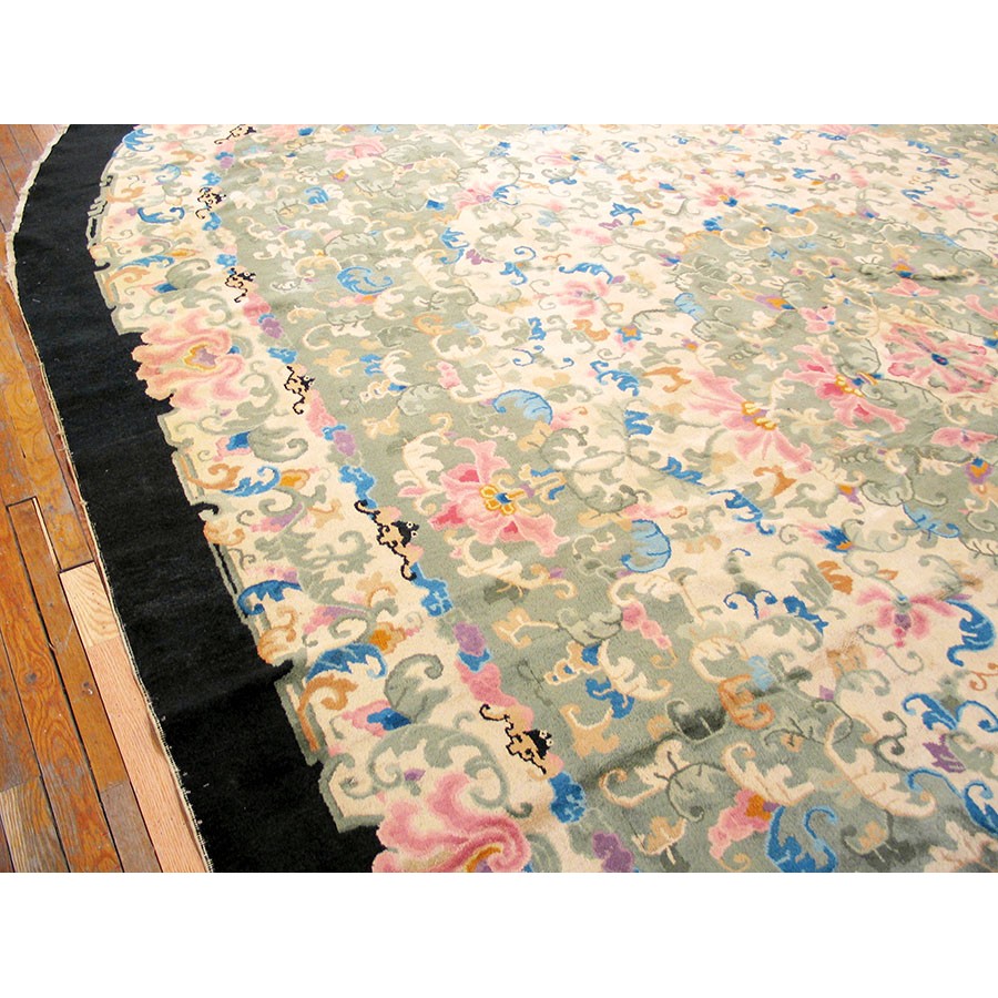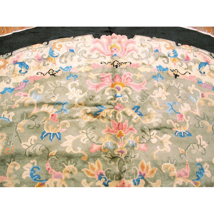DescriptionChineseCarpets made in China proper. See entries Ningshia, Peking, Art Deco. Chinese - PekingThe commercial Peking carpet is a later 19th century development, begun by importing weaves from Ningshia (see entry) to create and export industry aimed at Western markets. The foundation is cotton and the pile is a good quality carpet wool which takes dyes particularly well. The neat medium weave is in Persian (asymmetric) knots. Designs are strictly Chinese and the whole motif repertoire of Chinese art is employed. Blue and white is the most popular color combination and red is particularly rare. Sizes tend to 9 x 12 and larger, and few small pieces appear. For a short time in the early 1920s Persian designs were woven to capitalize on the death of new Iranian goods. The industry decimated by the Communist Revolution relocated to the Pearl River area. There is a good supply of antique carpets at reasonable prices. | |