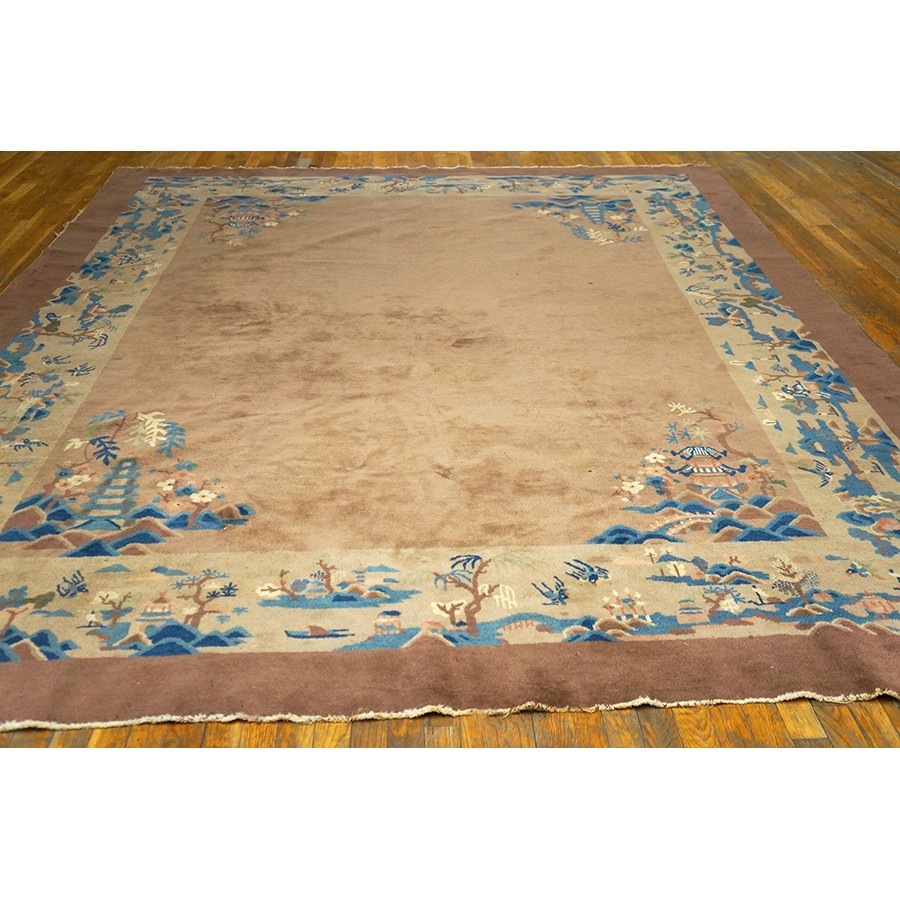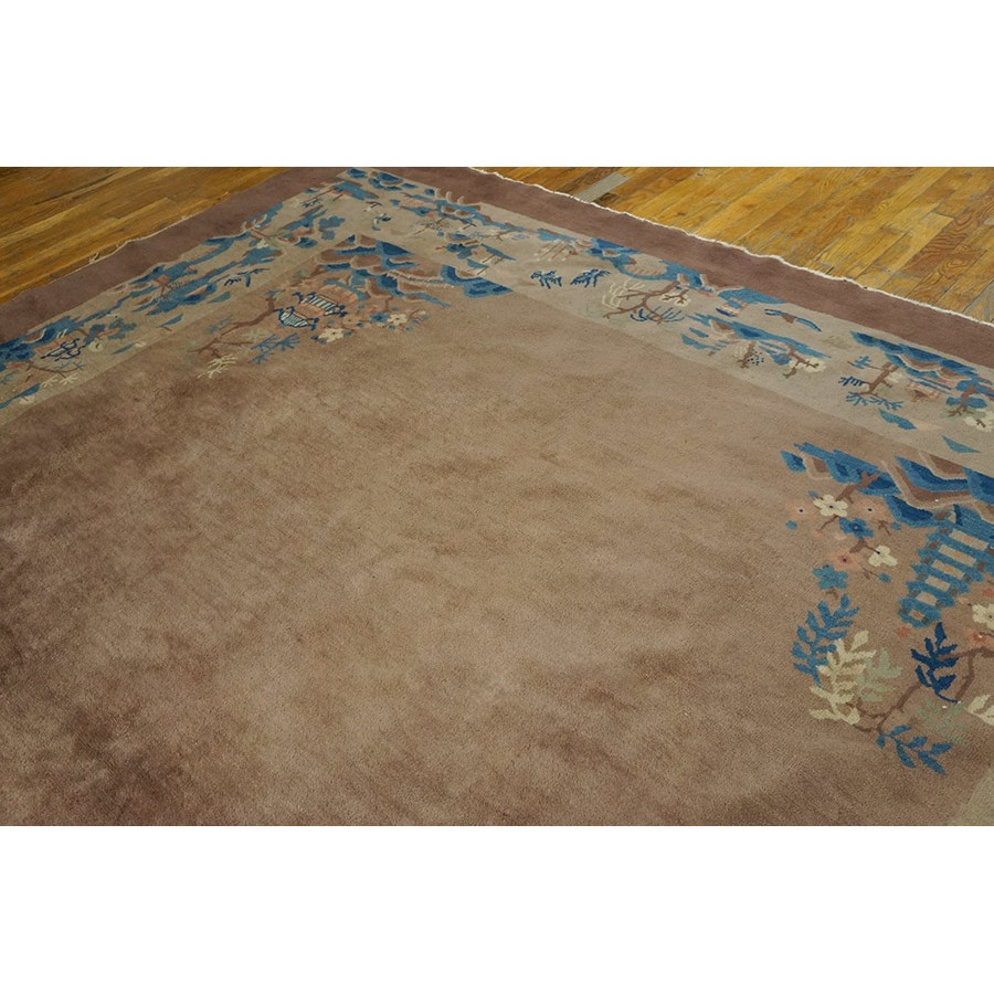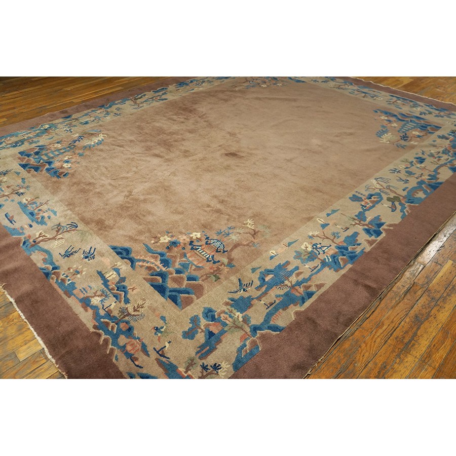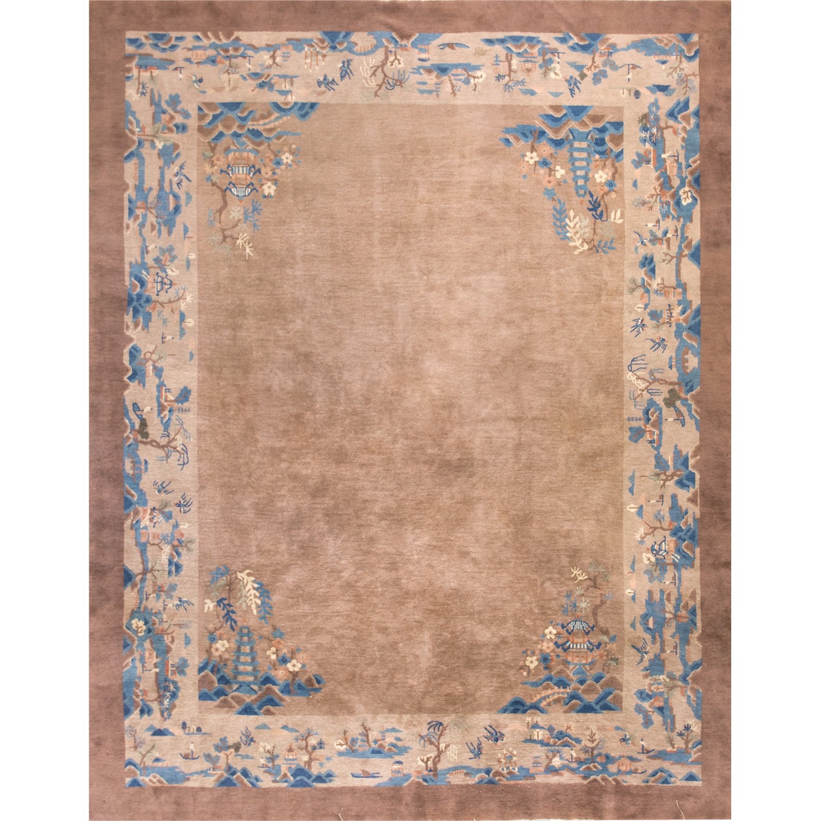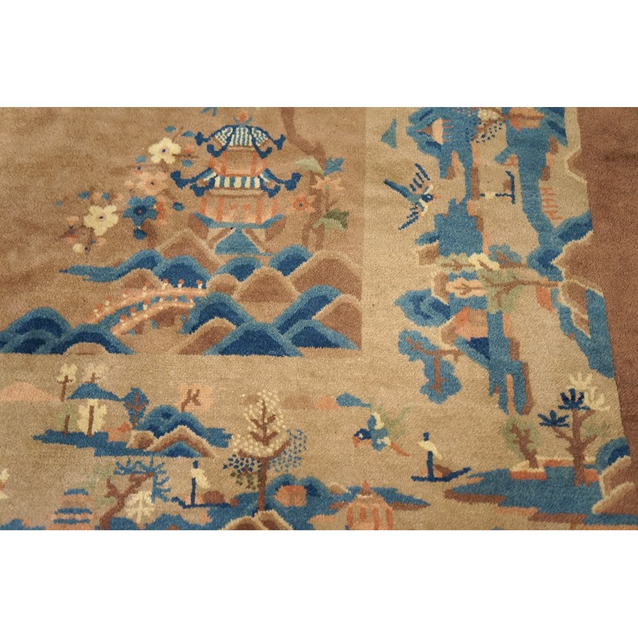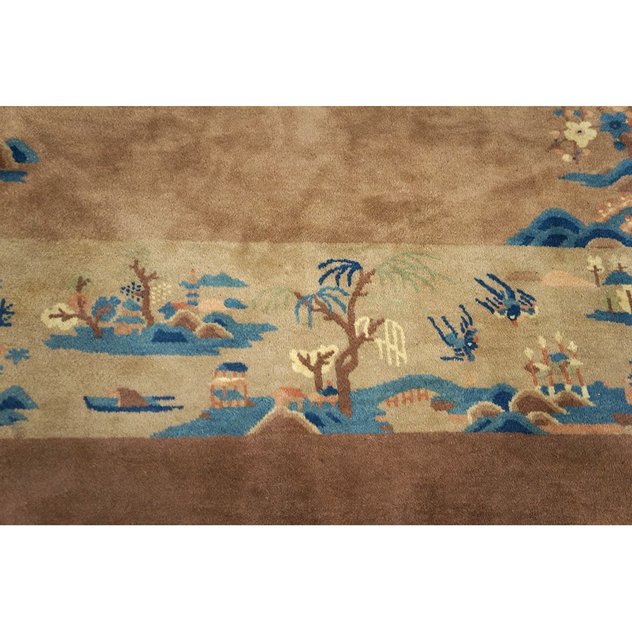 DescriptionChineseCarpets made in China proper. See entries Ningshia, Peking, Art Deco. Chinese - PekingThe commercial Peking carpet is a later 19th century development, begun by importing weaves from Ningshia (see entry) to create and export industry aimed at Western markets. The foundation is cotton and the pile is a good quality carpet wool which takes dyes particularly well. The neat medium weave is in Persian (asymmetric) knots. Designs are strictly Chinese and the whole motif repertoire of Chinese art is employed. Blue and white is the most popular color combination and red is particularly rare. Sizes tend to 9 x 12 and larger, and few small pieces appear. For a short time in the early 1920s Persian designs were woven to capitalize on the death of new Iranian goods. The industry decimated by the Communist Revolution relocated to the Pearl River area. There is a good supply of antique carpets at reasonable prices. | |