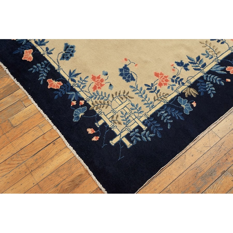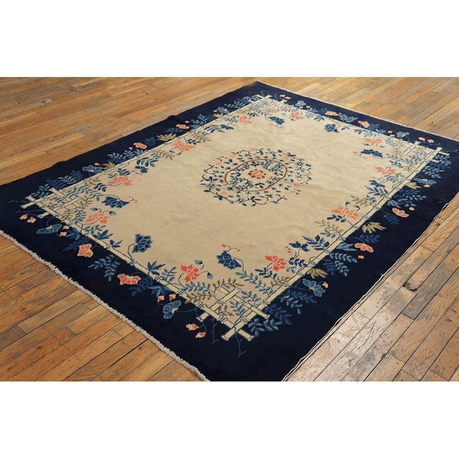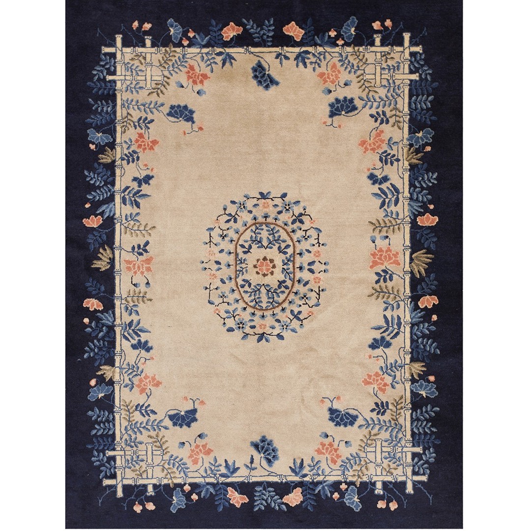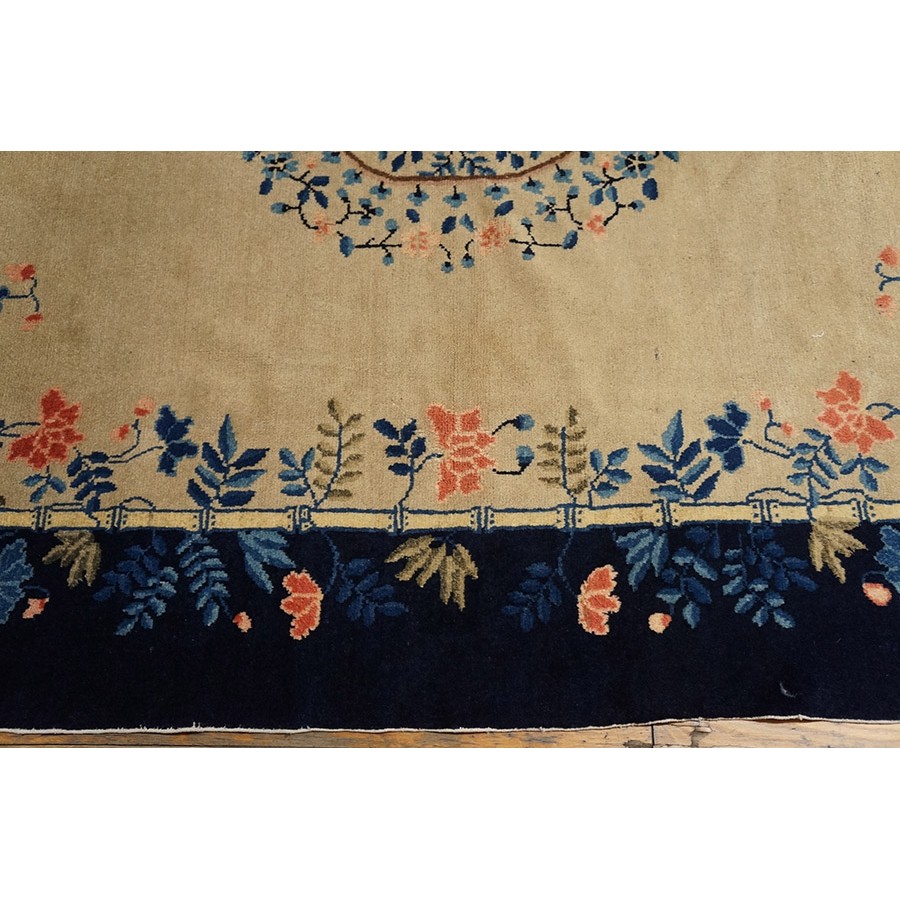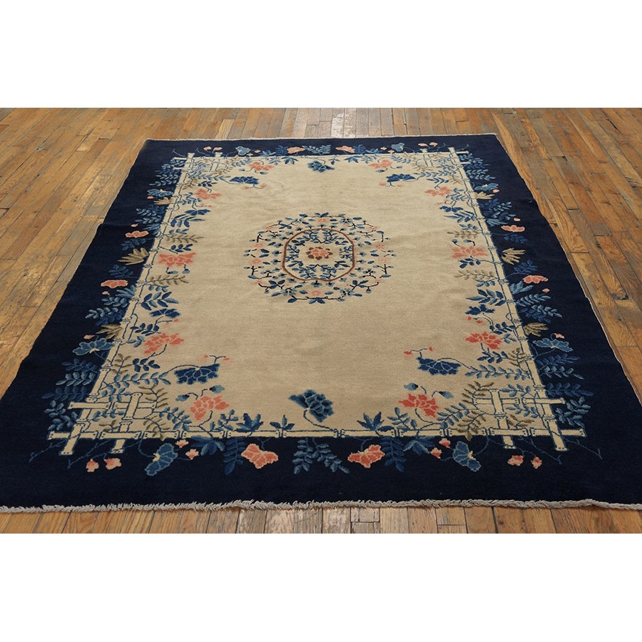 DescriptionChineseCarpets made in China proper. See entries Ningshia, Peking, Art Deco. Chinese - PekingThe commercial Peking carpet is a later 19th century development, begun by importing weaves from Ningshia (see entry) to create and export industry aimed at Western markets. The foundation is cotton and the pile is a good quality carpet wool which takes dyes particularly well. The neat medium weave is in Persian (asymmetric) knots. Designs are strictly Chinese and the whole motif repertoire of Chinese art is employed. Blue and white is the most popular color combination and red is particularly rare. Sizes tend to 9 x 12 and larger, and few small pieces appear. For a short time in the early 1920s Persian designs were woven to capitalize on the death of new Iranian goods. The industry decimated by the Communist Revolution relocated to the Pearl River area. There is a good supply of antique carpets at reasonable prices. | |
