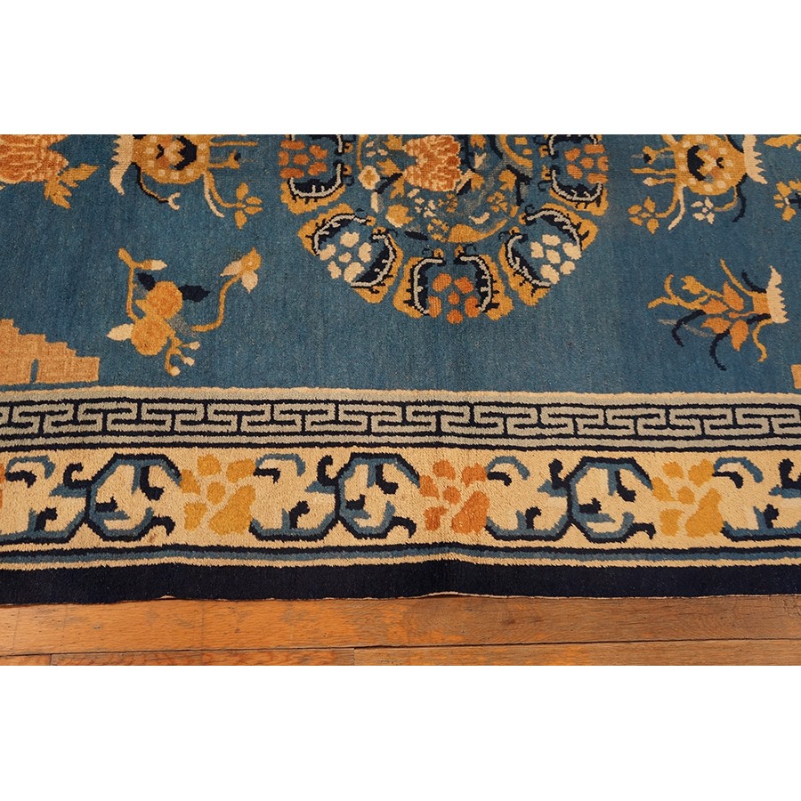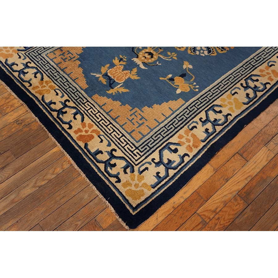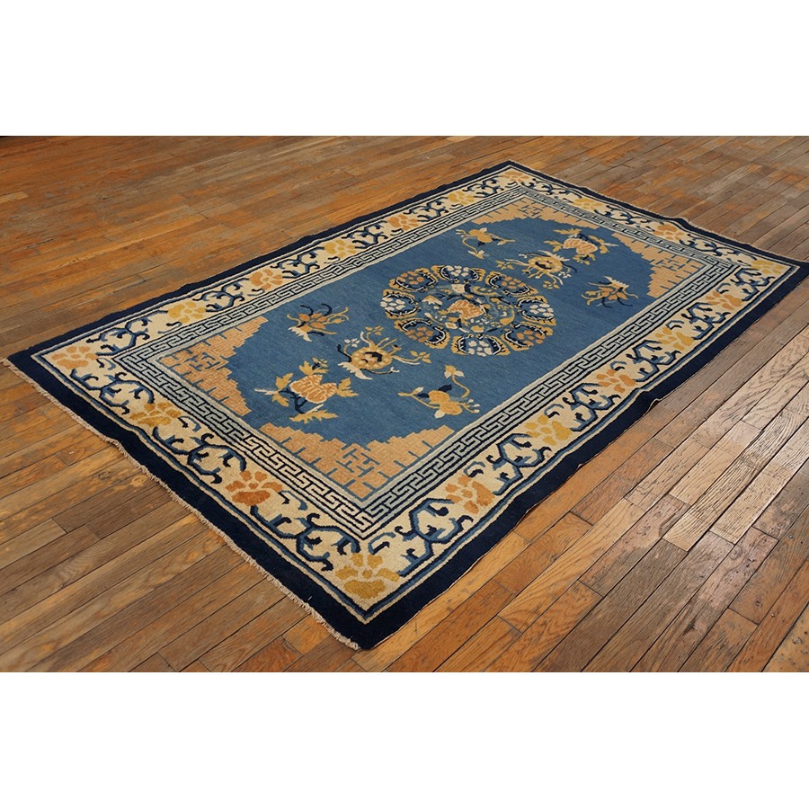 DescriptionChineseCarpets made in China proper. See entries Ningshia, Peking, Art Deco. Chinese - PekingThe commercial Peking carpet is a later 19th century development, begun by importing weaves from Ningshia (see entry) to create and export industry aimed at Western markets. The foundation is cotton and the pile is a good quality carpet wool which takes dyes particularly well. The neat medium weave is in Persian (asymmetric) knots. Designs are strictly Chinese and the whole motif repertoire of Chinese art is employed. Blue and white is the most popular color combination and red is particularly rare. Sizes tend to 9 x 12 and larger, and few small pieces appear. For a short time in the early 1920s Persian designs were woven to capitalize on the death of new Iranian goods. The industry decimated by the Communist Revolution relocated to the Pearl River area. There is a good supply of antique carpets at reasonable prices. | |