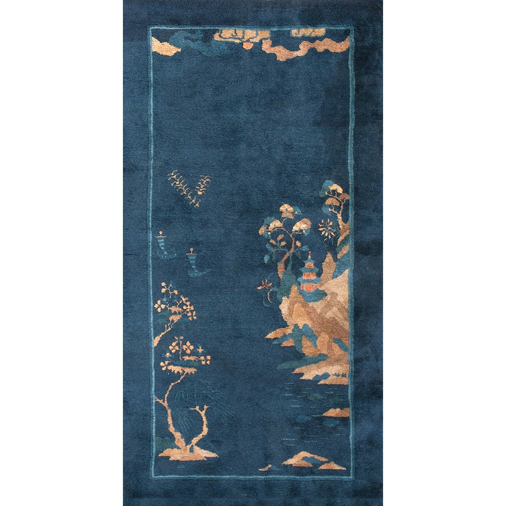 DescriptionChineseCarpets made in China proper. See entries Ningshia, Peking, Art Deco. Chinese - PekingThe commercial Peking carpet is a later 19th century development, begun by importing weaves from Ningshia (see entry) to create and export industry aimed at Western markets. The foundation is cotton and the pile is a good quality carpet wool which takes dyes particularly well. The neat medium weave is in Persian (asymmetric) knots. Designs are strictly Chinese and the whole motif repertoire of Chinese art is employed. Blue and white is the most popular color combination and red is particularly rare. Sizes tend to 9 x 12 and larger, and few small pieces appear. For a short time in the early 1920s Persian designs were woven to capitalize on the death of new Iranian goods. The industry decimated by the Communist Revolution relocated to the Pearl River area. There is a good supply of antique carpets at reasonable prices. | |