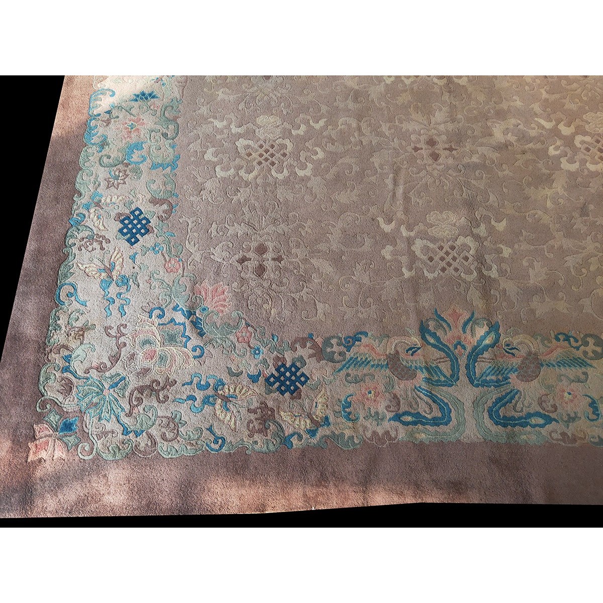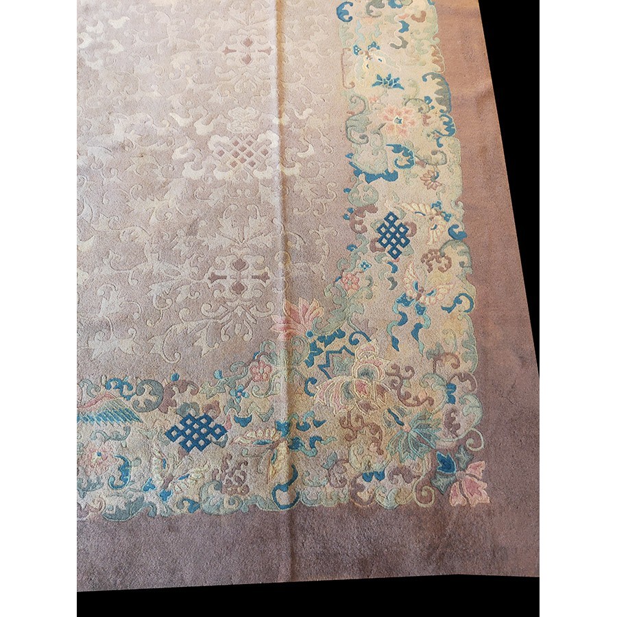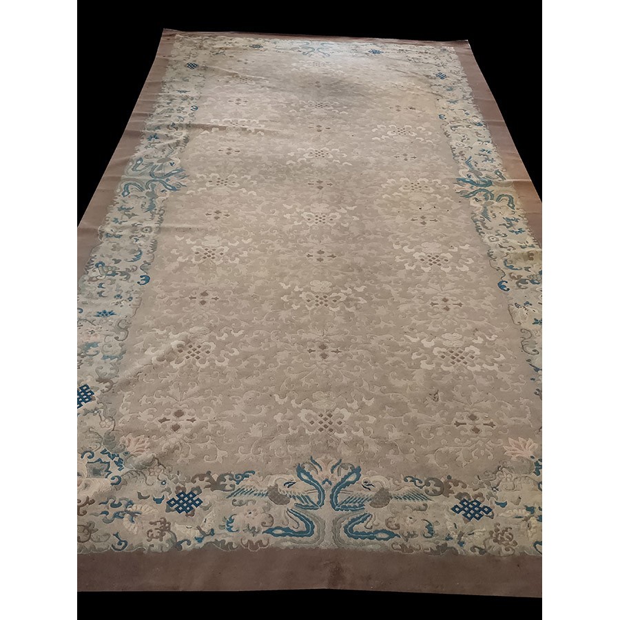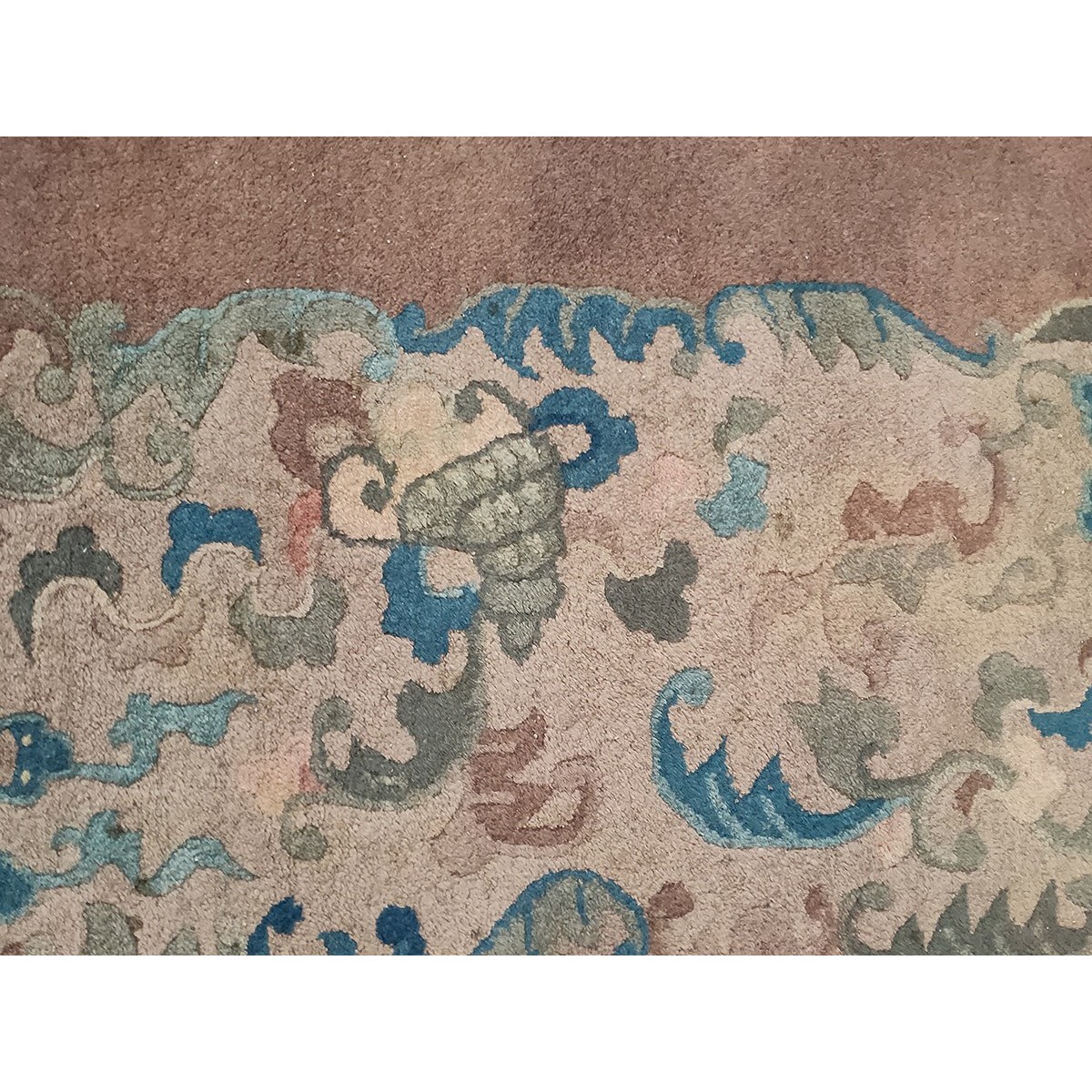 DescriptionChineseCarpets made in China proper. See entries Ningshia, Peking, Art Deco. Chinese - PekingThe commercial Peking carpet is a later 19th century development, begun by importing weaves from Ningshia (see entry) to create and export industry aimed at Western markets. The foundation is cotton and the pile is a good quality carpet wool which takes dyes particularly well. The neat medium weave is in Persian (asymmetric) knots. Designs are strictly Chinese and the whole motif repertoire of Chinese art is employed. Blue and white is the most popular color combination and red is particularly rare. Sizes tend to 9 x 12 and larger, and few small pieces appear. For a short time in the early 1920s Persian designs were woven to capitalize on the death of new Iranian goods. The industry decimated by the Communist Revolution relocated to the Pearl River area. There is a good supply of antique carpets at reasonable prices. | |