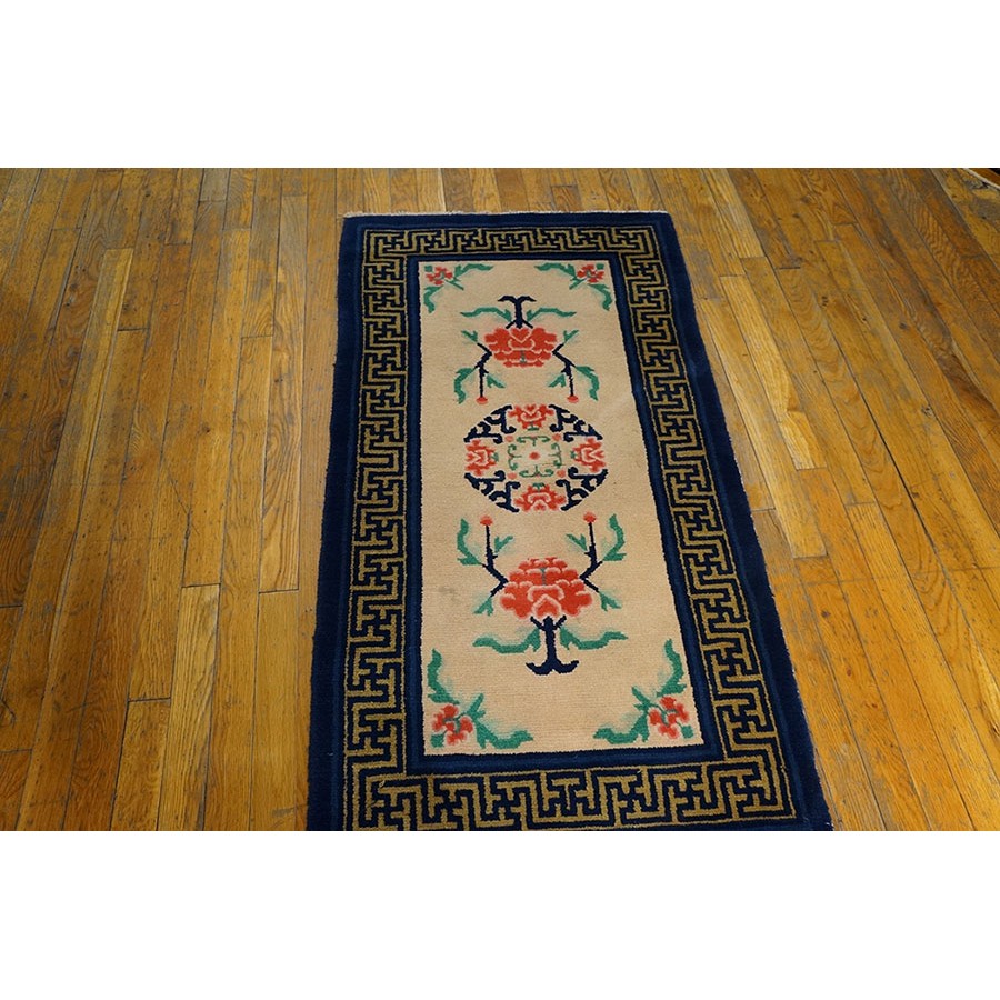 DescriptionChineseCarpets made in China proper. See entries Ningshia, Peking, Art Deco. Chinese - PekingThe commercial Peking carpet is a later 19th century development, begun by importing weaves from Ningshia (see entry) to create and export industry aimed at Western markets. The foundation is cotton and the pile is a good quality carpet wool which takes dyes particularly well. The neat medium weave is in Persian (asymmetric) knots. Designs are strictly Chinese and the whole motif repertoire of Chinese art is employed. Blue and white is the most popular color combination and red is particularly rare. Sizes tend to 9 x 12 and larger, and few small pieces appear. For a short time in the early 1920s Persian designs were woven to capitalize on the death of new Iranian goods. The industry decimated by the Communist Revolution relocated to the Pearl River area. There is a good supply of antique carpets at reasonable prices. | |