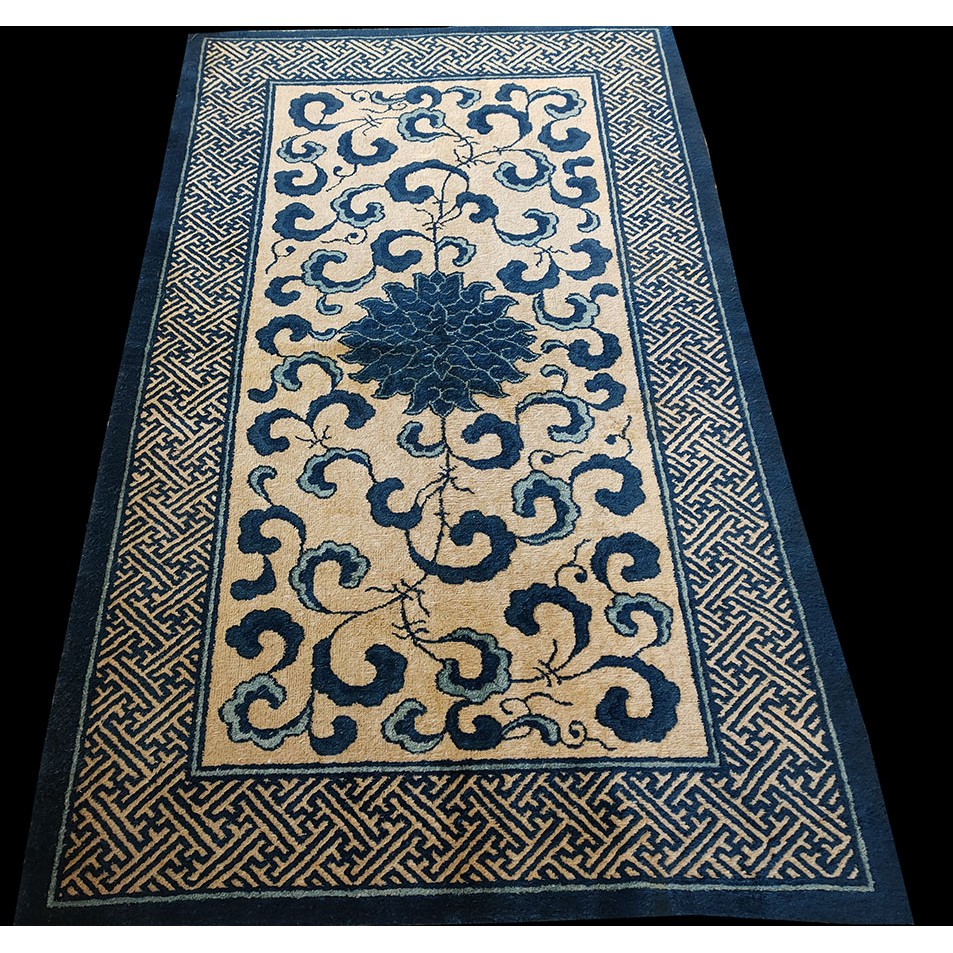 DescriptionChineseCarpets made in China proper. See entries Ningshia, Peking, Art Deco. Chinese - PekingThe commercial Peking carpet is a later 19th century development, begun by importing weaves from Ningshia (see entry) to create and export industry aimed at Western markets. The foundation is cotton and the pile is a good quality carpet wool which takes dyes particularly well. The neat medium weave is in Persian (asymmetric) knots. Designs are strictly Chinese and the whole motif repertoire of Chinese art is employed. Blue and white is the most popular color combination and red is particularly rare. Sizes tend to 9 x 12 and larger, and few small pieces appear. For a short time in the early 1920s Persian designs were woven to capitalize on the death of new Iranian goods. The industry decimated by the Communist Revolution relocated to the Pearl River area. There is a good supply of antique carpets at reasonable prices. | |
