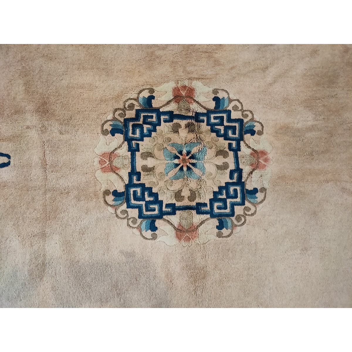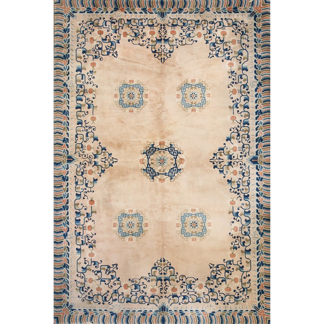 DescriptionChineseCarpets made in China proper. See entries Ningshia, Peking, Art Deco. Chinese - PekingThe commercial Peking carpet is a later 19th century development, begun by importing weaves from Ningshia (see entry) to create and export industry aimed at Western markets. The foundation is cotton and the pile is a good quality carpet wool which takes dyes particularly well. The neat medium weave is in Persian (asymmetric) knots. Designs are strictly Chinese and the whole motif repertoire of Chinese art is employed. Blue and white is the most popular color combination and red is particularly rare. Sizes tend to 9 x 12 and larger, and few small pieces appear. For a short time in the early 1920s Persian designs were woven to capitalize on the death of new Iranian goods. The industry decimated by the Communist Revolution relocated to the Pearl River area. There is a good supply of antique carpets at reasonable prices. | |