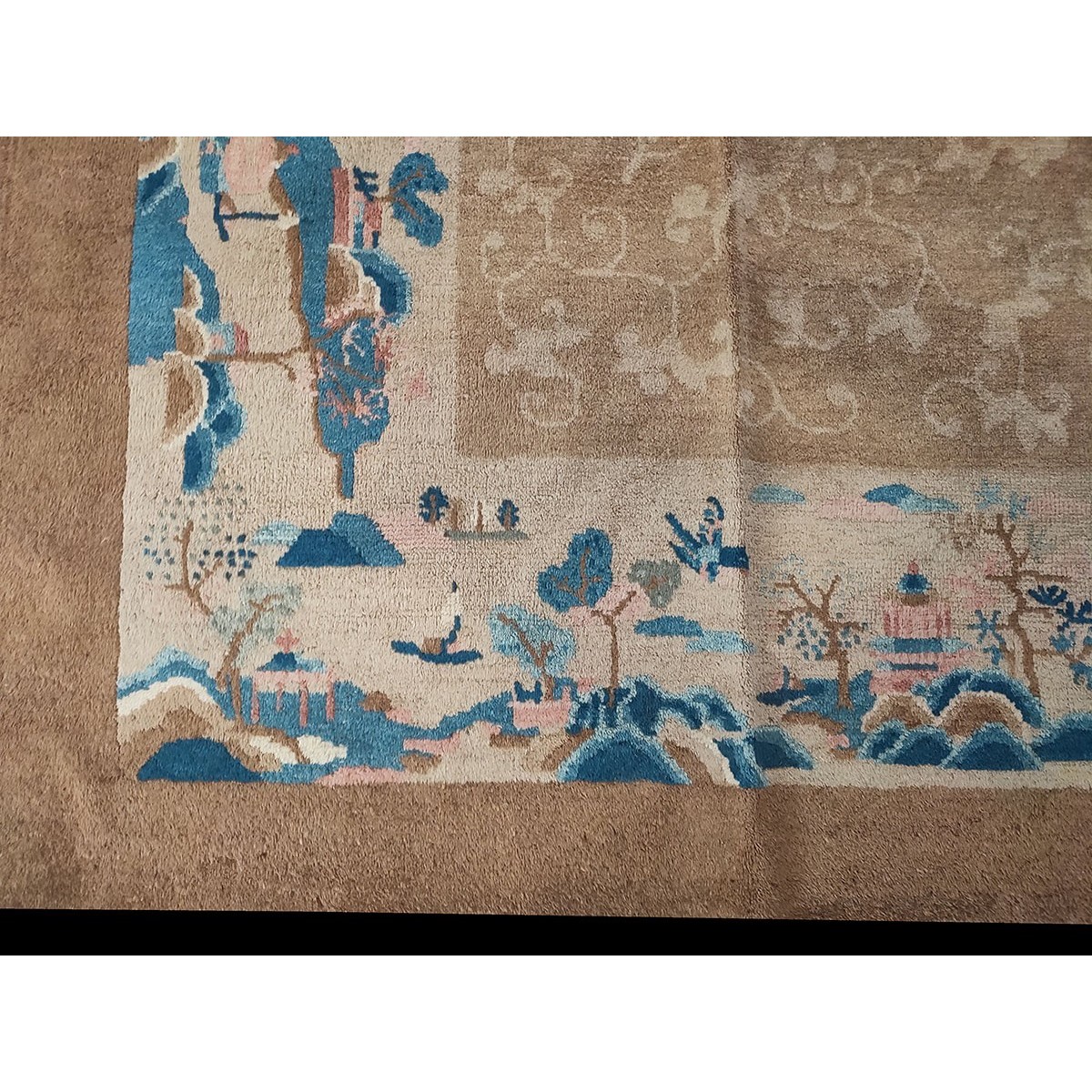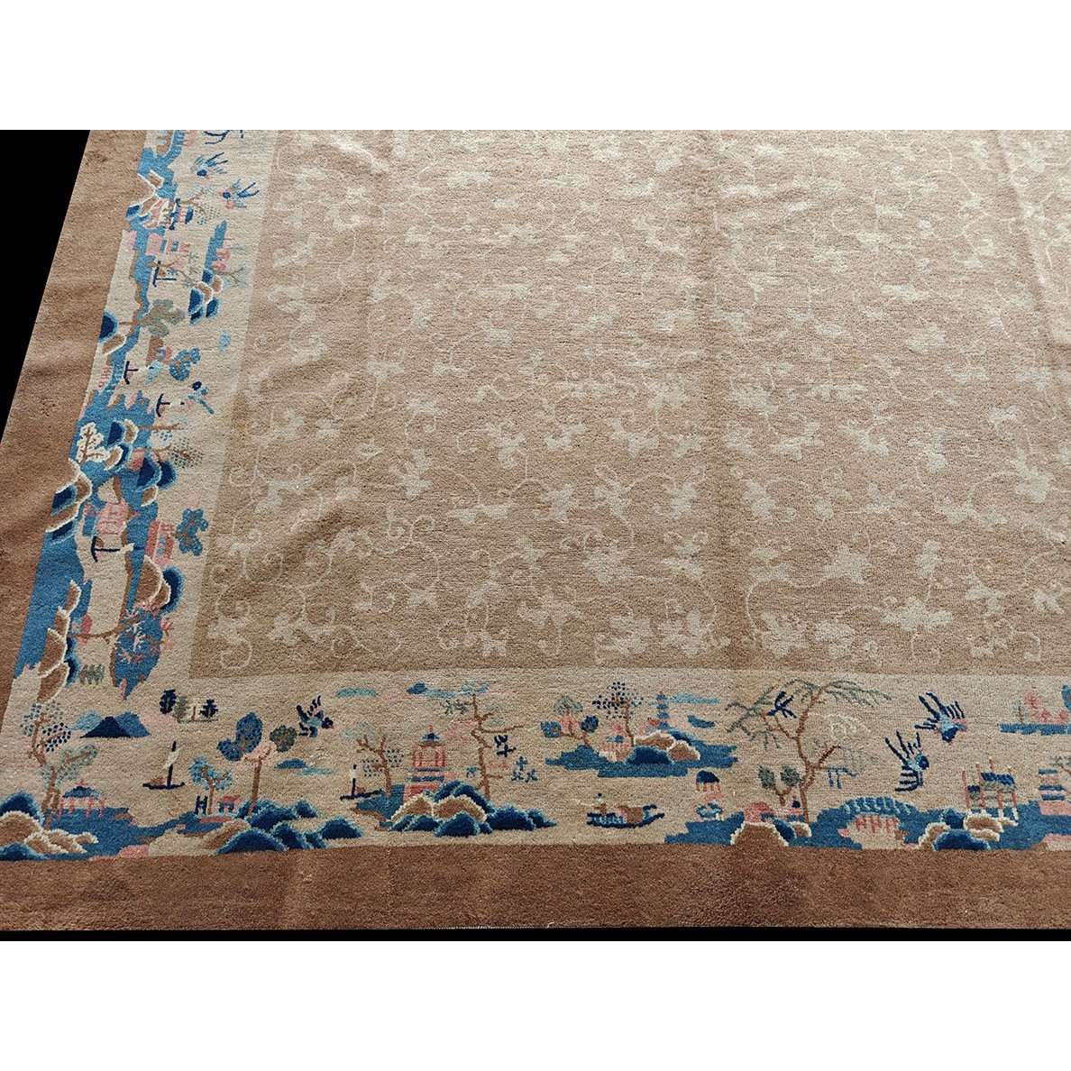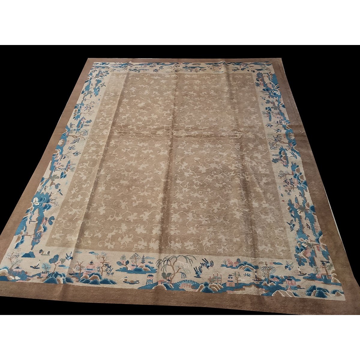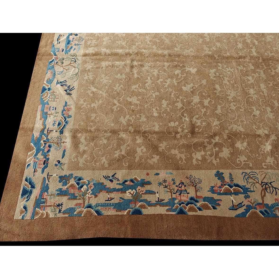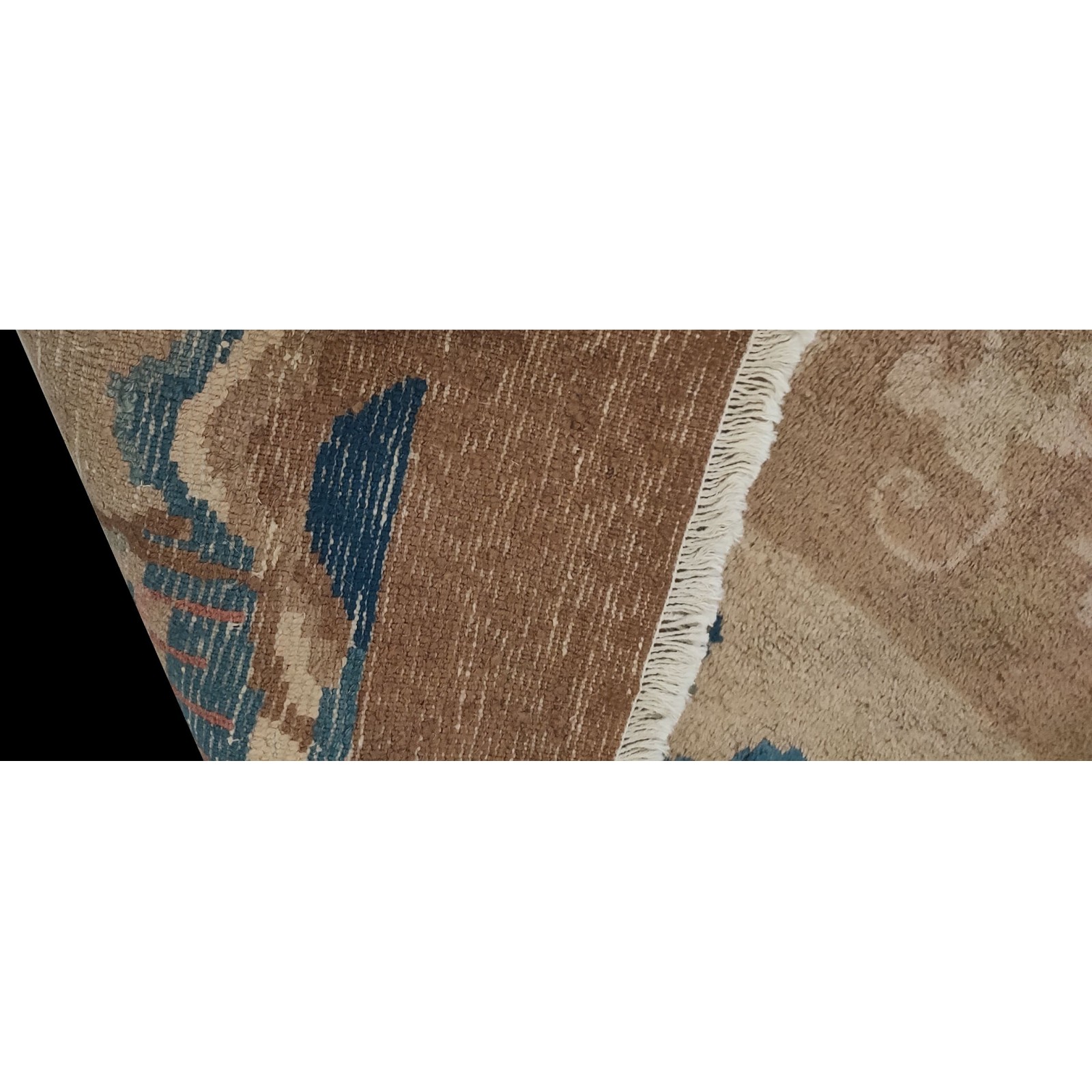DescriptionChineseCarpets made in China proper. See entries Ningshia, Peking, Art Deco. Chinese - PekingThe commercial Peking carpet is a later 19th century development, begun by importing weaves from Ningshia (see entry) to create and export industry aimed at Western markets. The foundation is cotton and the pile is a good quality carpet wool which takes dyes particularly well. The neat medium weave is in Persian (asymmetric) knots. Designs are strictly Chinese and the whole motif repertoire of Chinese art is employed. Blue and white is the most popular color combination and red is particularly rare. Sizes tend to 9 x 12 and larger, and few small pieces appear. For a short time in the early 1920s Persian designs were woven to capitalize on the death of new Iranian goods. The industry decimated by the Communist Revolution relocated to the Pearl River area. There is a good supply of antique carpets at reasonable prices. | |