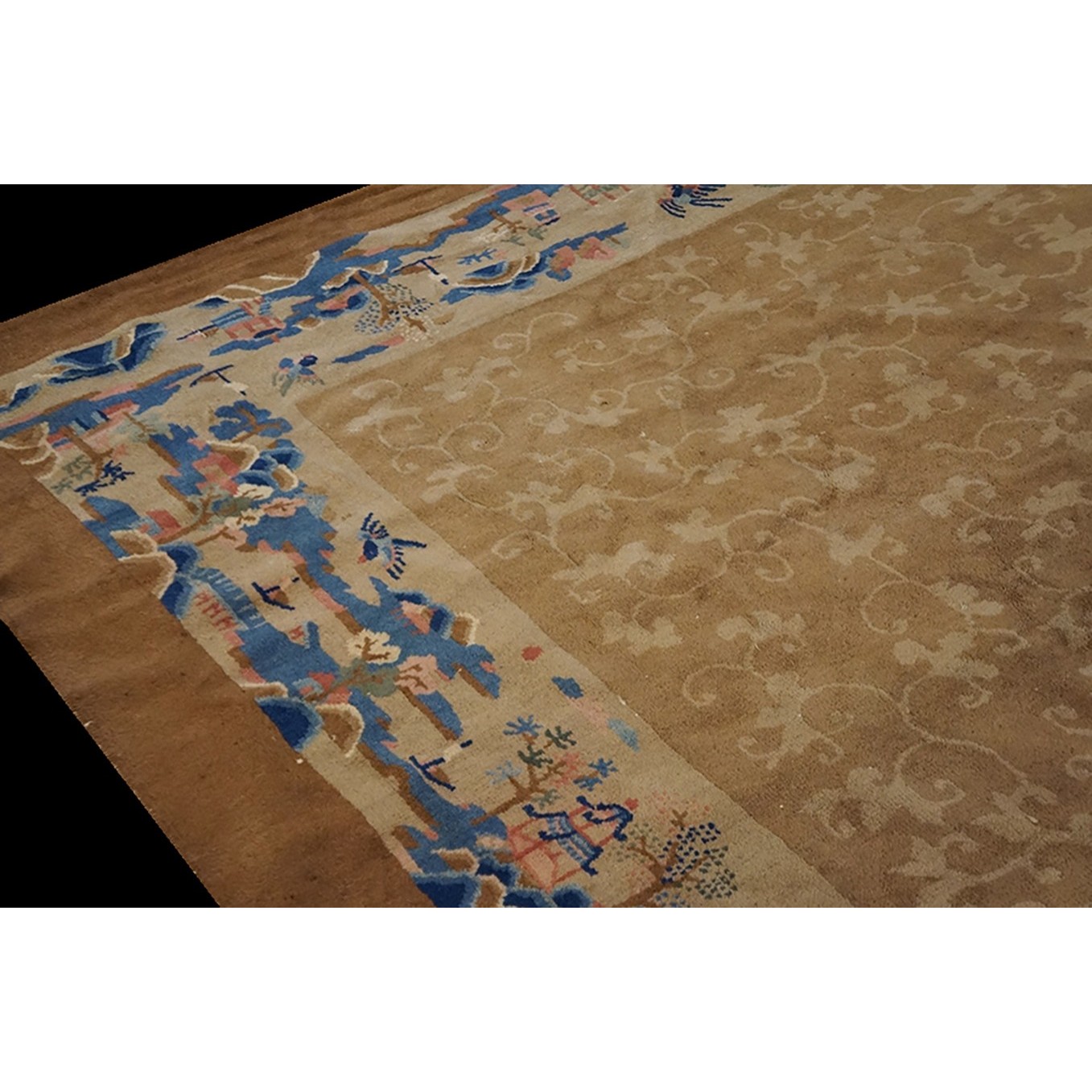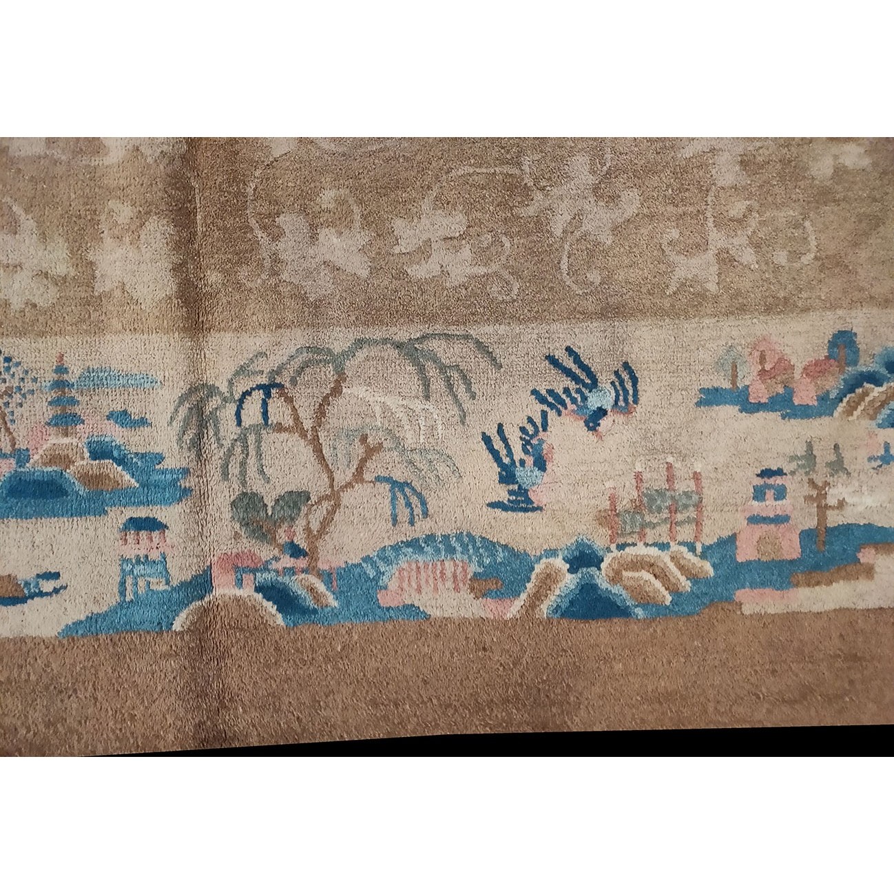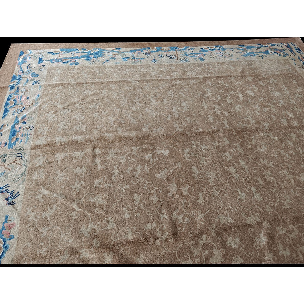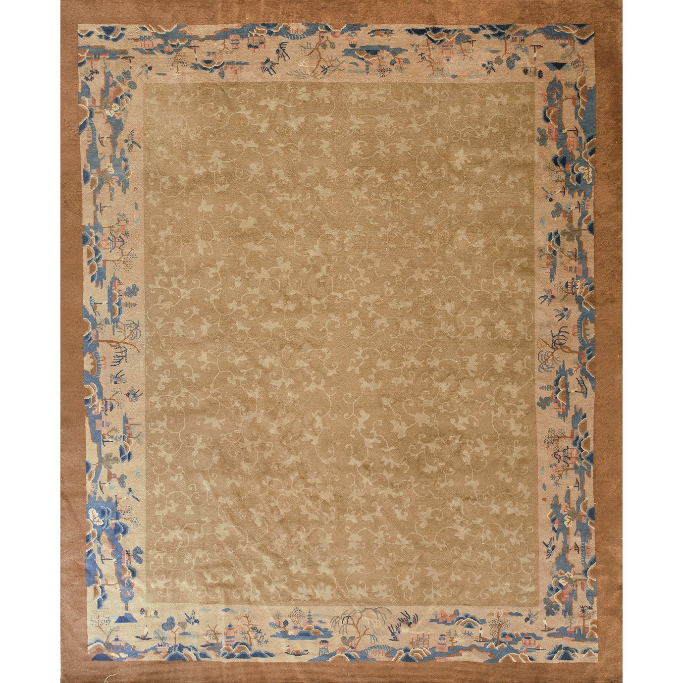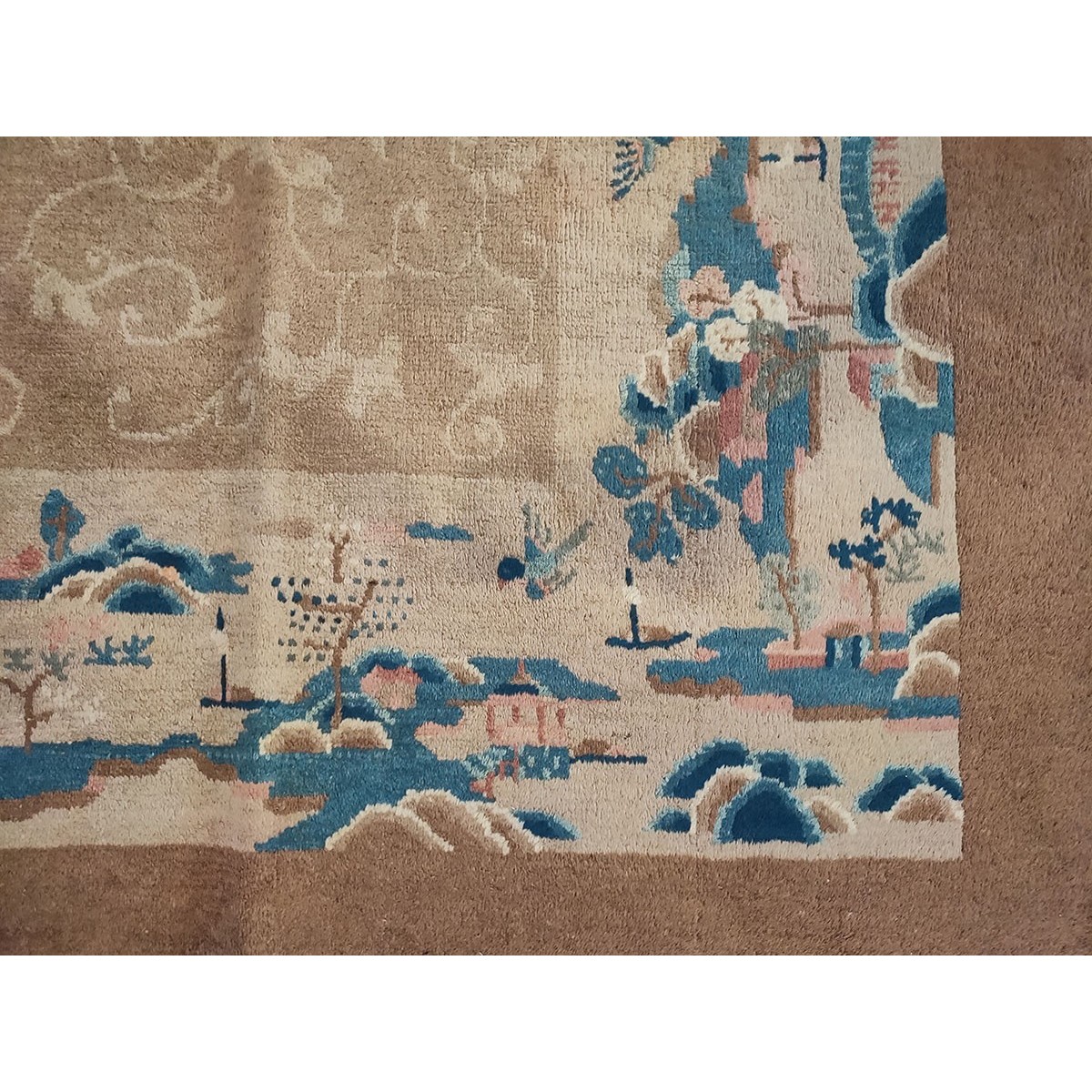 DescriptionChineseCarpets made in China proper. See entries Ningshia, Peking, Art Deco. Chinese - PekingThe commercial Peking carpet is a later 19th century development, begun by importing weaves from Ningshia (see entry) to create and export industry aimed at Western markets. The foundation is cotton and the pile is a good quality carpet wool which takes dyes particularly well. The neat medium weave is in Persian (asymmetric) knots. Designs are strictly Chinese and the whole motif repertoire of Chinese art is employed. Blue and white is the most popular color combination and red is particularly rare. Sizes tend to 9 x 12 and larger, and few small pieces appear. For a short time in the early 1920s Persian designs were woven to capitalize on the death of new Iranian goods. The industry decimated by the Communist Revolution relocated to the Pearl River area. There is a good supply of antique carpets at reasonable prices. | |