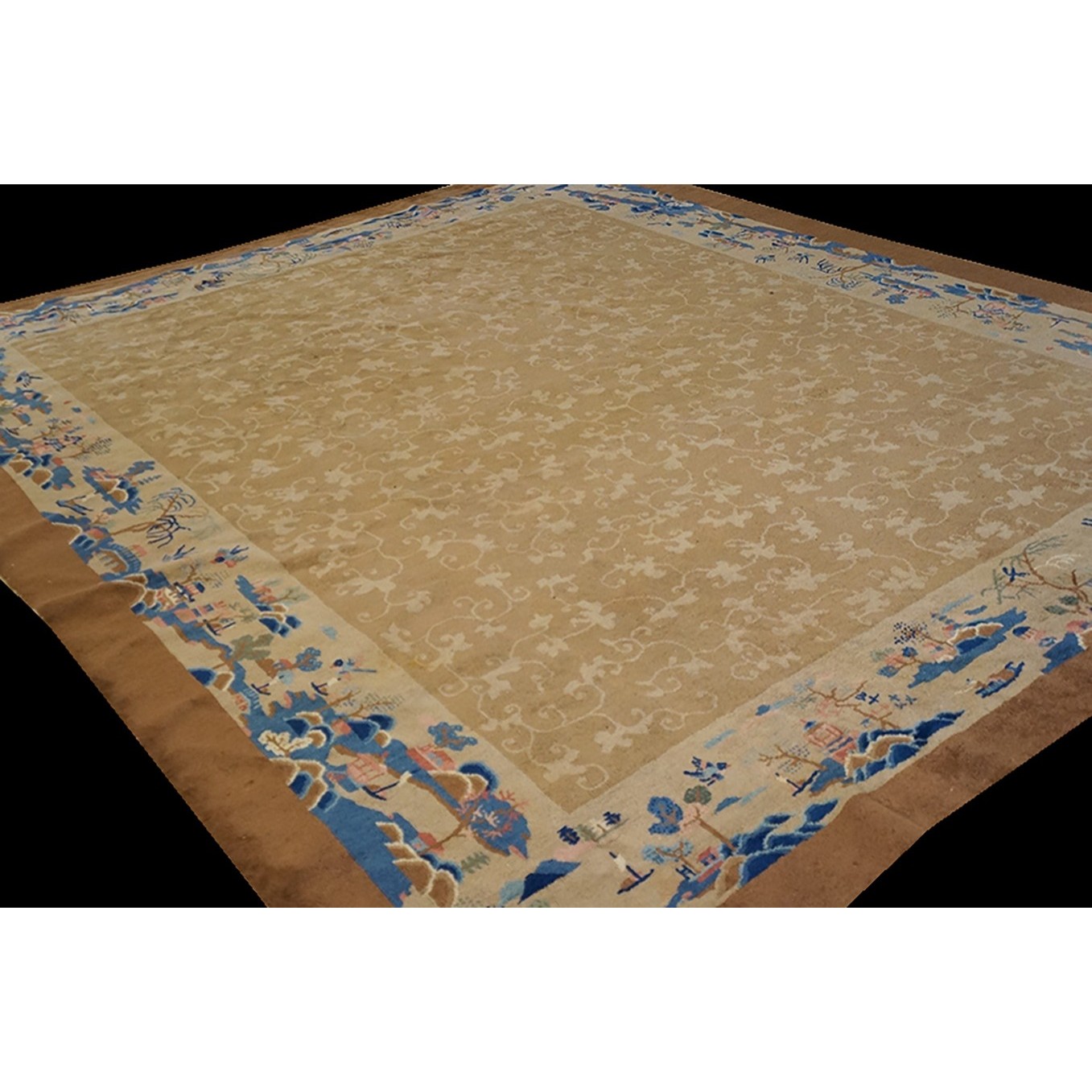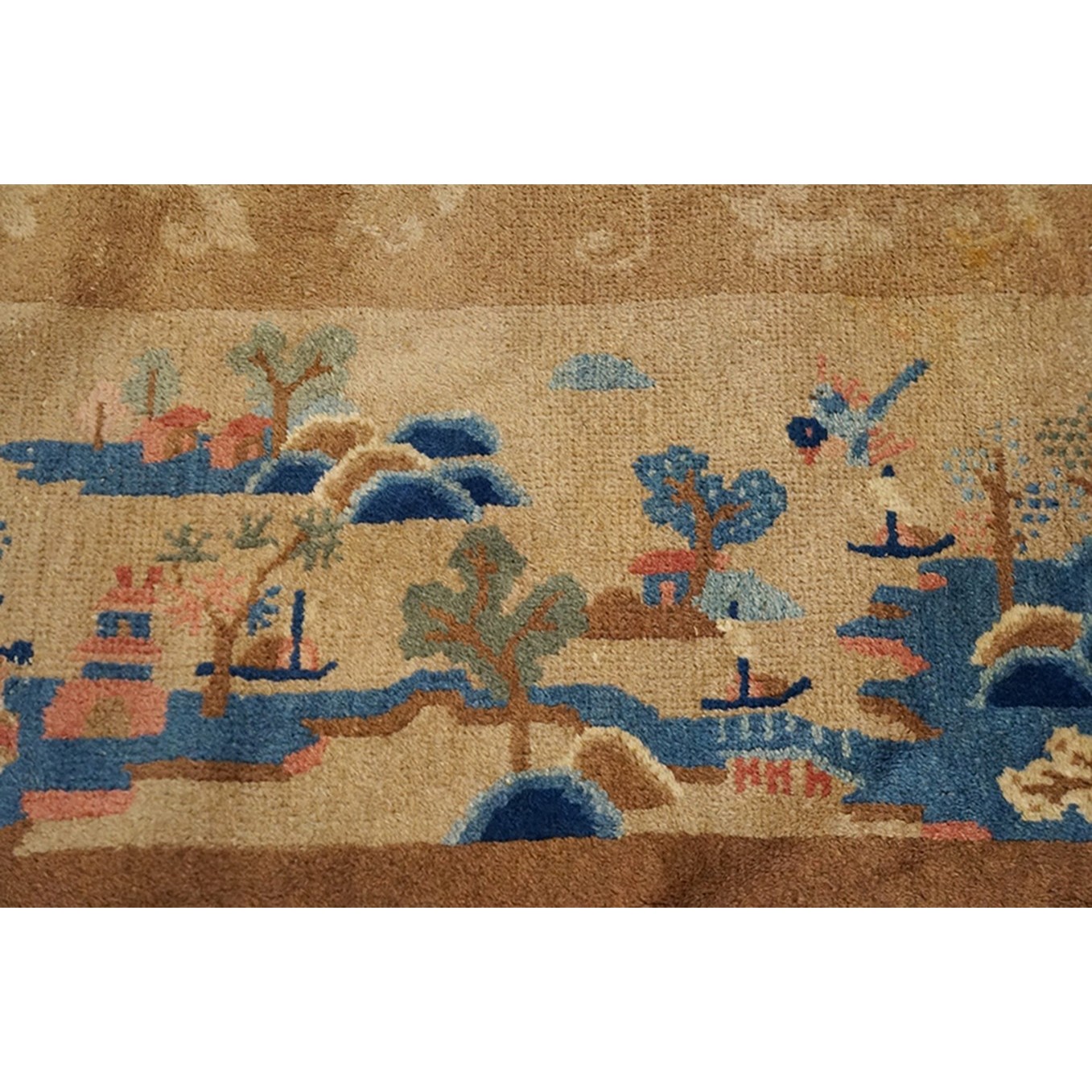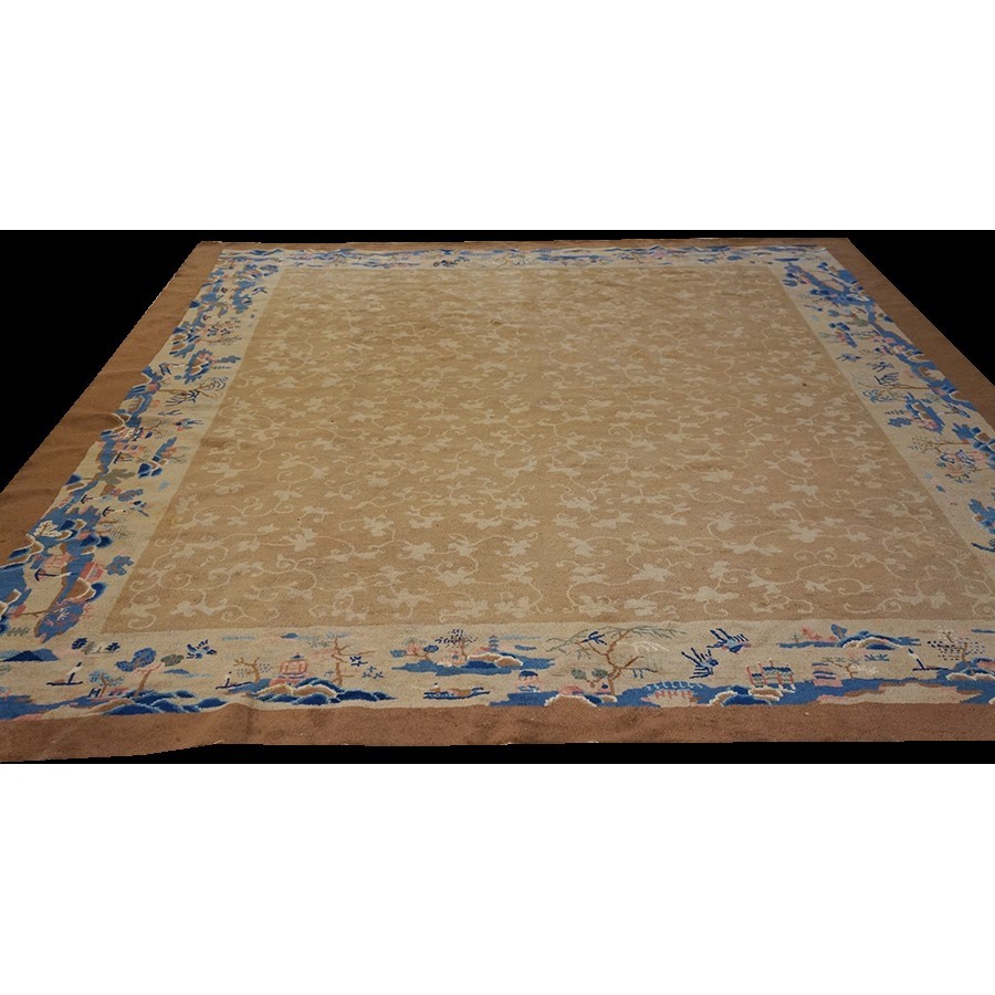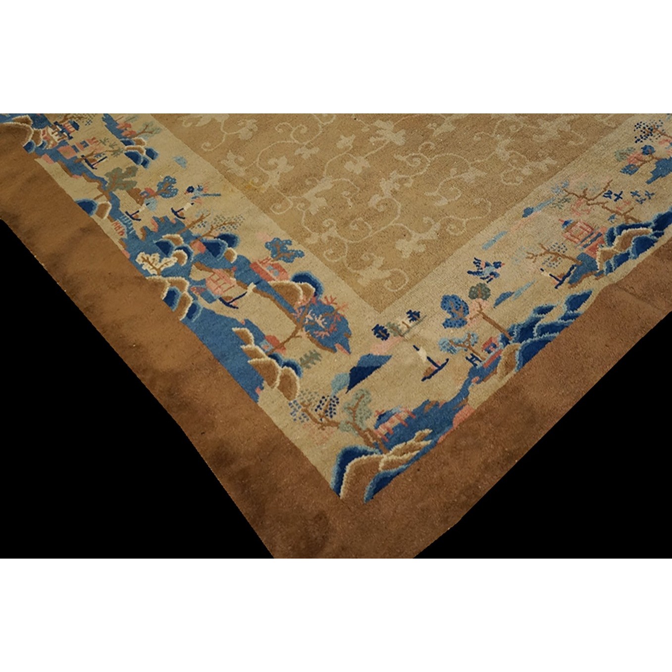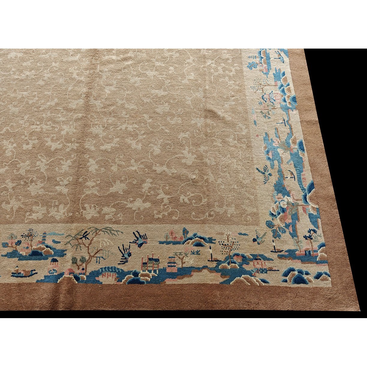 DescriptionChineseCarpets made in China proper. See entries Ningshia, Peking, Art Deco. Chinese - PekingThe commercial Peking carpet is a later 19th century development, begun by importing weaves from Ningshia (see entry) to create and export industry aimed at Western markets. The foundation is cotton and the pile is a good quality carpet wool which takes dyes particularly well. The neat medium weave is in Persian (asymmetric) knots. Designs are strictly Chinese and the whole motif repertoire of Chinese art is employed. Blue and white is the most popular color combination and red is particularly rare. Sizes tend to 9 x 12 and larger, and few small pieces appear. For a short time in the early 1920s Persian designs were woven to capitalize on the death of new Iranian goods. The industry decimated by the Communist Revolution relocated to the Pearl River area. There is a good supply of antique carpets at reasonable prices. | |