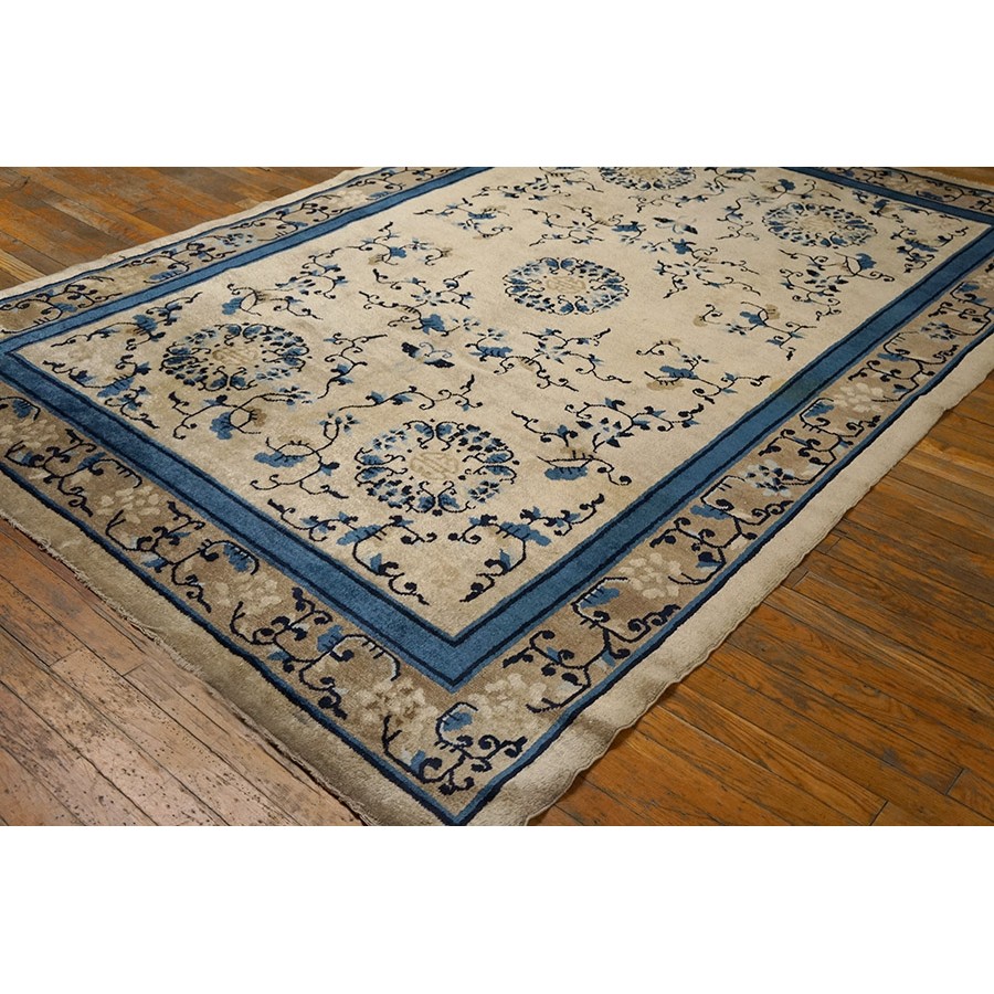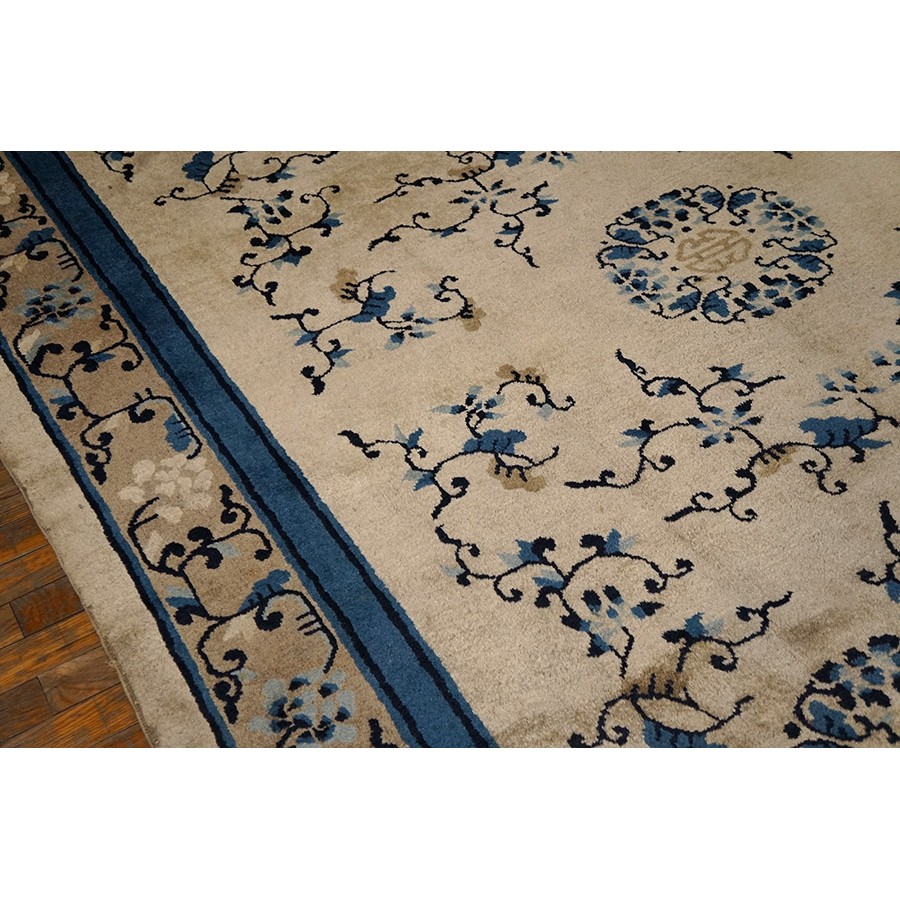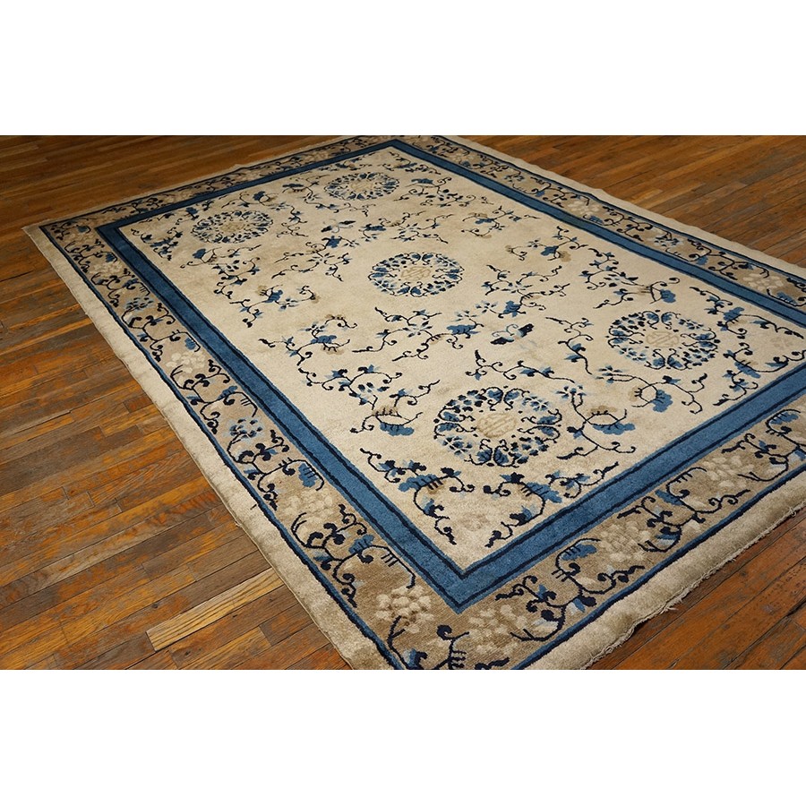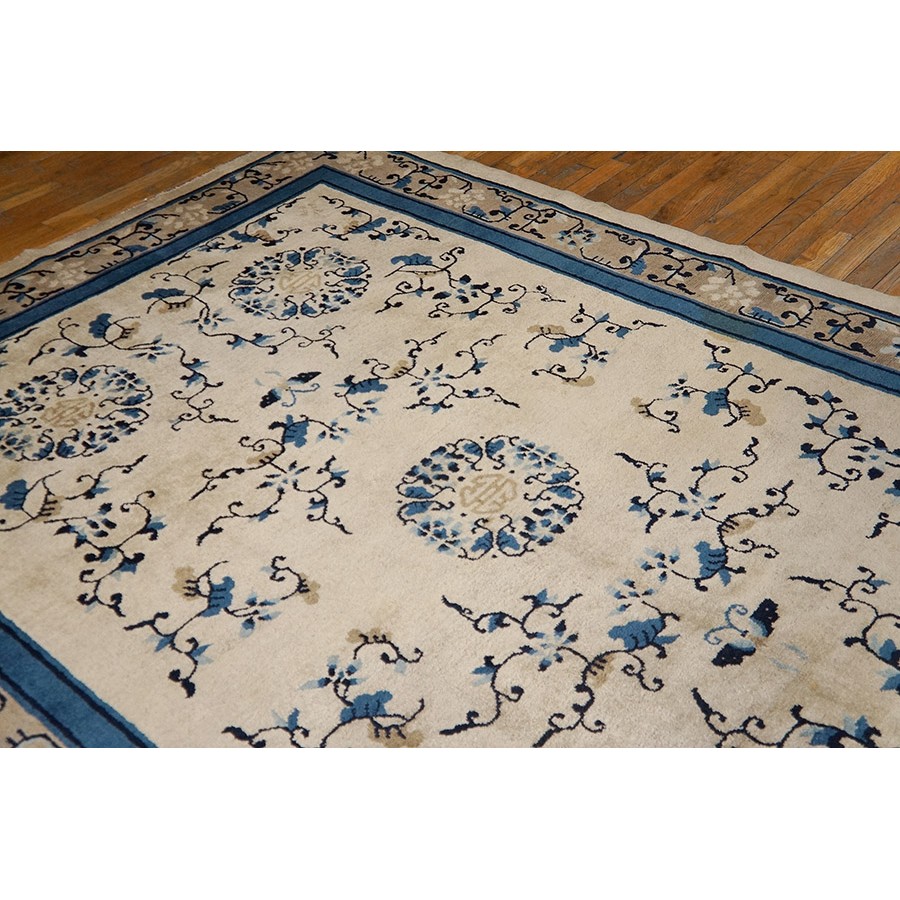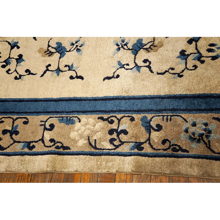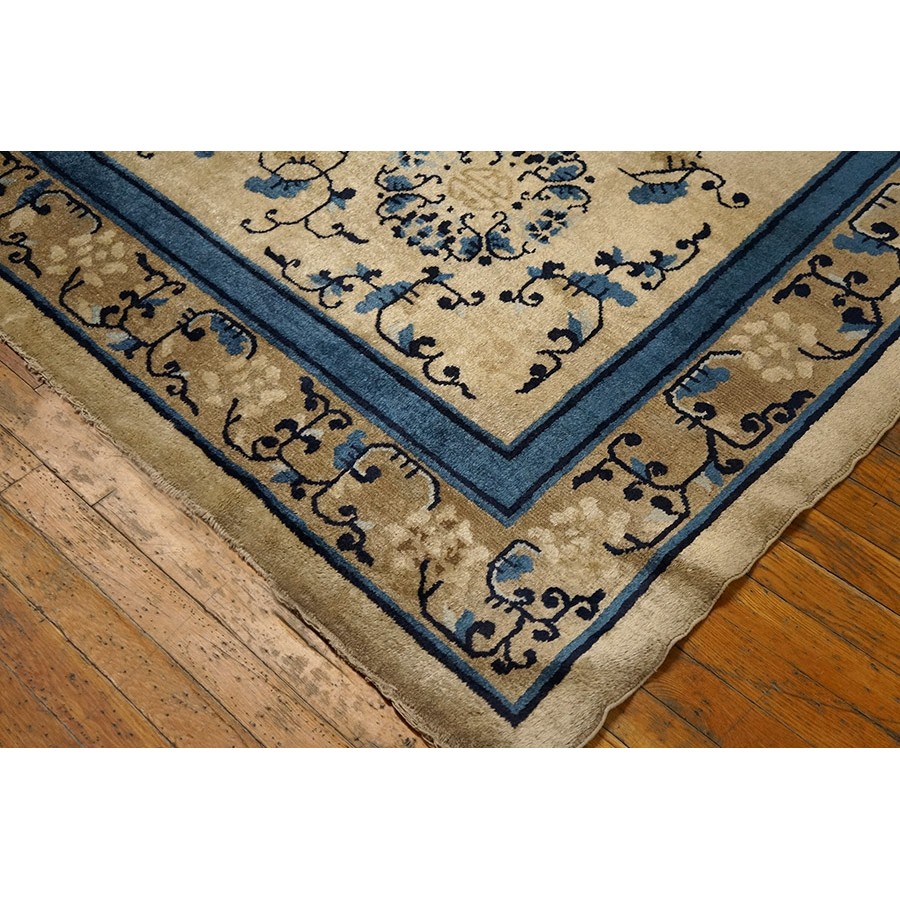 DescriptionChineseCarpets made in China proper. See entries Ningshia, Peking, Art Deco. Chinese - PekingThe commercial Peking carpet is a later 19th century development, begun by importing weaves from Ningshia (see entry) to create and export industry aimed at Western markets. The foundation is cotton and the pile is a good quality carpet wool which takes dyes particularly well. The neat medium weave is in Persian (asymmetric) knots. Designs are strictly Chinese and the whole motif repertoire of Chinese art is employed. Blue and white is the most popular color combination and red is particularly rare. Sizes tend to 9 x 12 and larger, and few small pieces appear. For a short time in the early 1920s Persian designs were woven to capitalize on the death of new Iranian goods. The industry decimated by the Communist Revolution relocated to the Pearl River area. There is a good supply of antique carpets at reasonable prices. | |