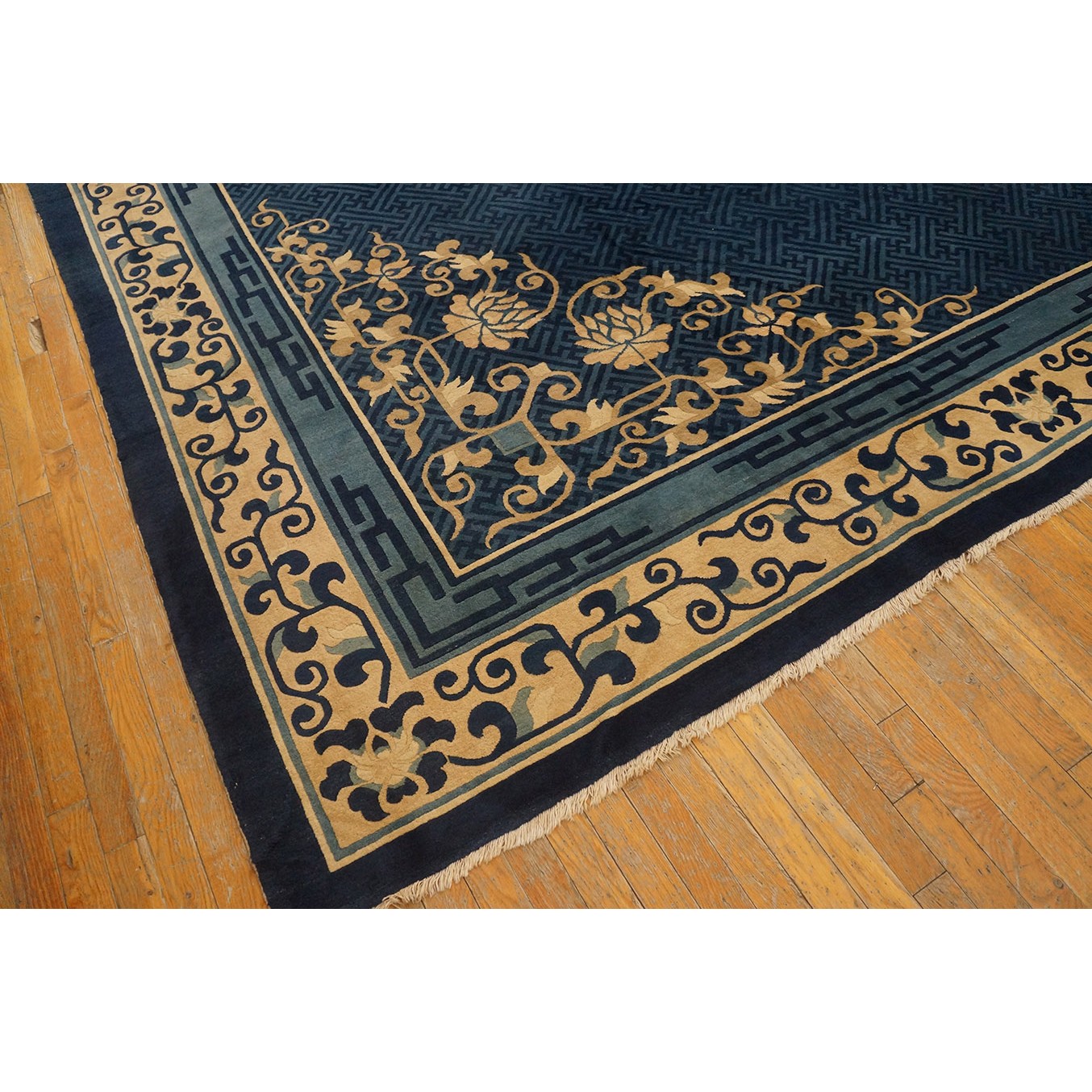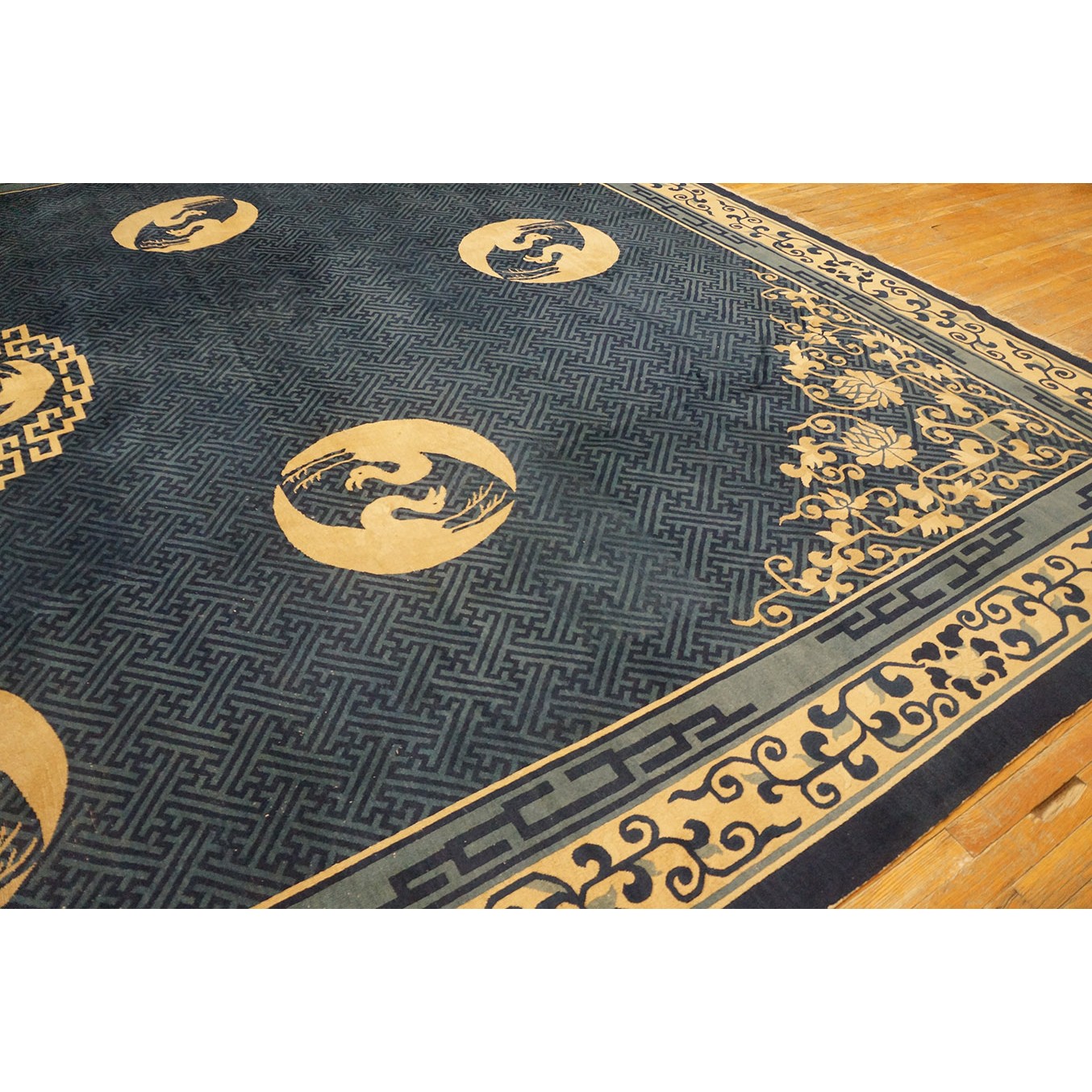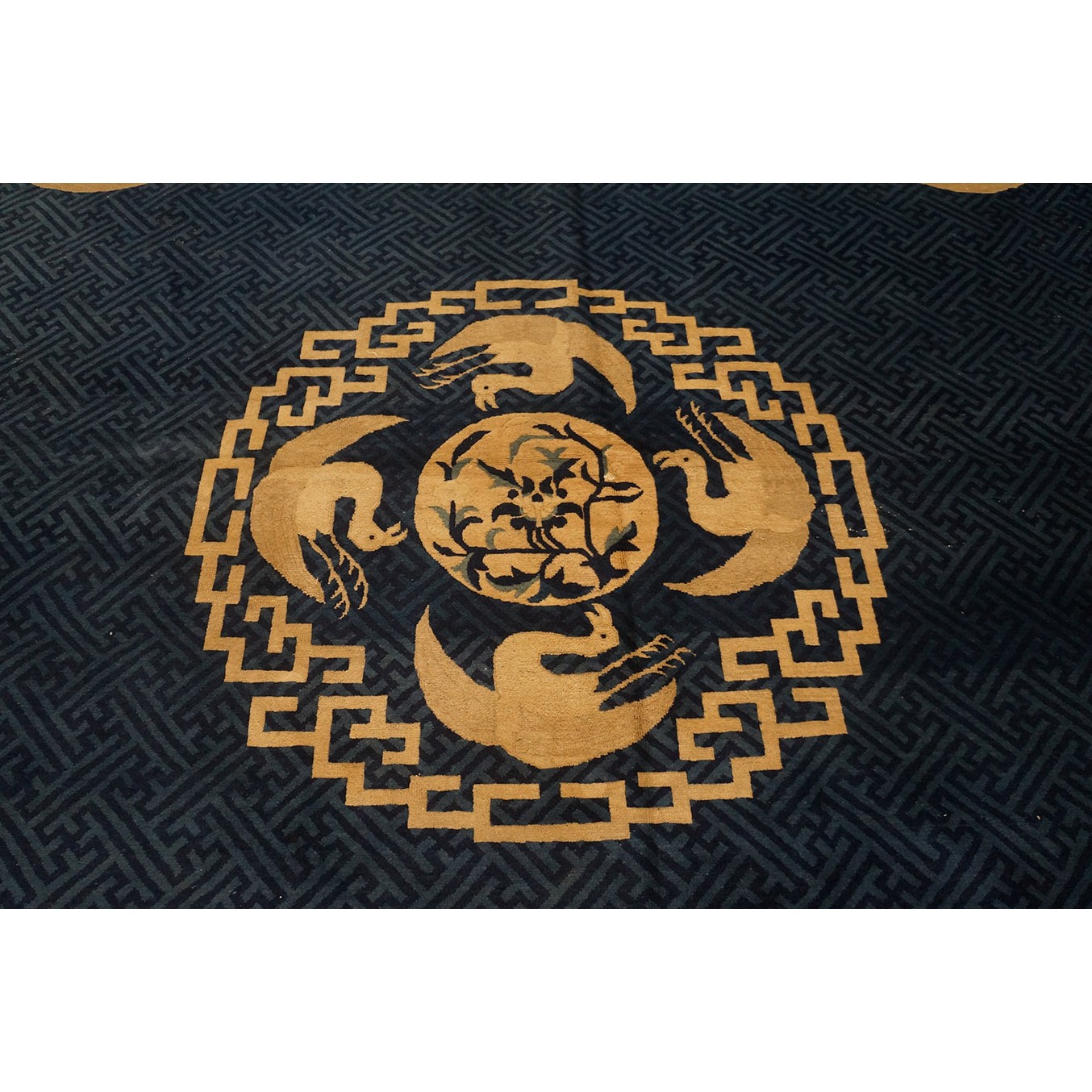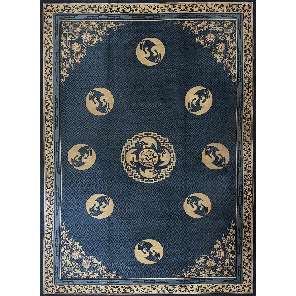 DescriptionChineseCarpets made in China proper. See entries Ningshia, Peking, Art Deco. Chinese - PekingThe commercial Peking carpet is a later 19th century development, begun by importing weaves from Ningshia (see entry) to create and export industry aimed at Western markets. The foundation is cotton and the pile is a good quality carpet wool which takes dyes particularly well. The neat medium weave is in Persian (asymmetric) knots. Designs are strictly Chinese and the whole motif repertoire of Chinese art is employed. Blue and white is the most popular color combination and red is particularly rare. Sizes tend to 9 x 12 and larger, and few small pieces appear. For a short time in the early 1920s Persian designs were woven to capitalize on the death of new Iranian goods. The industry decimated by the Communist Revolution relocated to the Pearl River area. There is a good supply of antique carpets at reasonable prices. | |