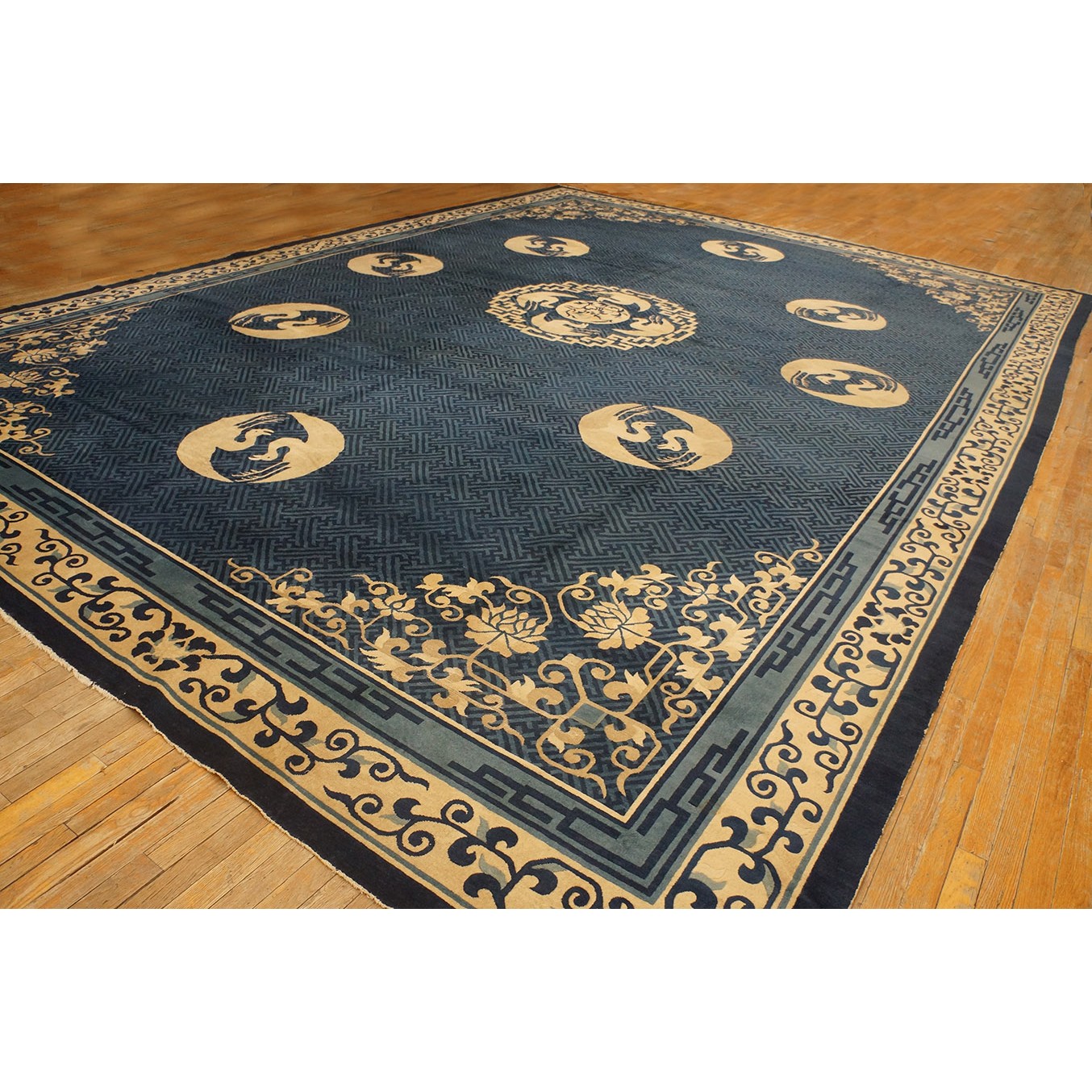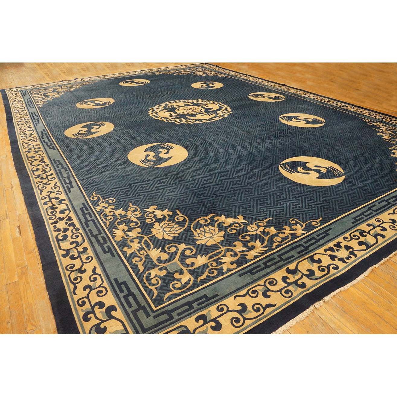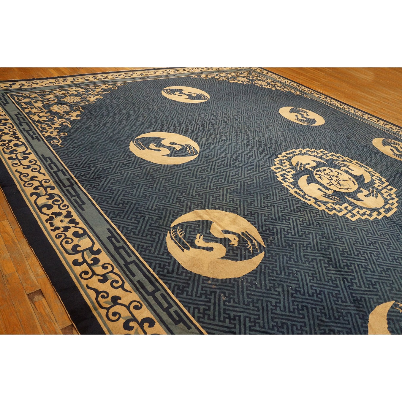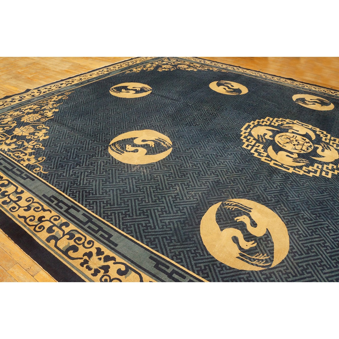 DescriptionChineseCarpets made in China proper. See entries Ningshia, Peking, Art Deco. Chinese - PekingThe commercial Peking carpet is a later 19th century development, begun by importing weaves from Ningshia (see entry) to create and export industry aimed at Western markets. The foundation is cotton and the pile is a good quality carpet wool which takes dyes particularly well. The neat medium weave is in Persian (asymmetric) knots. Designs are strictly Chinese and the whole motif repertoire of Chinese art is employed. Blue and white is the most popular color combination and red is particularly rare. Sizes tend to 9 x 12 and larger, and few small pieces appear. For a short time in the early 1920s Persian designs were woven to capitalize on the death of new Iranian goods. The industry decimated by the Communist Revolution relocated to the Pearl River area. There is a good supply of antique carpets at reasonable prices. | |