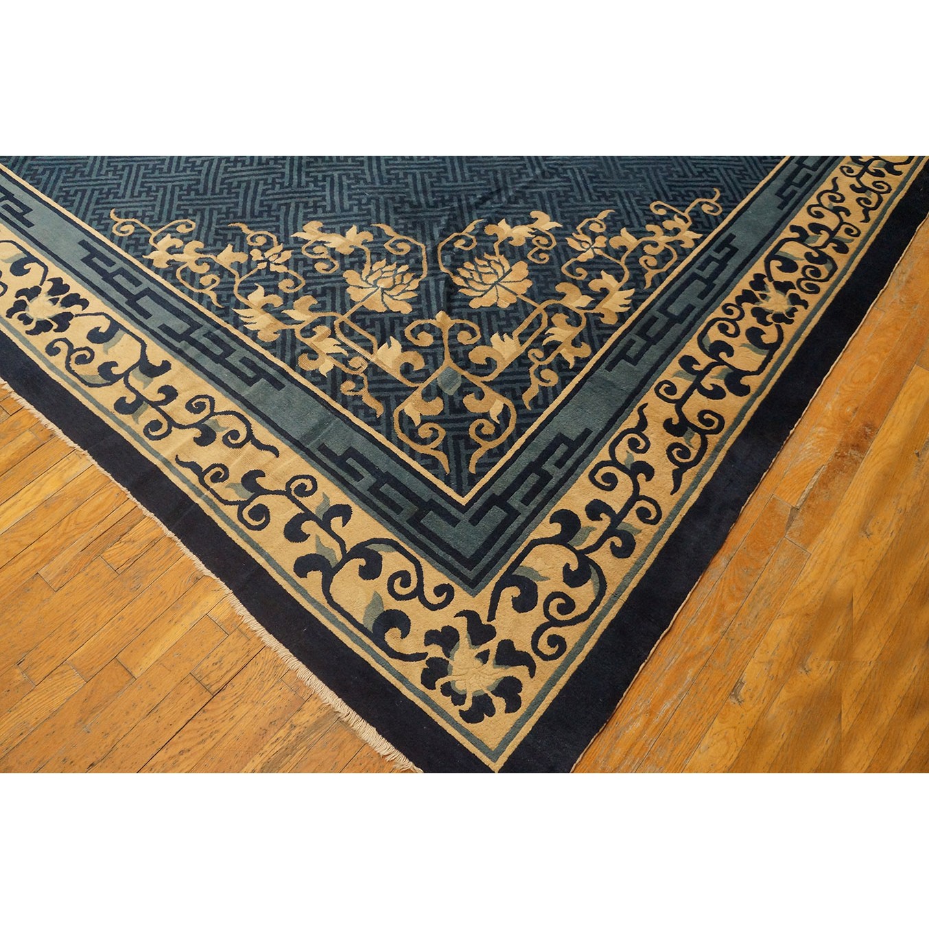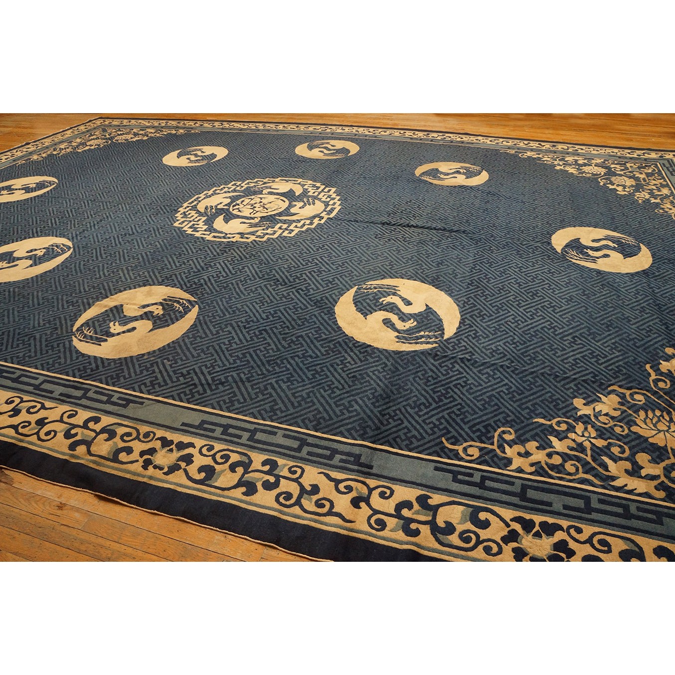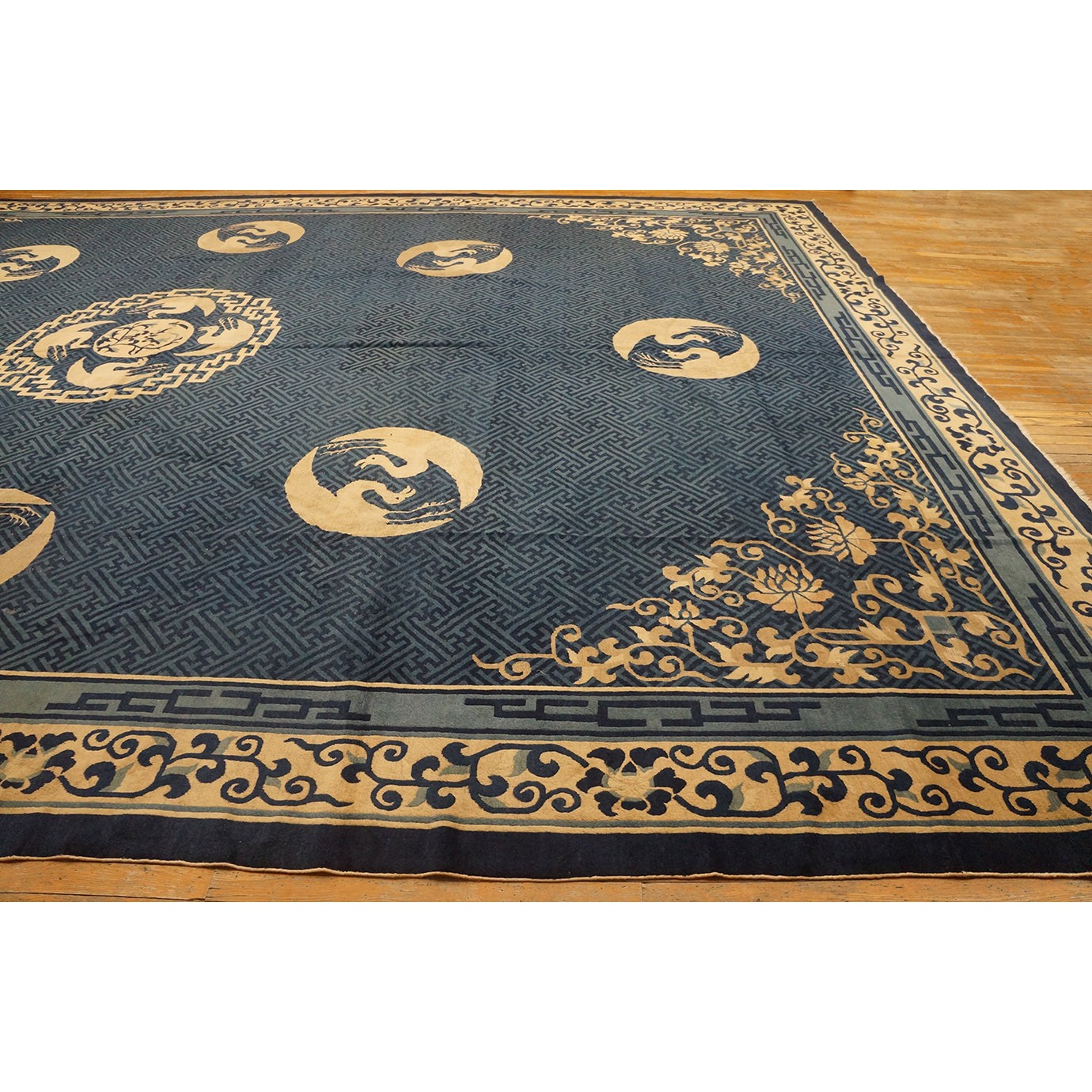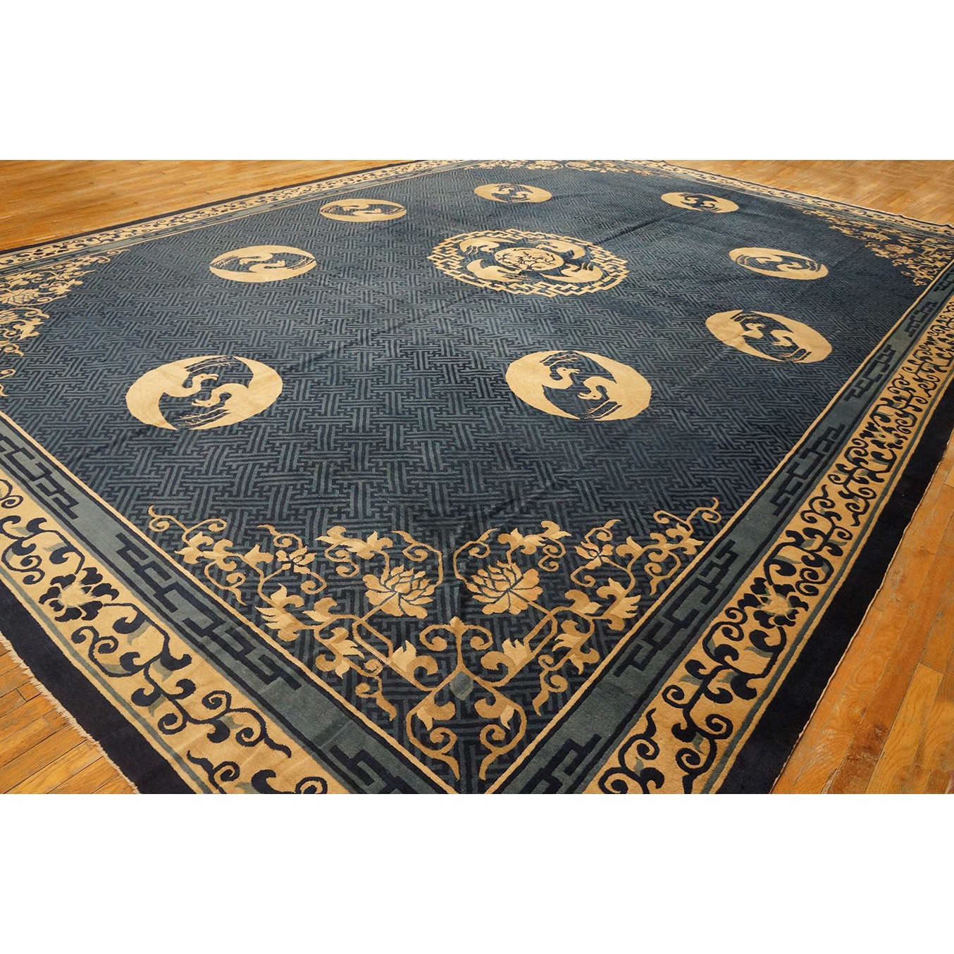 DescriptionChineseCarpets made in China proper. See entries Ningshia, Peking, Art Deco. Chinese - PekingThe commercial Peking carpet is a later 19th century development, begun by importing weaves from Ningshia (see entry) to create and export industry aimed at Western markets. The foundation is cotton and the pile is a good quality carpet wool which takes dyes particularly well. The neat medium weave is in Persian (asymmetric) knots. Designs are strictly Chinese and the whole motif repertoire of Chinese art is employed. Blue and white is the most popular color combination and red is particularly rare. Sizes tend to 9 x 12 and larger, and few small pieces appear. For a short time in the early 1920s Persian designs were woven to capitalize on the death of new Iranian goods. The industry decimated by the Communist Revolution relocated to the Pearl River area. There is a good supply of antique carpets at reasonable prices. | |