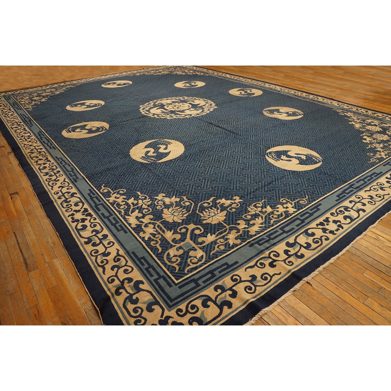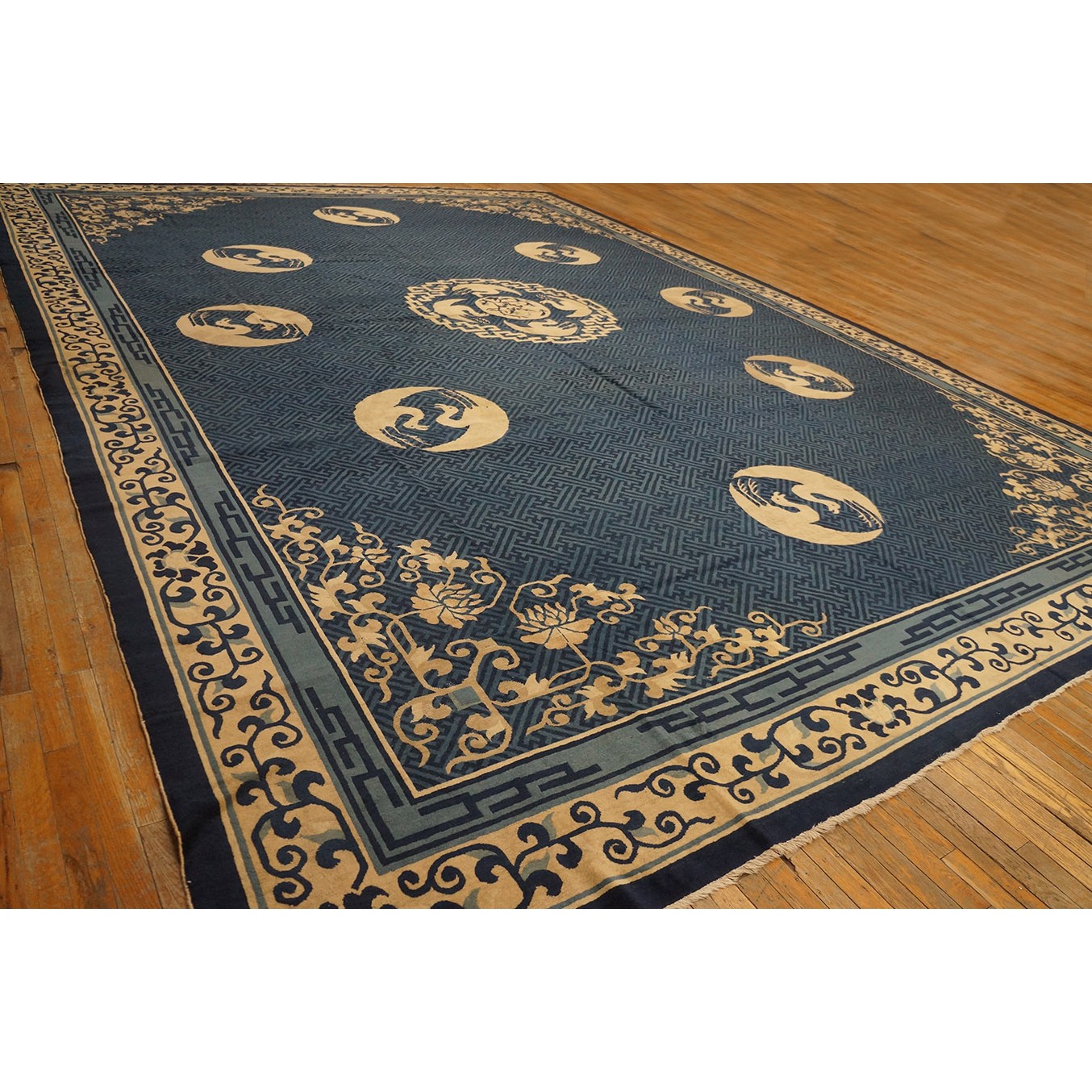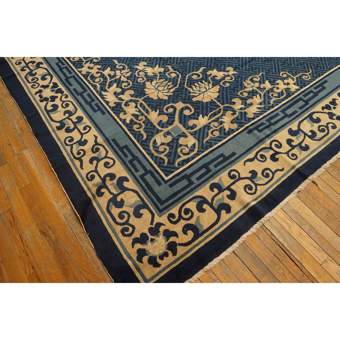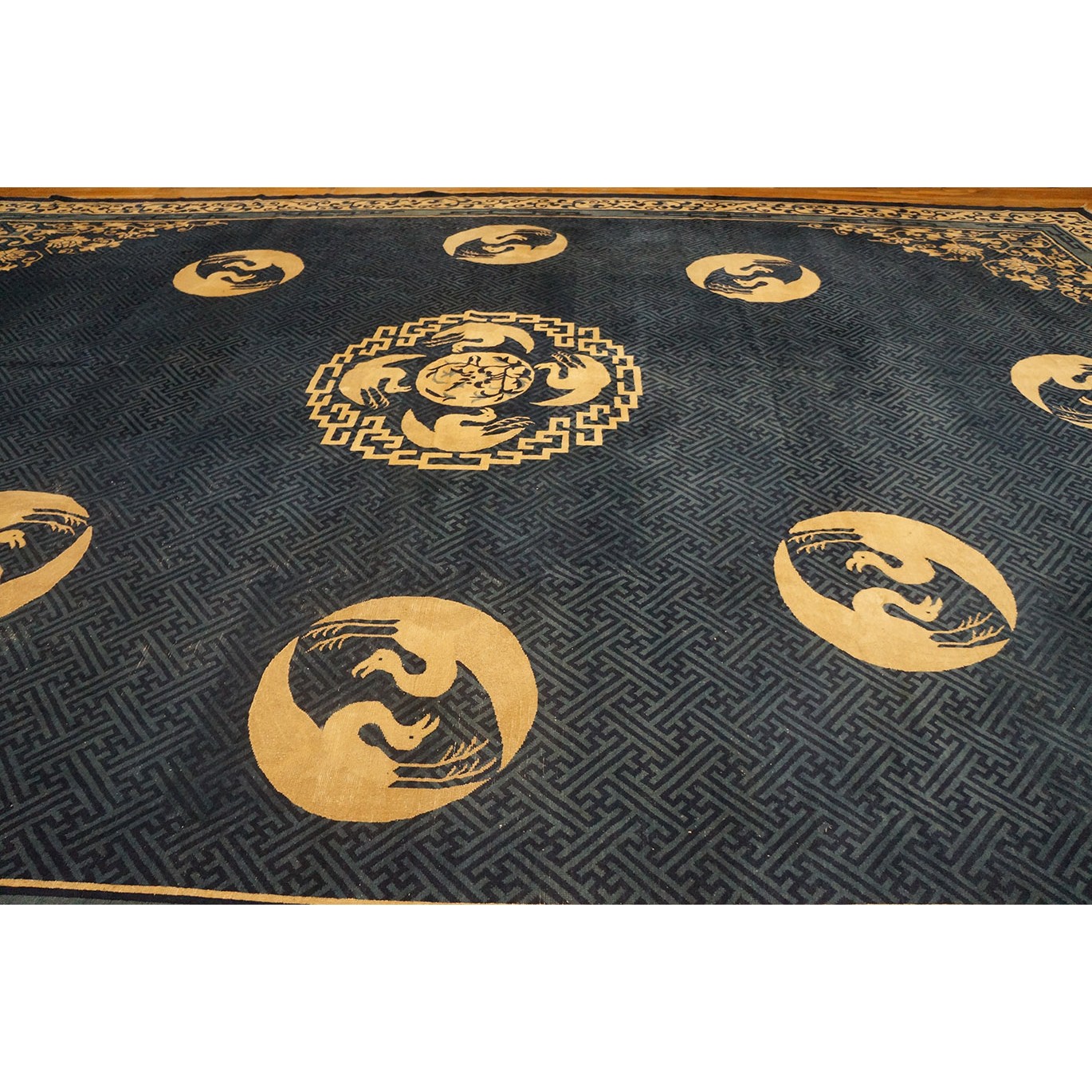 DescriptionChineseCarpets made in China proper. See entries Ningshia, Peking, Art Deco. Chinese - PekingThe commercial Peking carpet is a later 19th century development, begun by importing weaves from Ningshia (see entry) to create and export industry aimed at Western markets. The foundation is cotton and the pile is a good quality carpet wool which takes dyes particularly well. The neat medium weave is in Persian (asymmetric) knots. Designs are strictly Chinese and the whole motif repertoire of Chinese art is employed. Blue and white is the most popular color combination and red is particularly rare. Sizes tend to 9 x 12 and larger, and few small pieces appear. For a short time in the early 1920s Persian designs were woven to capitalize on the death of new Iranian goods. The industry decimated by the Communist Revolution relocated to the Pearl River area. There is a good supply of antique carpets at reasonable prices. | |
