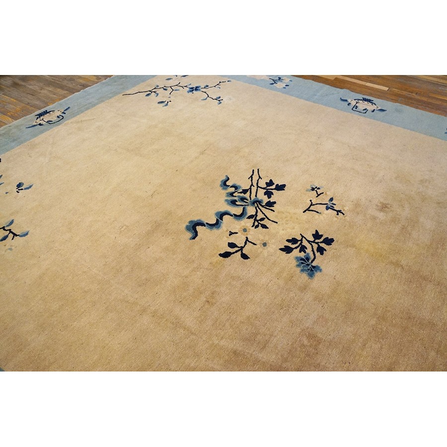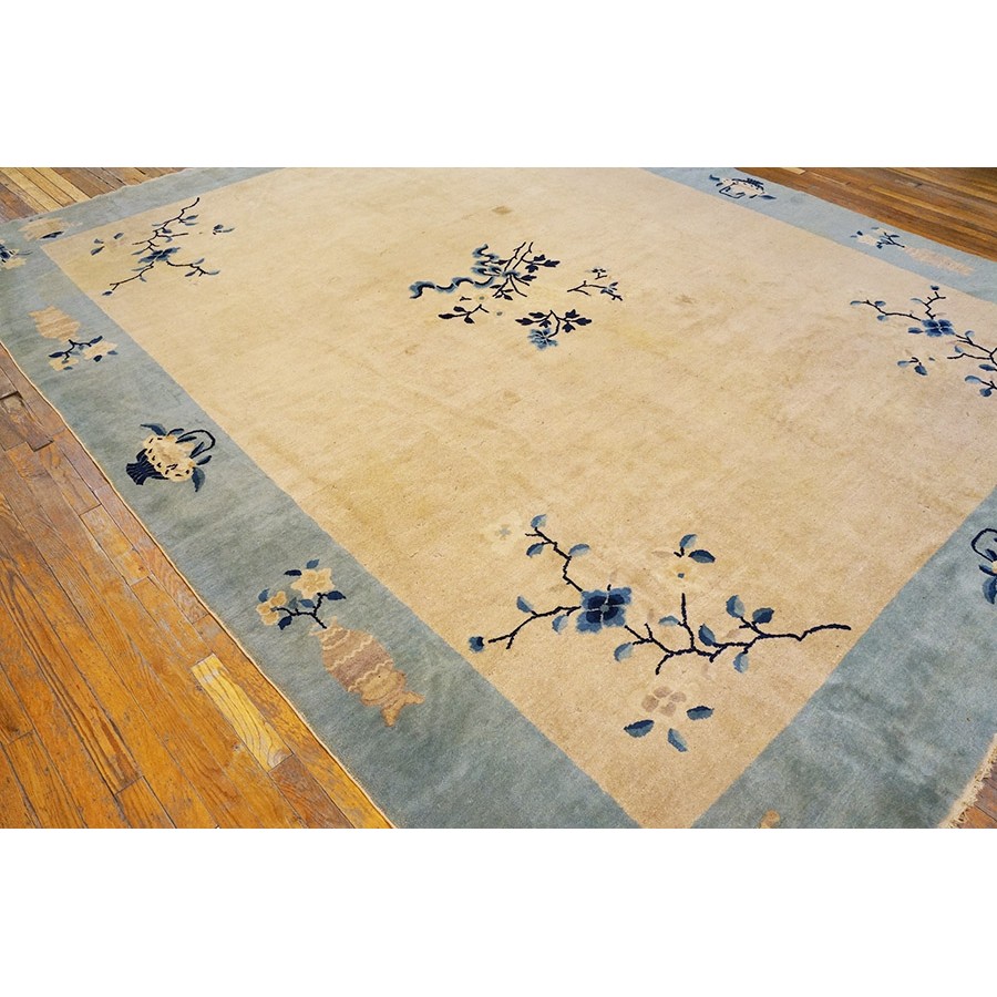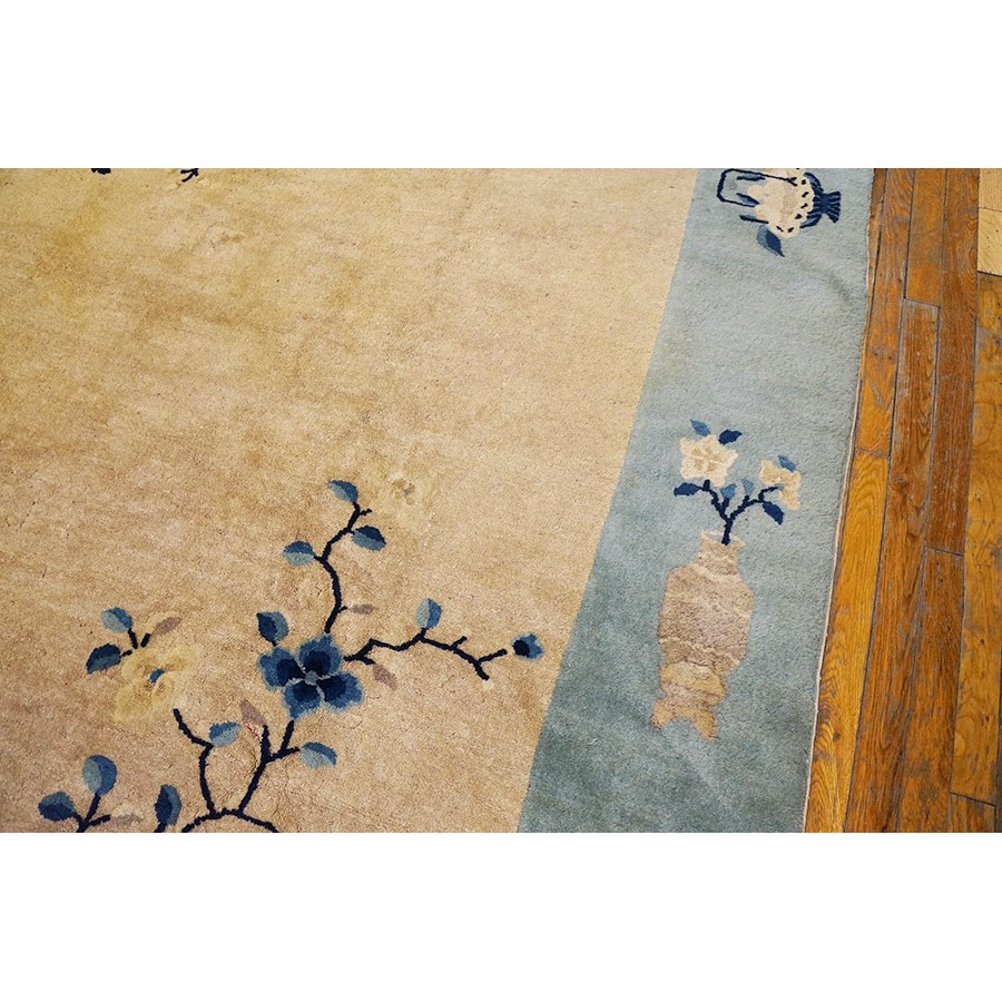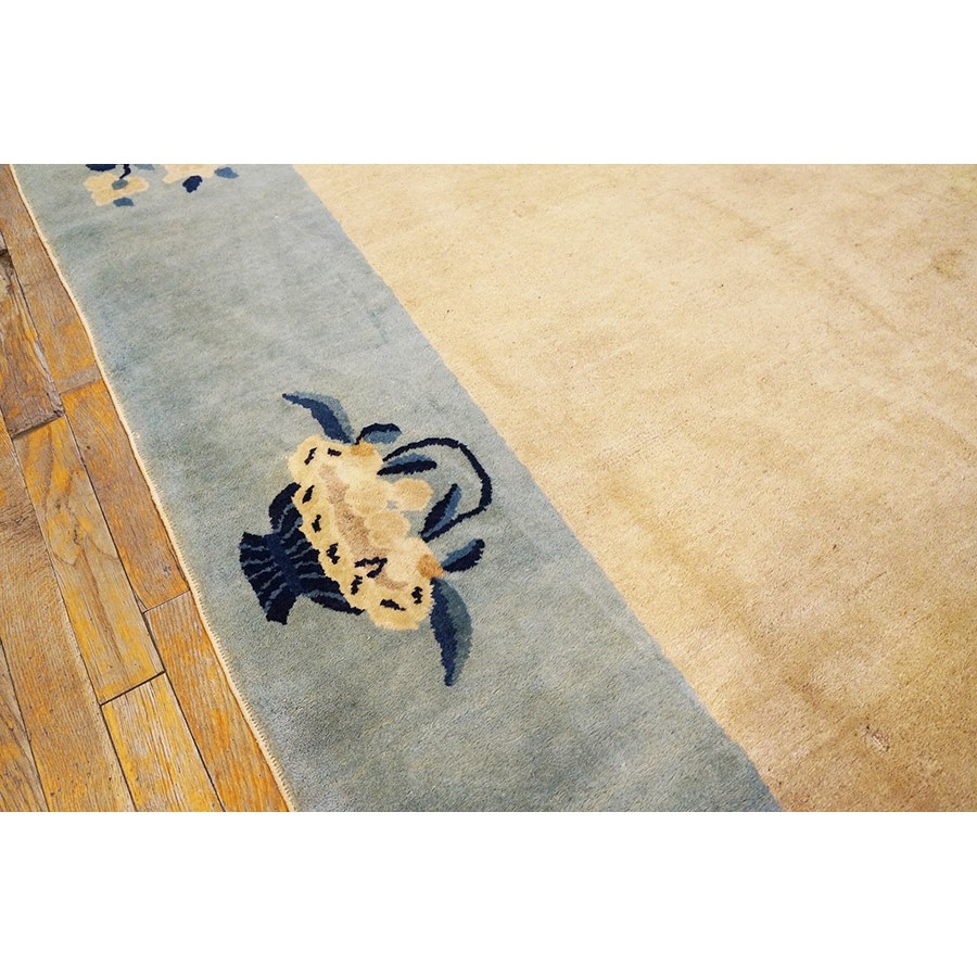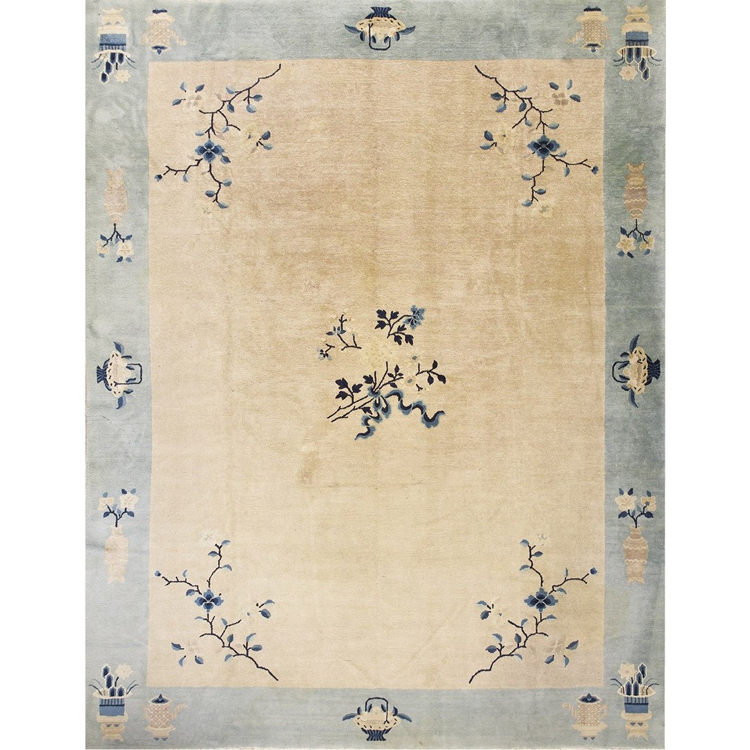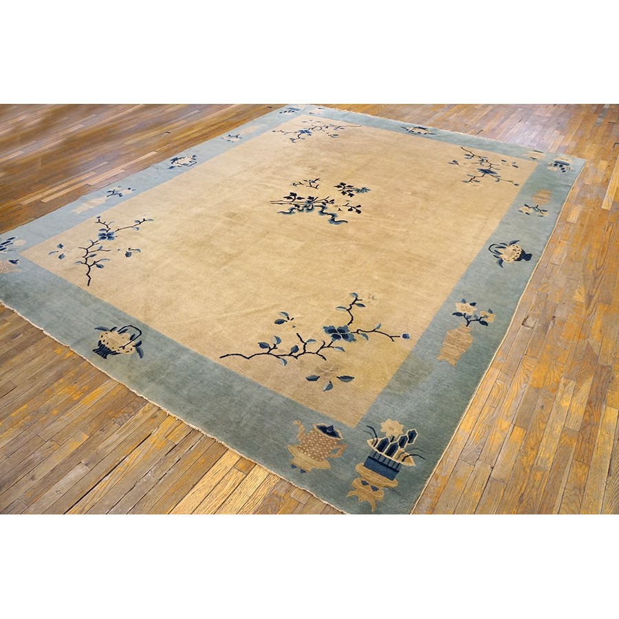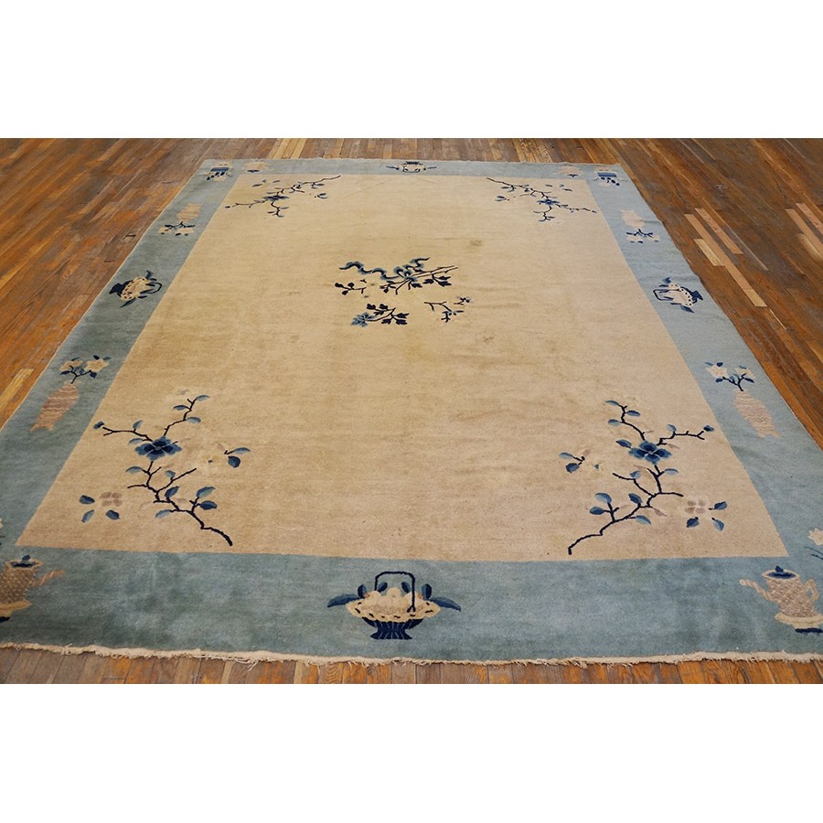 DescriptionChineseCarpets made in China proper. See entries Ningshia, Peking, Art Deco. Chinese - PekingThe commercial Peking carpet is a later 19th century development, begun by importing weaves from Ningshia (see entry) to create and export industry aimed at Western markets. The foundation is cotton and the pile is a good quality carpet wool which takes dyes particularly well. The neat medium weave is in Persian (asymmetric) knots. Designs are strictly Chinese and the whole motif repertoire of Chinese art is employed. Blue and white is the most popular color combination and red is particularly rare. Sizes tend to 9 x 12 and larger, and few small pieces appear. For a short time in the early 1920s Persian designs were woven to capitalize on the death of new Iranian goods. The industry decimated by the Communist Revolution relocated to the Pearl River area. There is a good supply of antique carpets at reasonable prices. | |