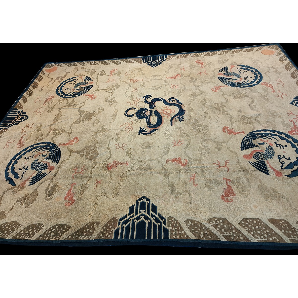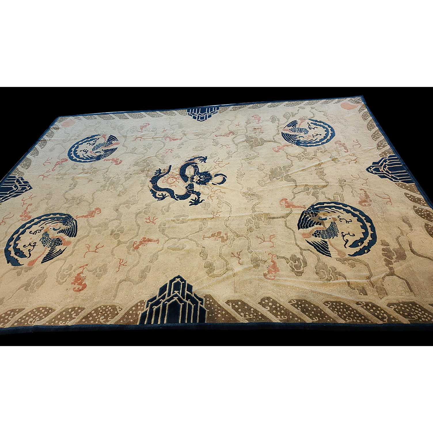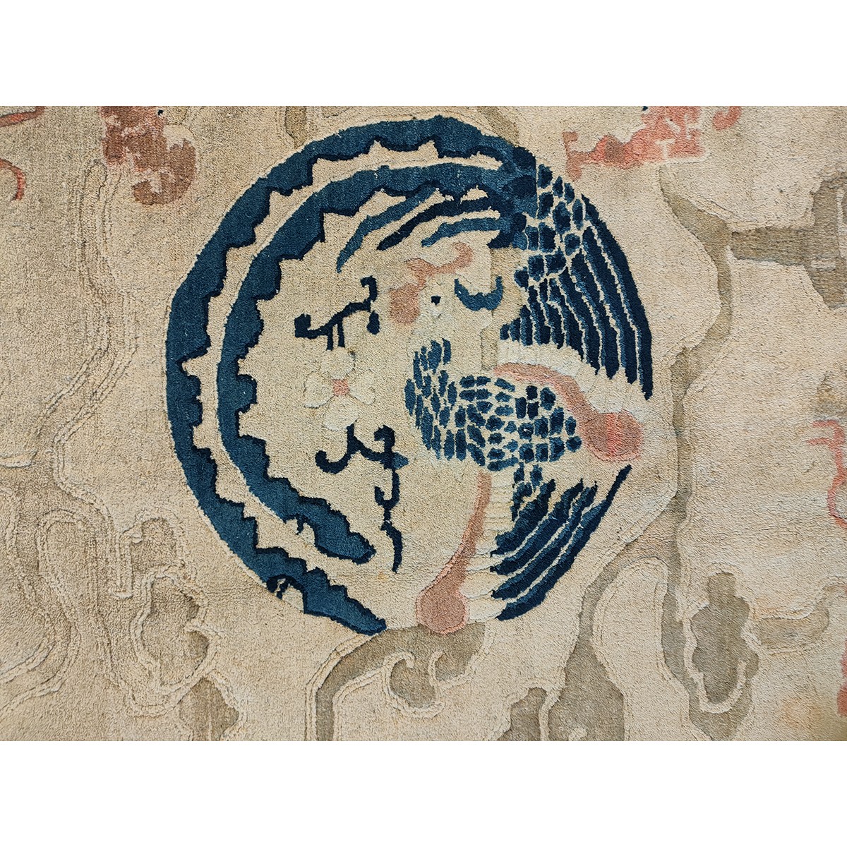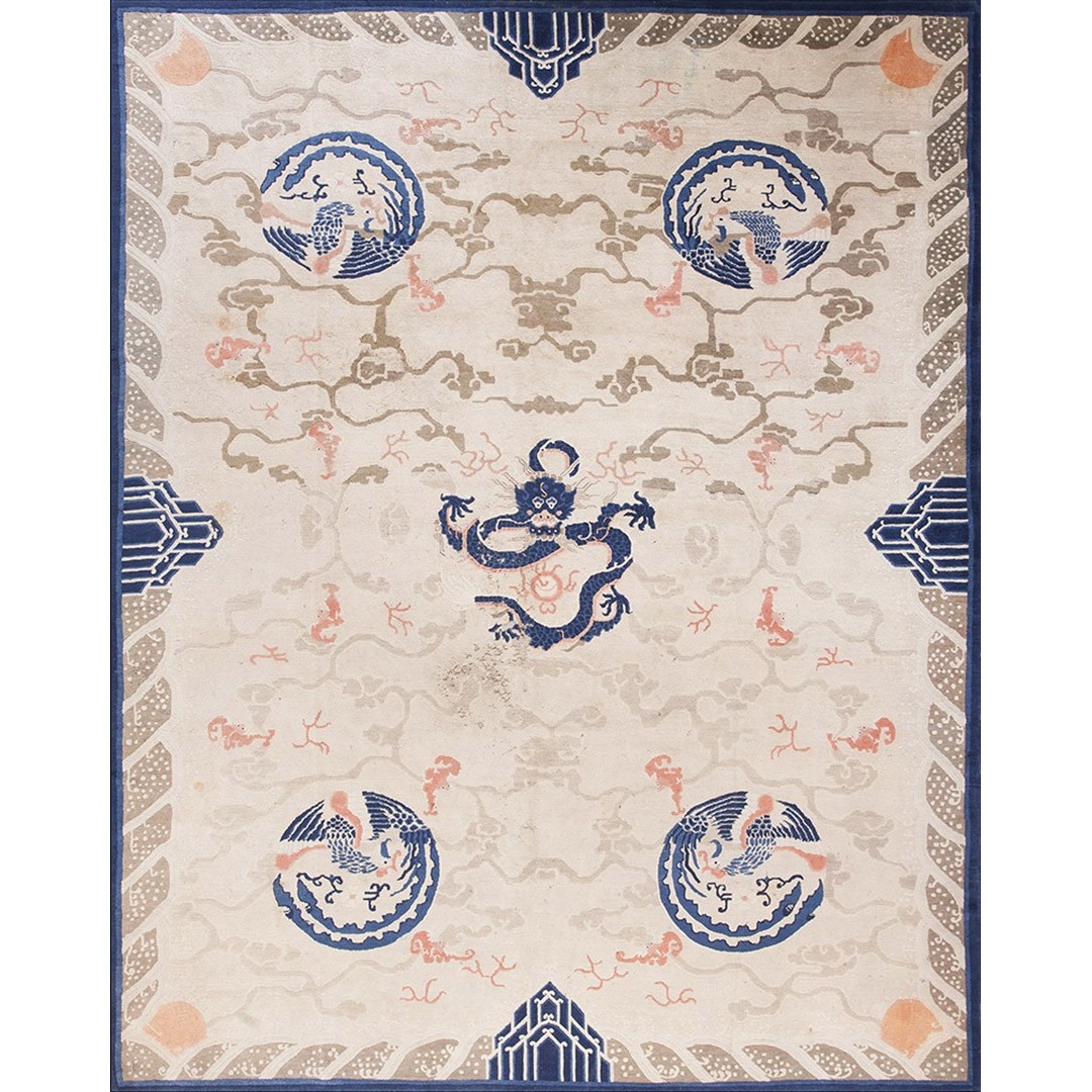 DescriptionChineseCarpets made in China proper. See entries Ningshia, Peking, Art Deco. Chinese - PekingThe commercial Peking carpet is a later 19th century development, begun by importing weaves from Ningshia (see entry) to create and export industry aimed at Western markets. The foundation is cotton and the pile is a good quality carpet wool which takes dyes particularly well. The neat medium weave is in Persian (asymmetric) knots. Designs are strictly Chinese and the whole motif repertoire of Chinese art is employed. Blue and white is the most popular color combination and red is particularly rare. Sizes tend to 9 x 12 and larger, and few small pieces appear. For a short time in the early 1920s Persian designs were woven to capitalize on the death of new Iranian goods. The industry decimated by the Communist Revolution relocated to the Pearl River area. There is a good supply of antique carpets at reasonable prices. | |