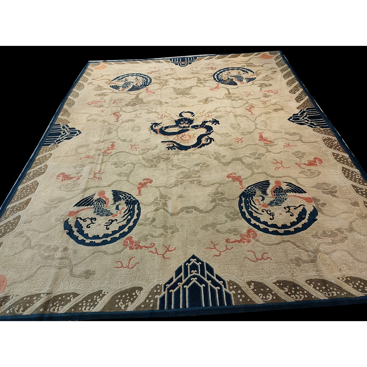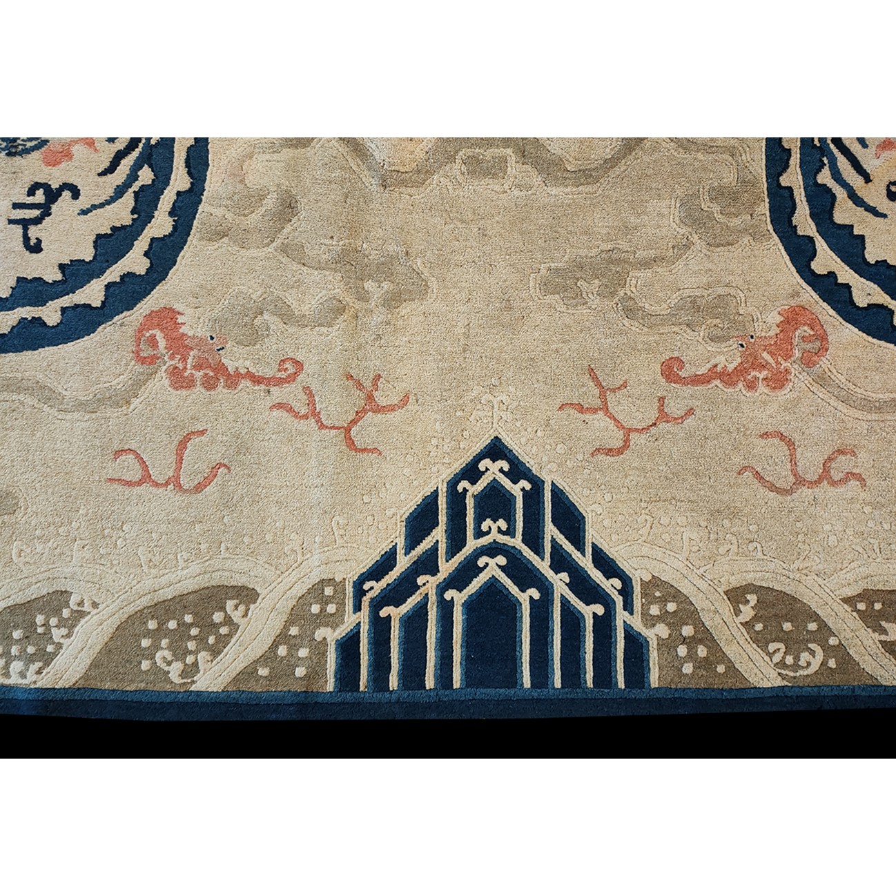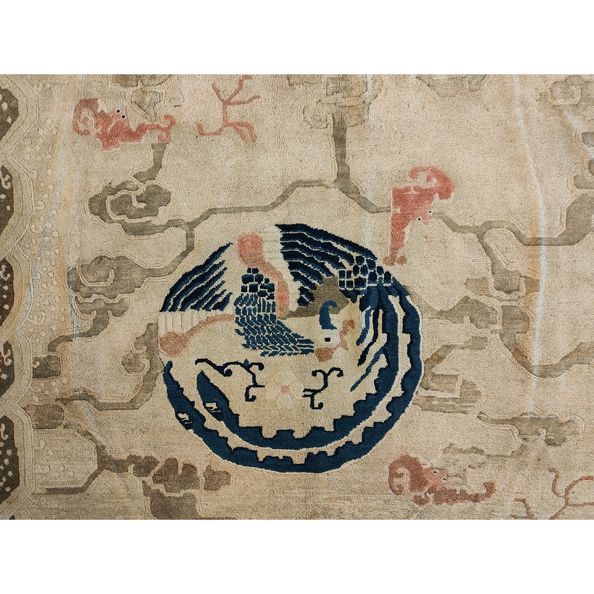 DescriptionChineseCarpets made in China proper. See entries Ningshia, Peking, Art Deco. Chinese - PekingThe commercial Peking carpet is a later 19th century development, begun by importing weaves from Ningshia (see entry) to create and export industry aimed at Western markets. The foundation is cotton and the pile is a good quality carpet wool which takes dyes particularly well. The neat medium weave is in Persian (asymmetric) knots. Designs are strictly Chinese and the whole motif repertoire of Chinese art is employed. Blue and white is the most popular color combination and red is particularly rare. Sizes tend to 9 x 12 and larger, and few small pieces appear. For a short time in the early 1920s Persian designs were woven to capitalize on the death of new Iranian goods. The industry decimated by the Communist Revolution relocated to the Pearl River area. There is a good supply of antique carpets at reasonable prices. | |