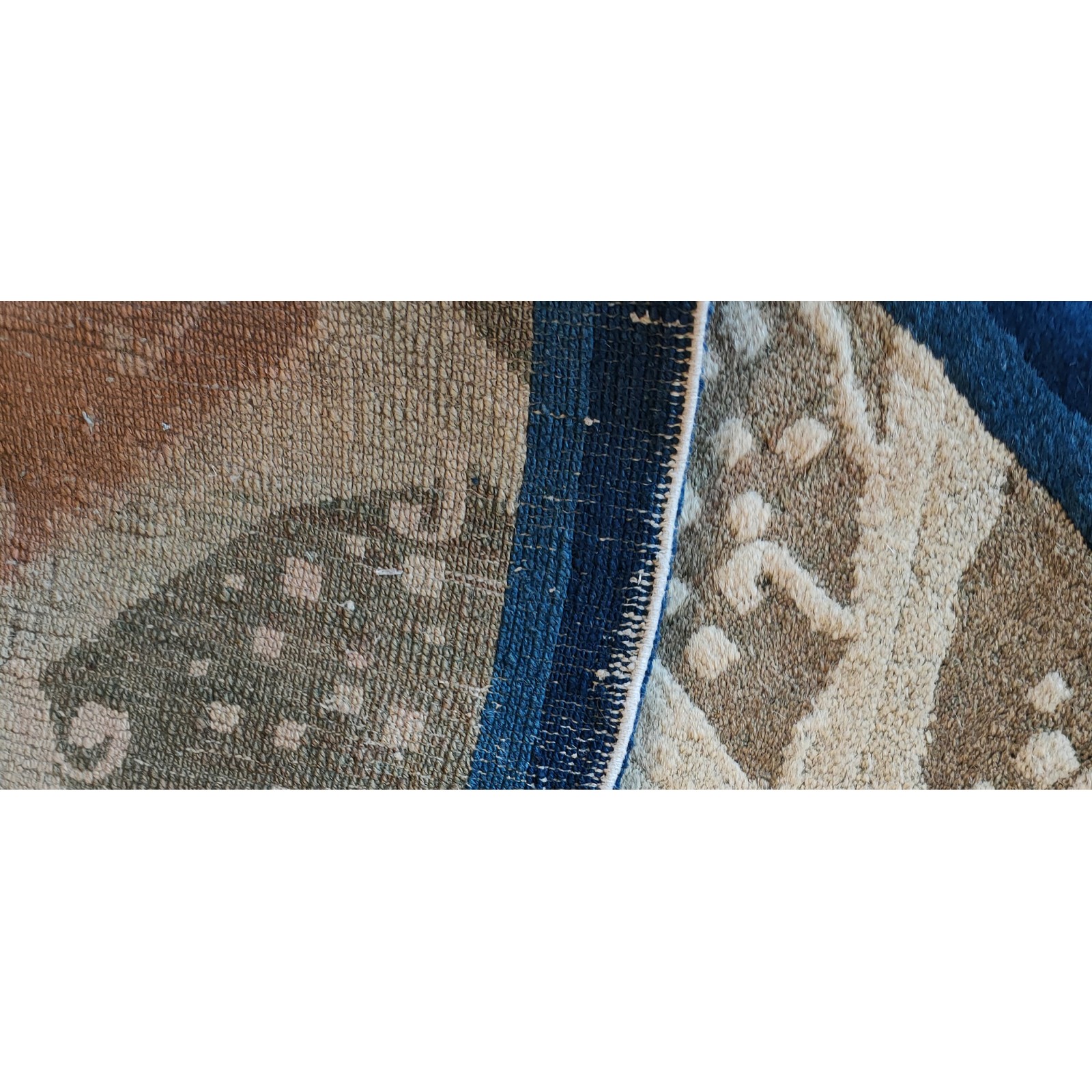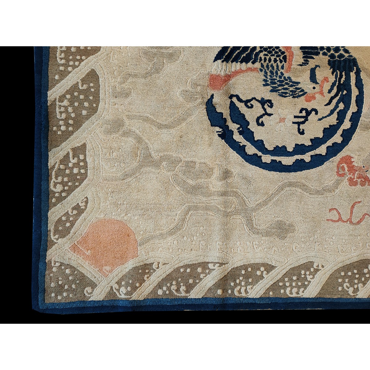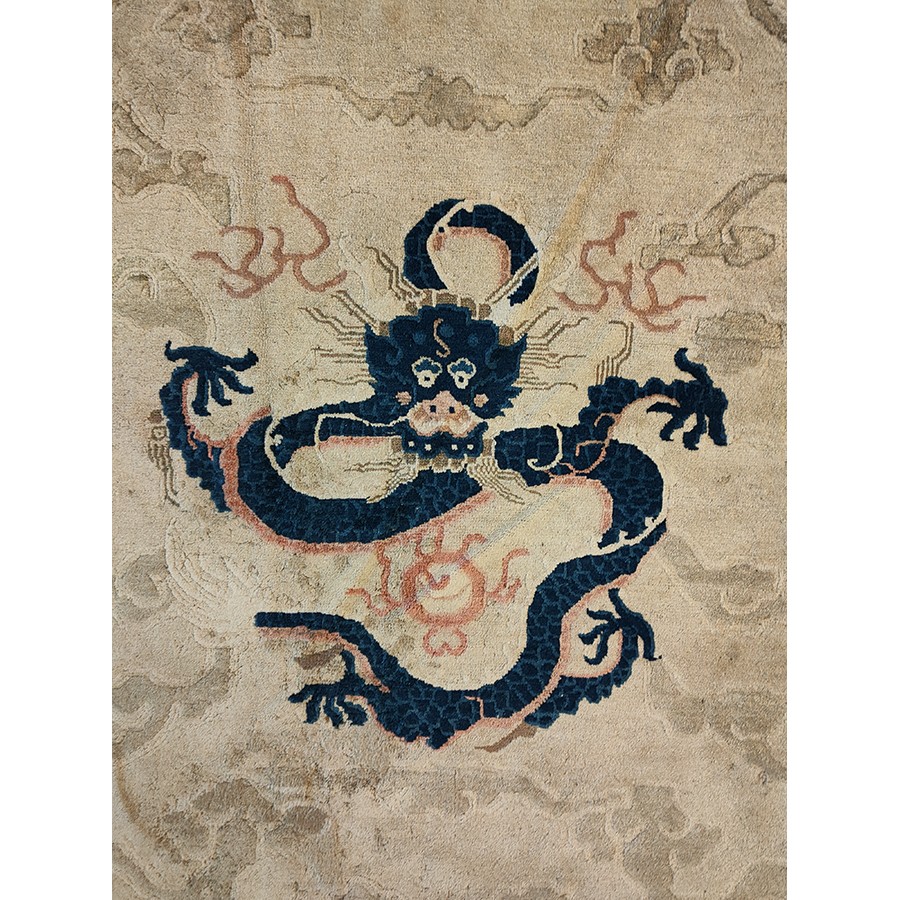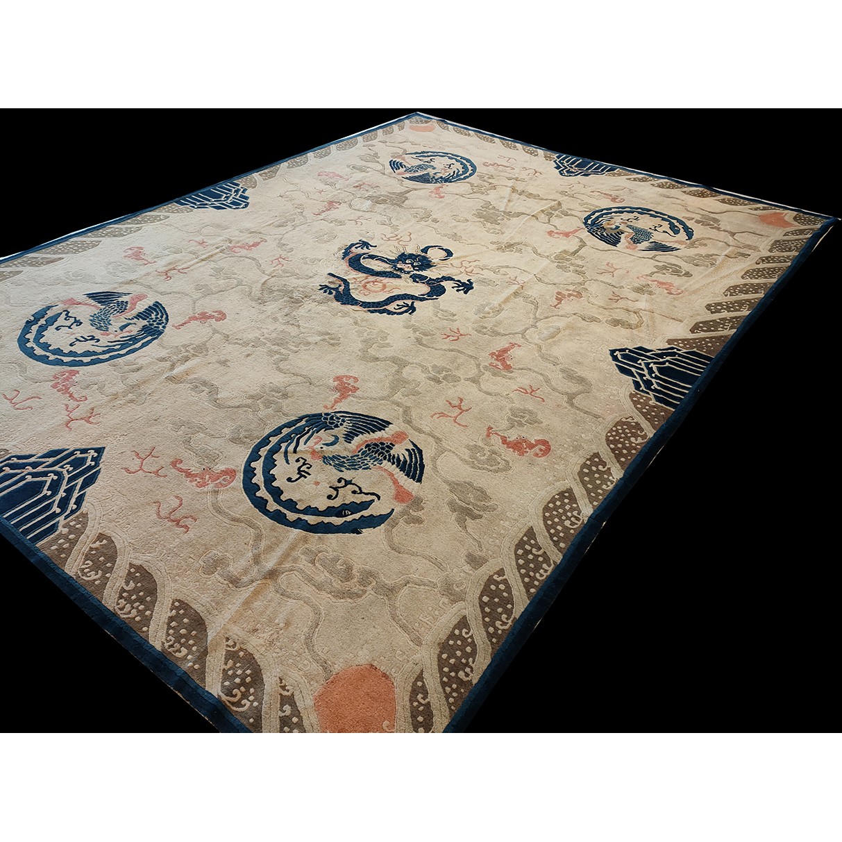DescriptionChineseCarpets made in China proper. See entries Ningshia, Peking, Art Deco. Chinese - PekingThe commercial Peking carpet is a later 19th century development, begun by importing weaves from Ningshia (see entry) to create and export industry aimed at Western markets. The foundation is cotton and the pile is a good quality carpet wool which takes dyes particularly well. The neat medium weave is in Persian (asymmetric) knots. Designs are strictly Chinese and the whole motif repertoire of Chinese art is employed. Blue and white is the most popular color combination and red is particularly rare. Sizes tend to 9 x 12 and larger, and few small pieces appear. For a short time in the early 1920s Persian designs were woven to capitalize on the death of new Iranian goods. The industry decimated by the Communist Revolution relocated to the Pearl River area. There is a good supply of antique carpets at reasonable prices. | |