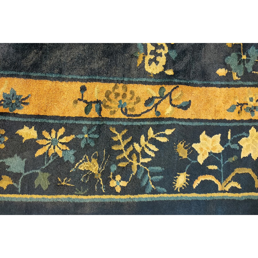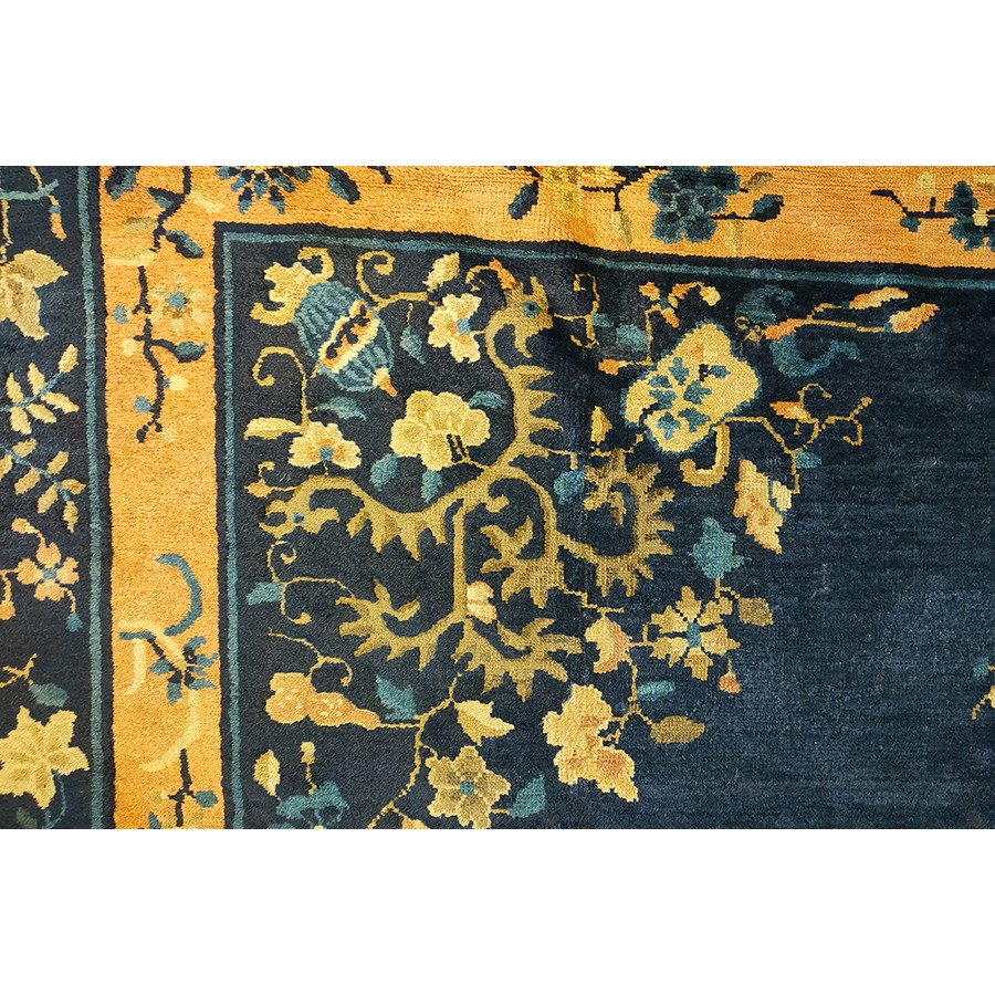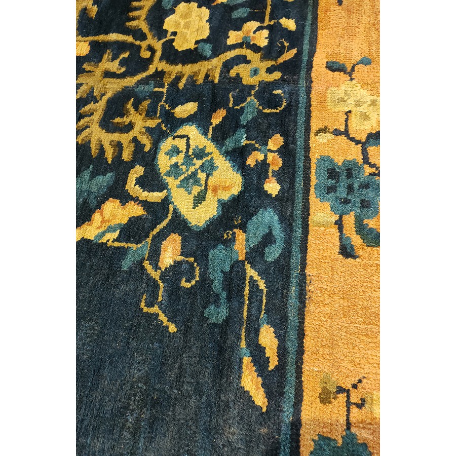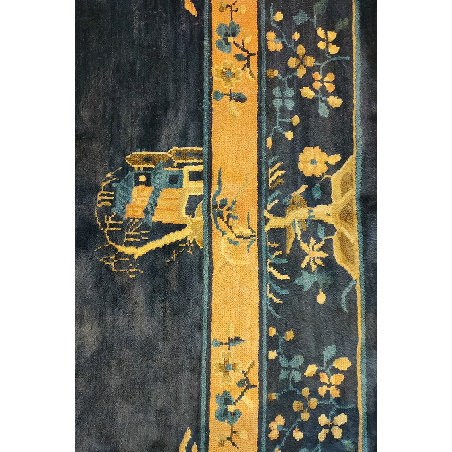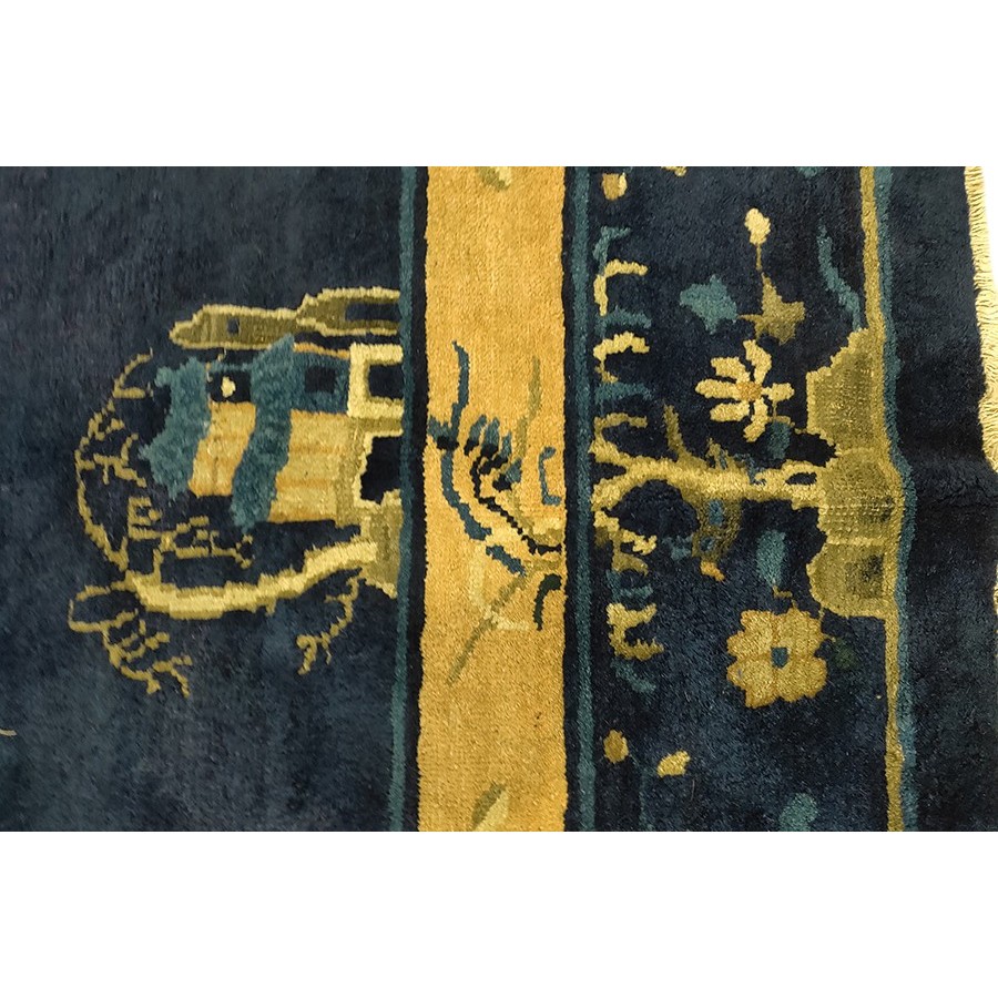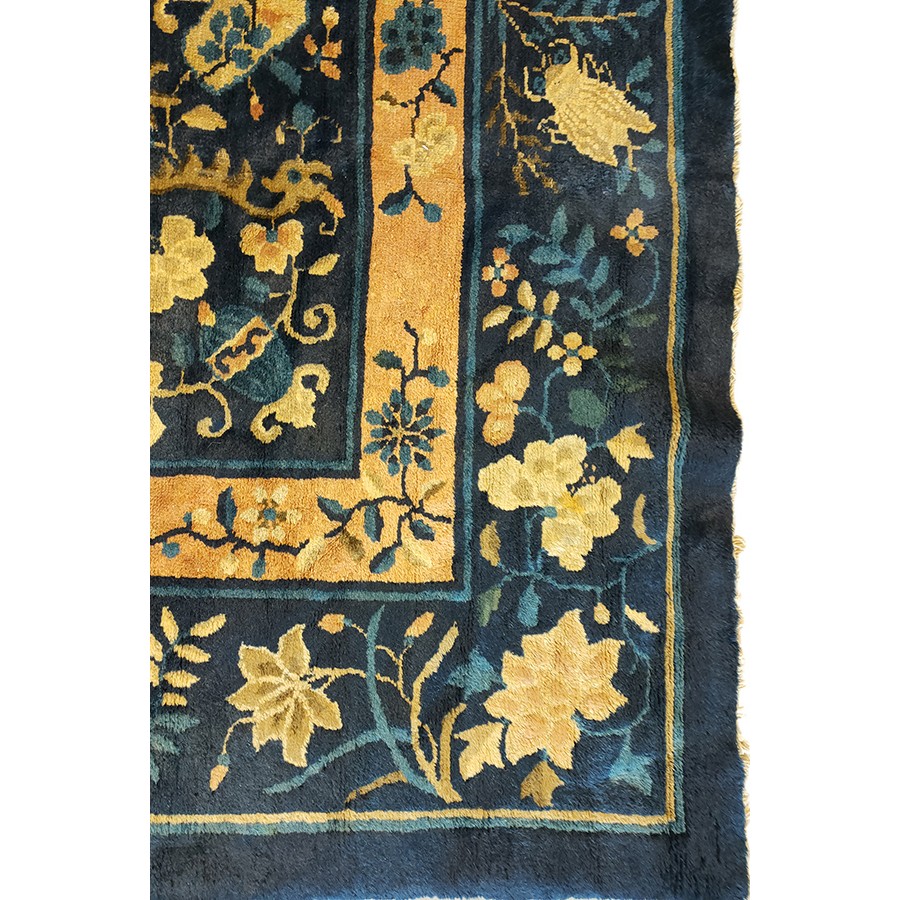DescriptionChineseCarpets made in China proper. See entries Ningshia, Peking, Art Deco. Chinese - PekingThe commercial Peking carpet is a later 19th century development, begun by importing weaves from Ningshia (see entry) to create and export industry aimed at Western markets. The foundation is cotton and the pile is a good quality carpet wool which takes dyes particularly well. The neat medium weave is in Persian (asymmetric) knots. Designs are strictly Chinese and the whole motif repertoire of Chinese art is employed. Blue and white is the most popular color combination and red is particularly rare. Sizes tend to 9 x 12 and larger, and few small pieces appear. For a short time in the early 1920s Persian designs were woven to capitalize on the death of new Iranian goods. The industry decimated by the Communist Revolution relocated to the Pearl River area. There is a good supply of antique carpets at reasonable prices. | |
