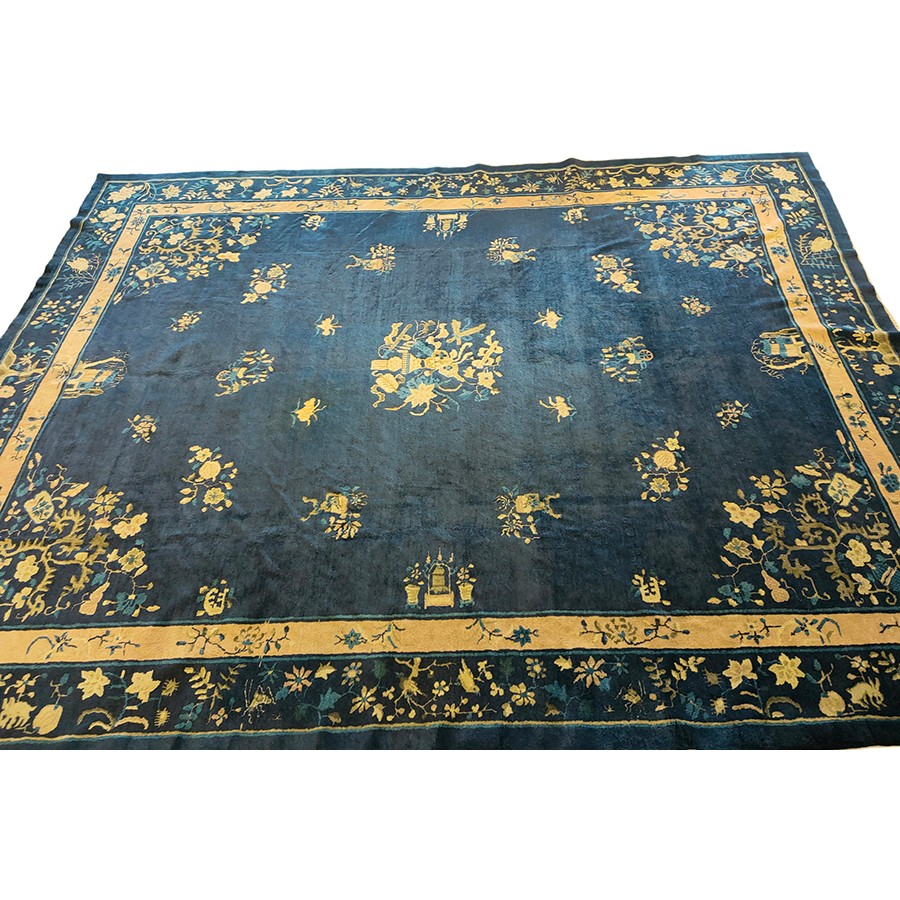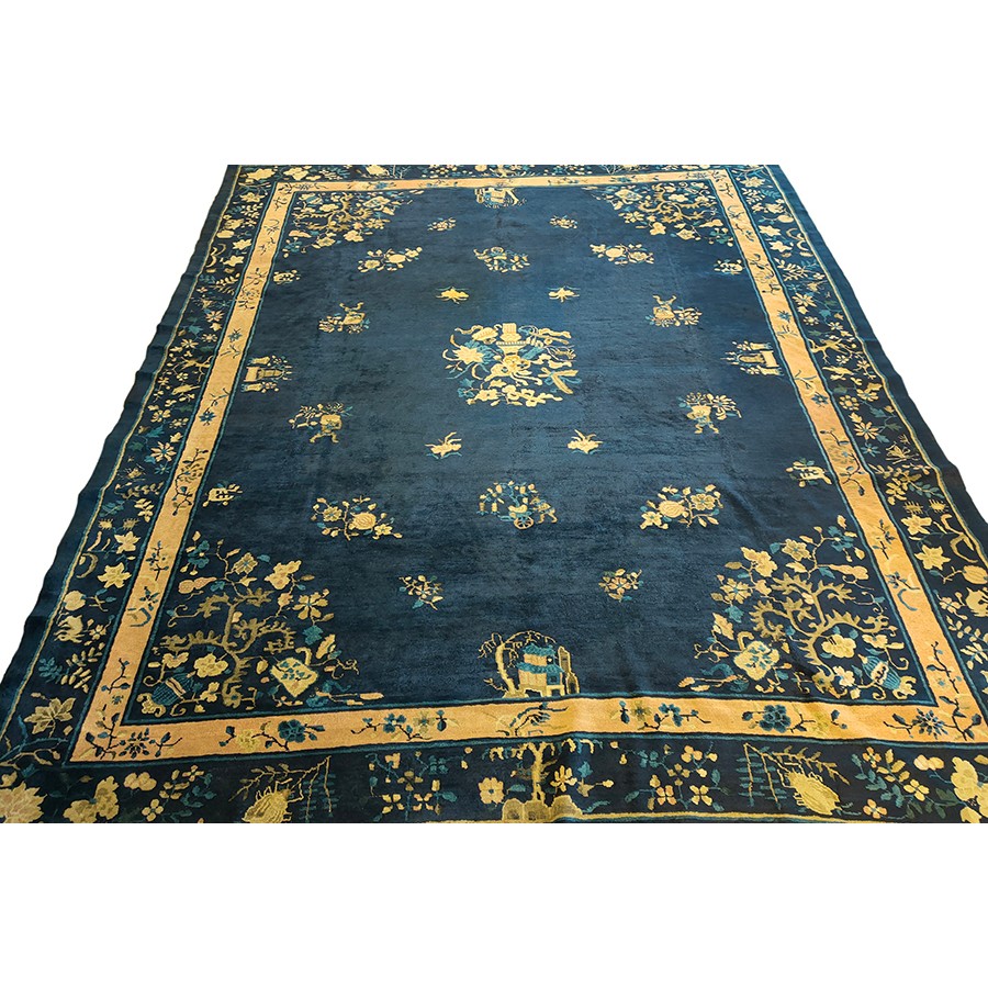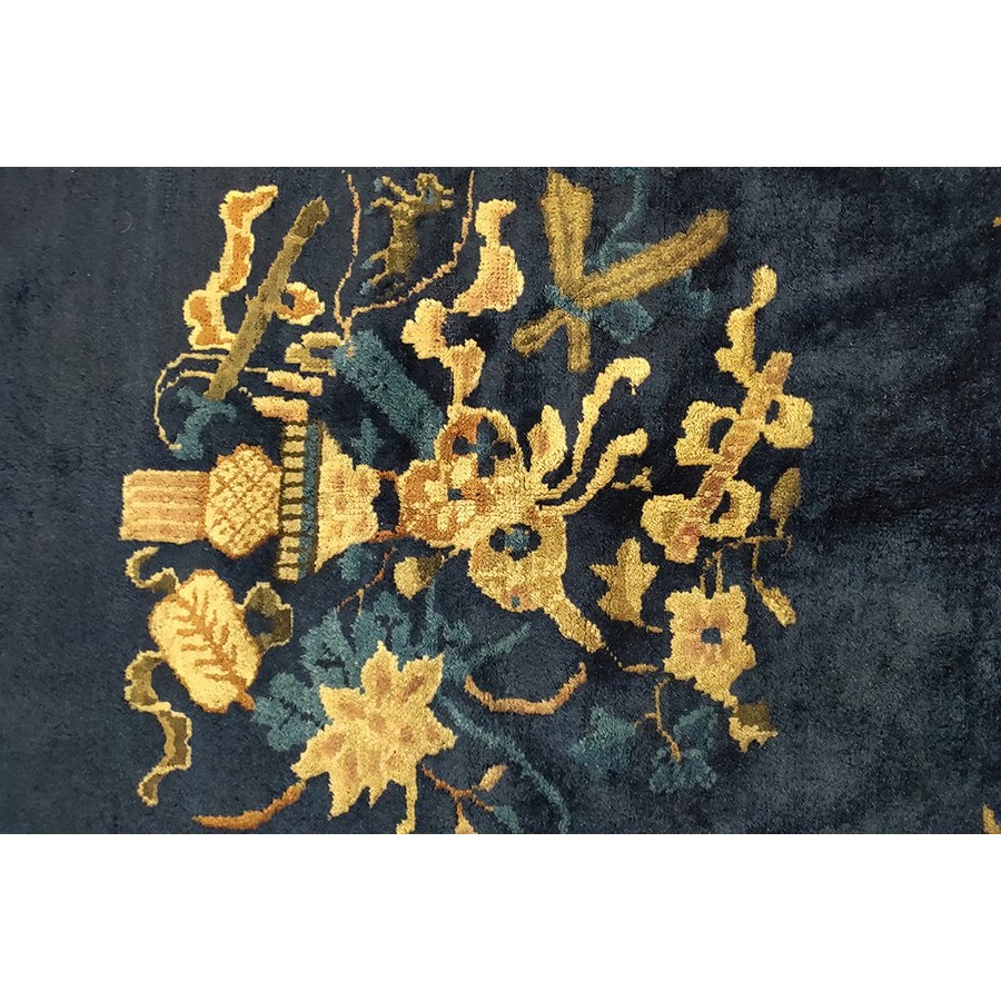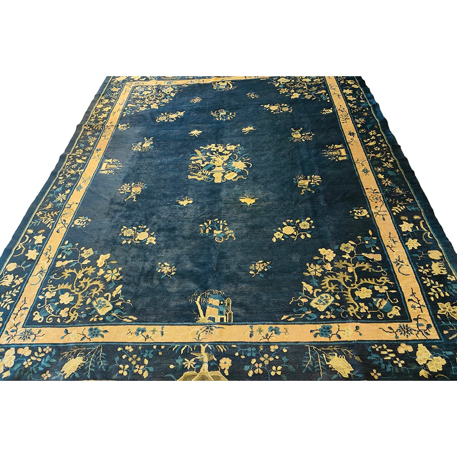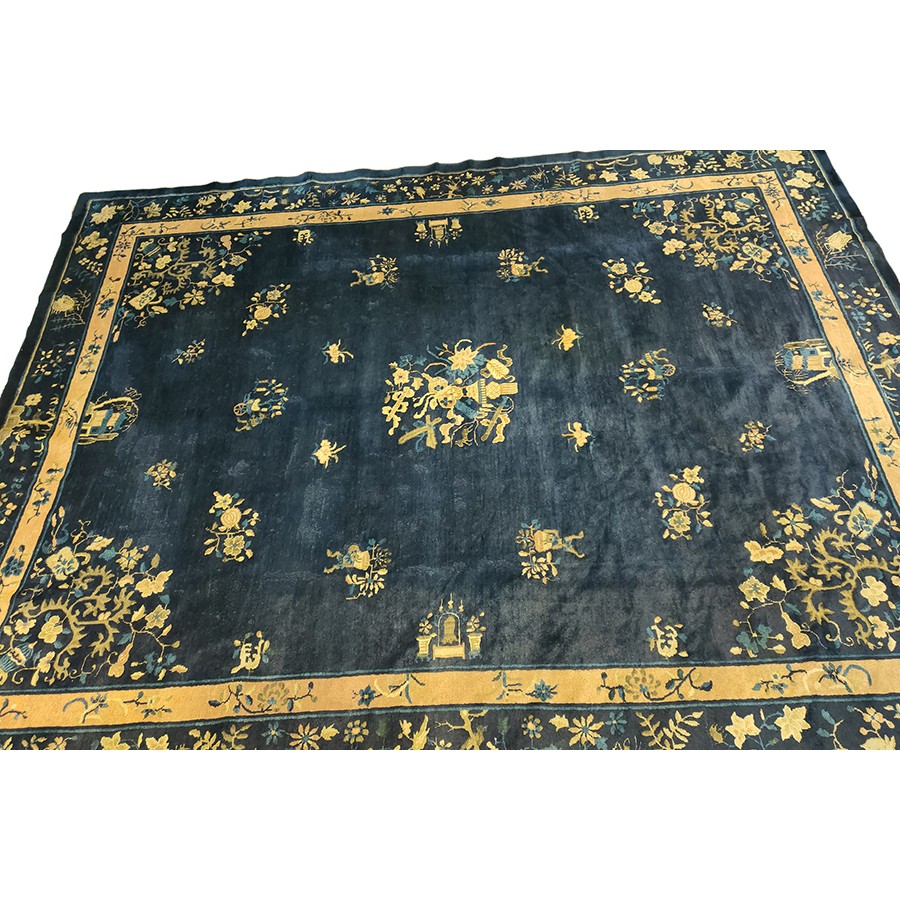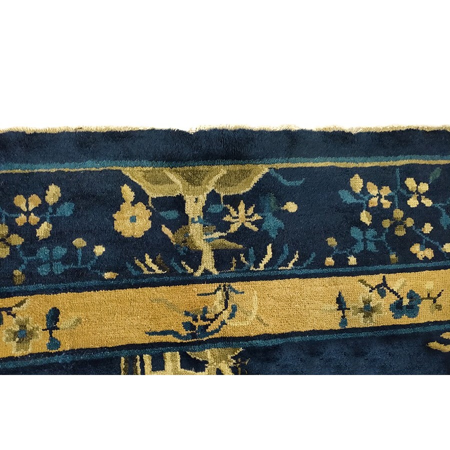 DescriptionChineseCarpets made in China proper. See entries Ningshia, Peking, Art Deco. Chinese - PekingThe commercial Peking carpet is a later 19th century development, begun by importing weaves from Ningshia (see entry) to create and export industry aimed at Western markets. The foundation is cotton and the pile is a good quality carpet wool which takes dyes particularly well. The neat medium weave is in Persian (asymmetric) knots. Designs are strictly Chinese and the whole motif repertoire of Chinese art is employed. Blue and white is the most popular color combination and red is particularly rare. Sizes tend to 9 x 12 and larger, and few small pieces appear. For a short time in the early 1920s Persian designs were woven to capitalize on the death of new Iranian goods. The industry decimated by the Communist Revolution relocated to the Pearl River area. There is a good supply of antique carpets at reasonable prices. | |