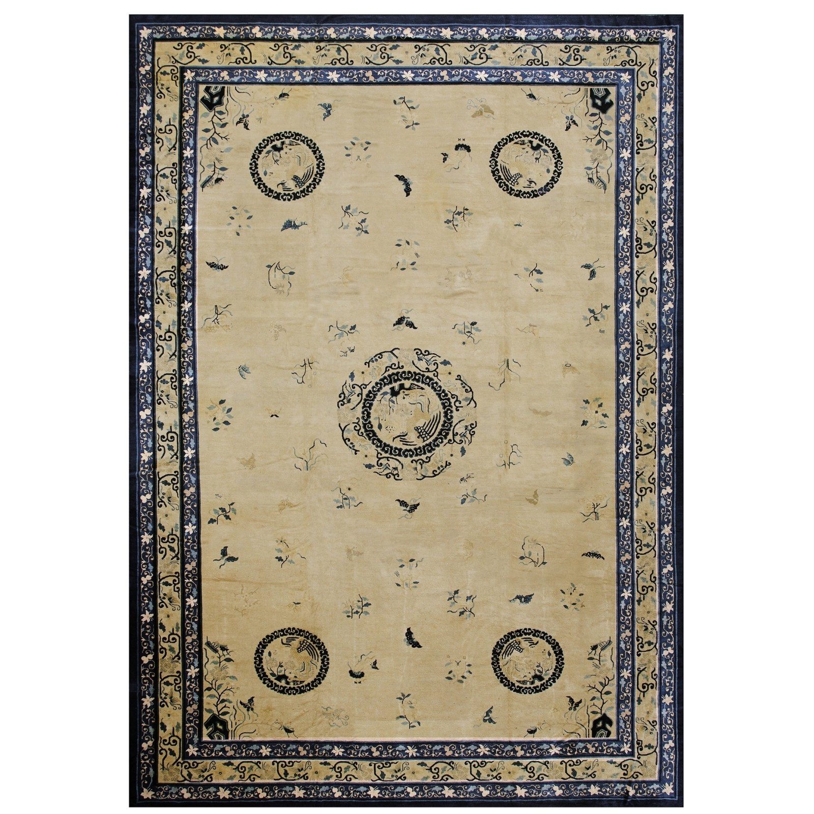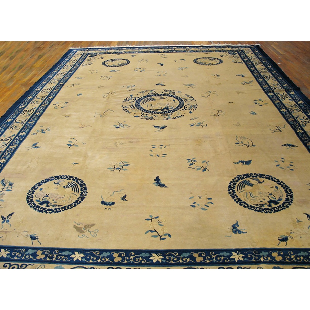 DescriptionChineseCarpets made in China proper. See entries Ningshia, Peking, Art Deco. Chinese - PekingThe commercial Peking carpet is a later 19th century development, begun by importing weaves from Ningshia (see entry) to create and export industry aimed at Western markets. The foundation is cotton and the pile is a good quality carpet wool which takes dyes particularly well. The neat medium weave is in Persian (asymmetric) knots. Designs are strictly Chinese and the whole motif repertoire of Chinese art is employed. Blue and white is the most popular color combination and red is particularly rare. Sizes tend to 9 x 12 and larger, and few small pieces appear. For a short time in the early 1920s Persian designs were woven to capitalize on the death of new Iranian goods. The industry decimated by the Communist Revolution relocated to the Pearl River area. There is a good supply of antique carpets at reasonable prices. | |