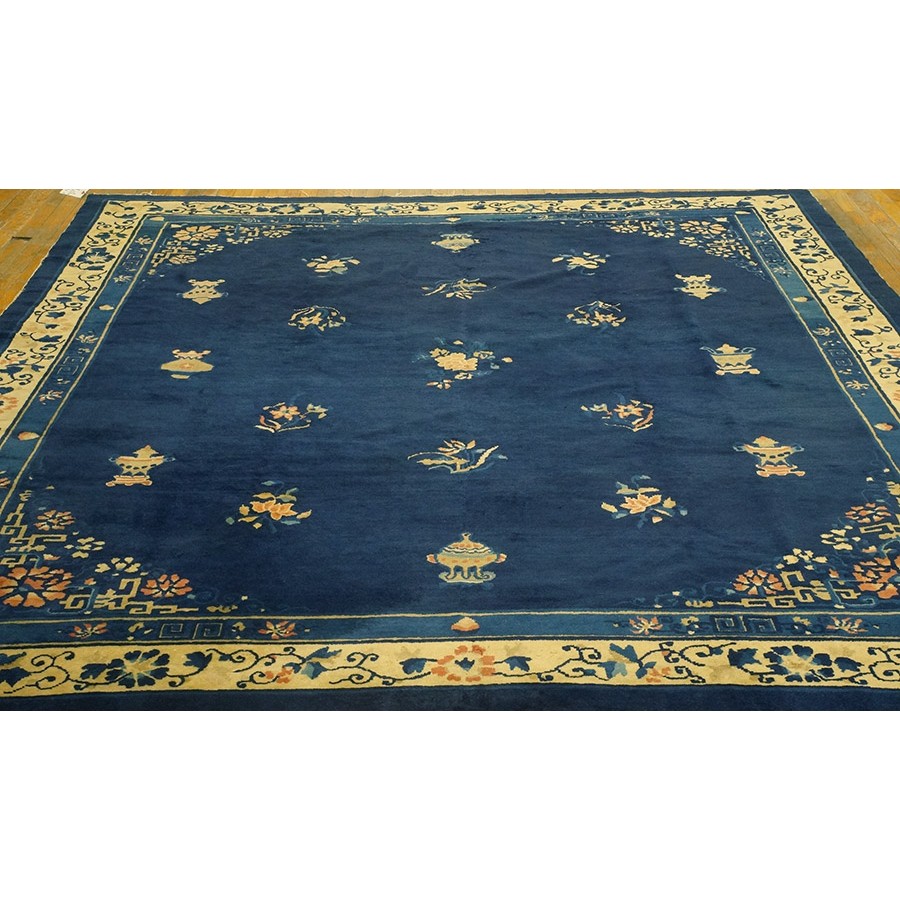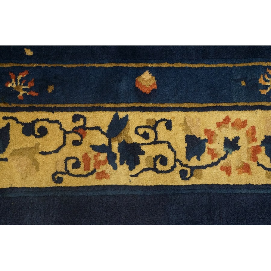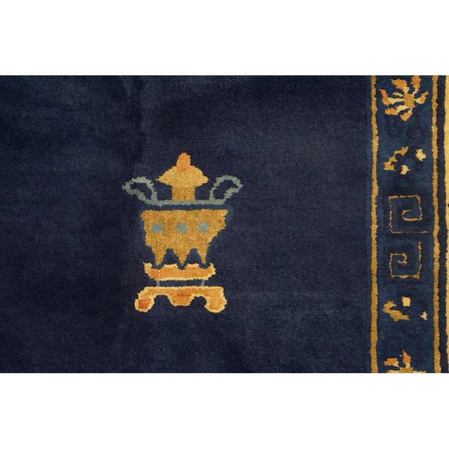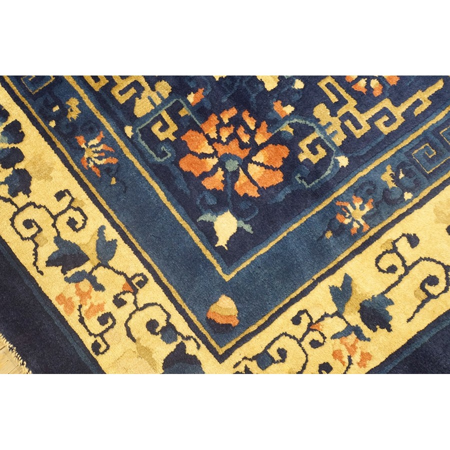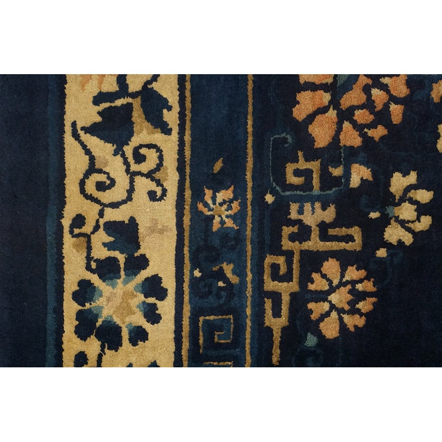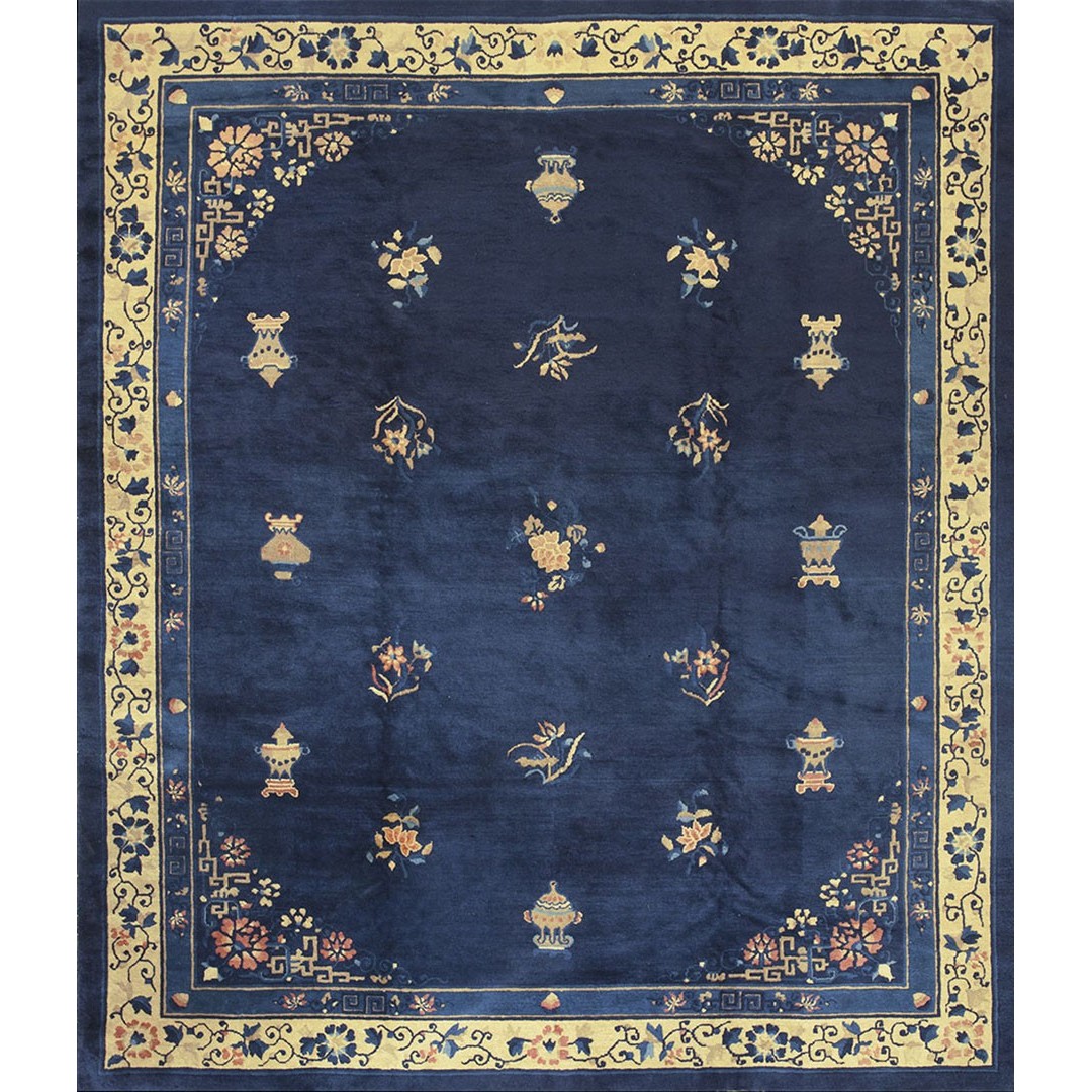 DescriptionChineseCarpets made in China proper. See entries Ningshia, Peking, Art Deco. Chinese - PekingThe commercial Peking carpet is a later 19th century development, begun by importing weaves from Ningshia (see entry) to create and export industry aimed at Western markets. The foundation is cotton and the pile is a good quality carpet wool which takes dyes particularly well. The neat medium weave is in Persian (asymmetric) knots. Designs are strictly Chinese and the whole motif repertoire of Chinese art is employed. Blue and white is the most popular color combination and red is particularly rare. Sizes tend to 9 x 12 and larger, and few small pieces appear. For a short time in the early 1920s Persian designs were woven to capitalize on the death of new Iranian goods. The industry decimated by the Communist Revolution relocated to the Pearl River area. There is a good supply of antique carpets at reasonable prices. | |