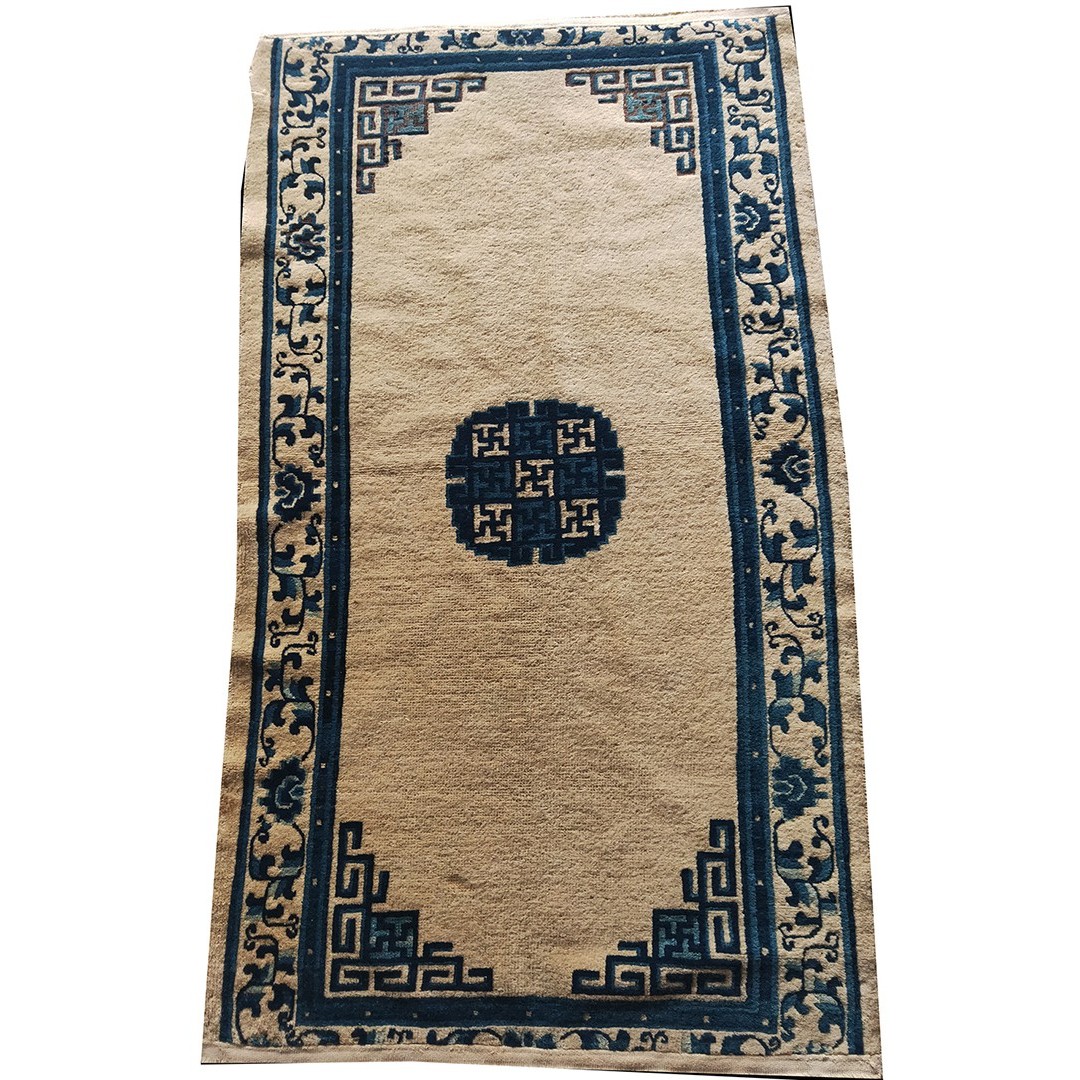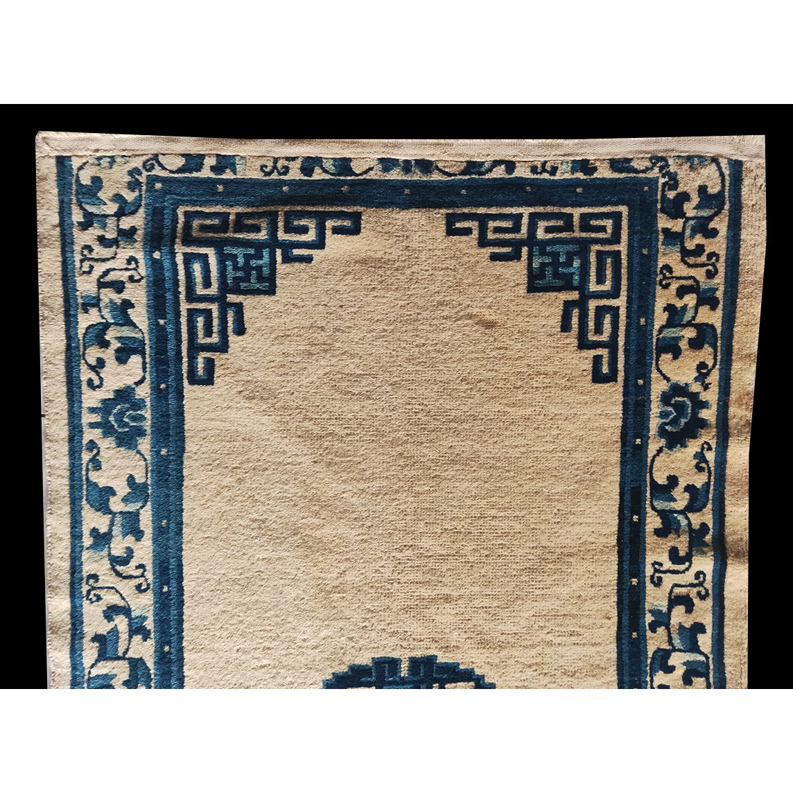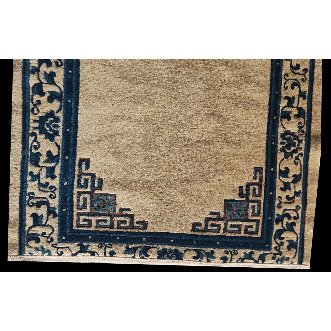 DescriptionChineseCarpets made in China proper. See entries Ningshia, Peking, Art Deco. Chinese - PekingThe commercial Peking carpet is a later 19th century development, begun by importing weaves from Ningshia (see entry) to create and export industry aimed at Western markets. The foundation is cotton and the pile is a good quality carpet wool which takes dyes particularly well. The neat medium weave is in Persian (asymmetric) knots. Designs are strictly Chinese and the whole motif repertoire of Chinese art is employed. Blue and white is the most popular color combination and red is particularly rare. Sizes tend to 9 x 12 and larger, and few small pieces appear. For a short time in the early 1920s Persian designs were woven to capitalize on the death of new Iranian goods. The industry decimated by the Communist Revolution relocated to the Pearl River area. There is a good supply of antique carpets at reasonable prices. | |