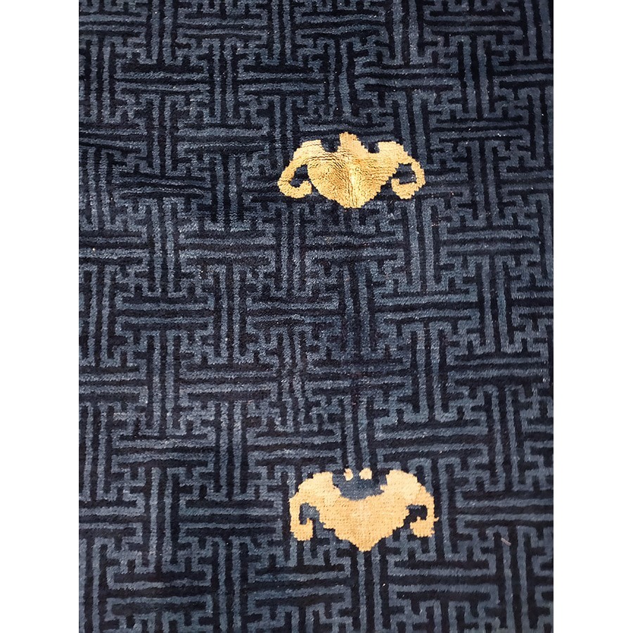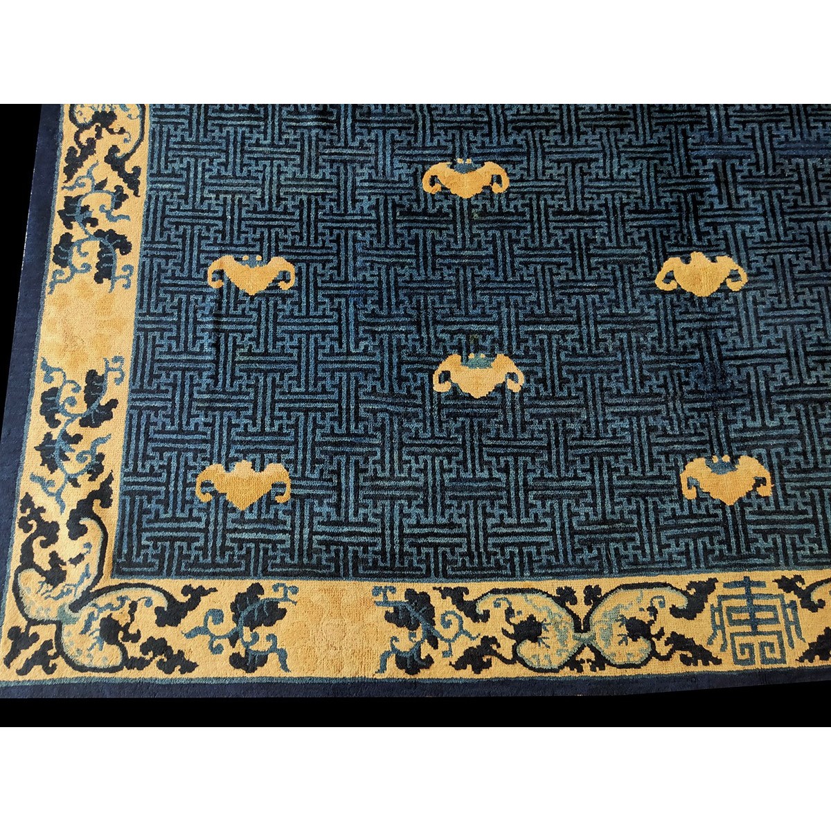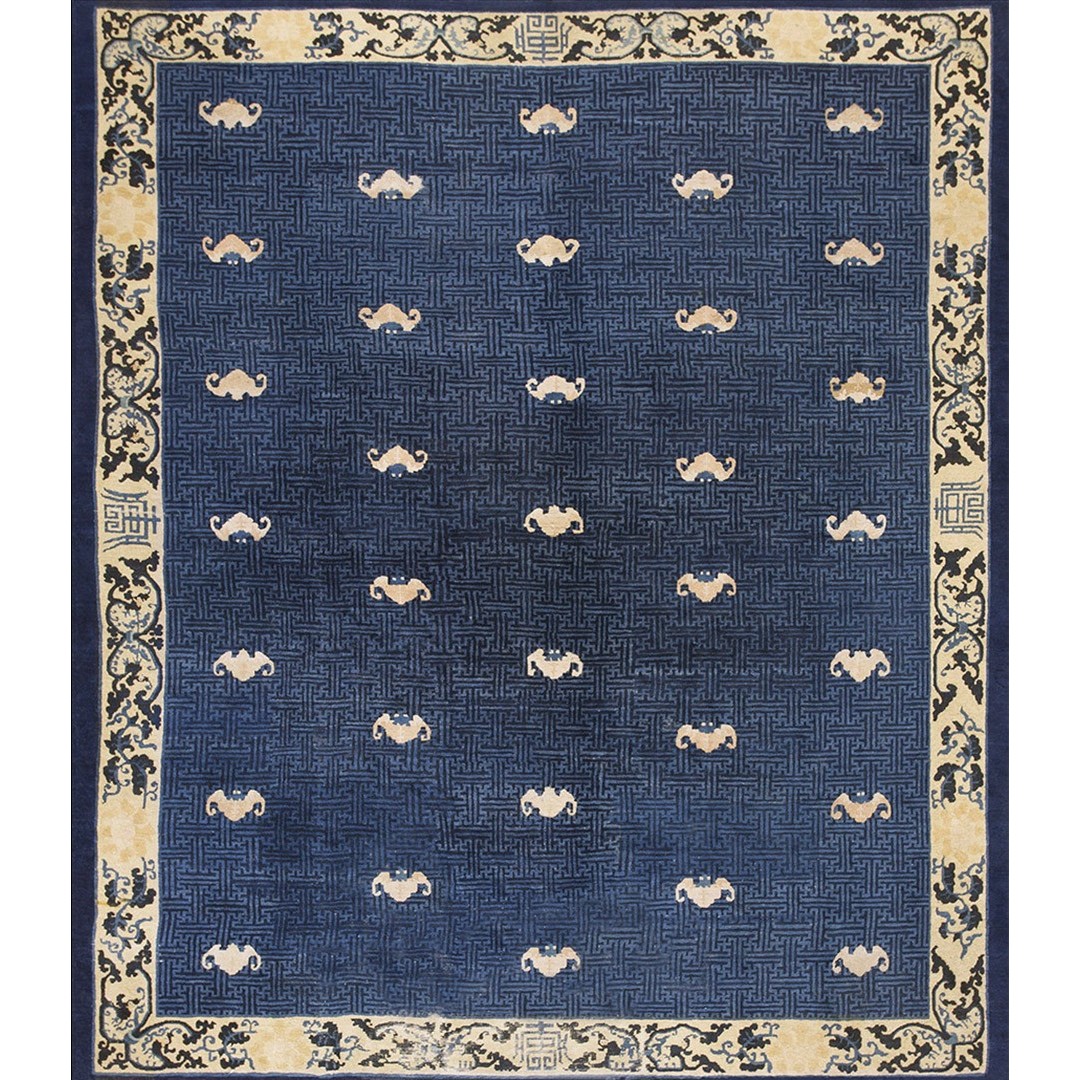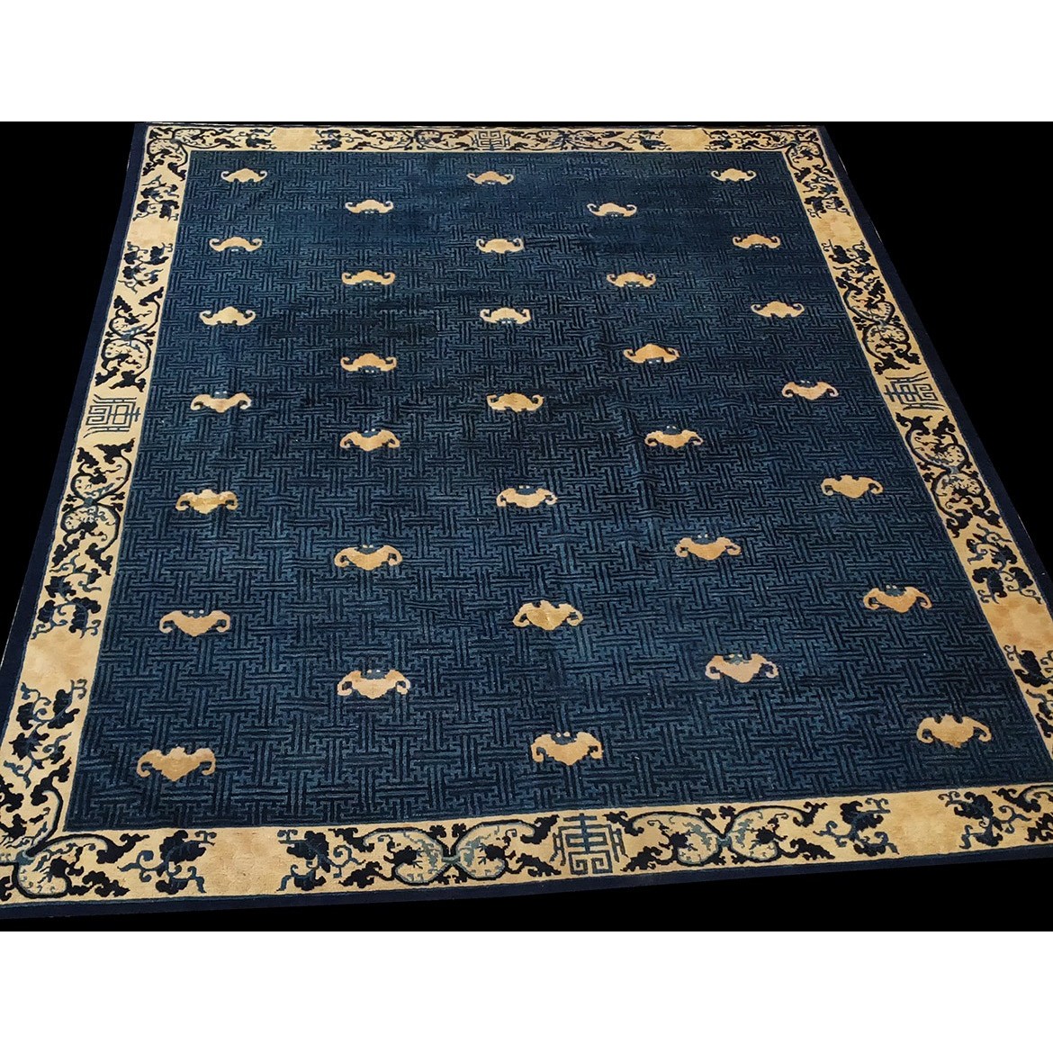 DescriptionChineseCarpets made in China proper. See entries Ningshia, Peking, Art Deco. Chinese - PekingThe commercial Peking carpet is a later 19th century development, begun by importing weaves from Ningshia (see entry) to create and export industry aimed at Western markets. The foundation is cotton and the pile is a good quality carpet wool which takes dyes particularly well. The neat medium weave is in Persian (asymmetric) knots. Designs are strictly Chinese and the whole motif repertoire of Chinese art is employed. Blue and white is the most popular color combination and red is particularly rare. Sizes tend to 9 x 12 and larger, and few small pieces appear. For a short time in the early 1920s Persian designs were woven to capitalize on the death of new Iranian goods. The industry decimated by the Communist Revolution relocated to the Pearl River area. There is a good supply of antique carpets at reasonable prices. | |