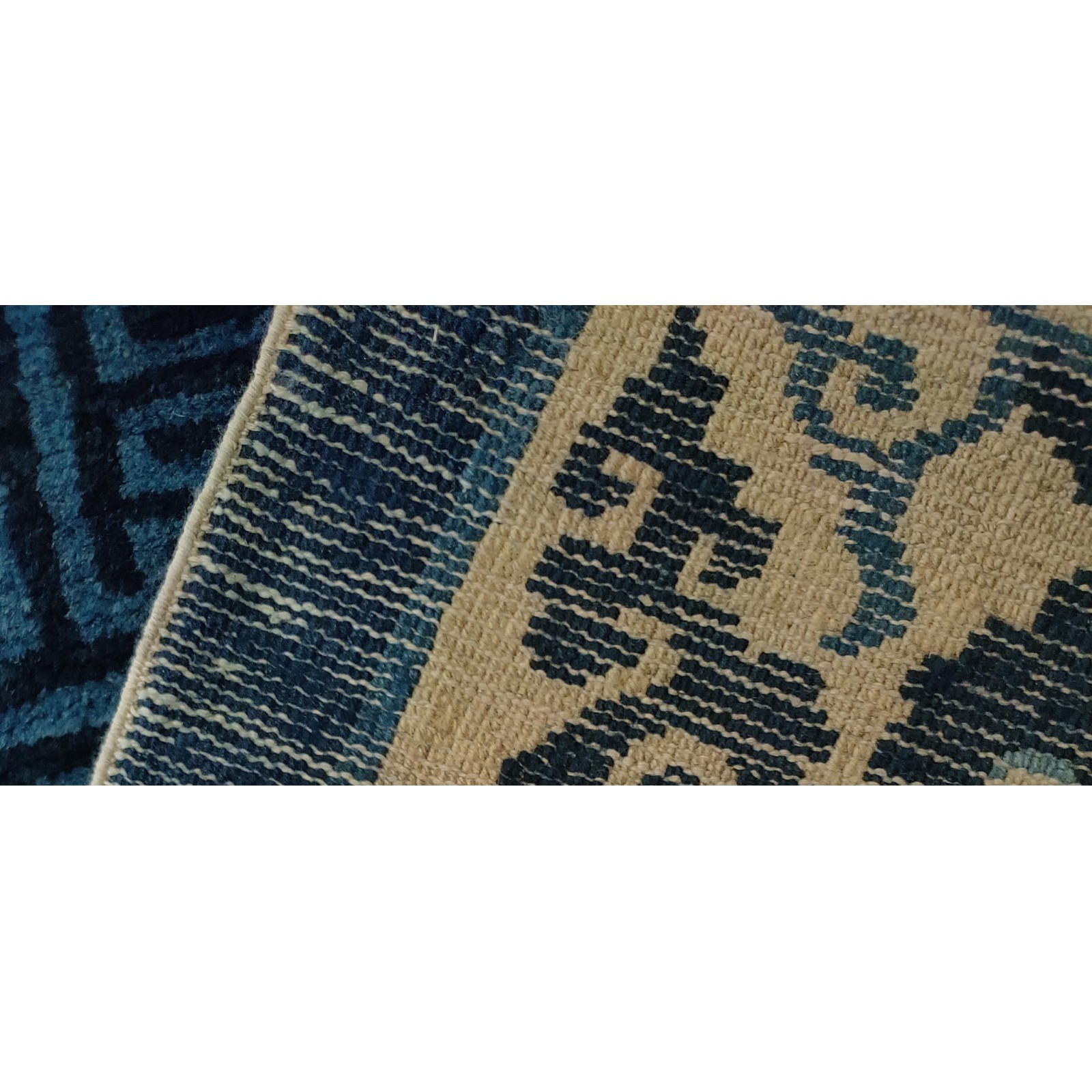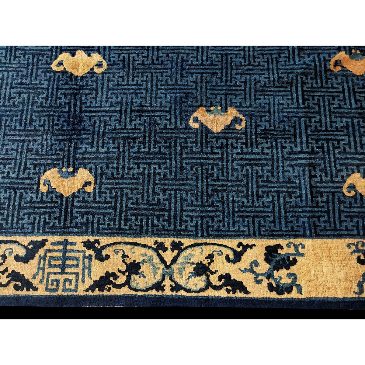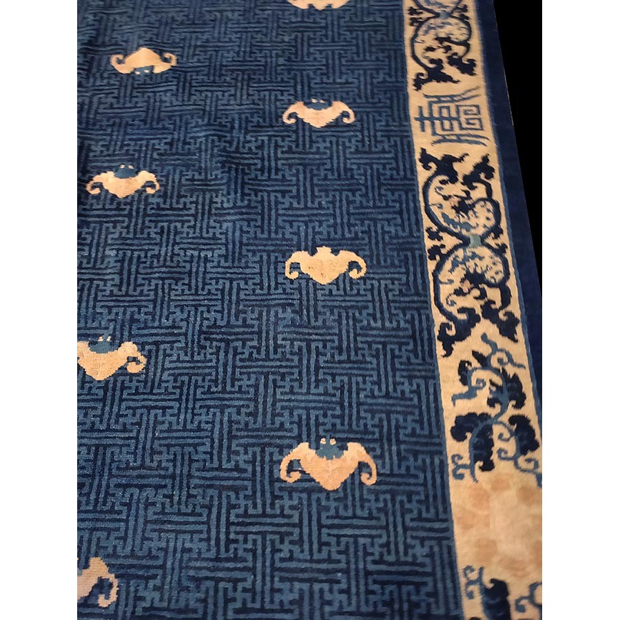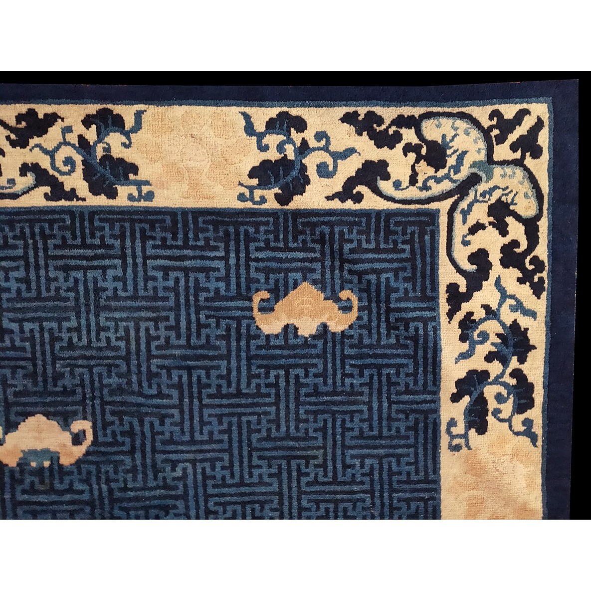 DescriptionChineseCarpets made in China proper. See entries Ningshia, Peking, Art Deco. Chinese - PekingThe commercial Peking carpet is a later 19th century development, begun by importing weaves from Ningshia (see entry) to create and export industry aimed at Western markets. The foundation is cotton and the pile is a good quality carpet wool which takes dyes particularly well. The neat medium weave is in Persian (asymmetric) knots. Designs are strictly Chinese and the whole motif repertoire of Chinese art is employed. Blue and white is the most popular color combination and red is particularly rare. Sizes tend to 9 x 12 and larger, and few small pieces appear. For a short time in the early 1920s Persian designs were woven to capitalize on the death of new Iranian goods. The industry decimated by the Communist Revolution relocated to the Pearl River area. There is a good supply of antique carpets at reasonable prices. | |