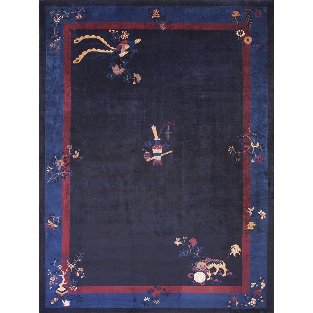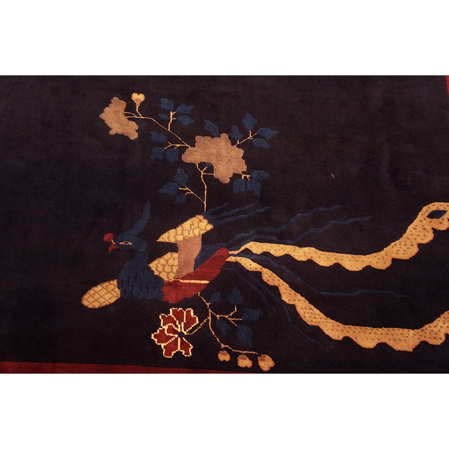 DescriptionChineseCarpets made in China proper. See entries Ningshia, Peking, Art Deco. Chinese - PekingThe commercial Peking carpet is a later 19th century development, begun by importing weaves from Ningshia (see entry) to create and export industry aimed at Western markets. The foundation is cotton and the pile is a good quality carpet wool which takes dyes particularly well. The neat medium weave is in Persian (asymmetric) knots. Designs are strictly Chinese and the whole motif repertoire of Chinese art is employed. Blue and white is the most popular color combination and red is particularly rare. Sizes tend to 9 x 12 and larger, and few small pieces appear. For a short time in the early 1920s Persian designs were woven to capitalize on the death of new Iranian goods. The industry decimated by the Communist Revolution relocated to the Pearl River area. There is a good supply of antique carpets at reasonable prices. | |