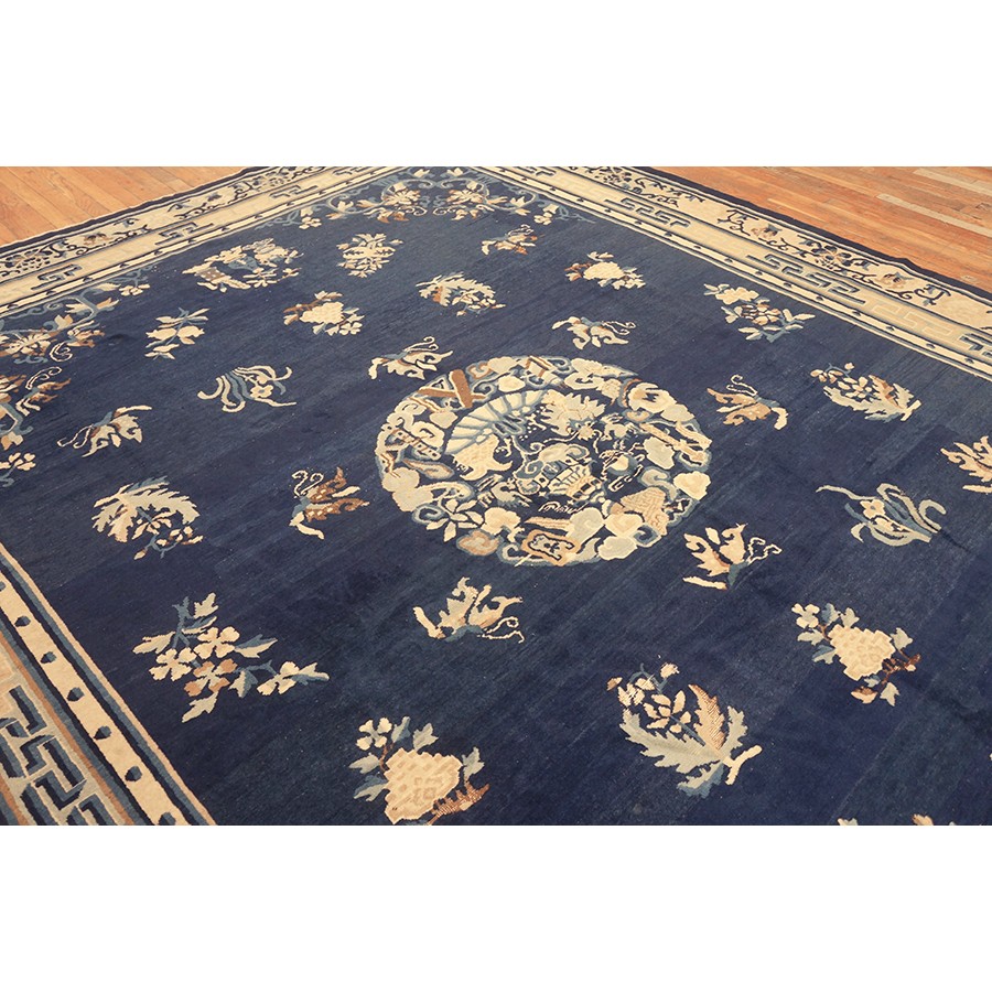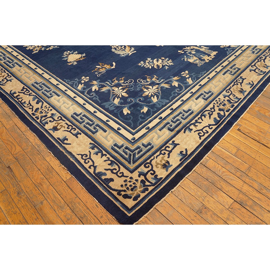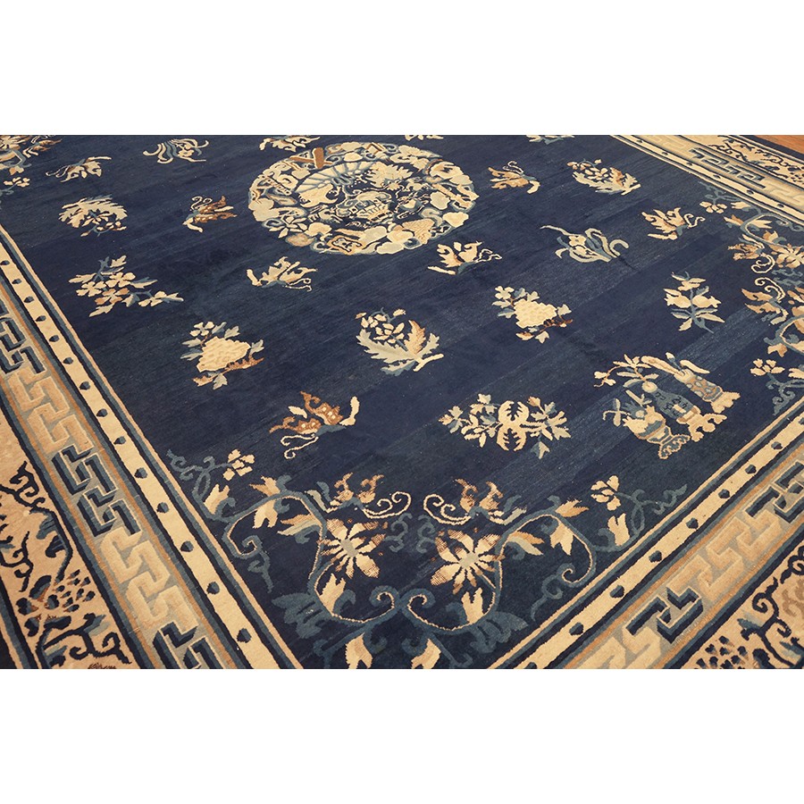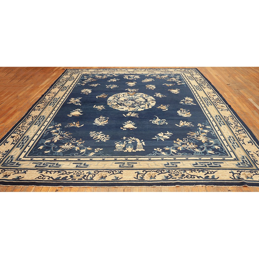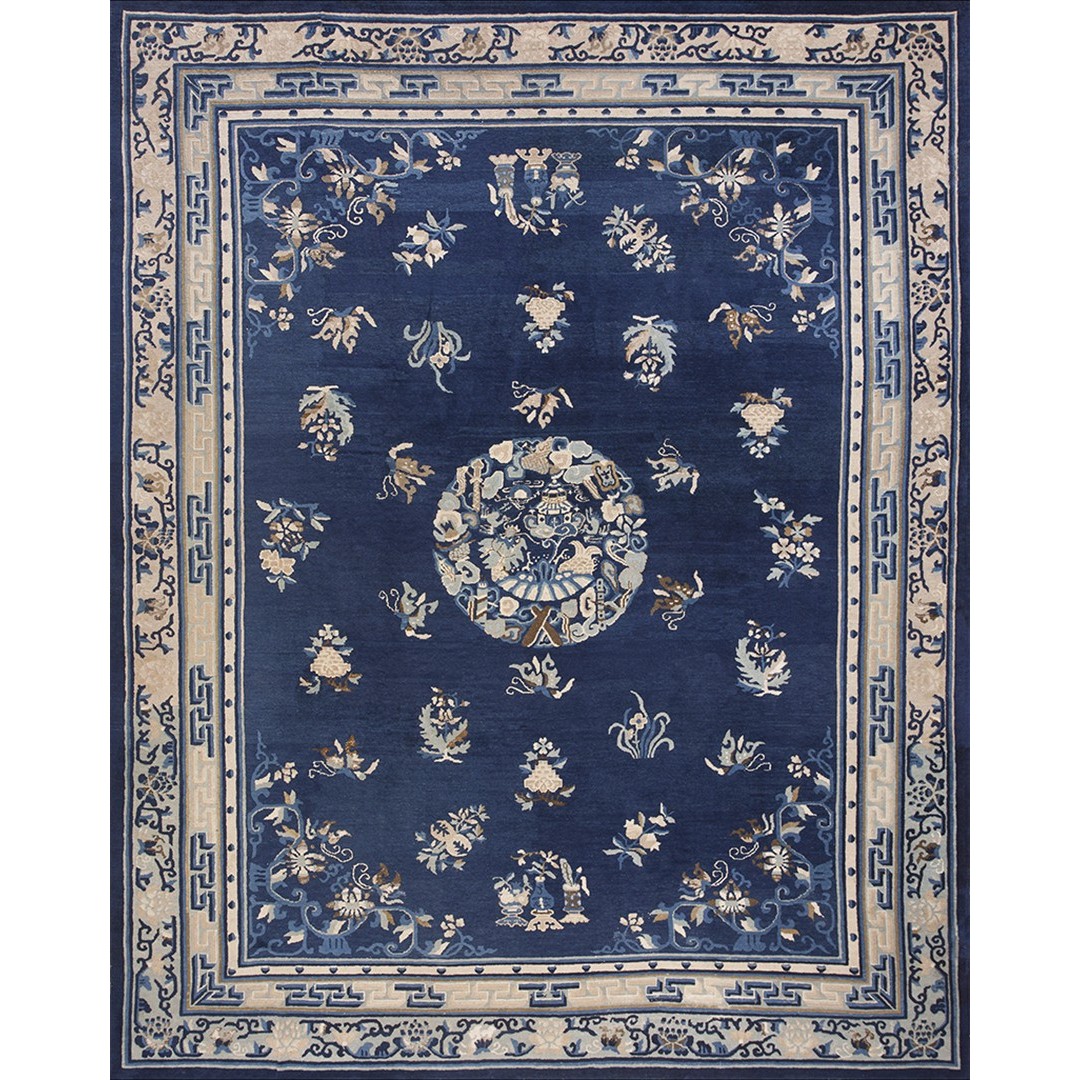 DescriptionChineseCarpets made in China proper. See entries Ningshia, Peking, Art Deco. Chinese - PekingThe commercial Peking carpet is a later 19th century development, begun by importing weaves from Ningshia (see entry) to create and export industry aimed at Western markets. The foundation is cotton and the pile is a good quality carpet wool which takes dyes particularly well. The neat medium weave is in Persian (asymmetric) knots. Designs are strictly Chinese and the whole motif repertoire of Chinese art is employed. Blue and white is the most popular color combination and red is particularly rare. Sizes tend to 9 x 12 and larger, and few small pieces appear. For a short time in the early 1920s Persian designs were woven to capitalize on the death of new Iranian goods. The industry decimated by the Communist Revolution relocated to the Pearl River area. There is a good supply of antique carpets at reasonable prices. | |