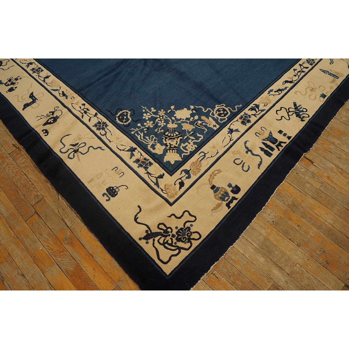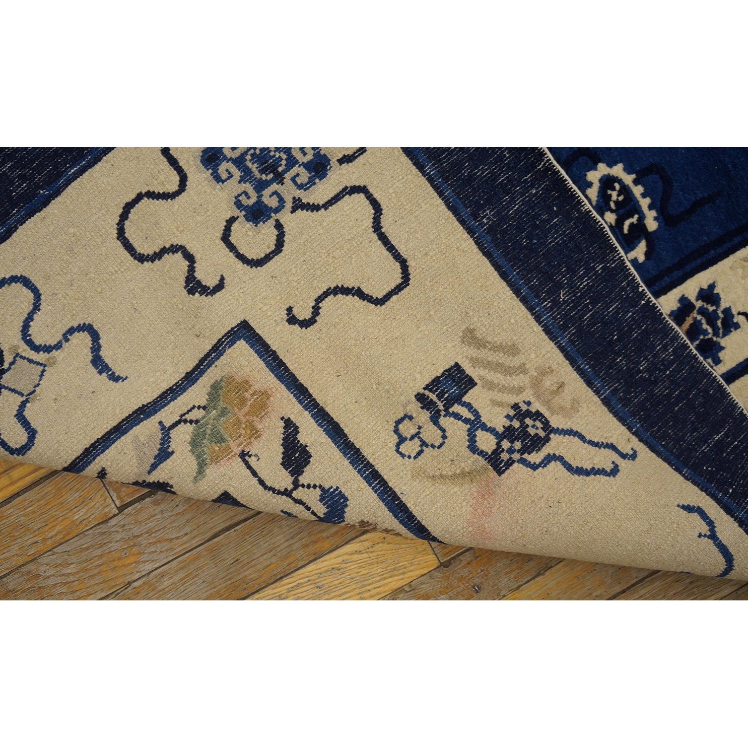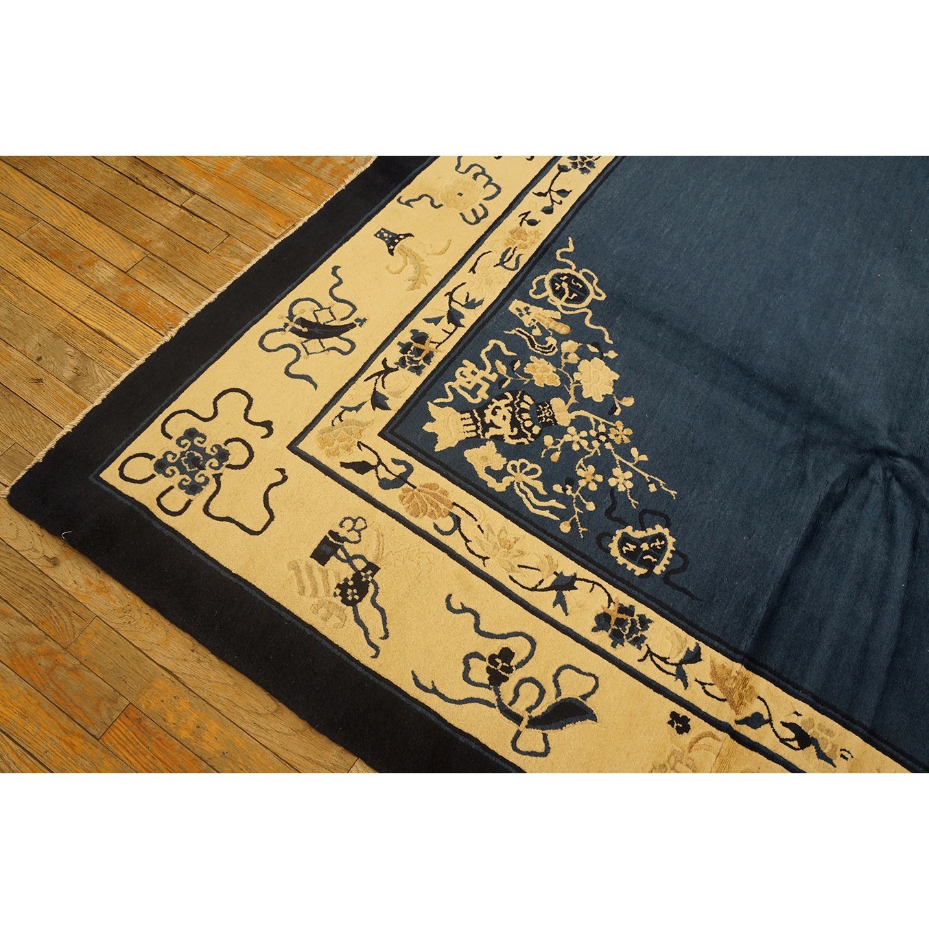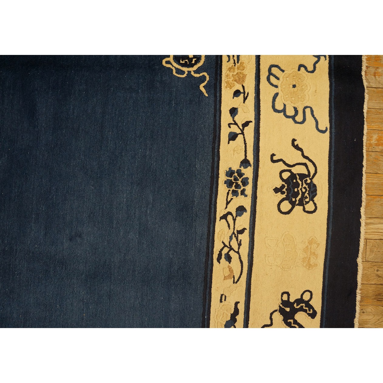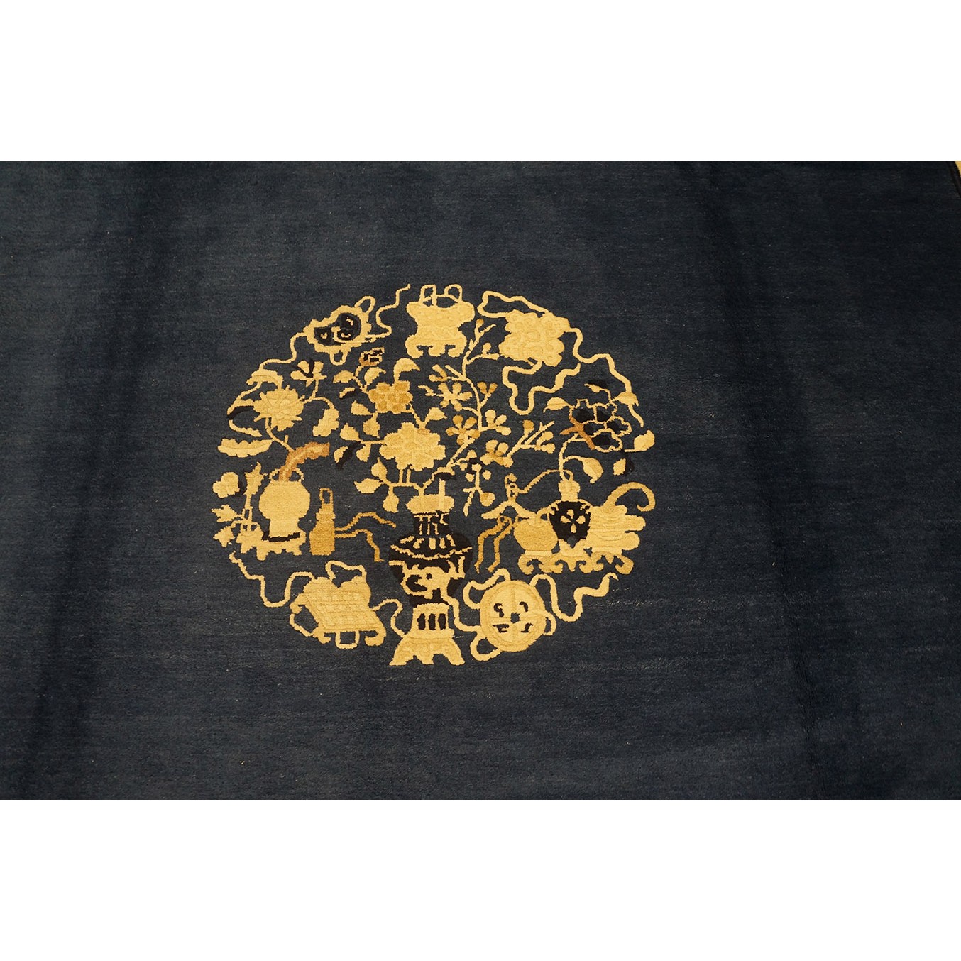 DescriptionChineseCarpets made in China proper. See entries Ningshia, Peking, Art Deco. Chinese - PekingThe commercial Peking carpet is a later 19th century development, begun by importing weaves from Ningshia (see entry) to create and export industry aimed at Western markets. The foundation is cotton and the pile is a good quality carpet wool which takes dyes particularly well. The neat medium weave is in Persian (asymmetric) knots. Designs are strictly Chinese and the whole motif repertoire of Chinese art is employed. Blue and white is the most popular color combination and red is particularly rare. Sizes tend to 9 x 12 and larger, and few small pieces appear. For a short time in the early 1920s Persian designs were woven to capitalize on the death of new Iranian goods. The industry decimated by the Communist Revolution relocated to the Pearl River area. There is a good supply of antique carpets at reasonable prices. | |