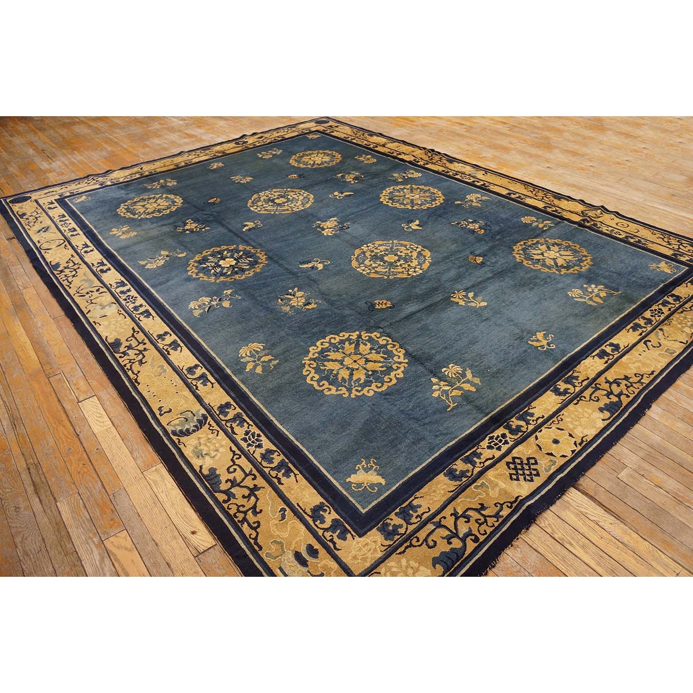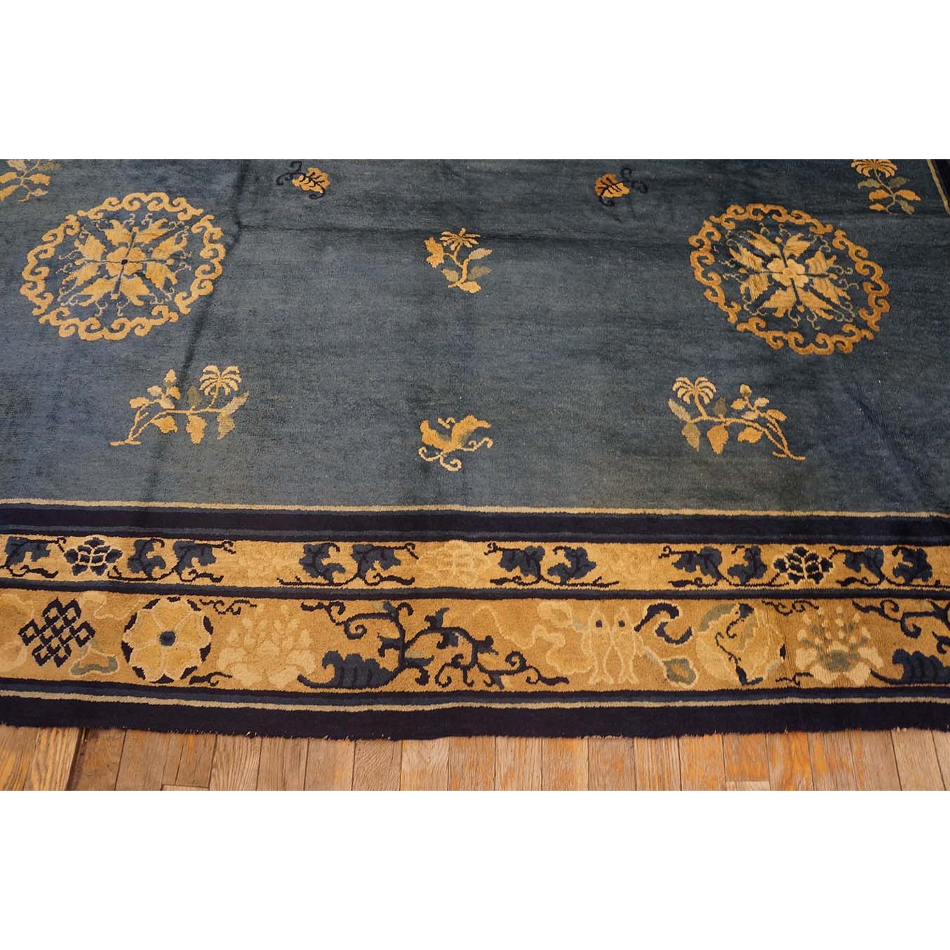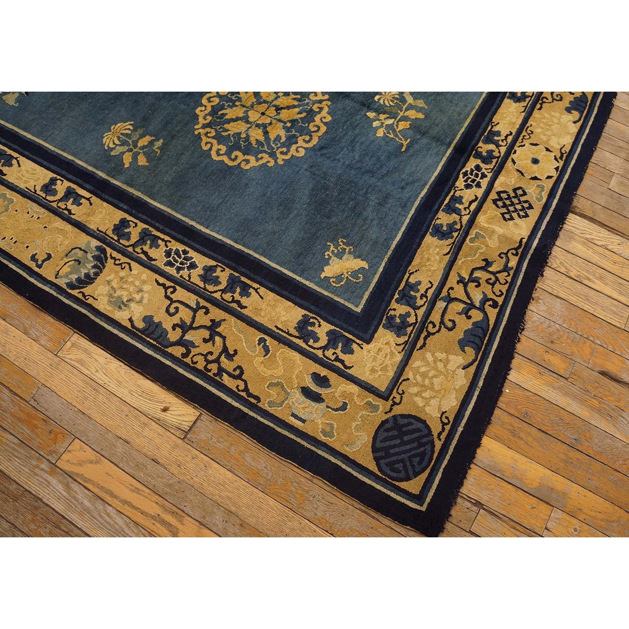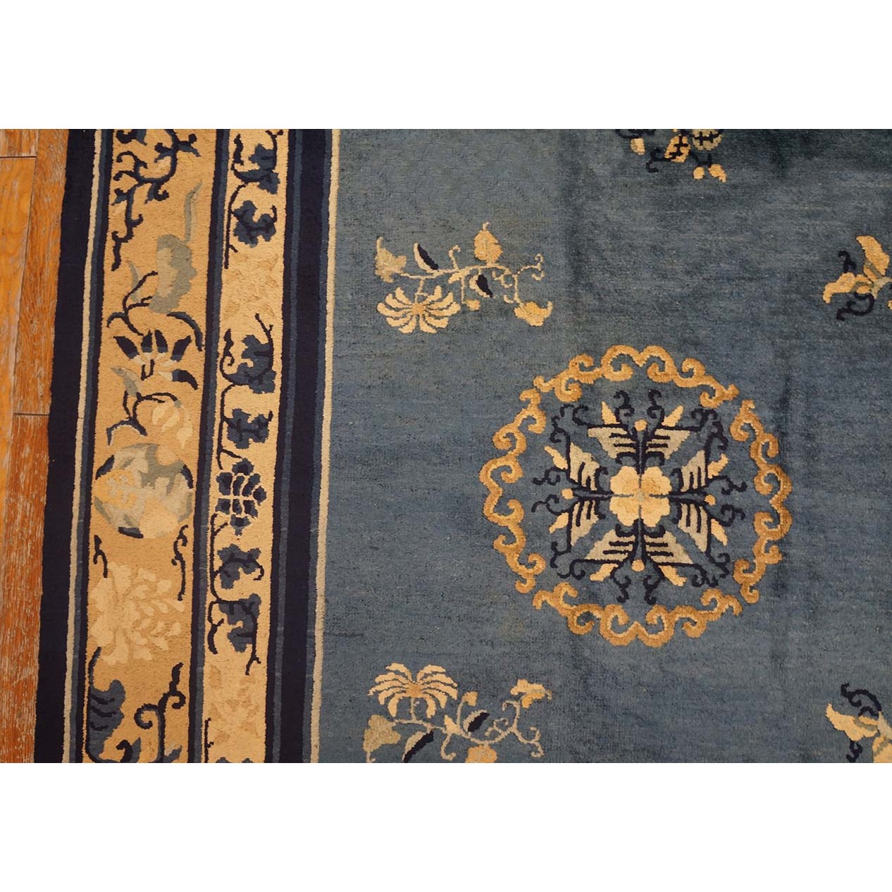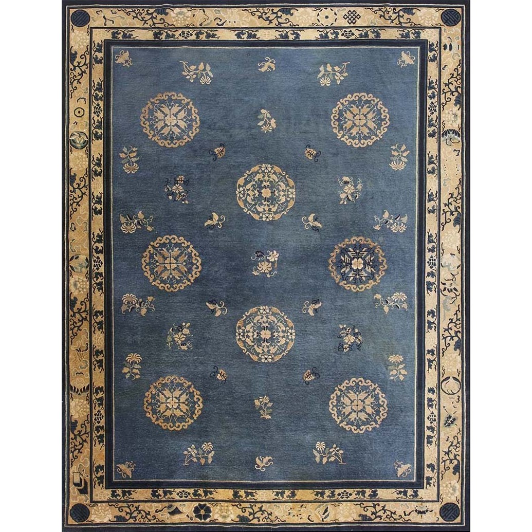 DescriptionChineseCarpets made in China proper. See entries Ningshia, Peking, Art Deco. Chinese - PekingThe commercial Peking carpet is a later 19th century development, begun by importing weaves from Ningshia (see entry) to create and export industry aimed at Western markets. The foundation is cotton and the pile is a good quality carpet wool which takes dyes particularly well. The neat medium weave is in Persian (asymmetric) knots. Designs are strictly Chinese and the whole motif repertoire of Chinese art is employed. Blue and white is the most popular color combination and red is particularly rare. Sizes tend to 9 x 12 and larger, and few small pieces appear. For a short time in the early 1920s Persian designs were woven to capitalize on the death of new Iranian goods. The industry decimated by the Communist Revolution relocated to the Pearl River area. There is a good supply of antique carpets at reasonable prices. | |