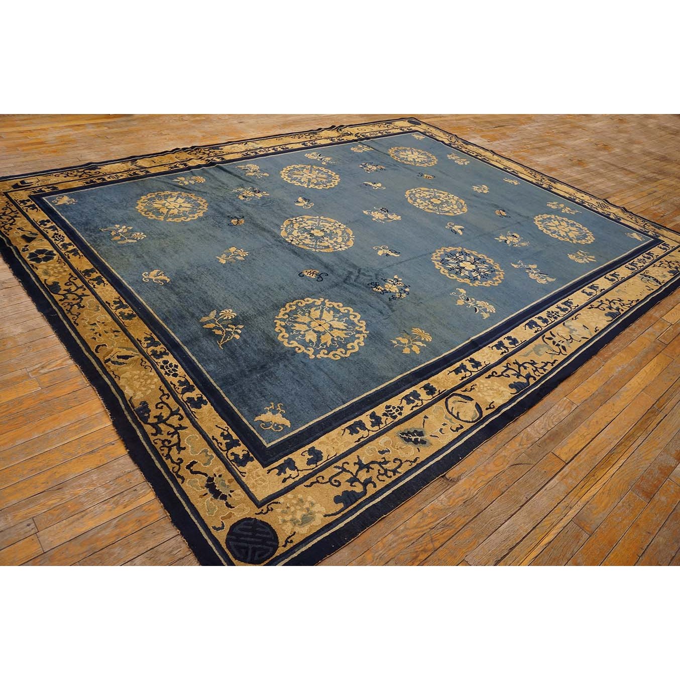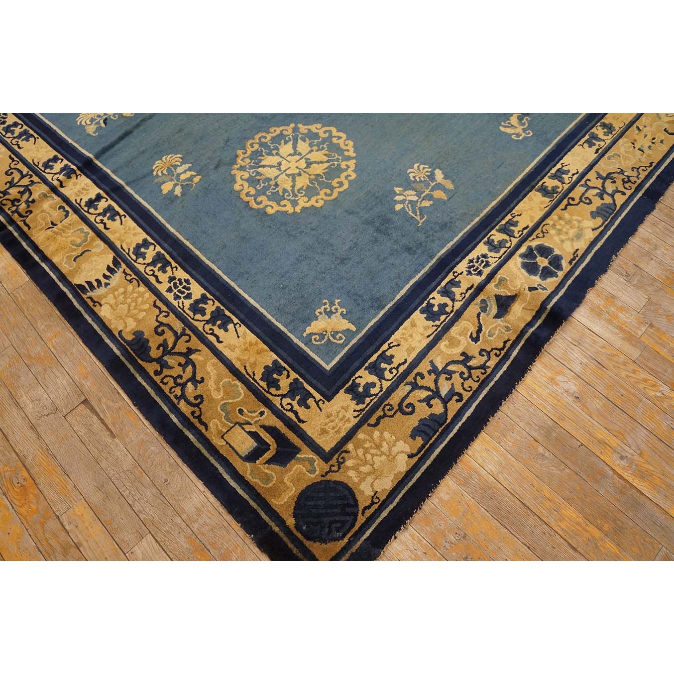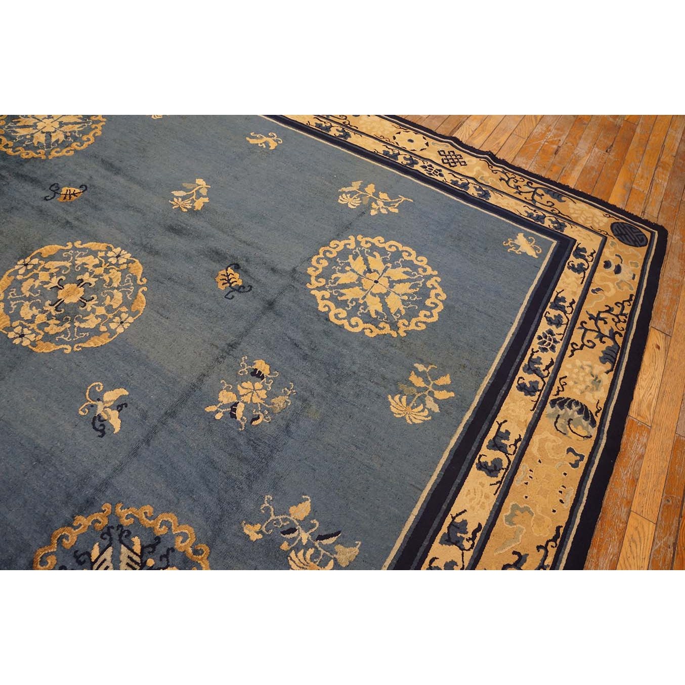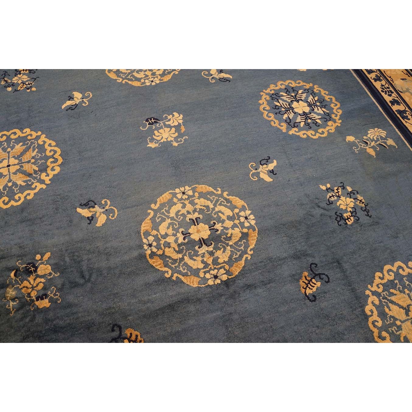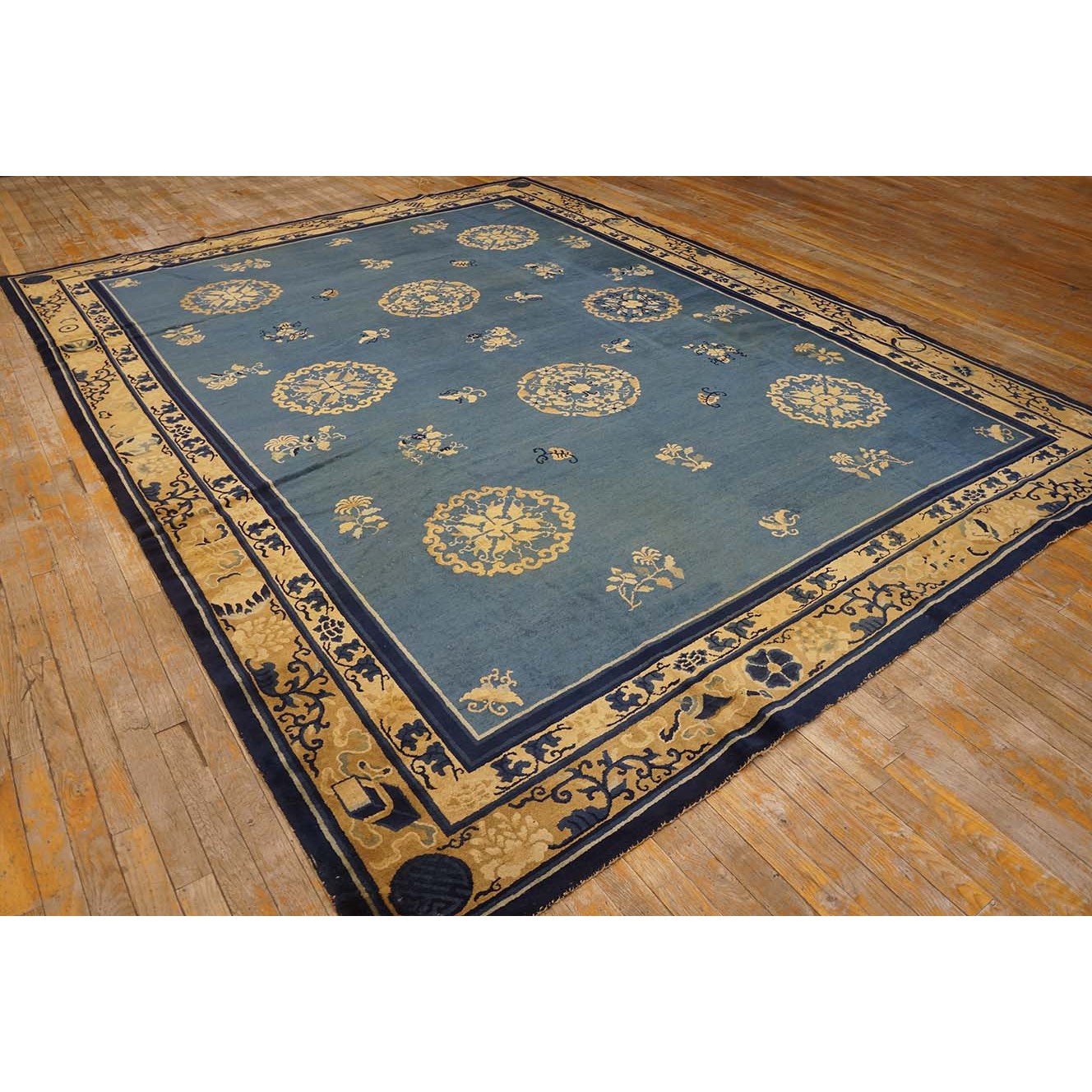 DescriptionChineseCarpets made in China proper. See entries Ningshia, Peking, Art Deco. Chinese - PekingThe commercial Peking carpet is a later 19th century development, begun by importing weaves from Ningshia (see entry) to create and export industry aimed at Western markets. The foundation is cotton and the pile is a good quality carpet wool which takes dyes particularly well. The neat medium weave is in Persian (asymmetric) knots. Designs are strictly Chinese and the whole motif repertoire of Chinese art is employed. Blue and white is the most popular color combination and red is particularly rare. Sizes tend to 9 x 12 and larger, and few small pieces appear. For a short time in the early 1920s Persian designs were woven to capitalize on the death of new Iranian goods. The industry decimated by the Communist Revolution relocated to the Pearl River area. There is a good supply of antique carpets at reasonable prices. | |