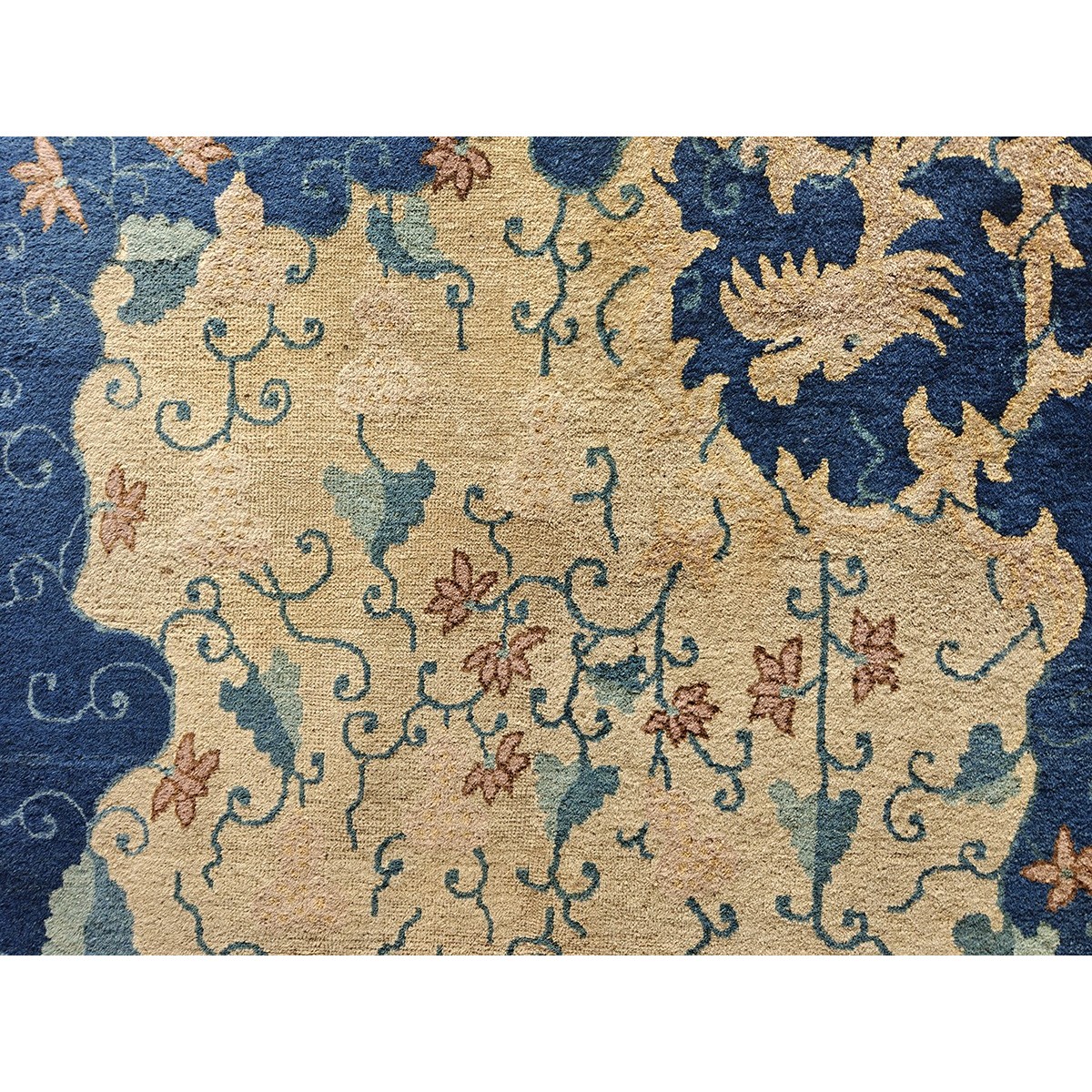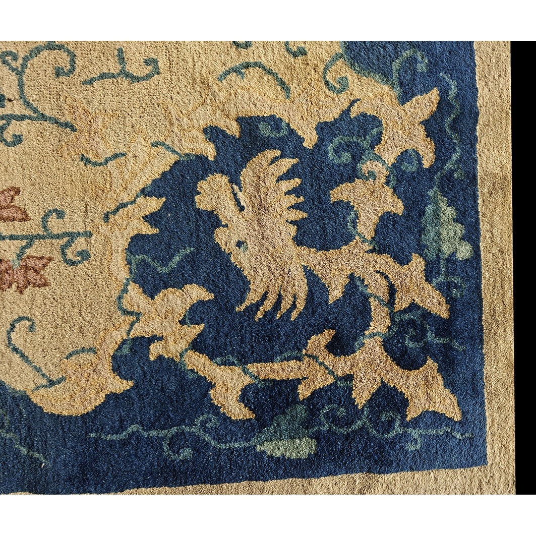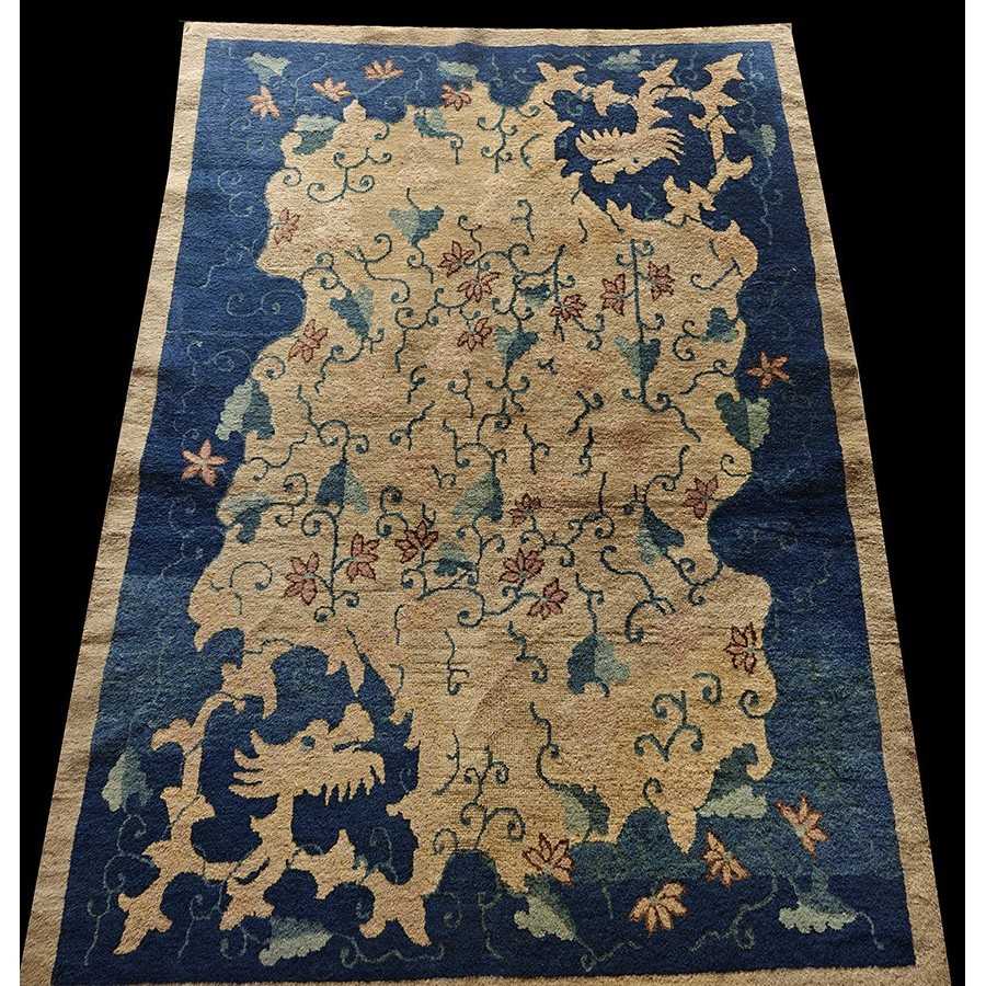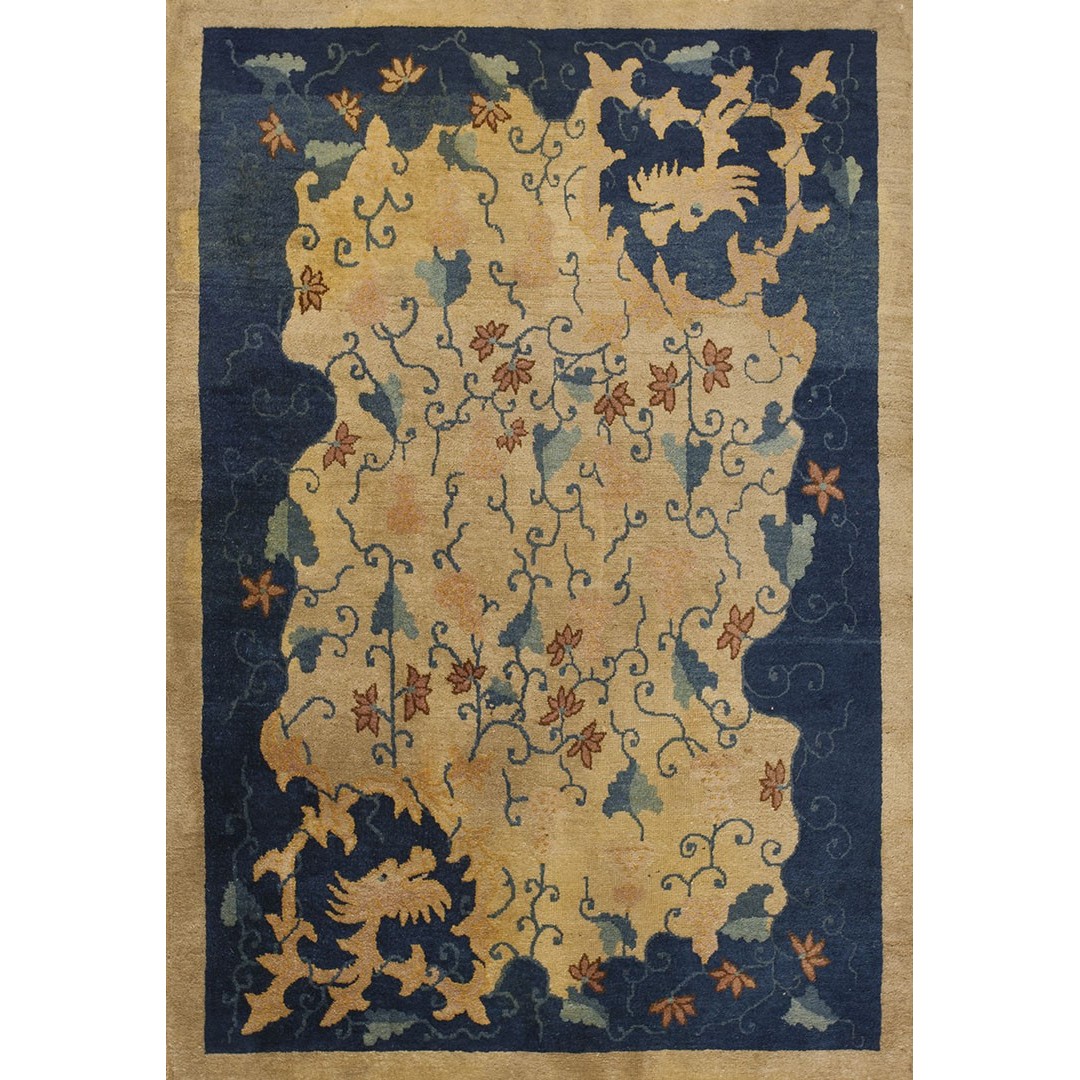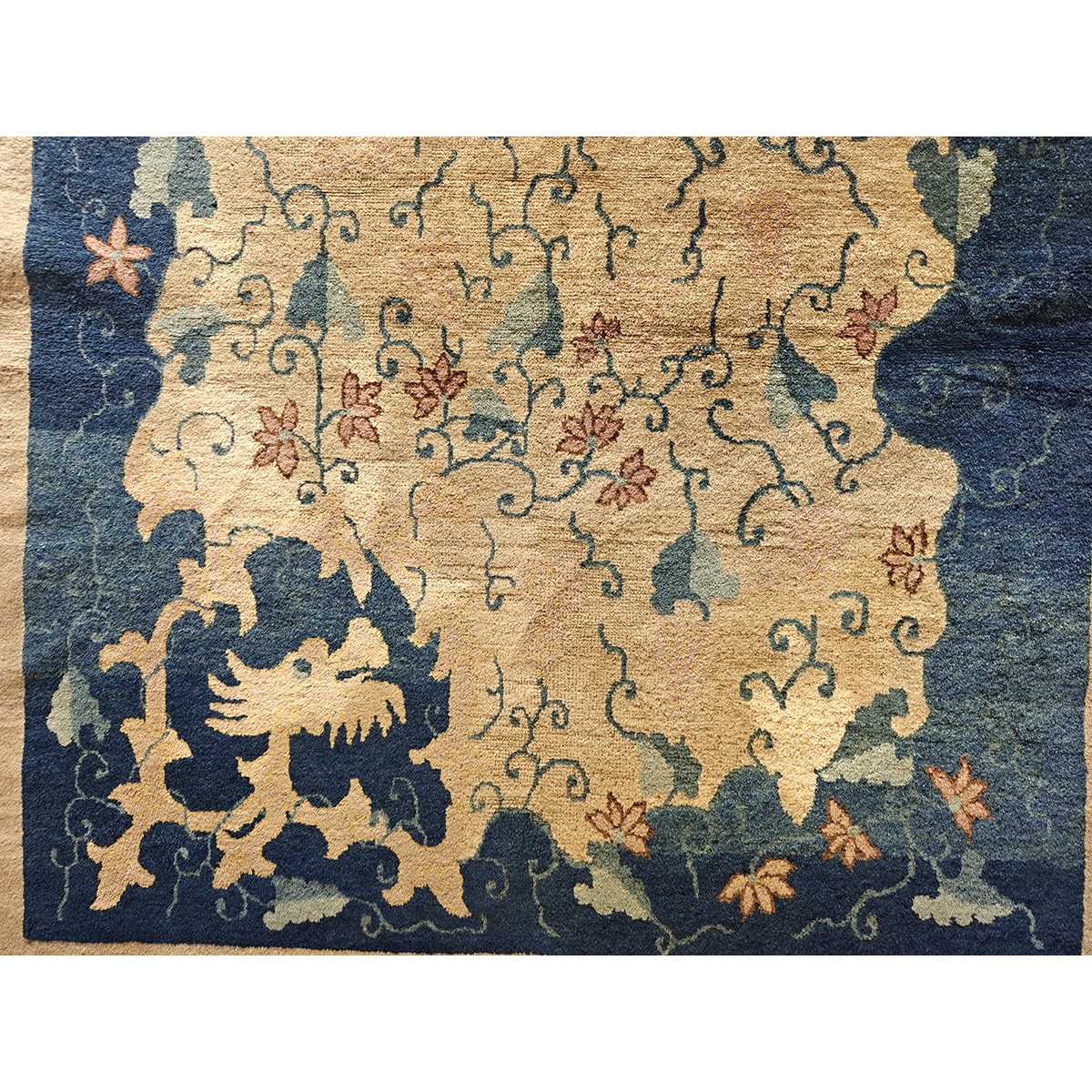DescriptionChineseCarpets made in China proper. See entries Ningshia, Peking, Art Deco. Chinese - PekingThe commercial Peking carpet is a later 19th century development, begun by importing weaves from Ningshia (see entry) to create and export industry aimed at Western markets. The foundation is cotton and the pile is a good quality carpet wool which takes dyes particularly well. The neat medium weave is in Persian (asymmetric) knots. Designs are strictly Chinese and the whole motif repertoire of Chinese art is employed. Blue and white is the most popular color combination and red is particularly rare. Sizes tend to 9 x 12 and larger, and few small pieces appear. For a short time in the early 1920s Persian designs were woven to capitalize on the death of new Iranian goods. The industry decimated by the Communist Revolution relocated to the Pearl River area. There is a good supply of antique carpets at reasonable prices. | |