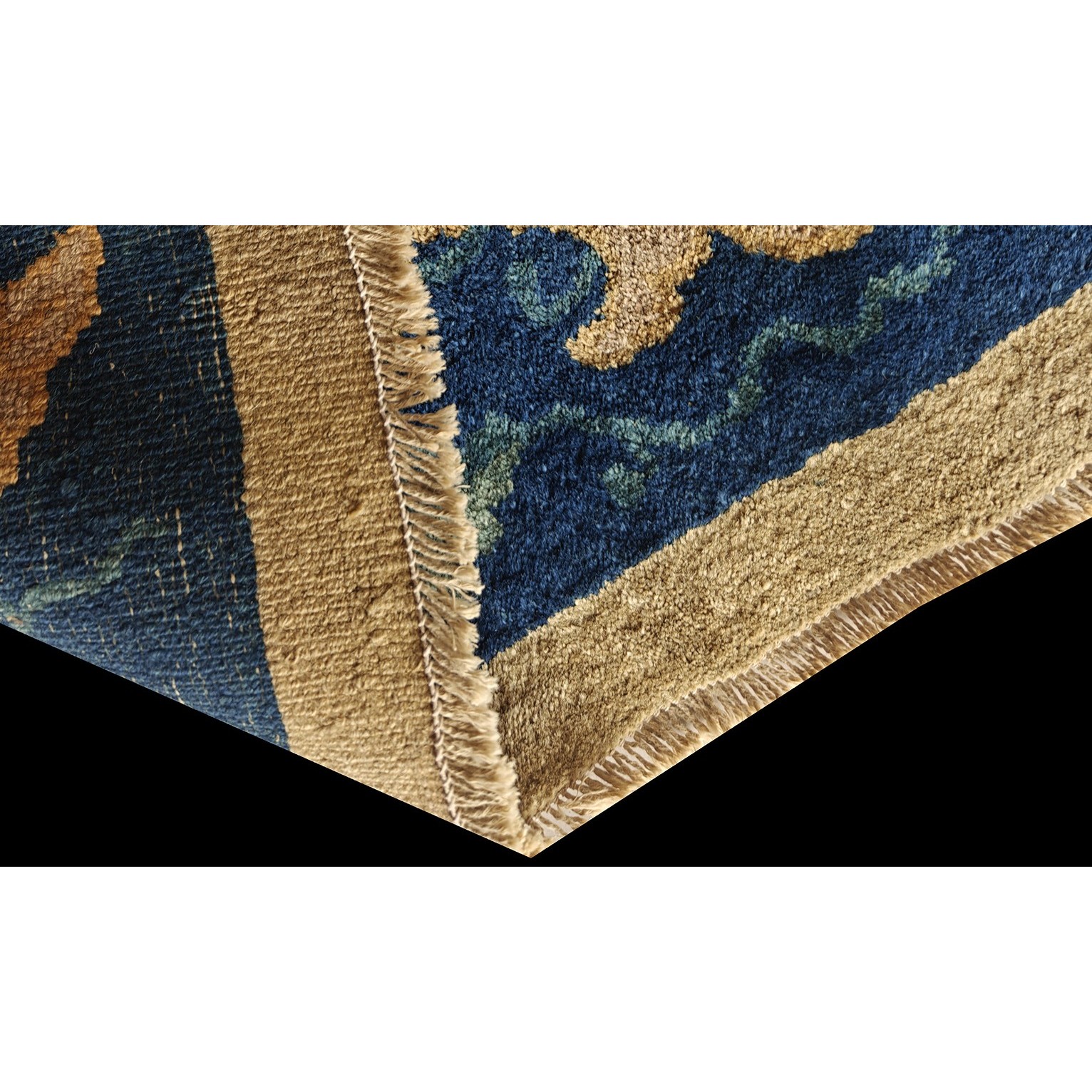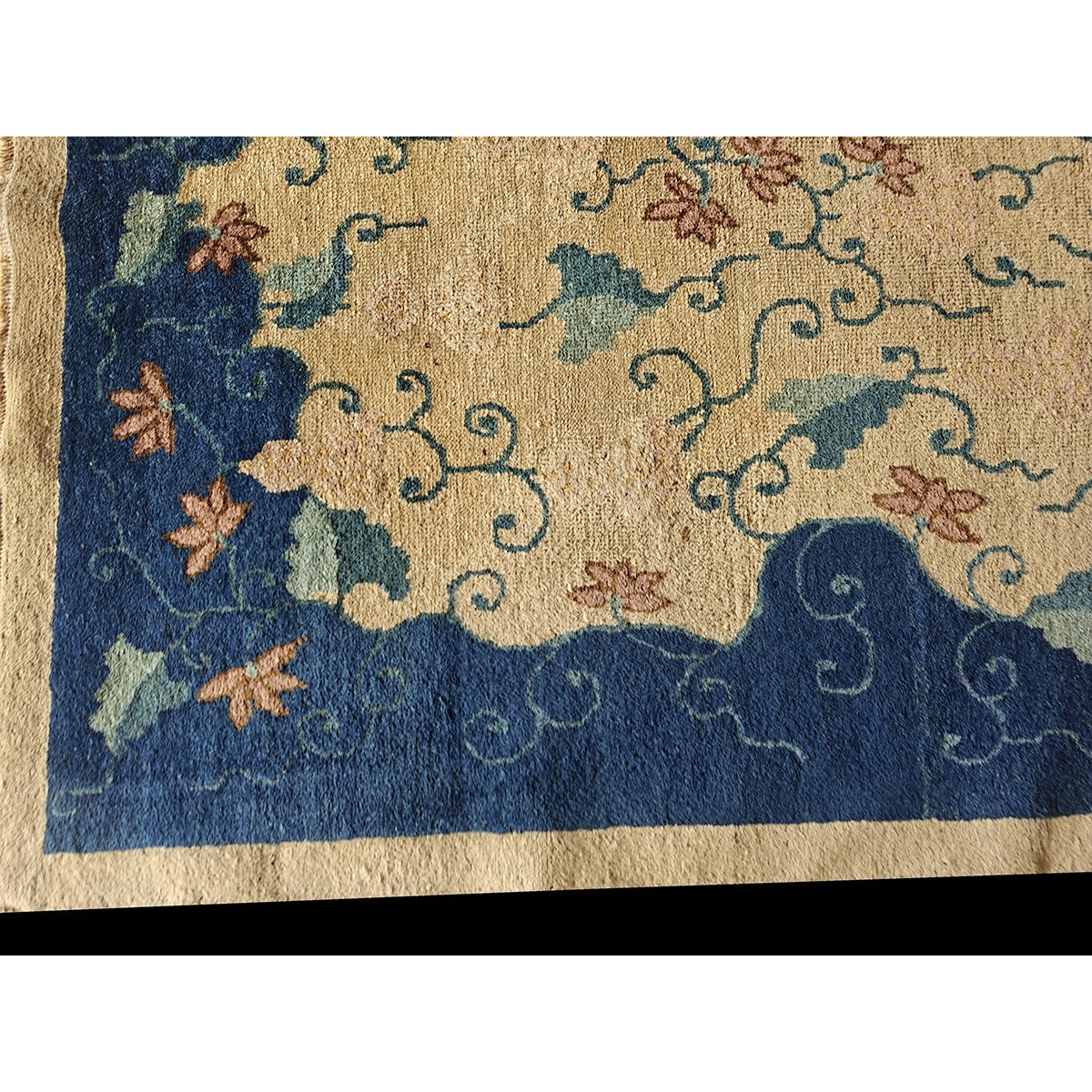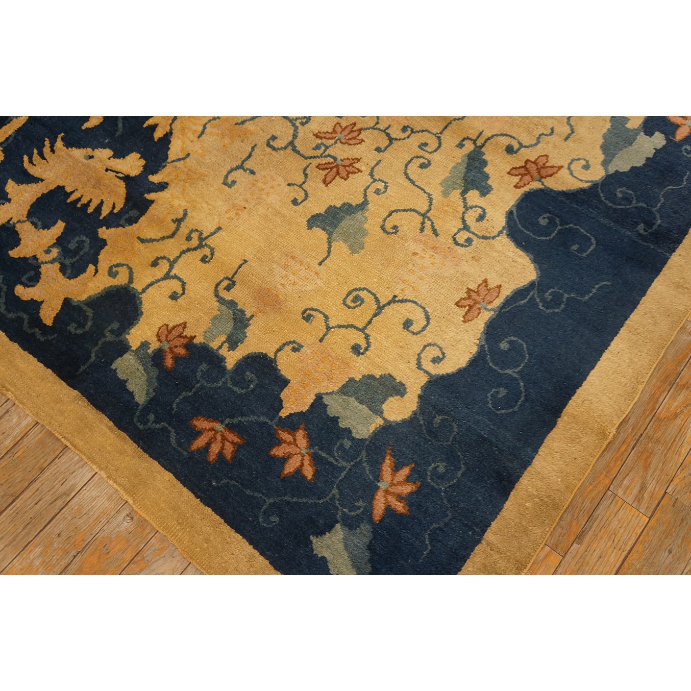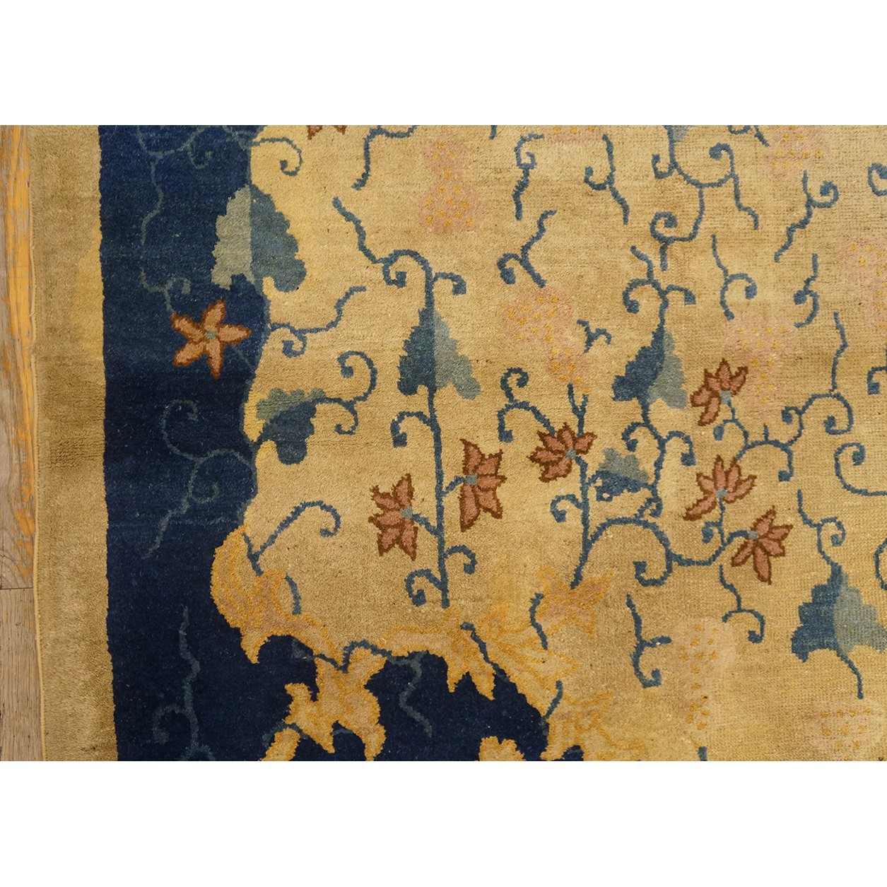DescriptionChineseCarpets made in China proper. See entries Ningshia, Peking, Art Deco. Chinese - PekingThe commercial Peking carpet is a later 19th century development, begun by importing weaves from Ningshia (see entry) to create and export industry aimed at Western markets. The foundation is cotton and the pile is a good quality carpet wool which takes dyes particularly well. The neat medium weave is in Persian (asymmetric) knots. Designs are strictly Chinese and the whole motif repertoire of Chinese art is employed. Blue and white is the most popular color combination and red is particularly rare. Sizes tend to 9 x 12 and larger, and few small pieces appear. For a short time in the early 1920s Persian designs were woven to capitalize on the death of new Iranian goods. The industry decimated by the Communist Revolution relocated to the Pearl River area. There is a good supply of antique carpets at reasonable prices. | |