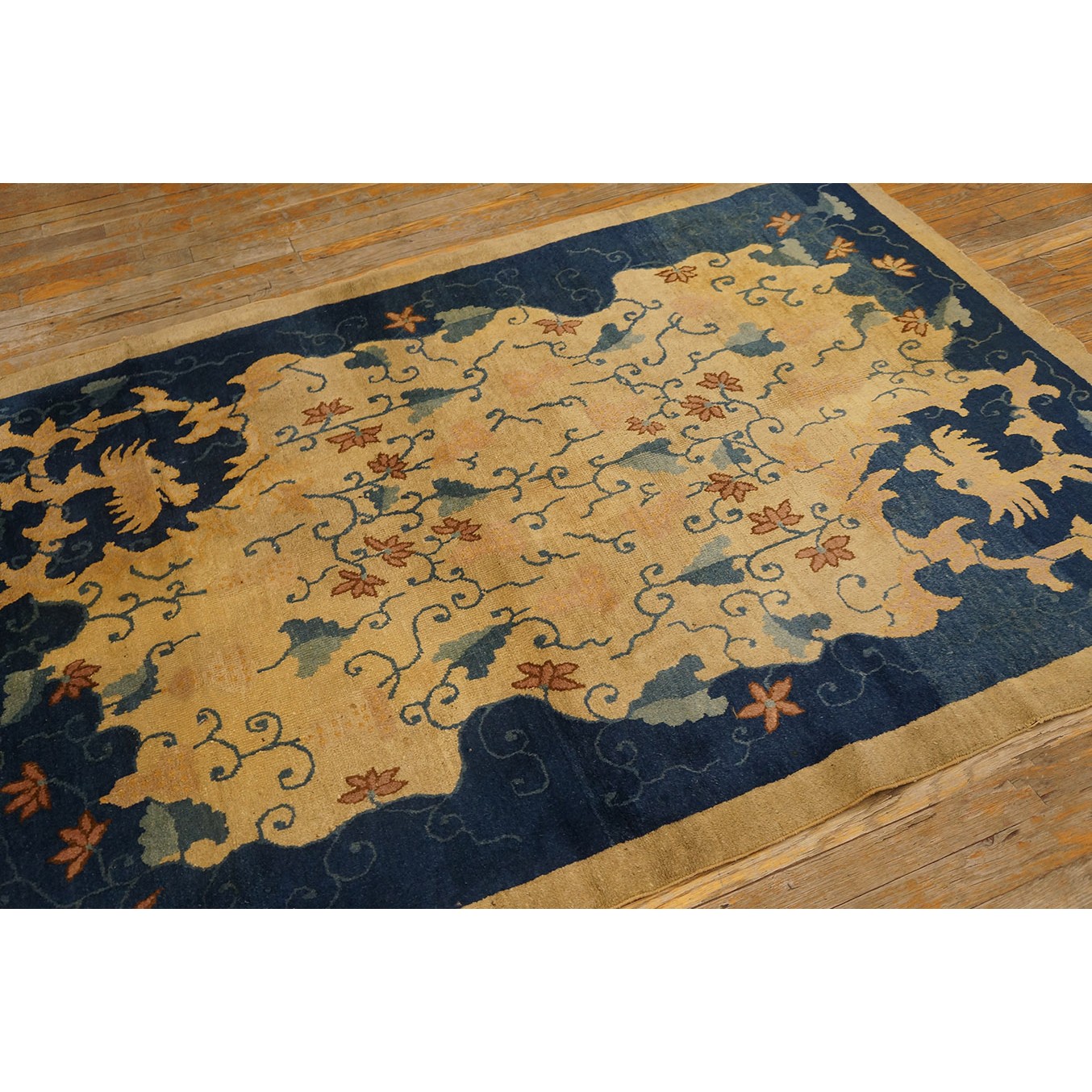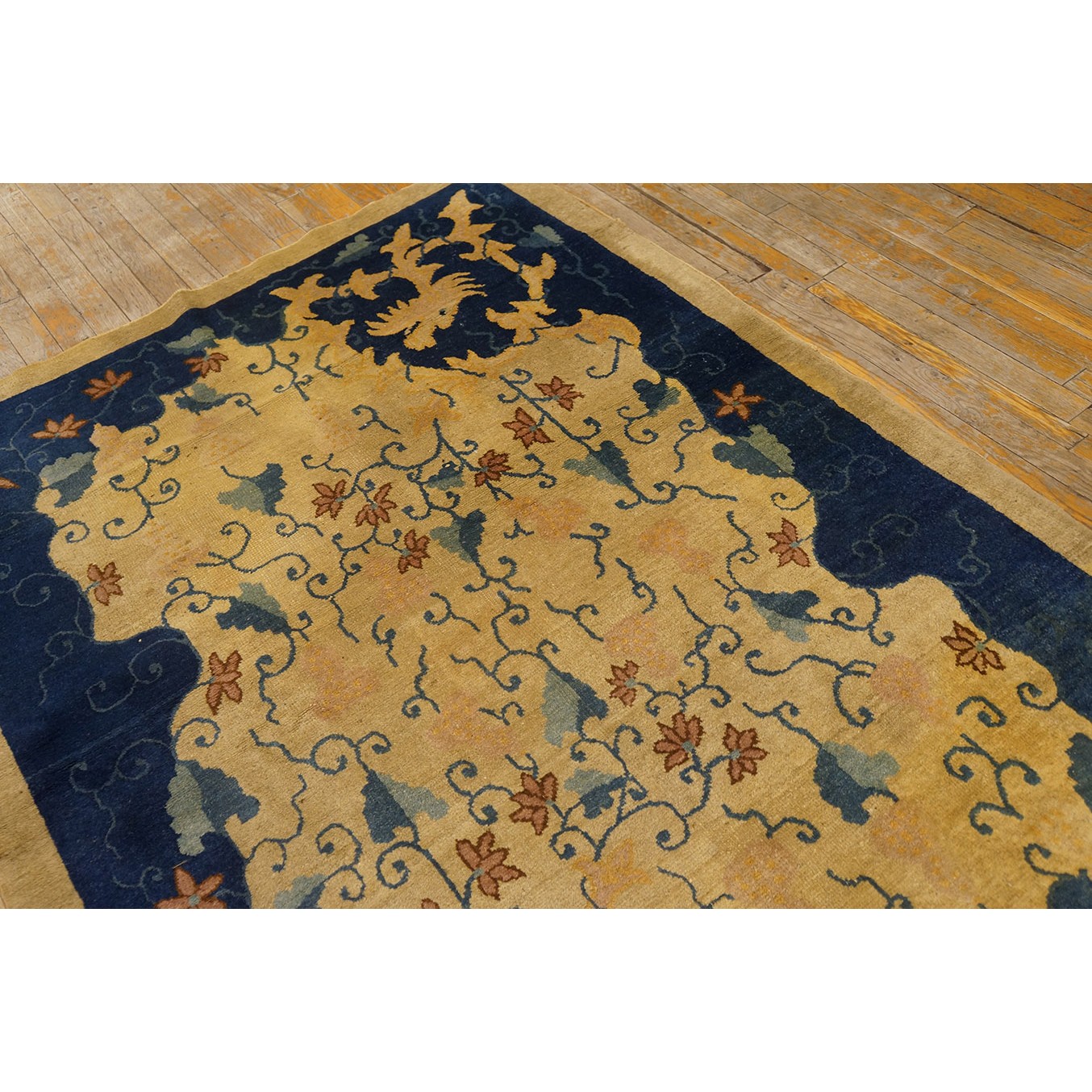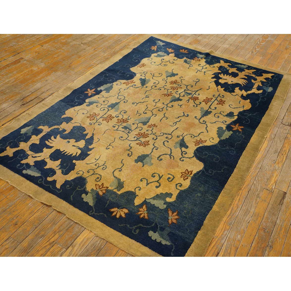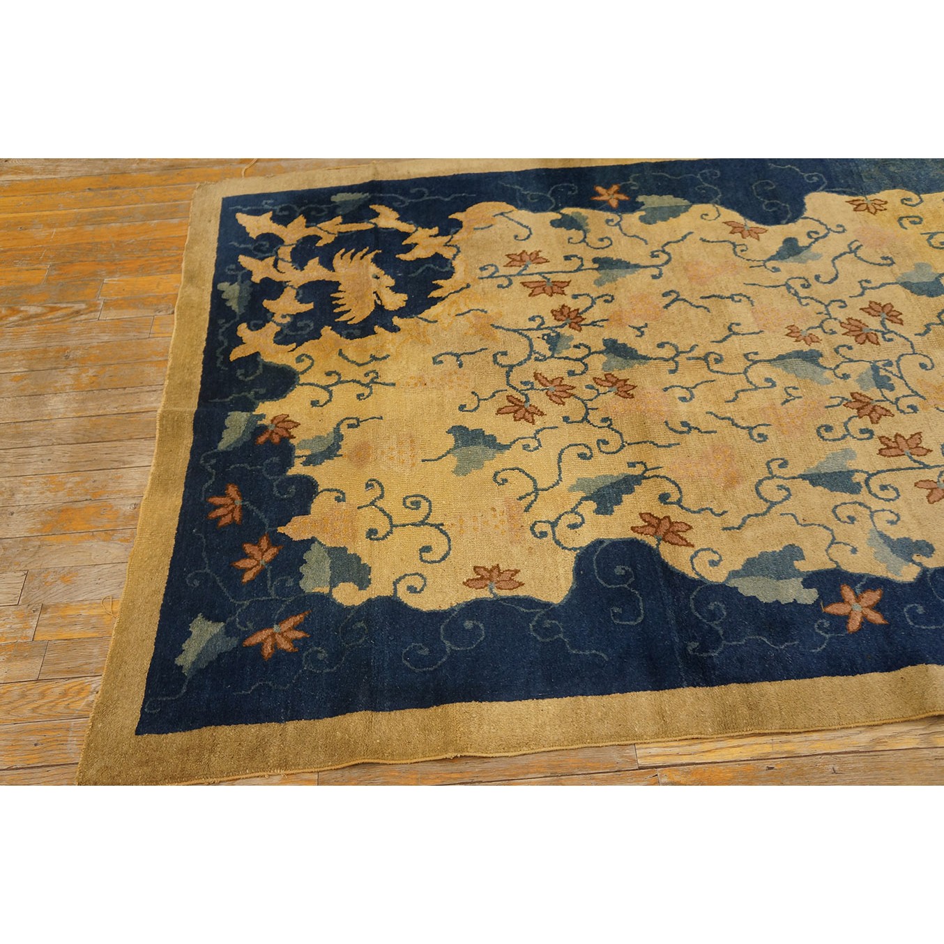 DescriptionChineseCarpets made in China proper. See entries Ningshia, Peking, Art Deco. Chinese - PekingThe commercial Peking carpet is a later 19th century development, begun by importing weaves from Ningshia (see entry) to create and export industry aimed at Western markets. The foundation is cotton and the pile is a good quality carpet wool which takes dyes particularly well. The neat medium weave is in Persian (asymmetric) knots. Designs are strictly Chinese and the whole motif repertoire of Chinese art is employed. Blue and white is the most popular color combination and red is particularly rare. Sizes tend to 9 x 12 and larger, and few small pieces appear. For a short time in the early 1920s Persian designs were woven to capitalize on the death of new Iranian goods. The industry decimated by the Communist Revolution relocated to the Pearl River area. There is a good supply of antique carpets at reasonable prices. | |