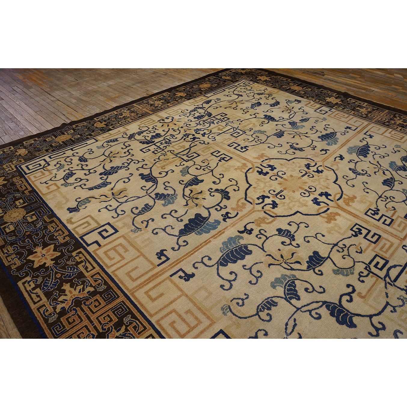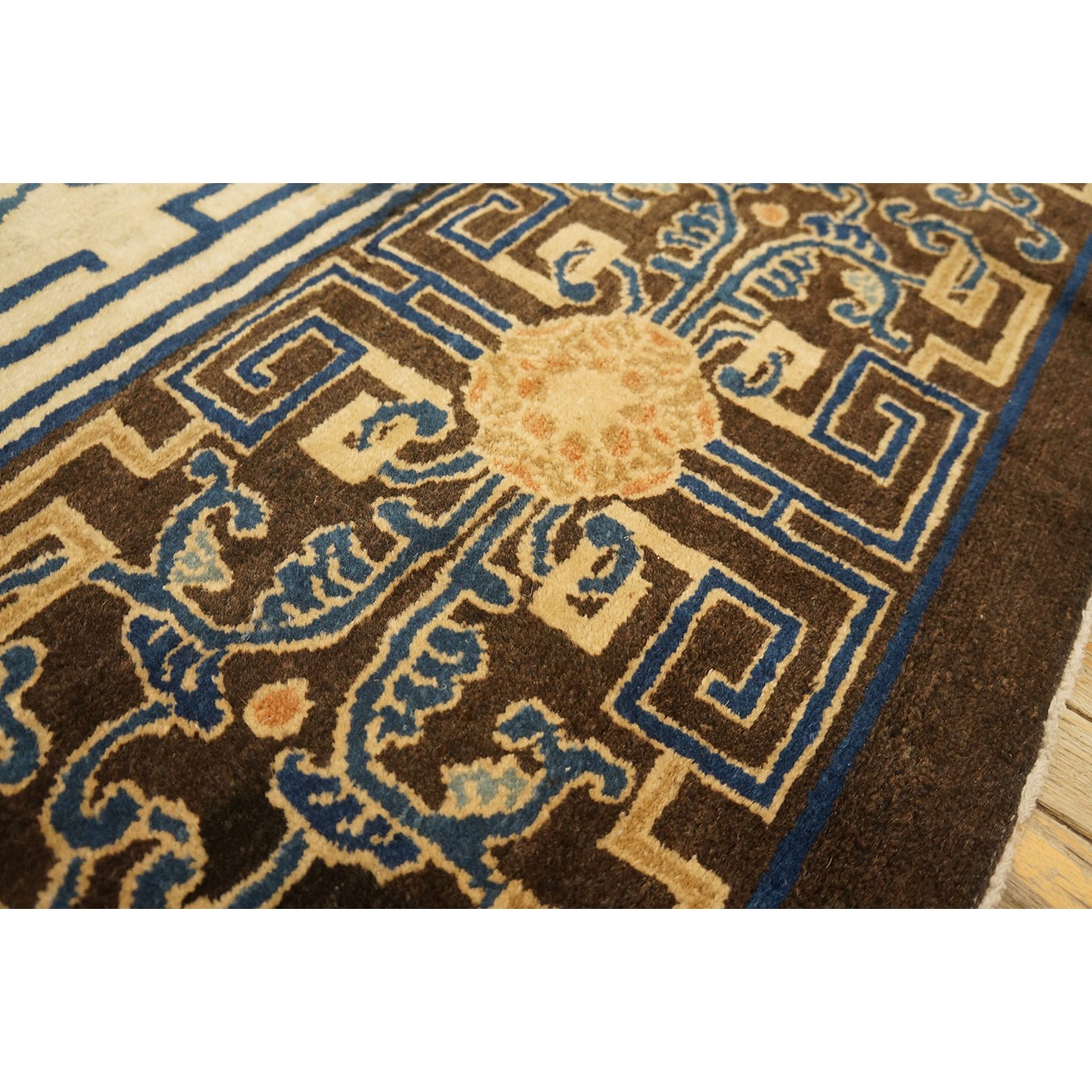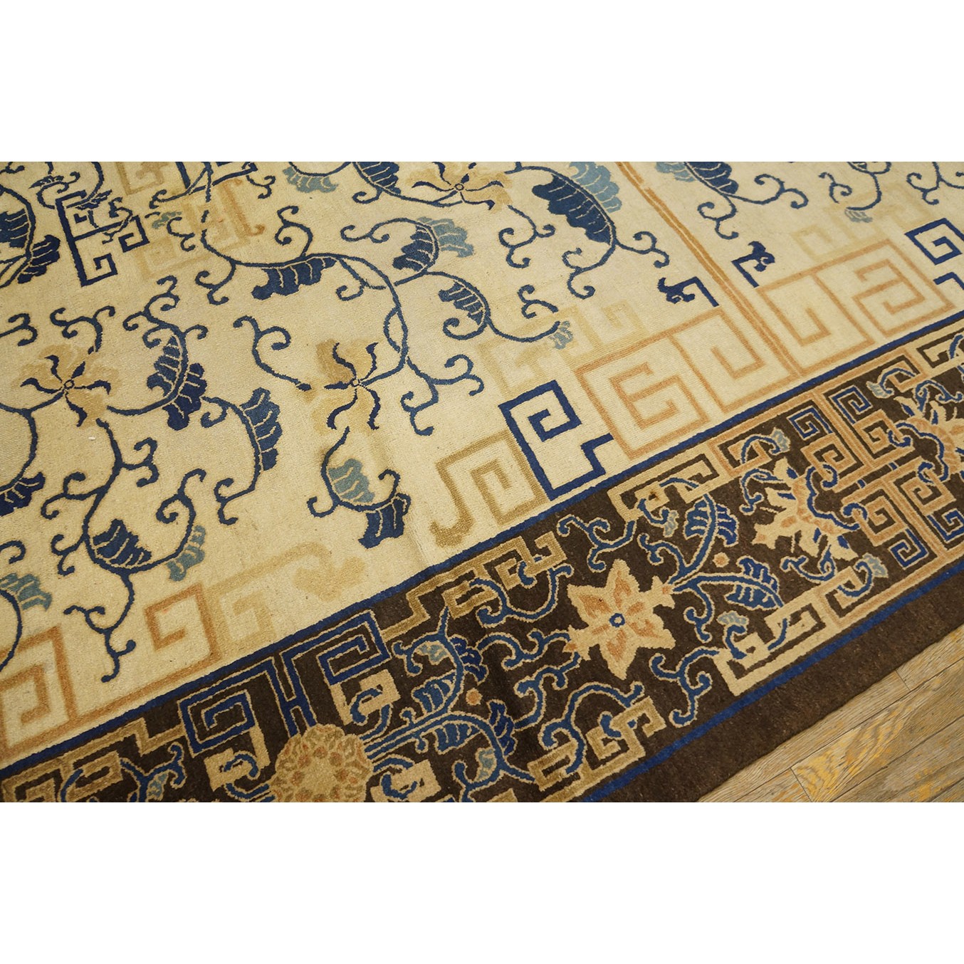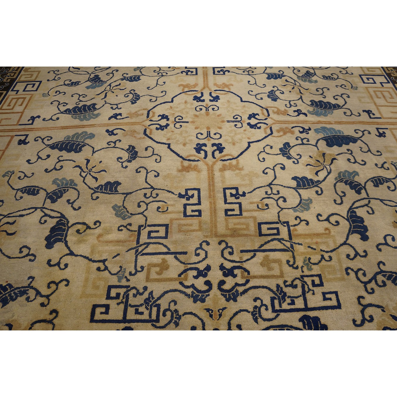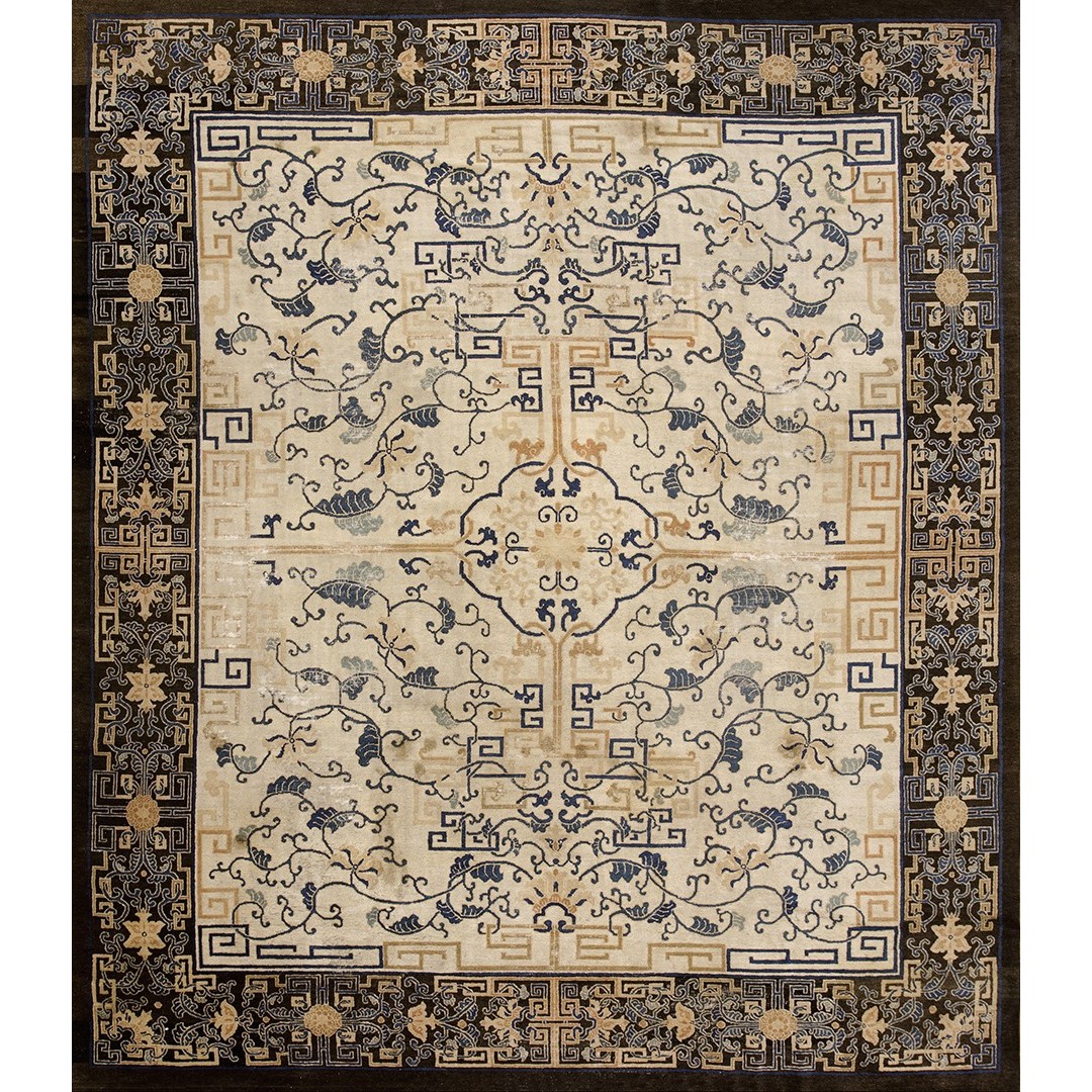 DescriptionChineseCarpets made in China proper. See entries Ningshia, Peking, Art Deco. Chinese - PekingThe commercial Peking carpet is a later 19th century development, begun by importing weaves from Ningshia (see entry) to create and export industry aimed at Western markets. The foundation is cotton and the pile is a good quality carpet wool which takes dyes particularly well. The neat medium weave is in Persian (asymmetric) knots. Designs are strictly Chinese and the whole motif repertoire of Chinese art is employed. Blue and white is the most popular color combination and red is particularly rare. Sizes tend to 9 x 12 and larger, and few small pieces appear. For a short time in the early 1920s Persian designs were woven to capitalize on the death of new Iranian goods. The industry decimated by the Communist Revolution relocated to the Pearl River area. There is a good supply of antique carpets at reasonable prices. | |