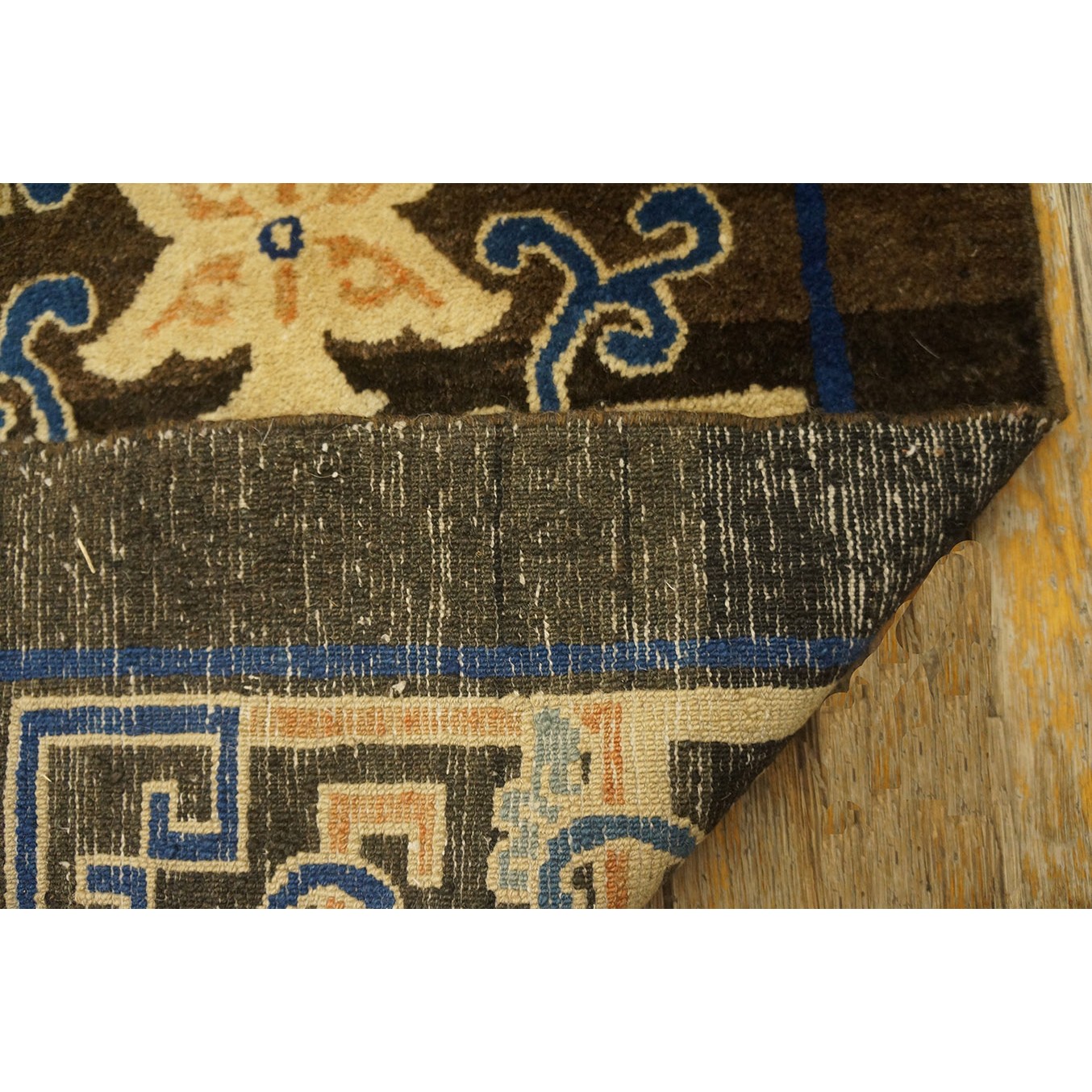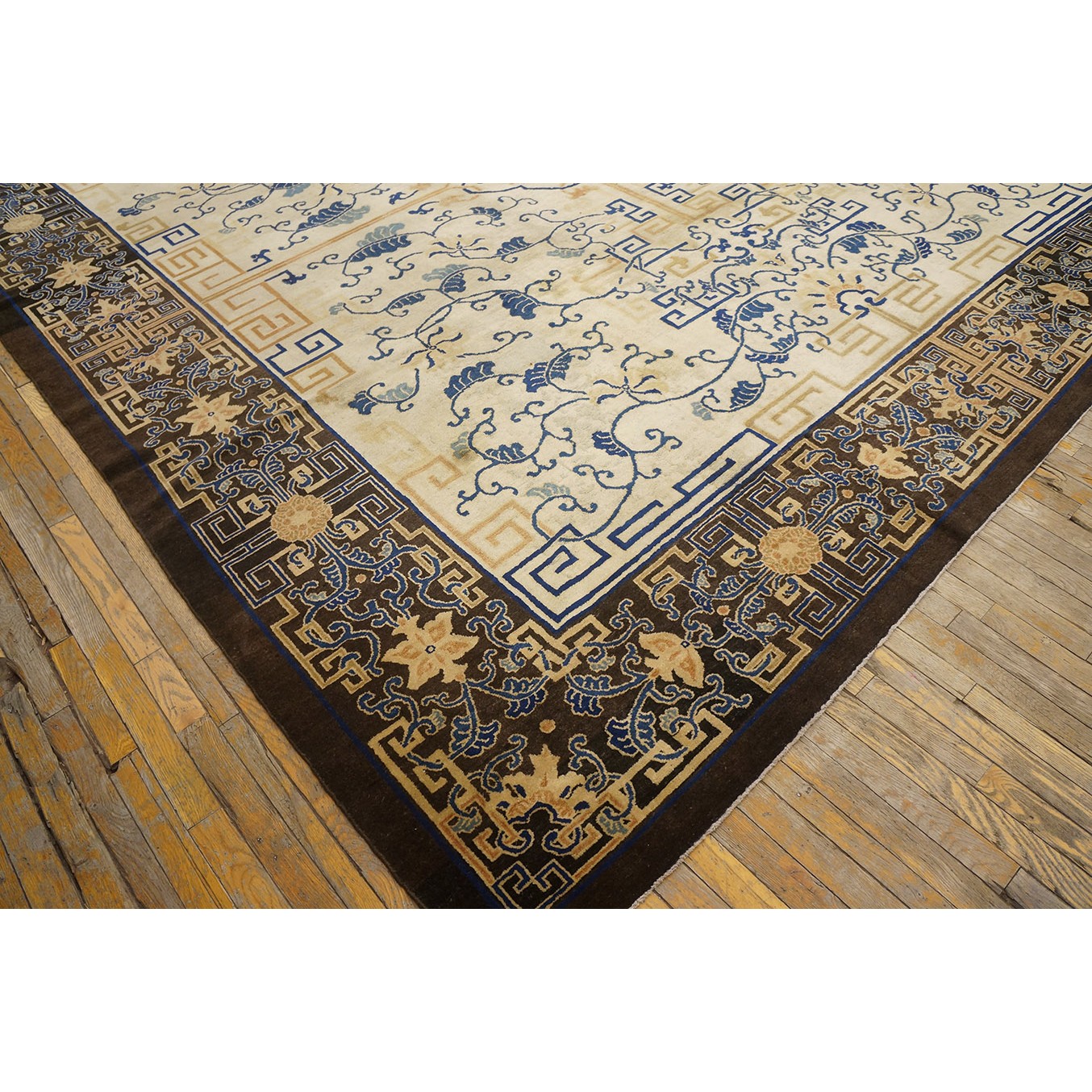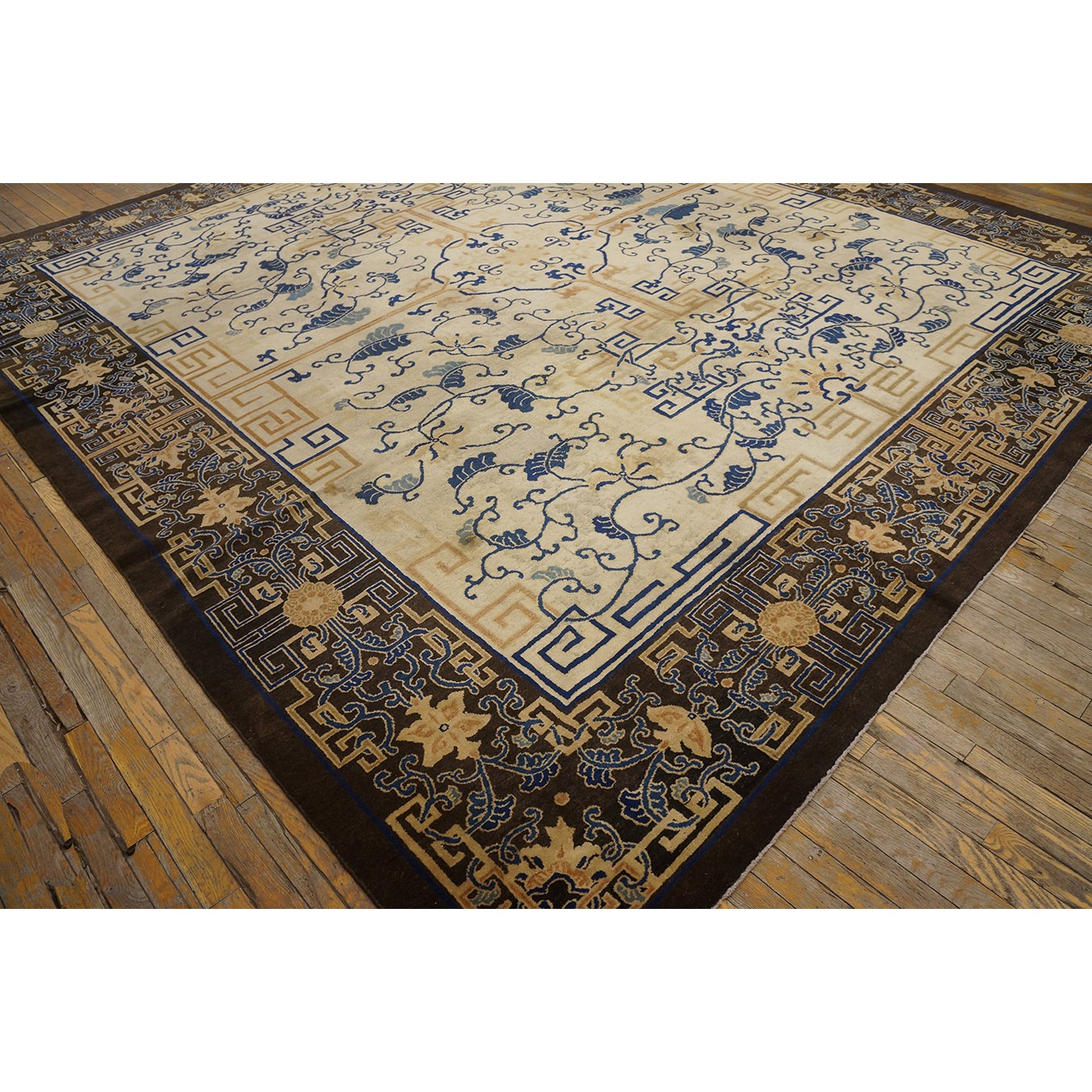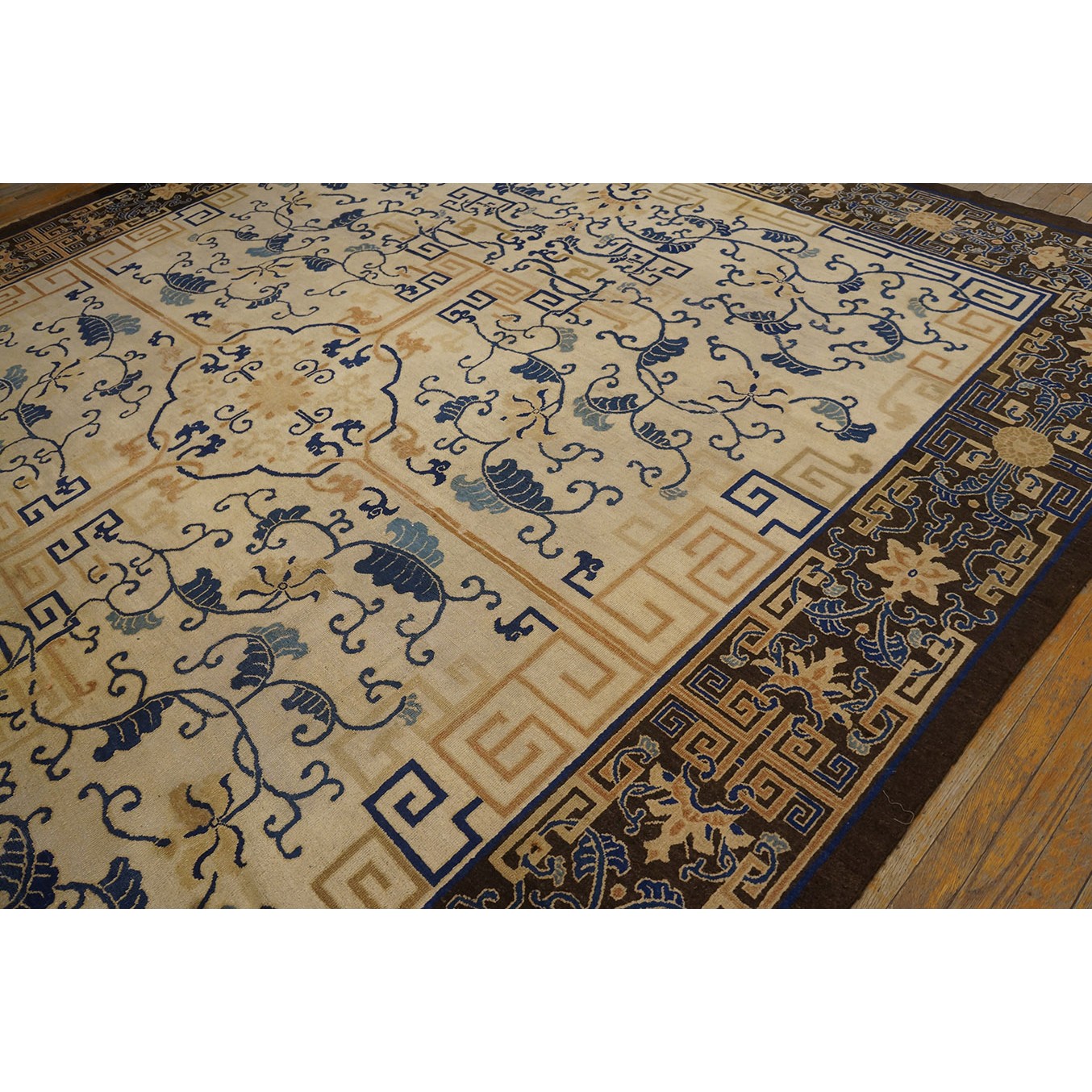 DescriptionChineseCarpets made in China proper. See entries Ningshia, Peking, Art Deco. Chinese - PekingThe commercial Peking carpet is a later 19th century development, begun by importing weaves from Ningshia (see entry) to create and export industry aimed at Western markets. The foundation is cotton and the pile is a good quality carpet wool which takes dyes particularly well. The neat medium weave is in Persian (asymmetric) knots. Designs are strictly Chinese and the whole motif repertoire of Chinese art is employed. Blue and white is the most popular color combination and red is particularly rare. Sizes tend to 9 x 12 and larger, and few small pieces appear. For a short time in the early 1920s Persian designs were woven to capitalize on the death of new Iranian goods. The industry decimated by the Communist Revolution relocated to the Pearl River area. There is a good supply of antique carpets at reasonable prices. | |