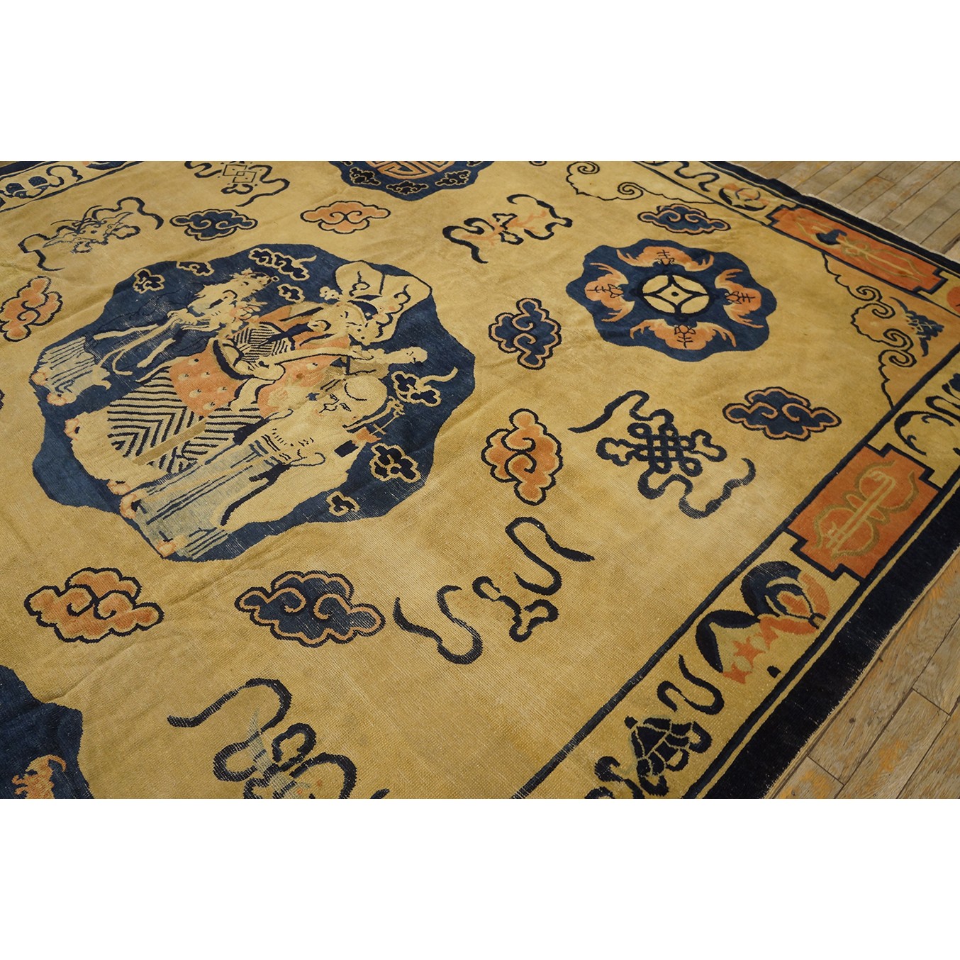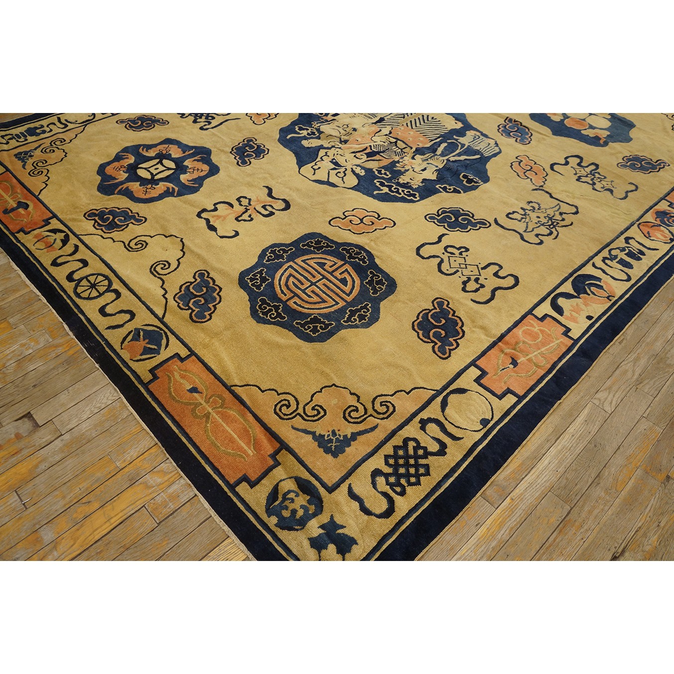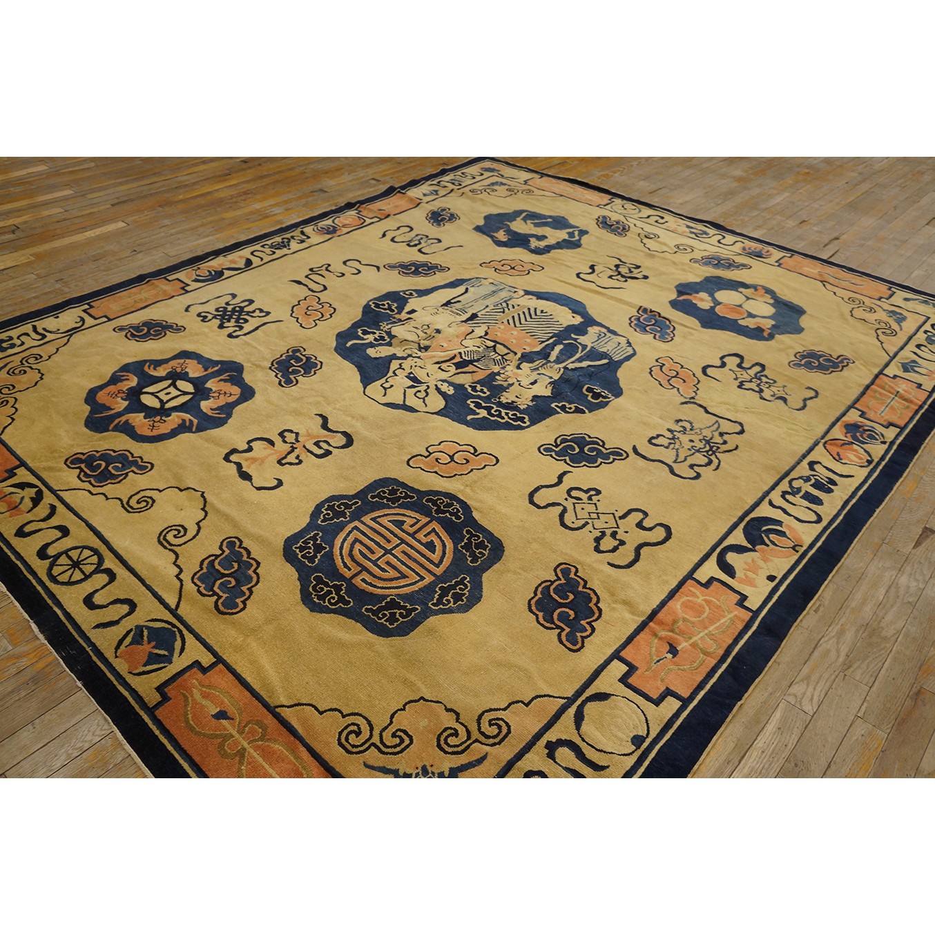DescriptionChineseCarpets made in China proper. See entries Ningshia, Peking, Art Deco. Chinese - PekingThe commercial Peking carpet is a later 19th century development, begun by importing weaves from Ningshia (see entry) to create and export industry aimed at Western markets. The foundation is cotton and the pile is a good quality carpet wool which takes dyes particularly well. The neat medium weave is in Persian (asymmetric) knots. Designs are strictly Chinese and the whole motif repertoire of Chinese art is employed. Blue and white is the most popular color combination and red is particularly rare. Sizes tend to 9 x 12 and larger, and few small pieces appear. For a short time in the early 1920s Persian designs were woven to capitalize on the death of new Iranian goods. The industry decimated by the Communist Revolution relocated to the Pearl River area. There is a good supply of antique carpets at reasonable prices. | |