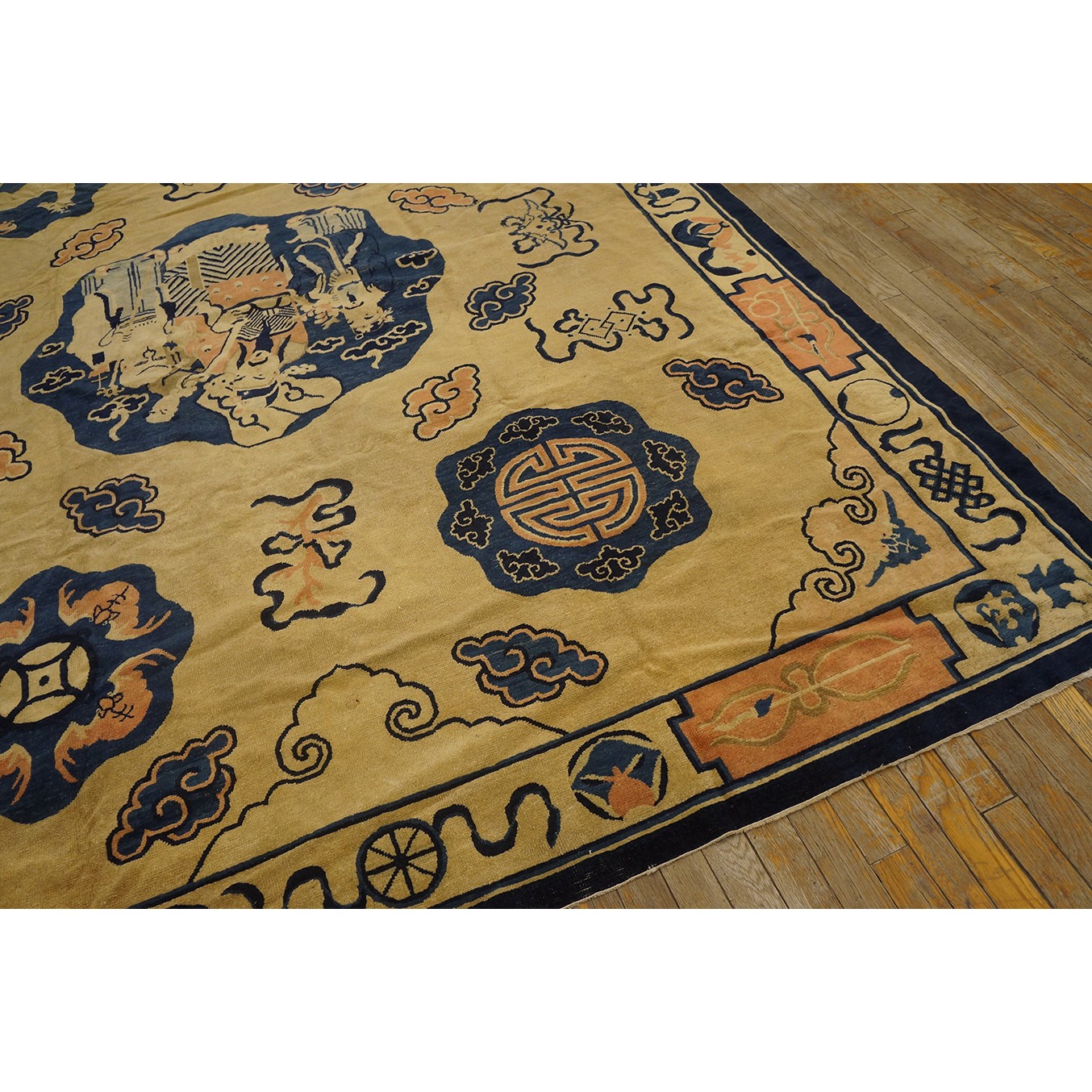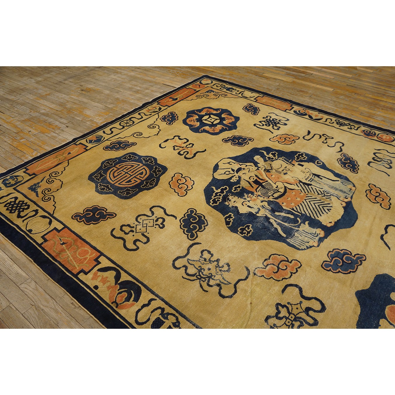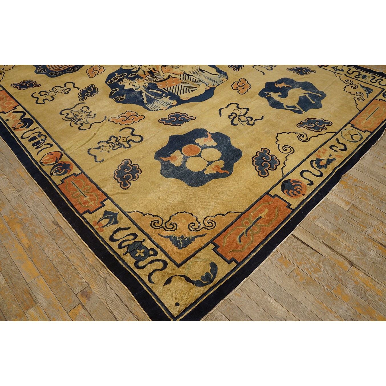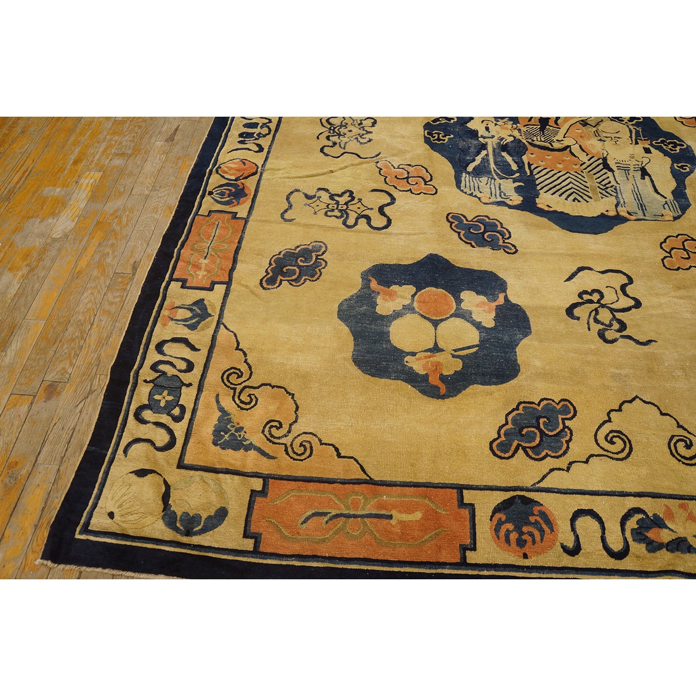 DescriptionChineseCarpets made in China proper. See entries Ningshia, Peking, Art Deco. Chinese - PekingThe commercial Peking carpet is a later 19th century development, begun by importing weaves from Ningshia (see entry) to create and export industry aimed at Western markets. The foundation is cotton and the pile is a good quality carpet wool which takes dyes particularly well. The neat medium weave is in Persian (asymmetric) knots. Designs are strictly Chinese and the whole motif repertoire of Chinese art is employed. Blue and white is the most popular color combination and red is particularly rare. Sizes tend to 9 x 12 and larger, and few small pieces appear. For a short time in the early 1920s Persian designs were woven to capitalize on the death of new Iranian goods. The industry decimated by the Communist Revolution relocated to the Pearl River area. There is a good supply of antique carpets at reasonable prices. | |