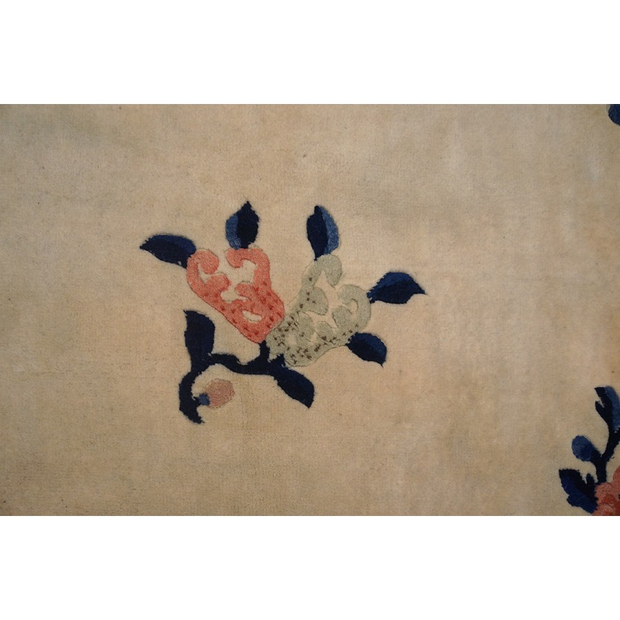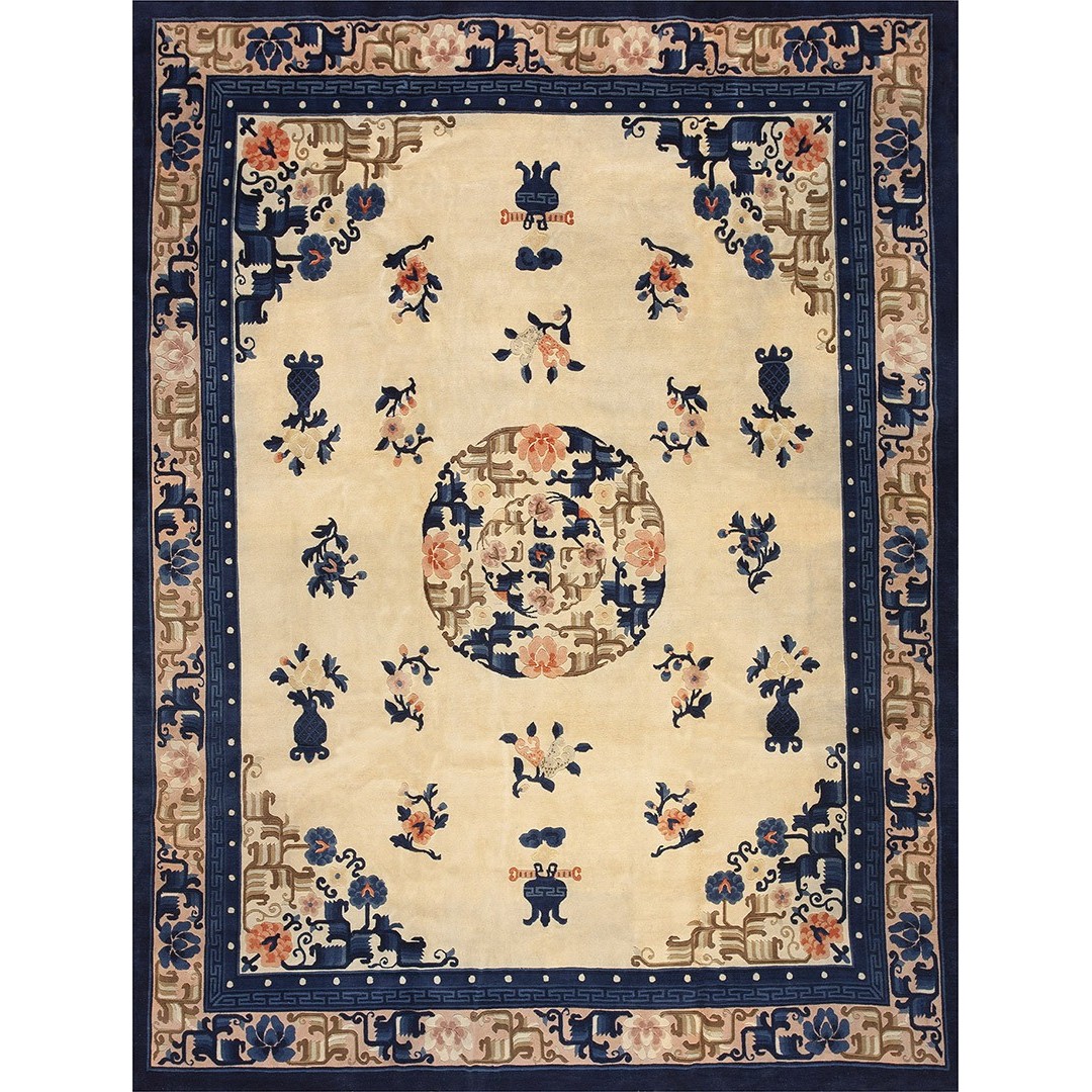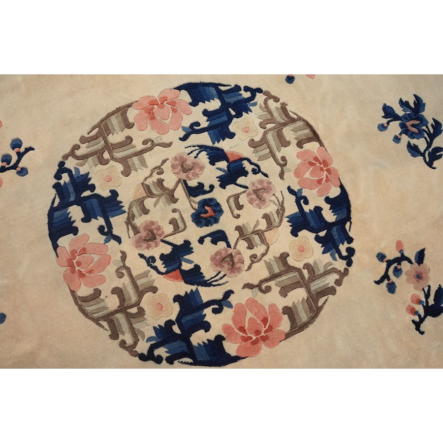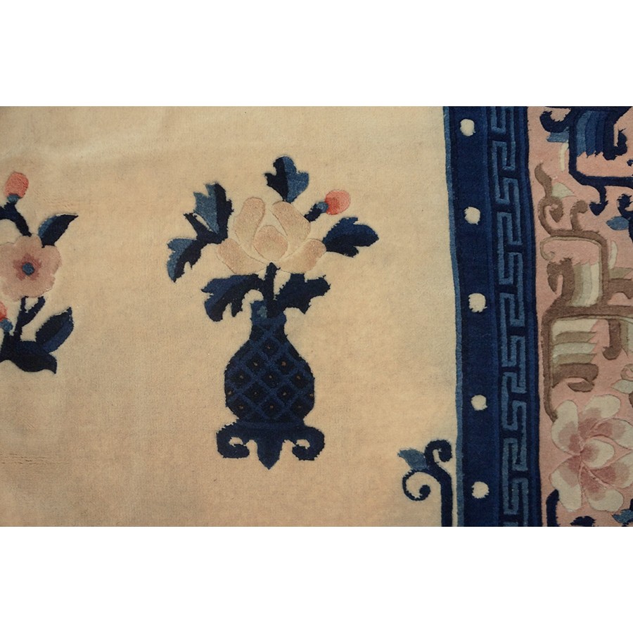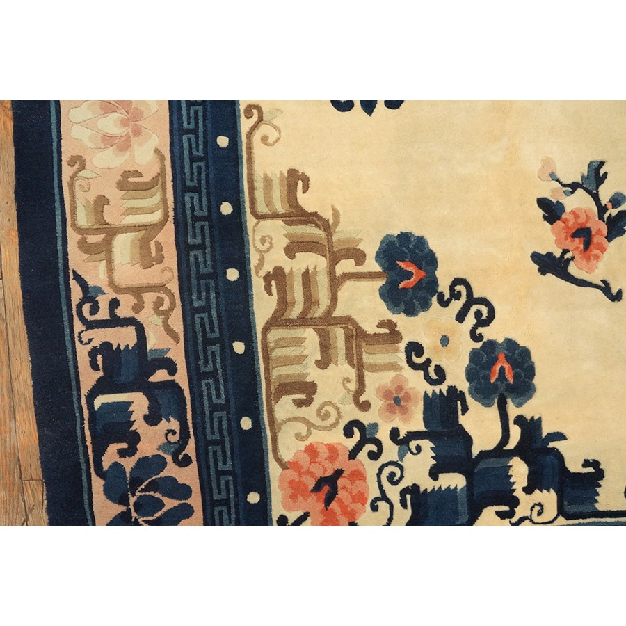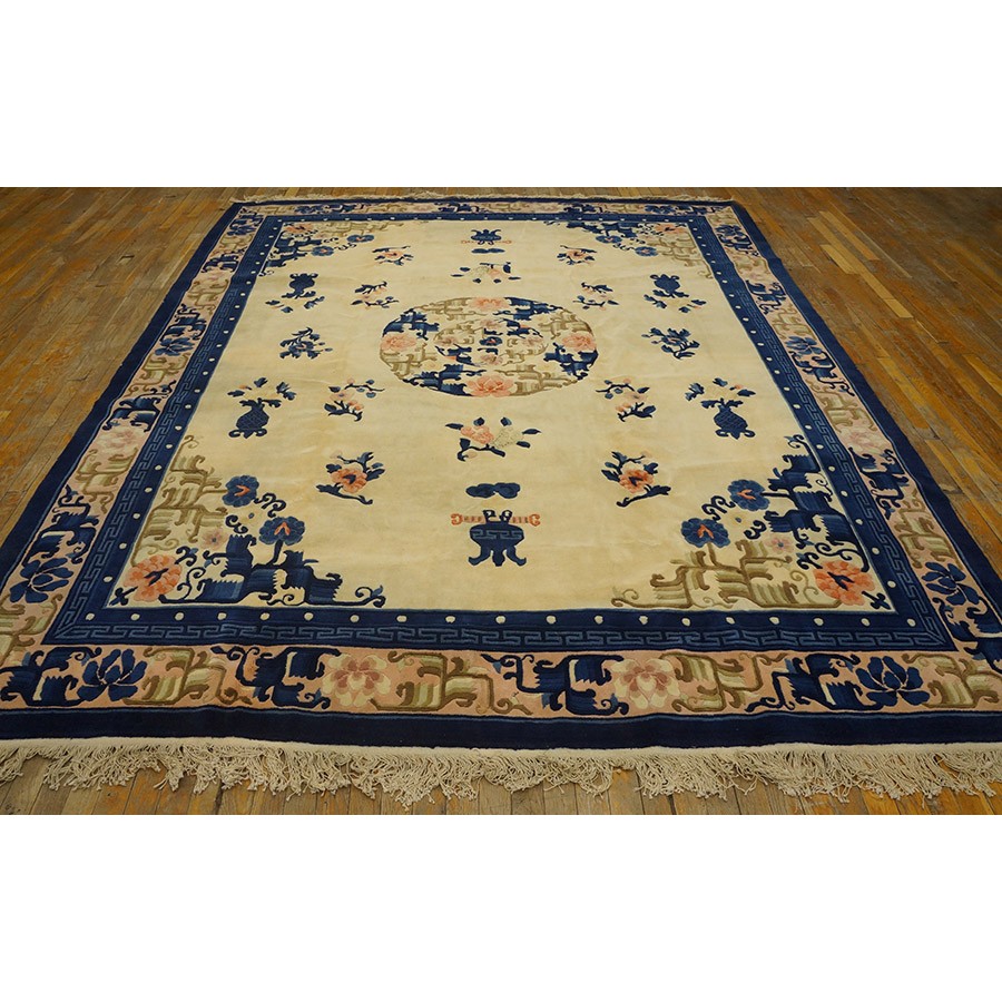 DescriptionChineseCarpets made in China proper. See entries Ningshia, Peking, Art Deco. Chinese - PekingThe commercial Peking carpet is a later 19th century development, begun by importing weaves from Ningshia (see entry) to create and export industry aimed at Western markets. The foundation is cotton and the pile is a good quality carpet wool which takes dyes particularly well. The neat medium weave is in Persian (asymmetric) knots. Designs are strictly Chinese and the whole motif repertoire of Chinese art is employed. Blue and white is the most popular color combination and red is particularly rare. Sizes tend to 9 x 12 and larger, and few small pieces appear. For a short time in the early 1920s Persian designs were woven to capitalize on the death of new Iranian goods. The industry decimated by the Communist Revolution relocated to the Pearl River area. There is a good supply of antique carpets at reasonable prices. | |