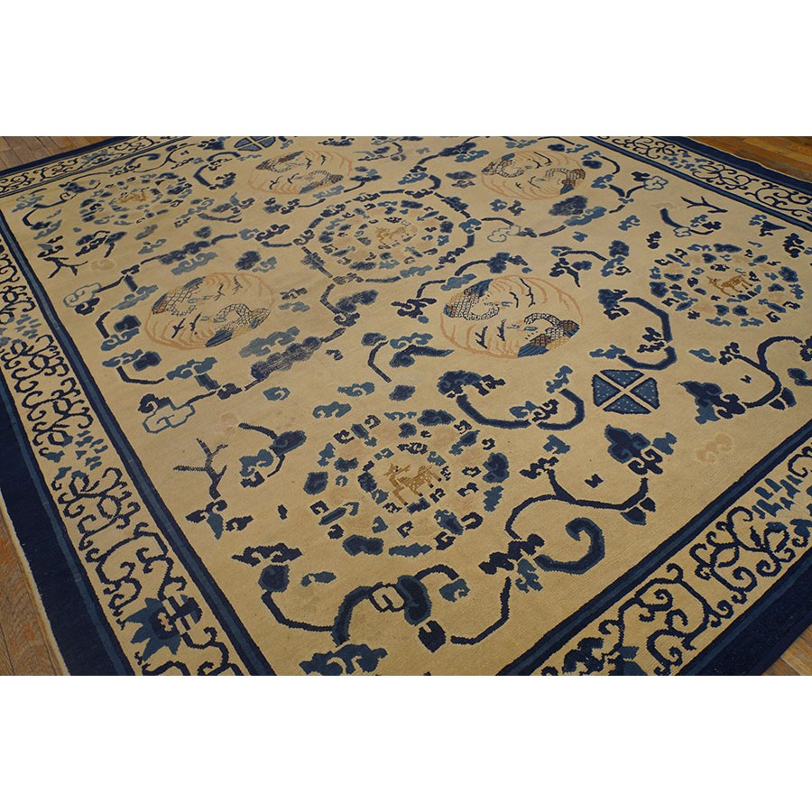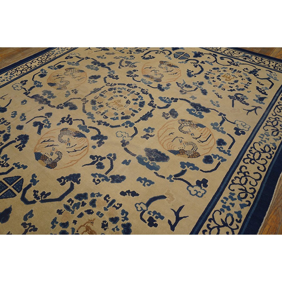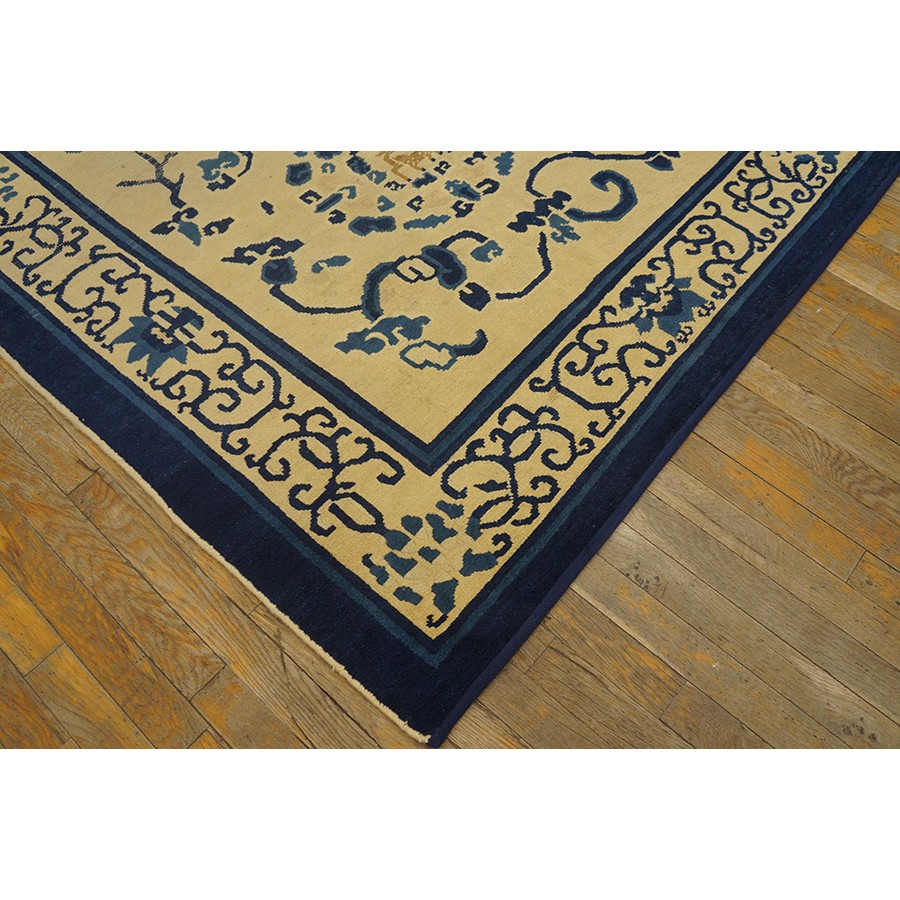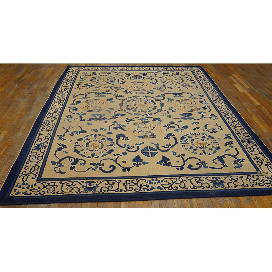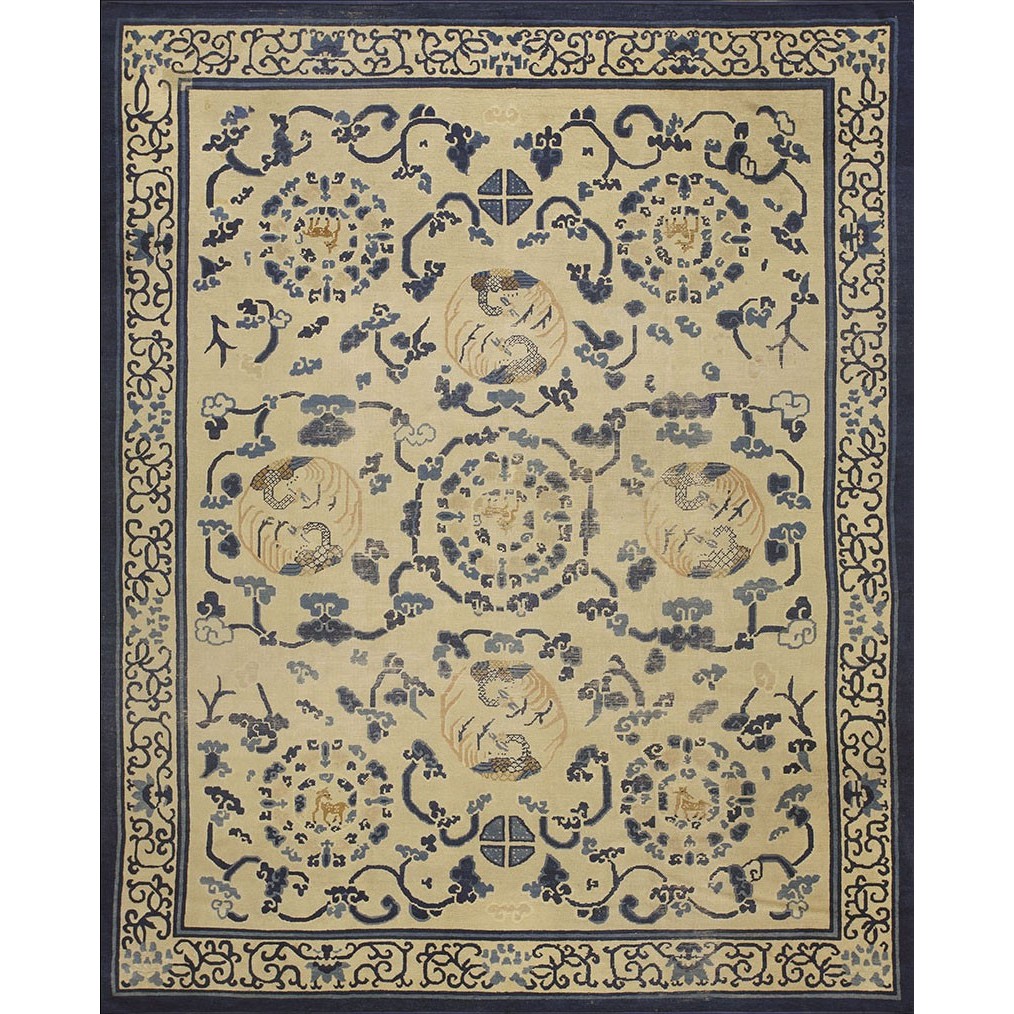 DescriptionChineseCarpets made in China proper. See entries Ningshia, Peking, Art Deco. Chinese - PekingThe commercial Peking carpet is a later 19th century development, begun by importing weaves from Ningshia (see entry) to create and export industry aimed at Western markets. The foundation is cotton and the pile is a good quality carpet wool which takes dyes particularly well. The neat medium weave is in Persian (asymmetric) knots. Designs are strictly Chinese and the whole motif repertoire of Chinese art is employed. Blue and white is the most popular color combination and red is particularly rare. Sizes tend to 9 x 12 and larger, and few small pieces appear. For a short time in the early 1920s Persian designs were woven to capitalize on the death of new Iranian goods. The industry decimated by the Communist Revolution relocated to the Pearl River area. There is a good supply of antique carpets at reasonable prices. | |