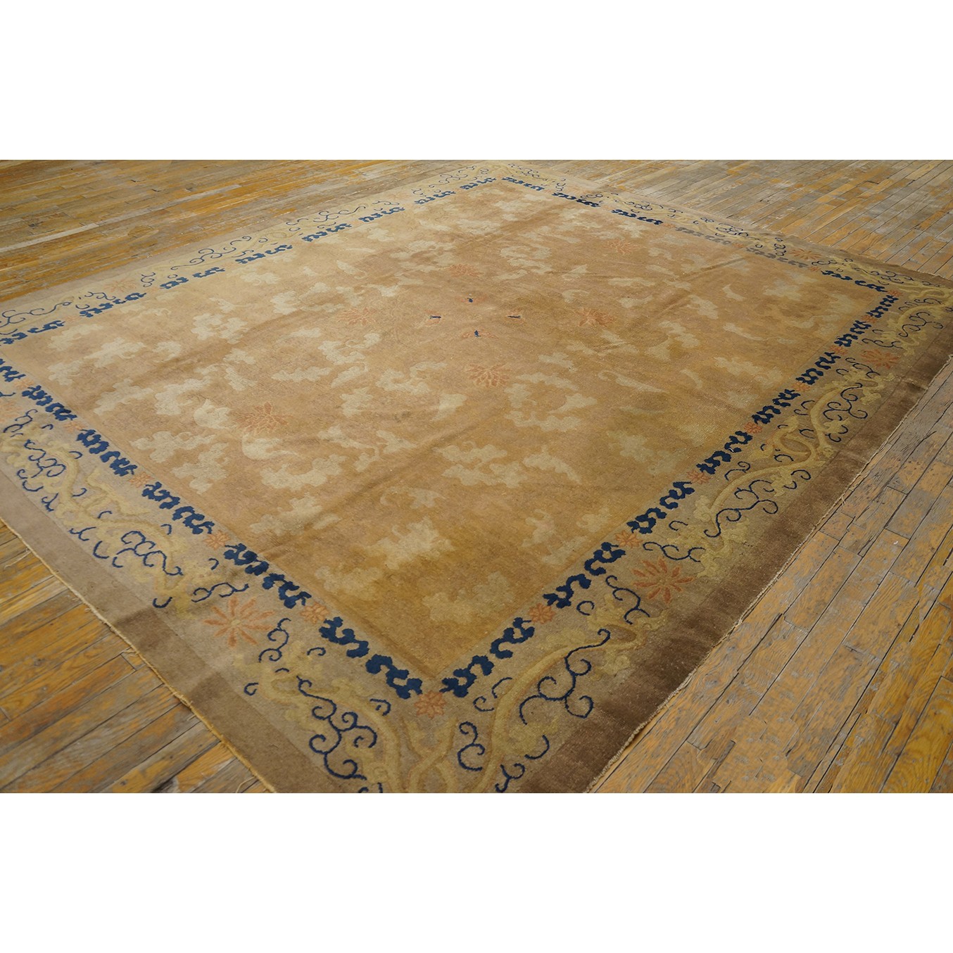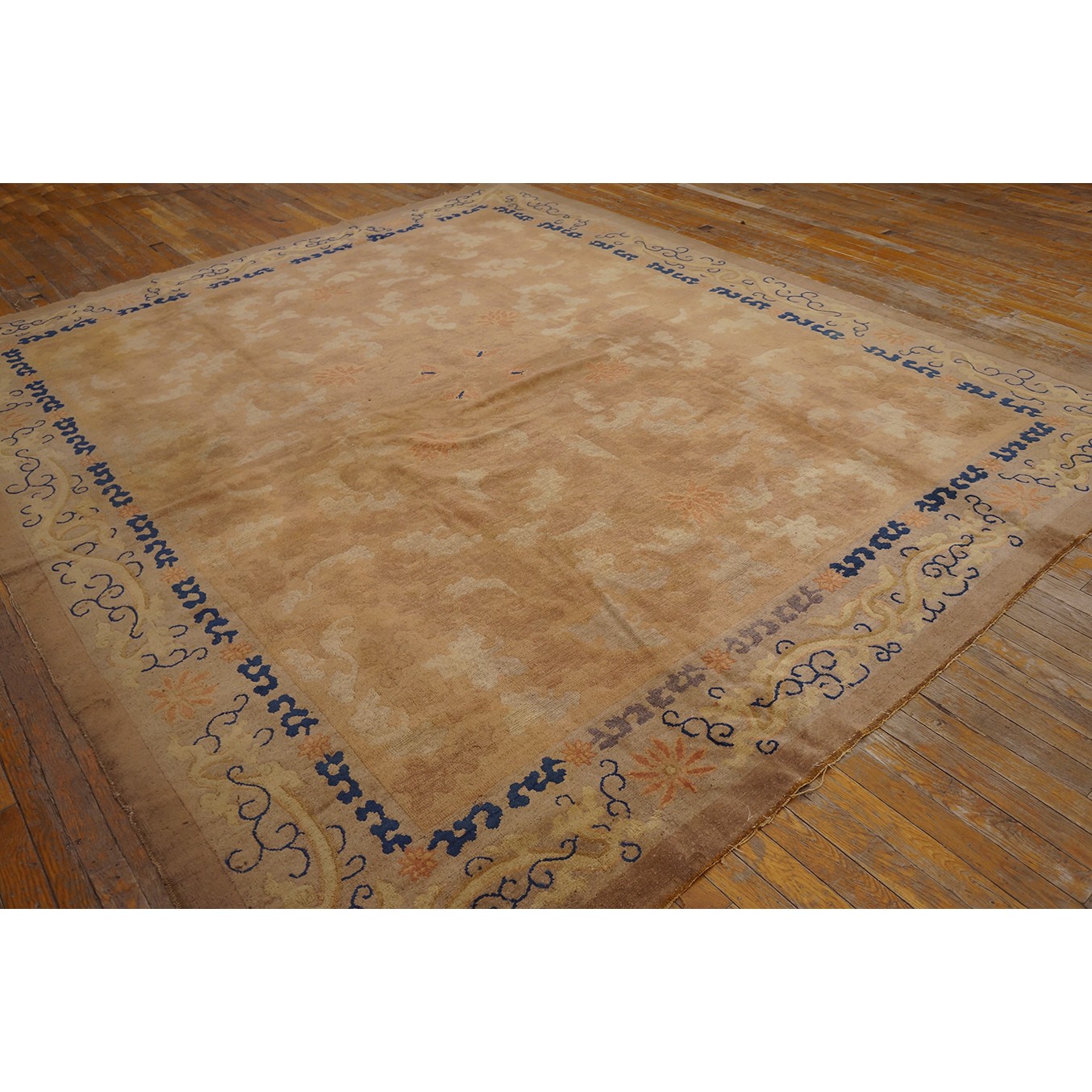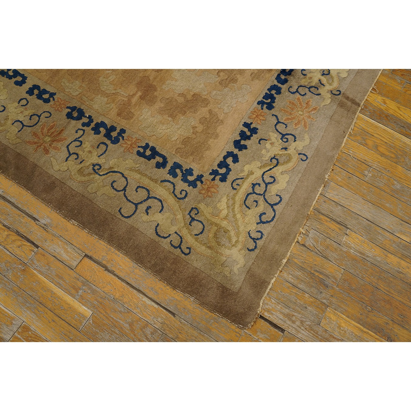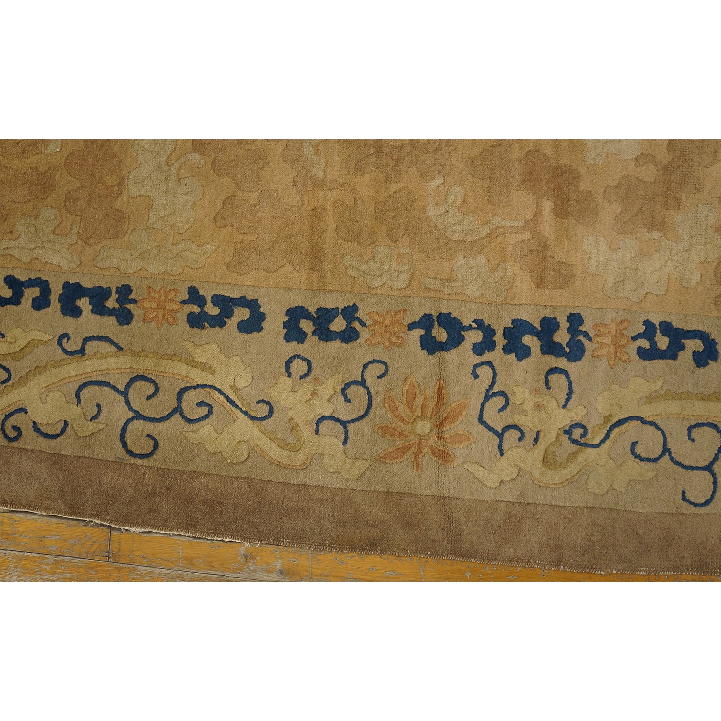 DescriptionChineseCarpets made in China proper. See entries Ningshia, Peking, Art Deco. Chinese - PekingThe commercial Peking carpet is a later 19th century development, begun by importing weaves from Ningshia (see entry) to create and export industry aimed at Western markets. The foundation is cotton and the pile is a good quality carpet wool which takes dyes particularly well. The neat medium weave is in Persian (asymmetric) knots. Designs are strictly Chinese and the whole motif repertoire of Chinese art is employed. Blue and white is the most popular color combination and red is particularly rare. Sizes tend to 9 x 12 and larger, and few small pieces appear. For a short time in the early 1920s Persian designs were woven to capitalize on the death of new Iranian goods. The industry decimated by the Communist Revolution relocated to the Pearl River area. There is a good supply of antique carpets at reasonable prices. | |