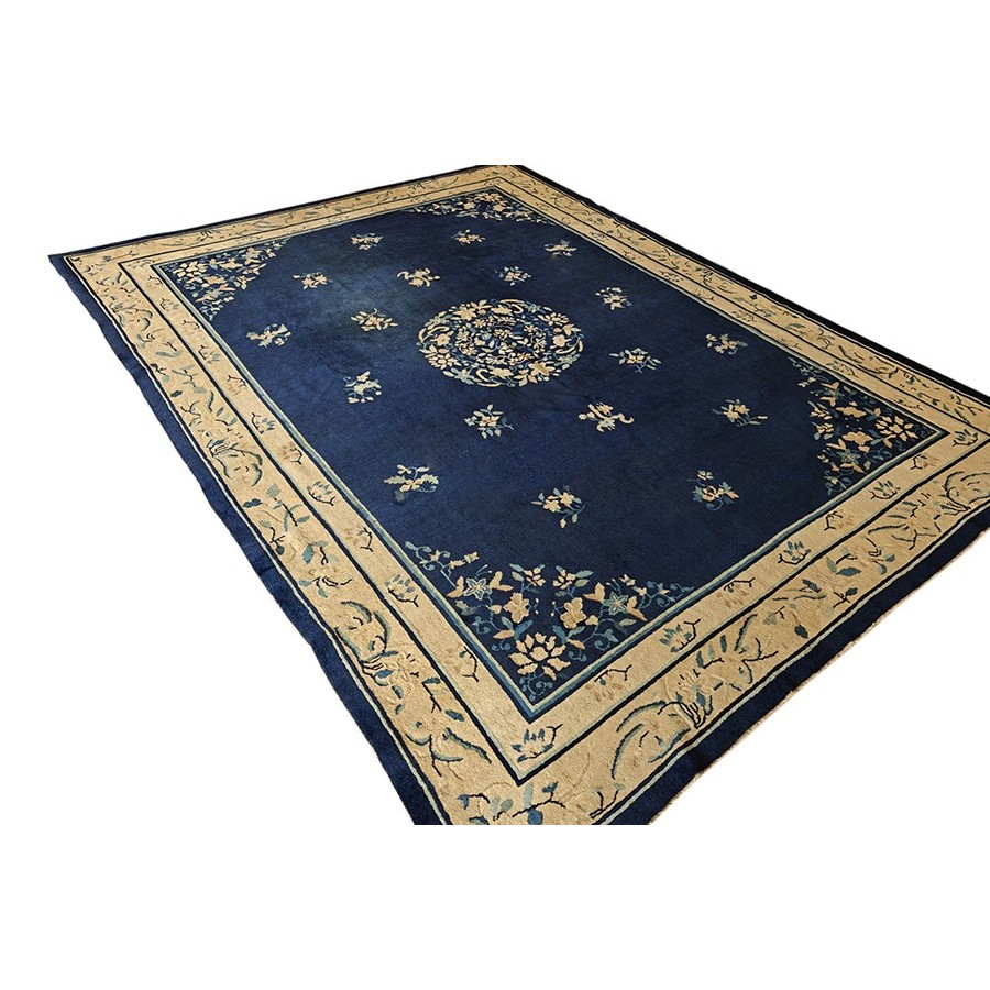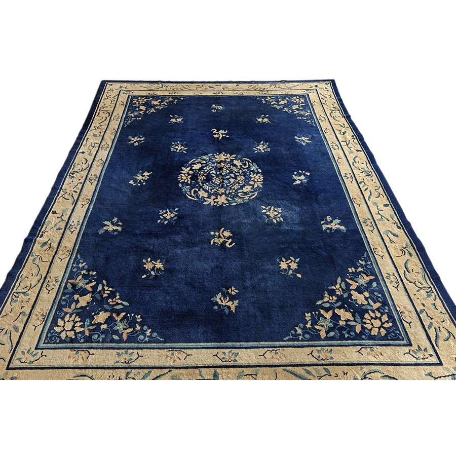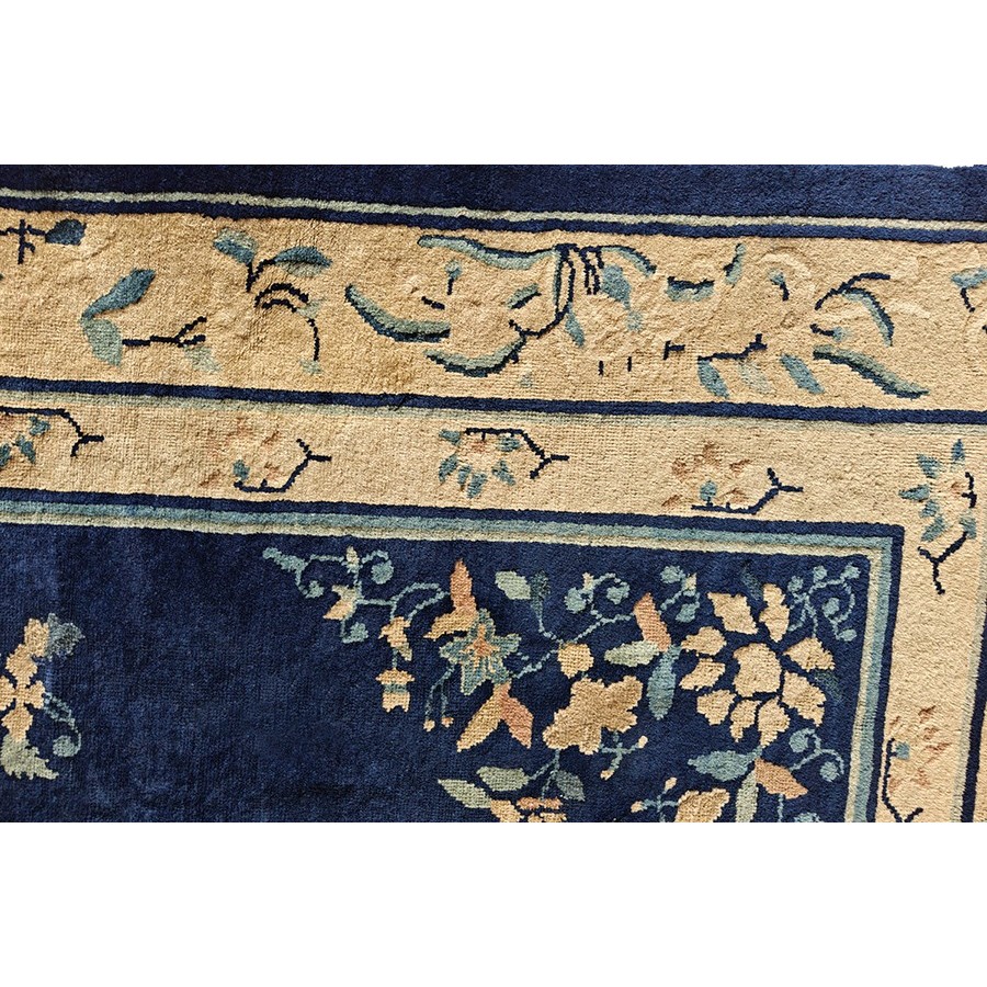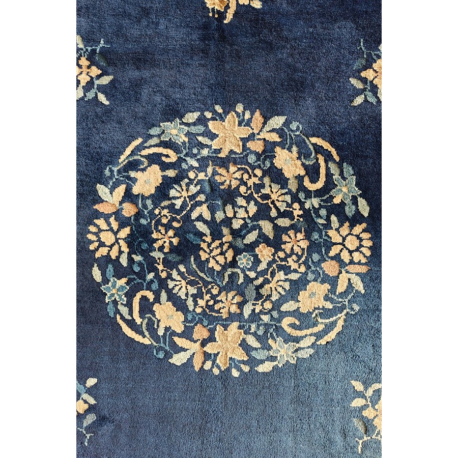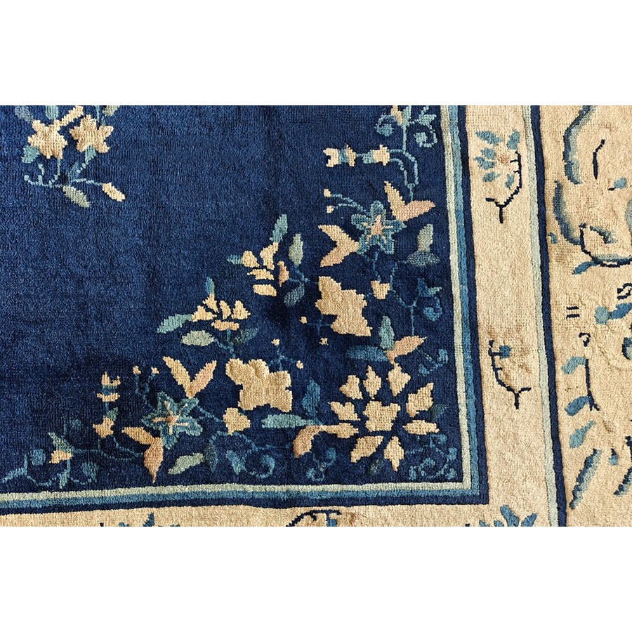 DescriptionChineseCarpets made in China proper. See entries Ningshia, Peking, Art Deco. Chinese - PekingThe commercial Peking carpet is a later 19th century development, begun by importing weaves from Ningshia (see entry) to create and export industry aimed at Western markets. The foundation is cotton and the pile is a good quality carpet wool which takes dyes particularly well. The neat medium weave is in Persian (asymmetric) knots. Designs are strictly Chinese and the whole motif repertoire of Chinese art is employed. Blue and white is the most popular color combination and red is particularly rare. Sizes tend to 9 x 12 and larger, and few small pieces appear. For a short time in the early 1920s Persian designs were woven to capitalize on the death of new Iranian goods. The industry decimated by the Communist Revolution relocated to the Pearl River area. There is a good supply of antique carpets at reasonable prices. | |