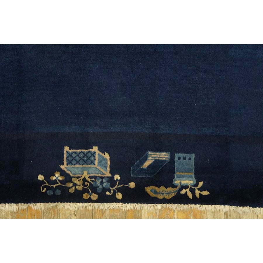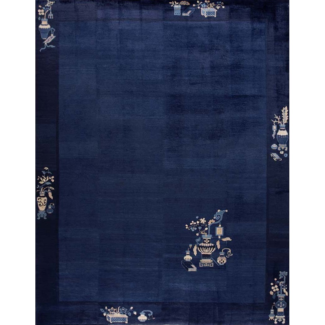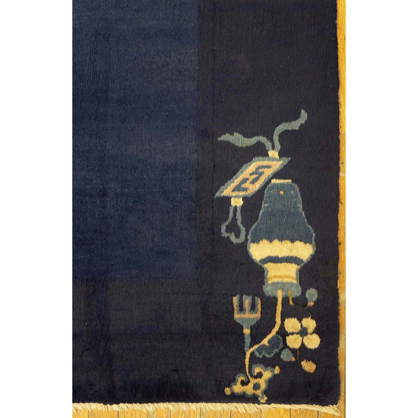 DescriptionChineseCarpets made in China proper. See entries Ningshia, Peking, Art Deco. Chinese - PekingThe commercial Peking carpet is a later 19th century development, begun by importing weaves from Ningshia (see entry) to create and export industry aimed at Western markets. The foundation is cotton and the pile is a good quality carpet wool which takes dyes particularly well. The neat medium weave is in Persian (asymmetric) knots. Designs are strictly Chinese and the whole motif repertoire of Chinese art is employed. Blue and white is the most popular color combination and red is particularly rare. Sizes tend to 9 x 12 and larger, and few small pieces appear. For a short time in the early 1920s Persian designs were woven to capitalize on the death of new Iranian goods. The industry decimated by the Communist Revolution relocated to the Pearl River area. There is a good supply of antique carpets at reasonable prices. | |