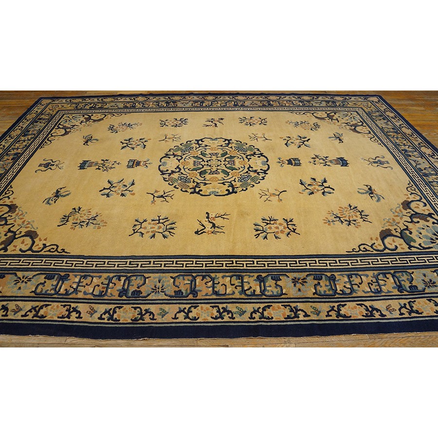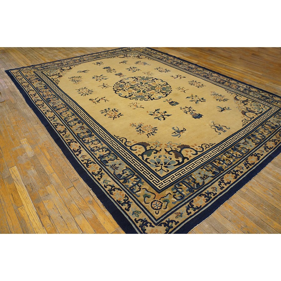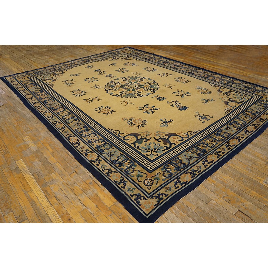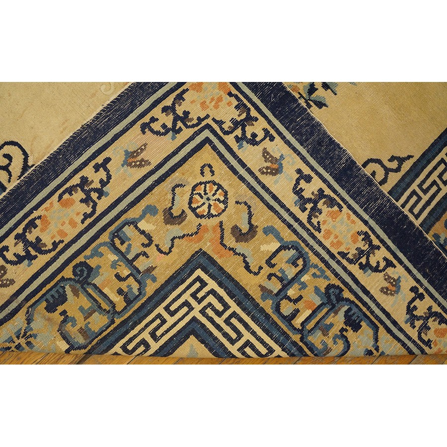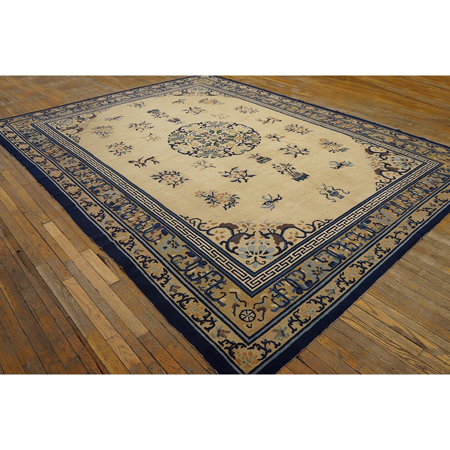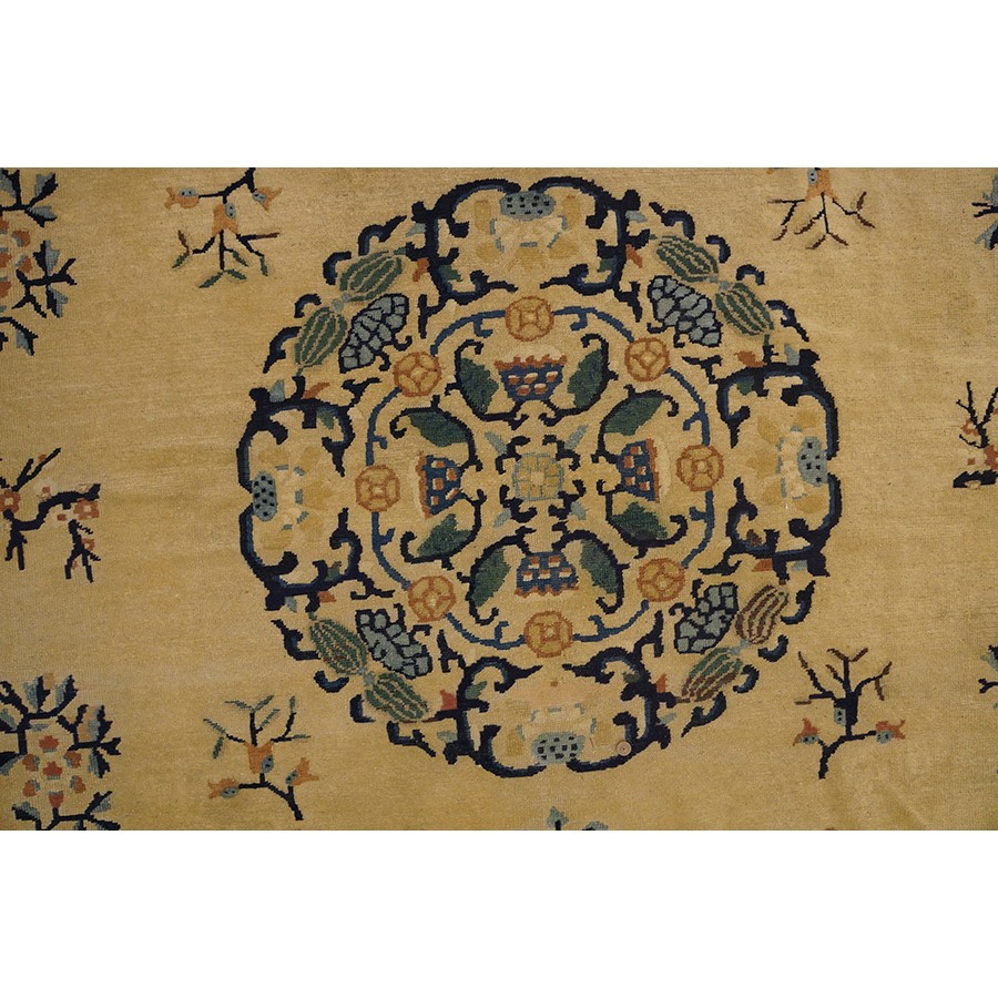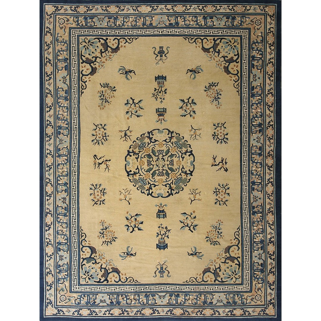 DescriptionChineseCarpets made in China proper. See entries Ningshia, Peking, Art Deco. Chinese - PekingThe commercial Peking carpet is a later 19th century development, begun by importing weaves from Ningshia (see entry) to create and export industry aimed at Western markets. The foundation is cotton and the pile is a good quality carpet wool which takes dyes particularly well. The neat medium weave is in Persian (asymmetric) knots. Designs are strictly Chinese and the whole motif repertoire of Chinese art is employed. Blue and white is the most popular color combination and red is particularly rare. Sizes tend to 9 x 12 and larger, and few small pieces appear. For a short time in the early 1920s Persian designs were woven to capitalize on the death of new Iranian goods. The industry decimated by the Communist Revolution relocated to the Pearl River area. There is a good supply of antique carpets at reasonable prices. | |